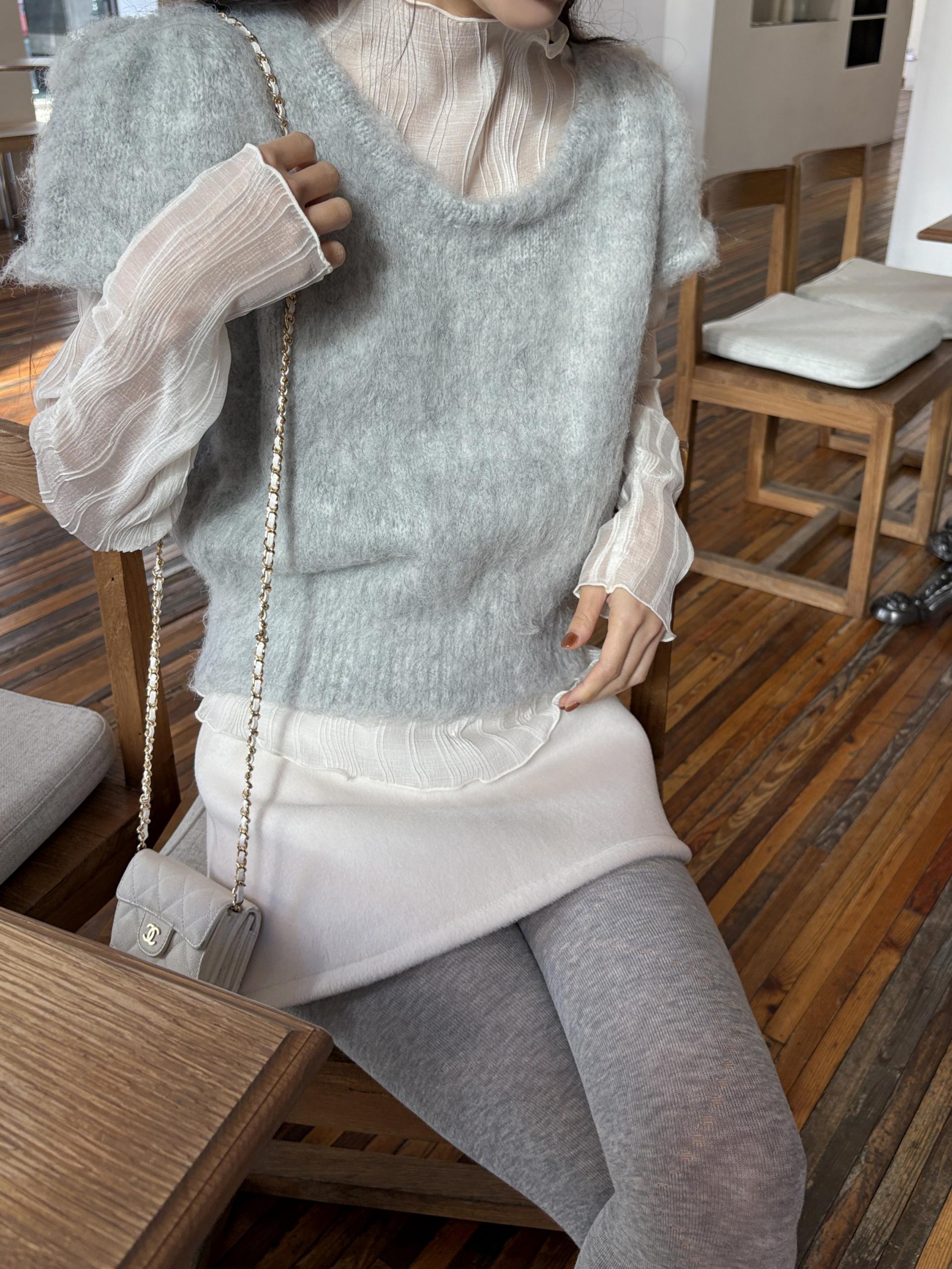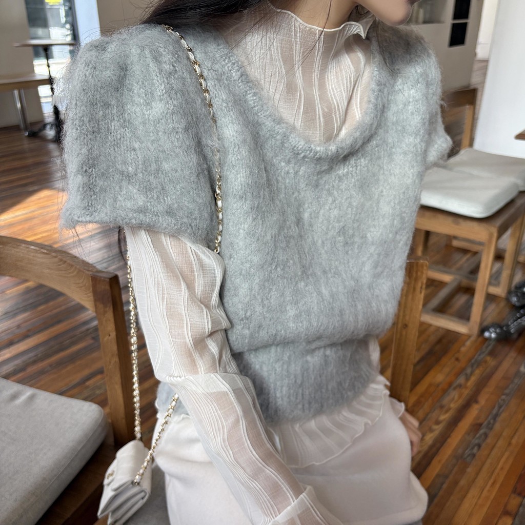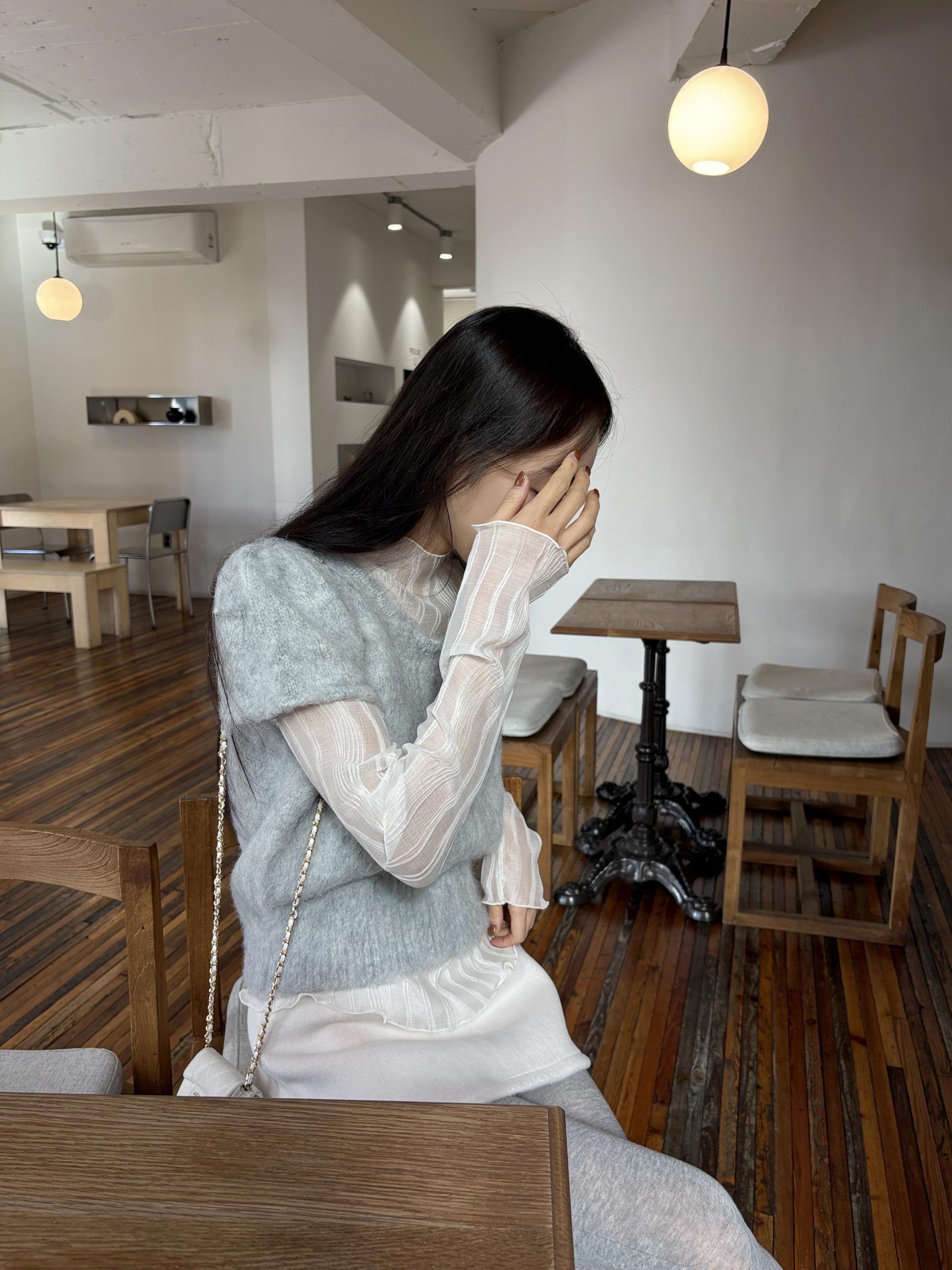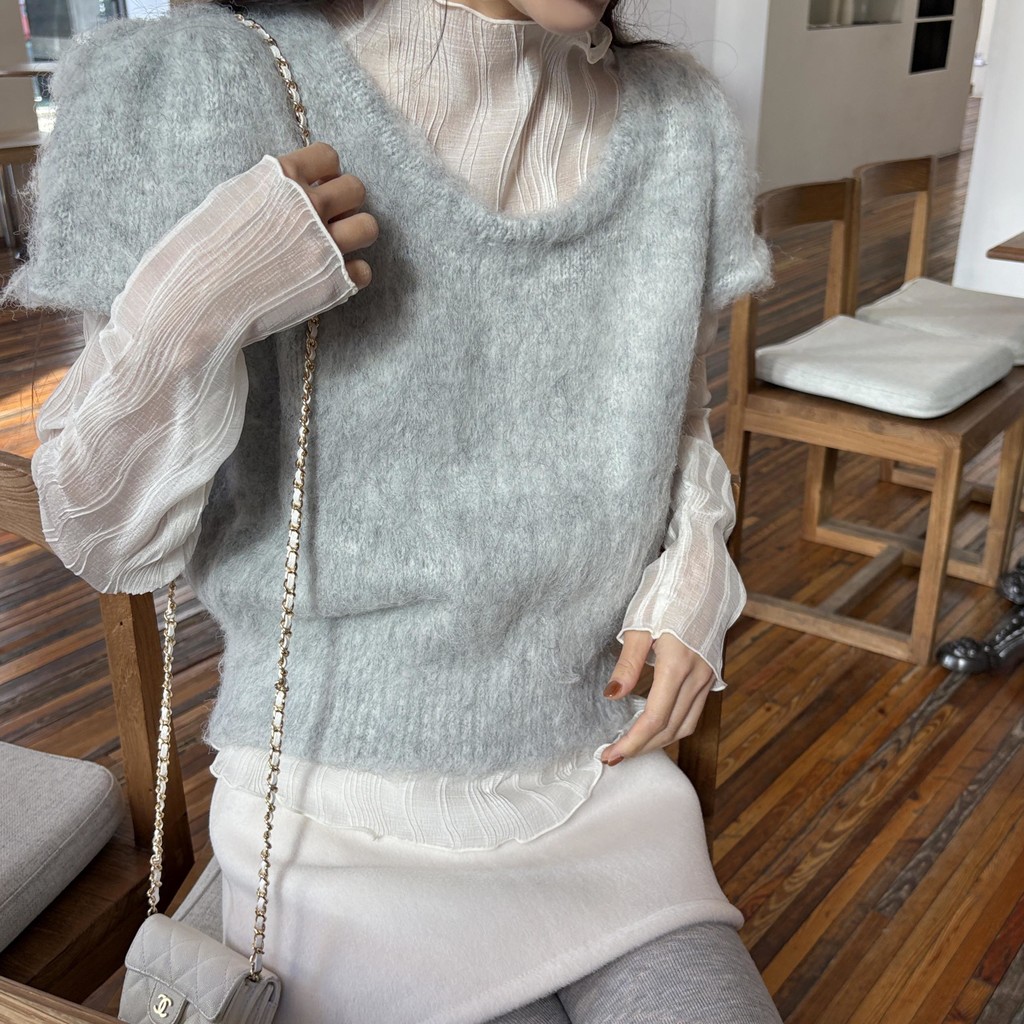 과하지 않고 여성스러운 퍼프소매에 쫀쫀한 밑단 시보리가 부하지 않게 허리 라인을 잡아줍니다. 쇄골 라인을 예쁘게 드러내는 라운드 U넥 디자인으로 단독 착용만으로도 여성스럽고 여리한 분위기를 연출하며, 블라우스나 티셔츠와 레이어드하기도 좋아요.