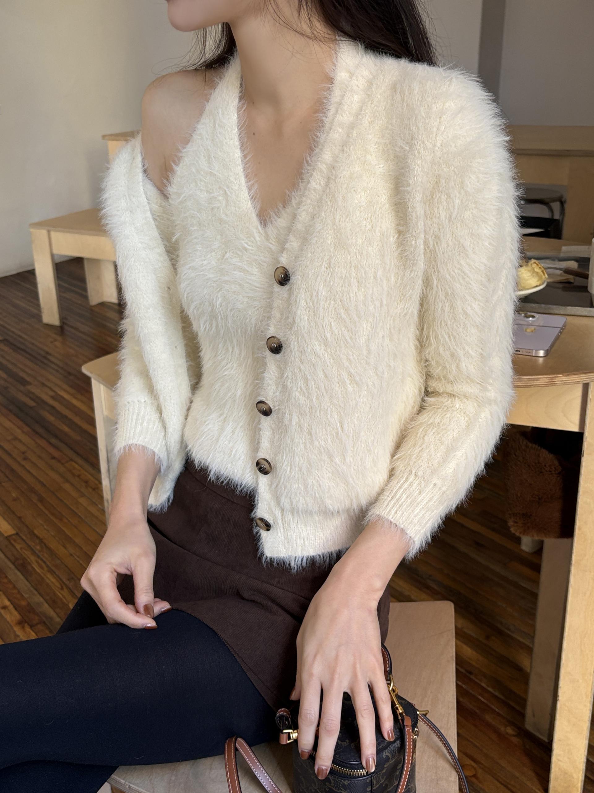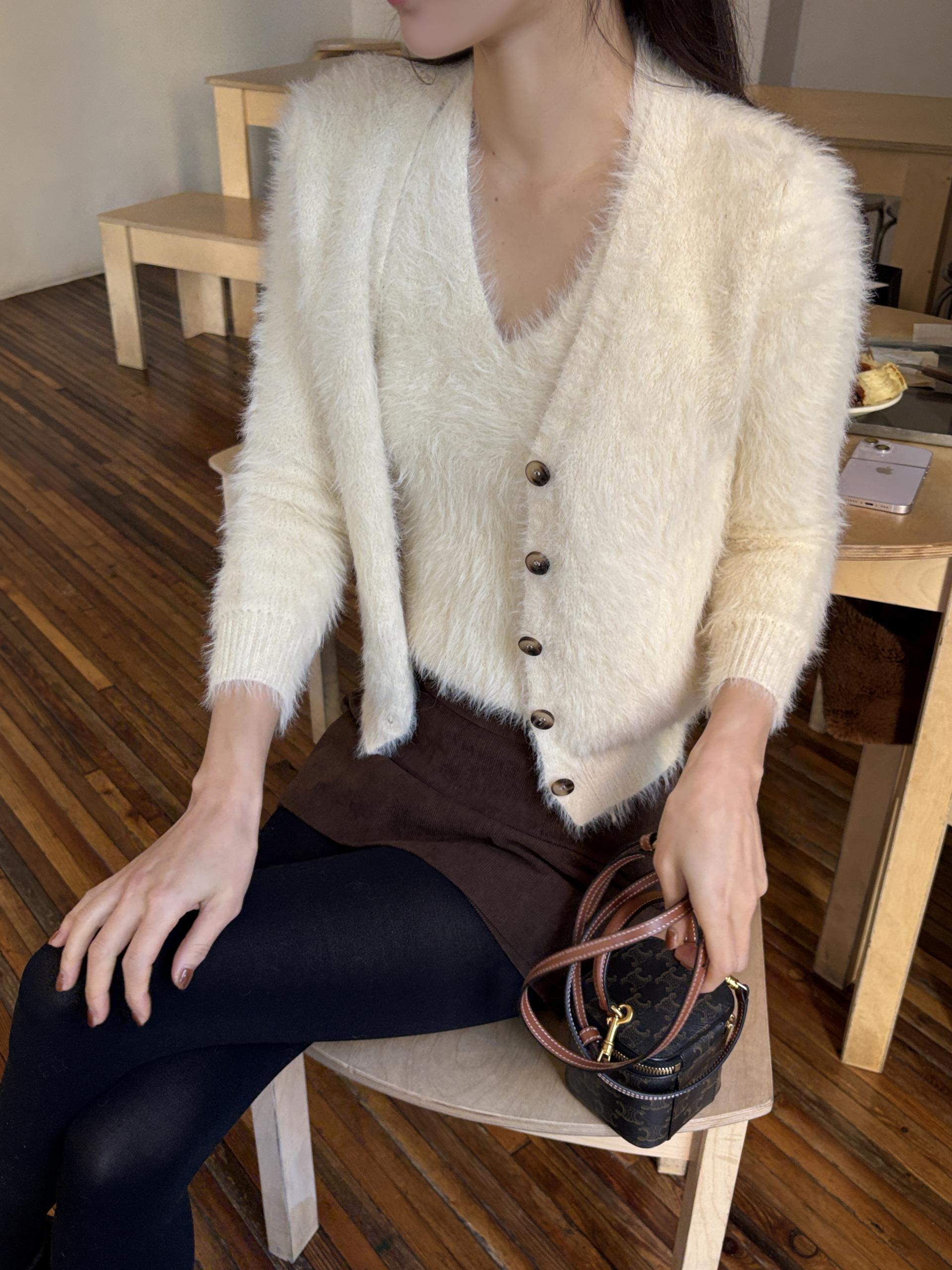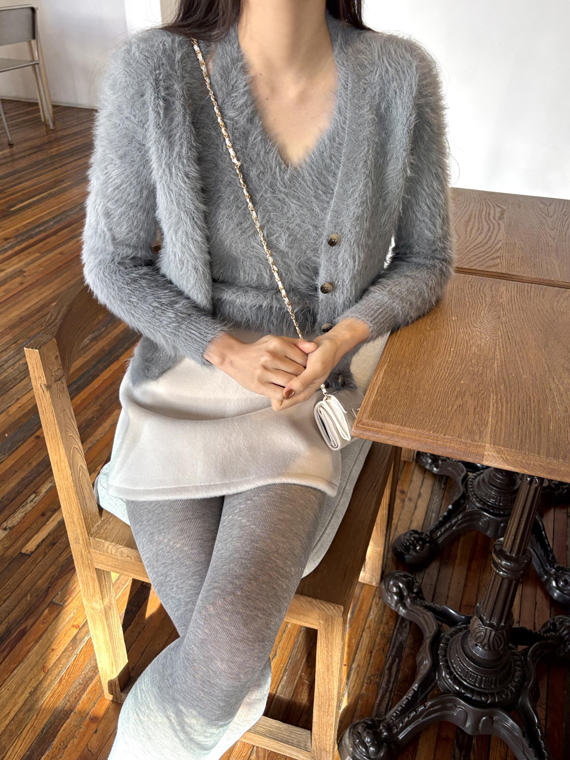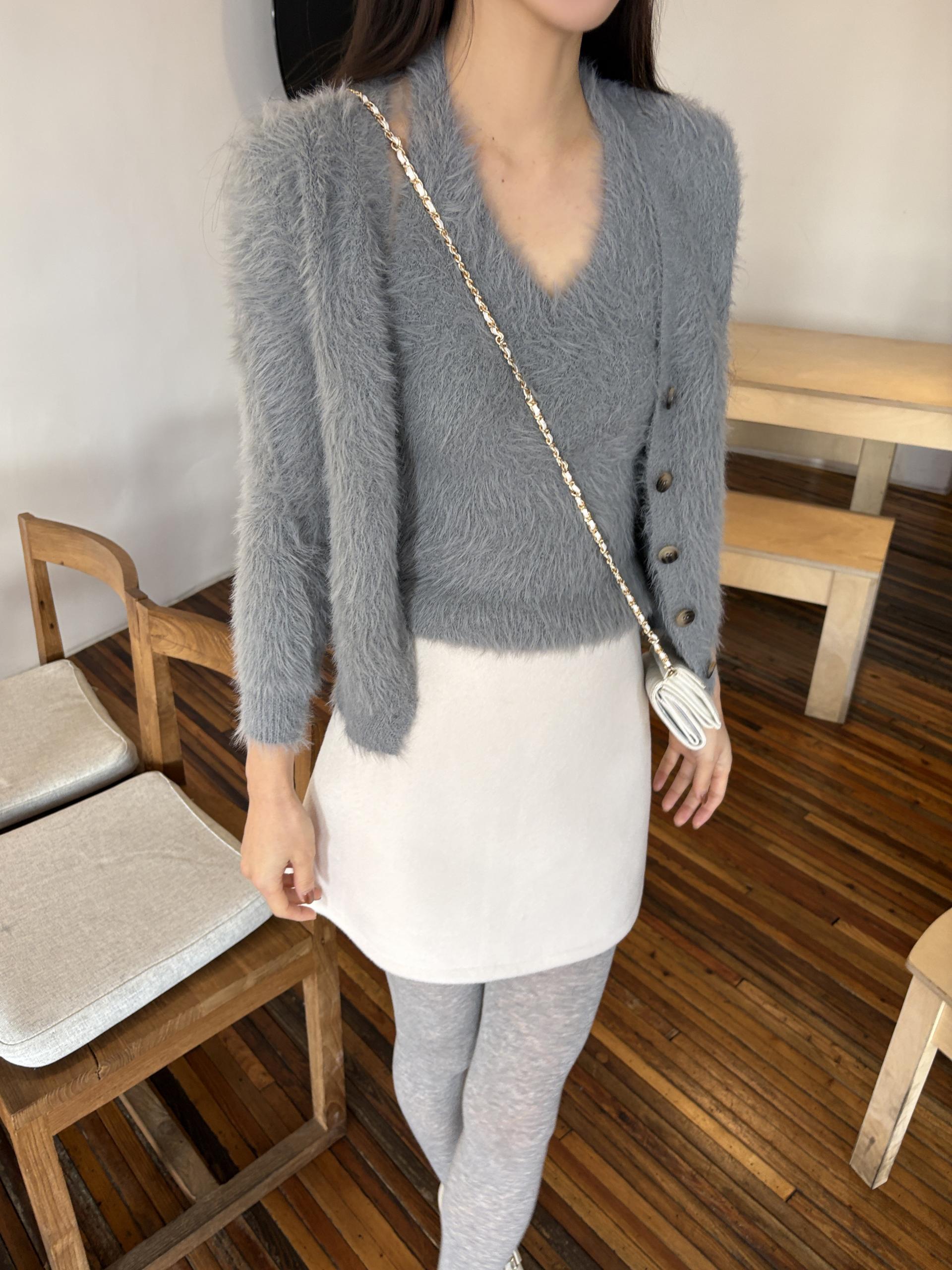쇄골 라인을 여리하게 강조해 주는 홀터넥 나시와 자연스럽게 떨어지는 브이넥 가디건이 세트로 구성되어 단독, 레이어드 모두 활용도가 높습니다.