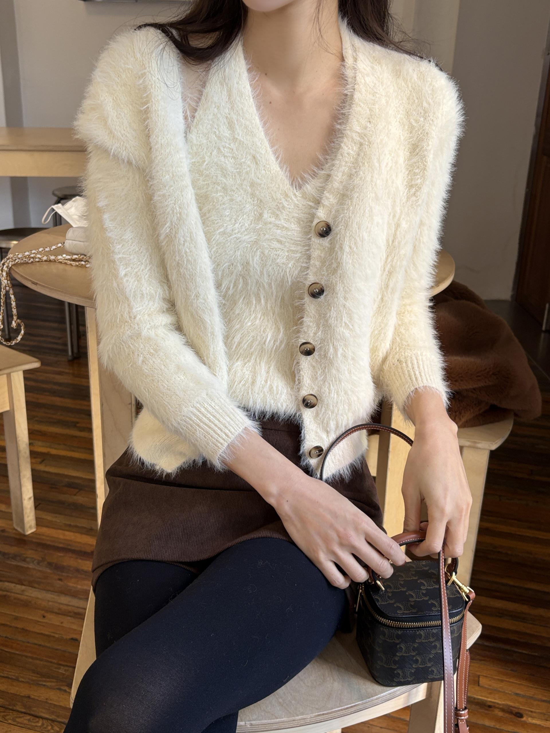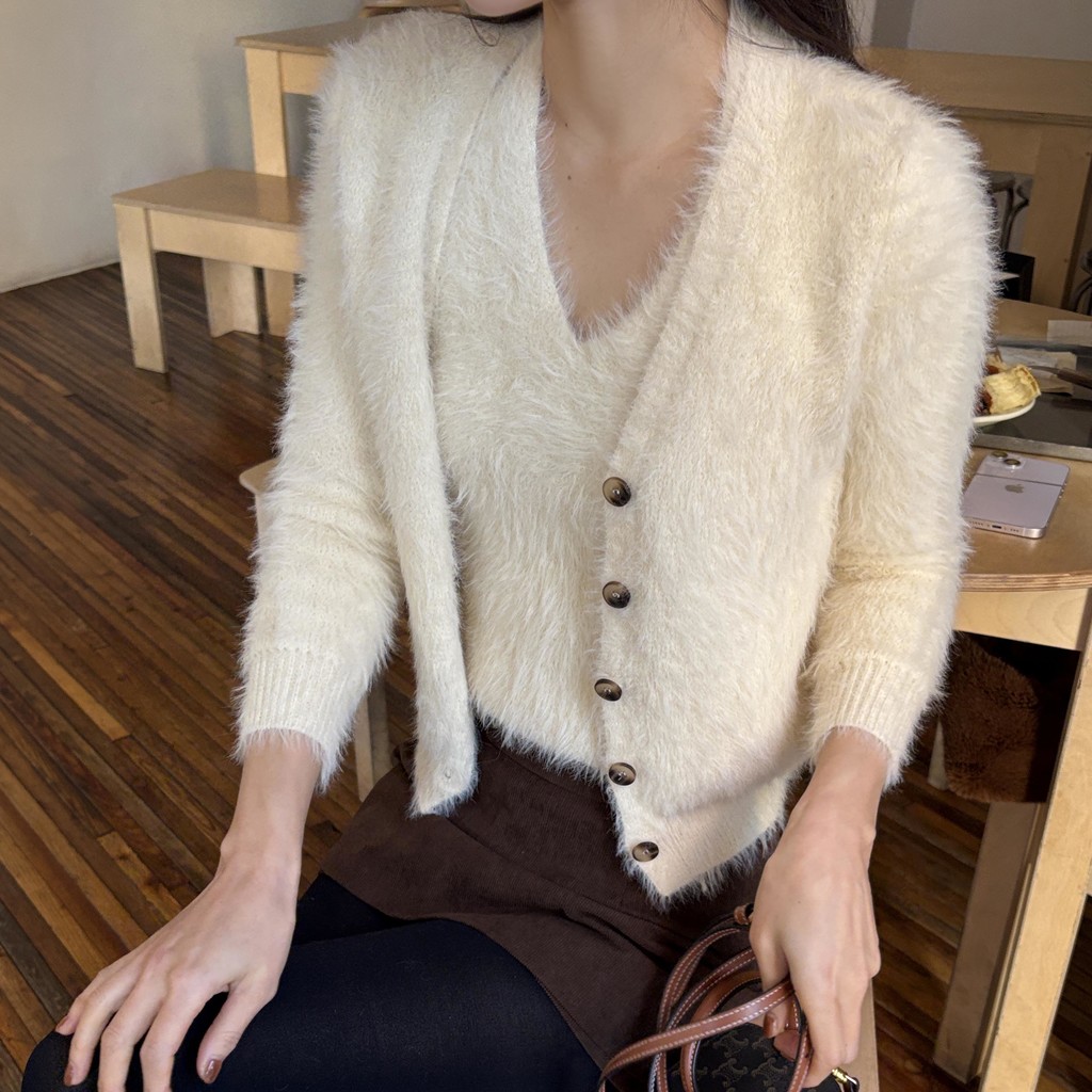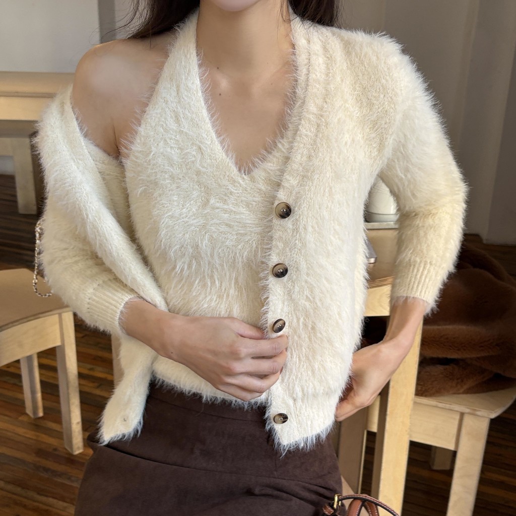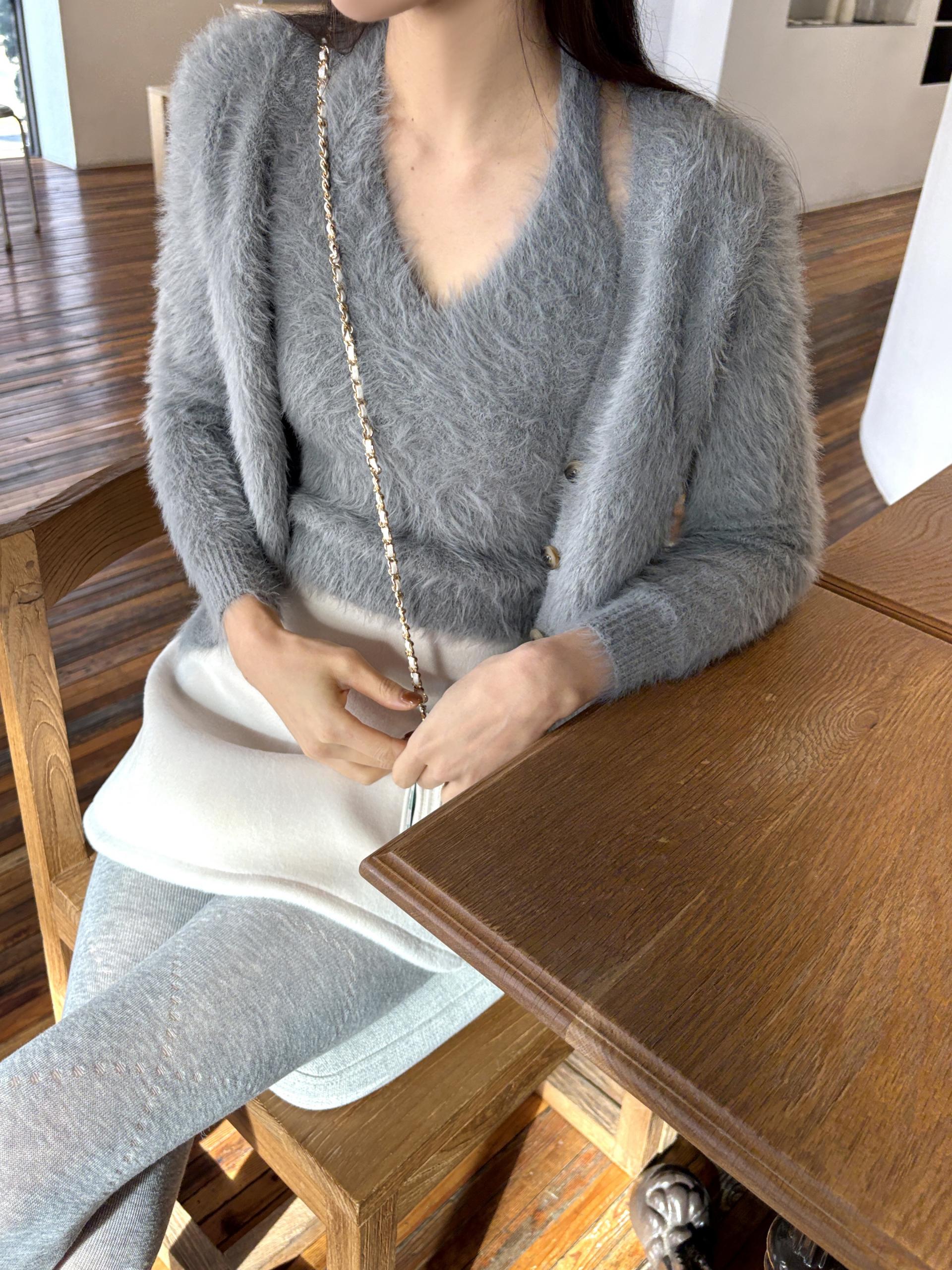 쇄골 라인을 여리하게 강조해 주는 홀터넥 나시와 자연스럽게 떨어지는 브이넥 가디건이 세트로 구성되어 단독, 레이어드 모두 활용도가 높습니다.