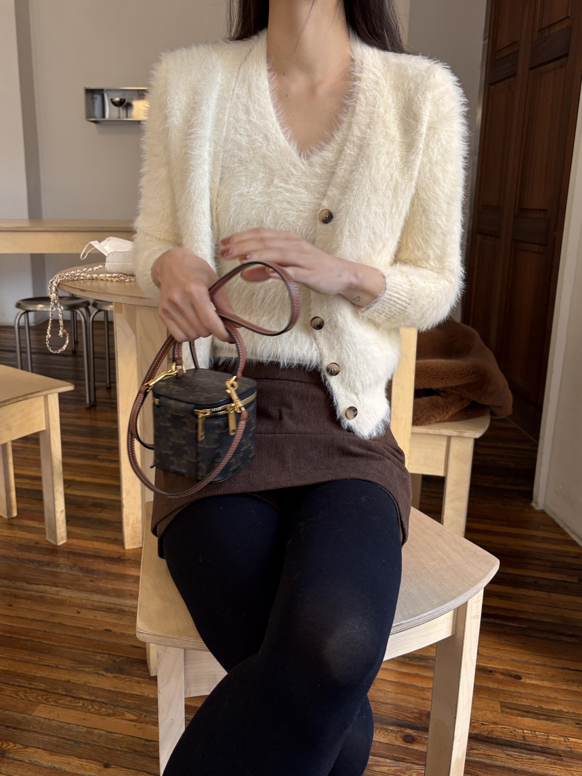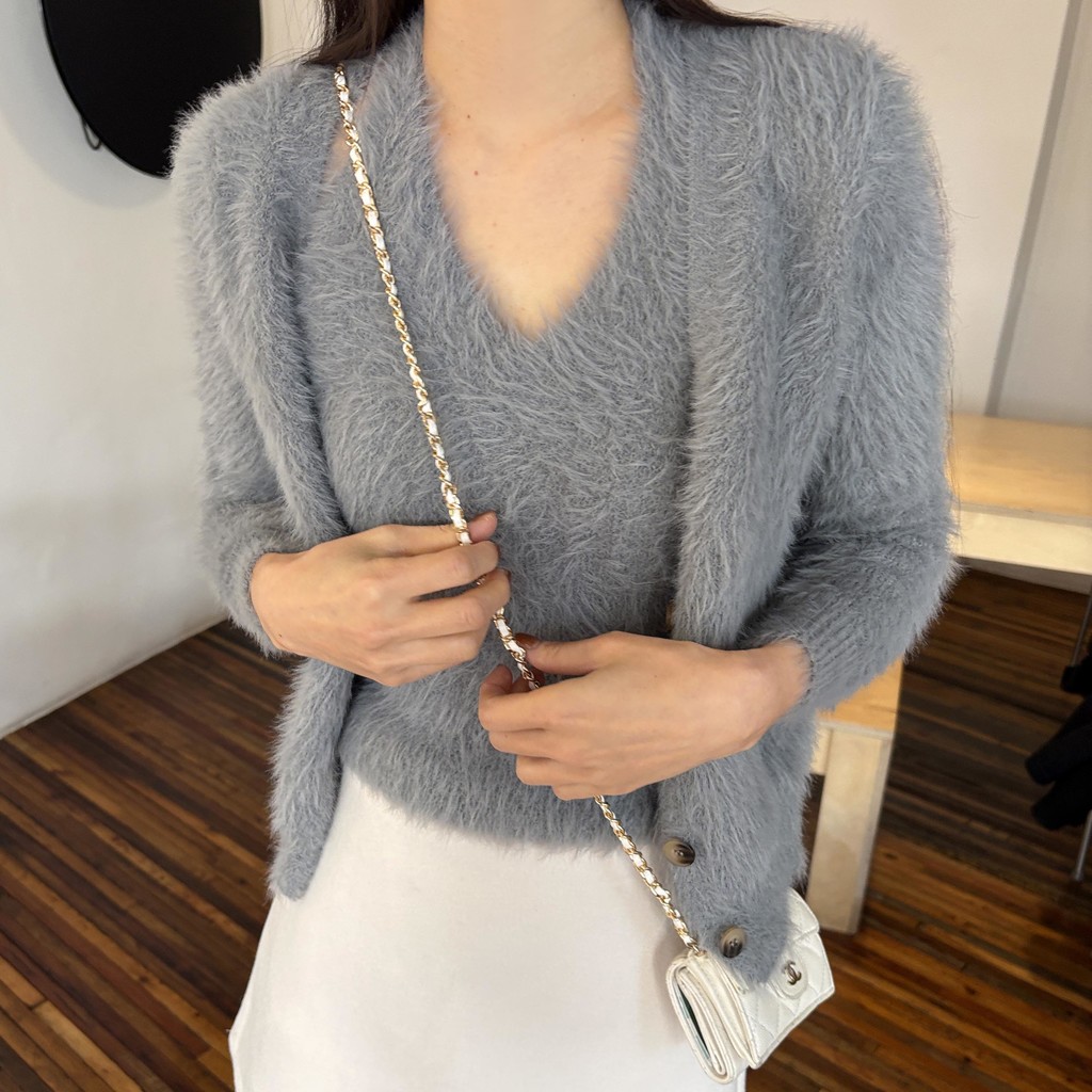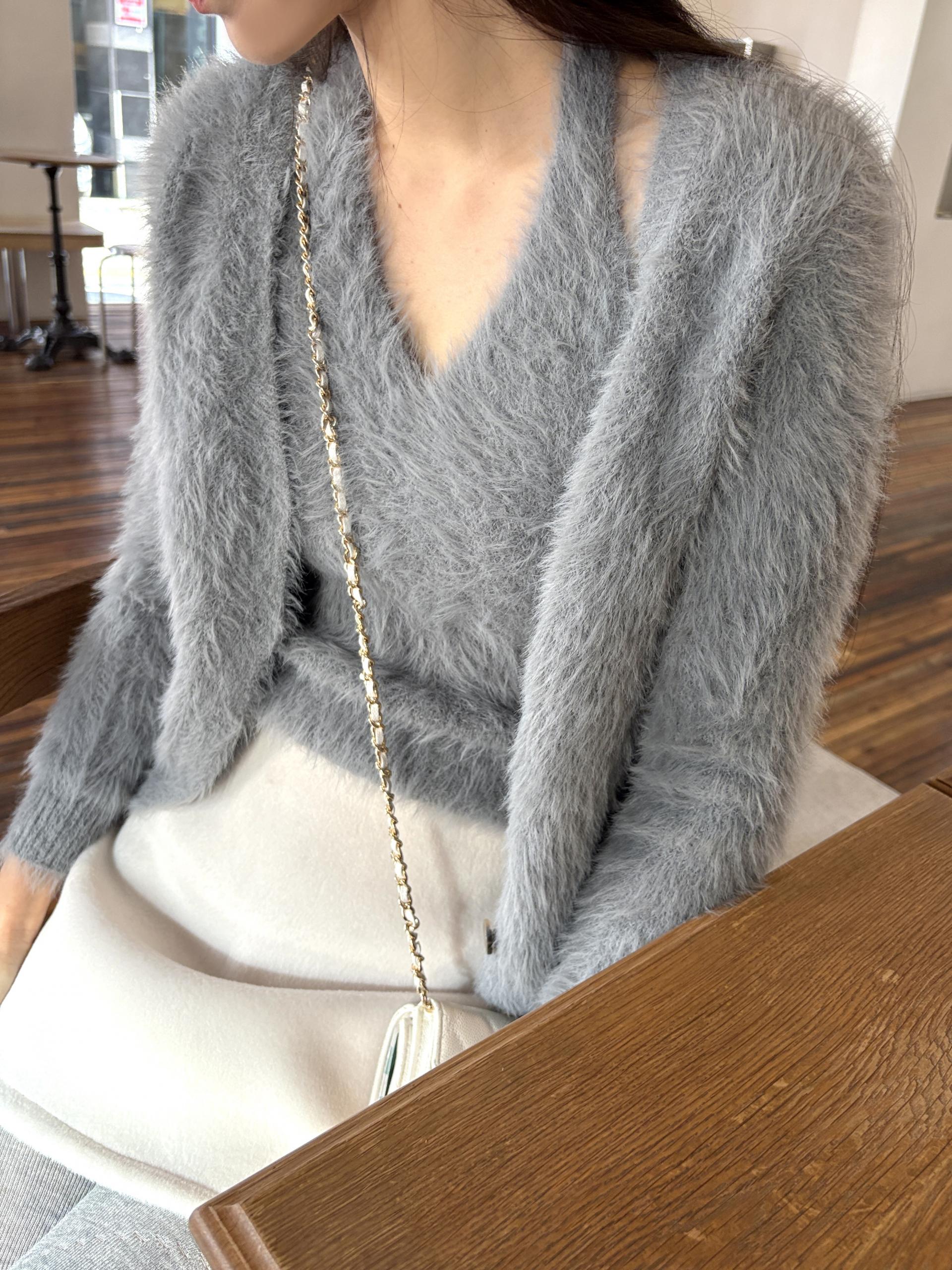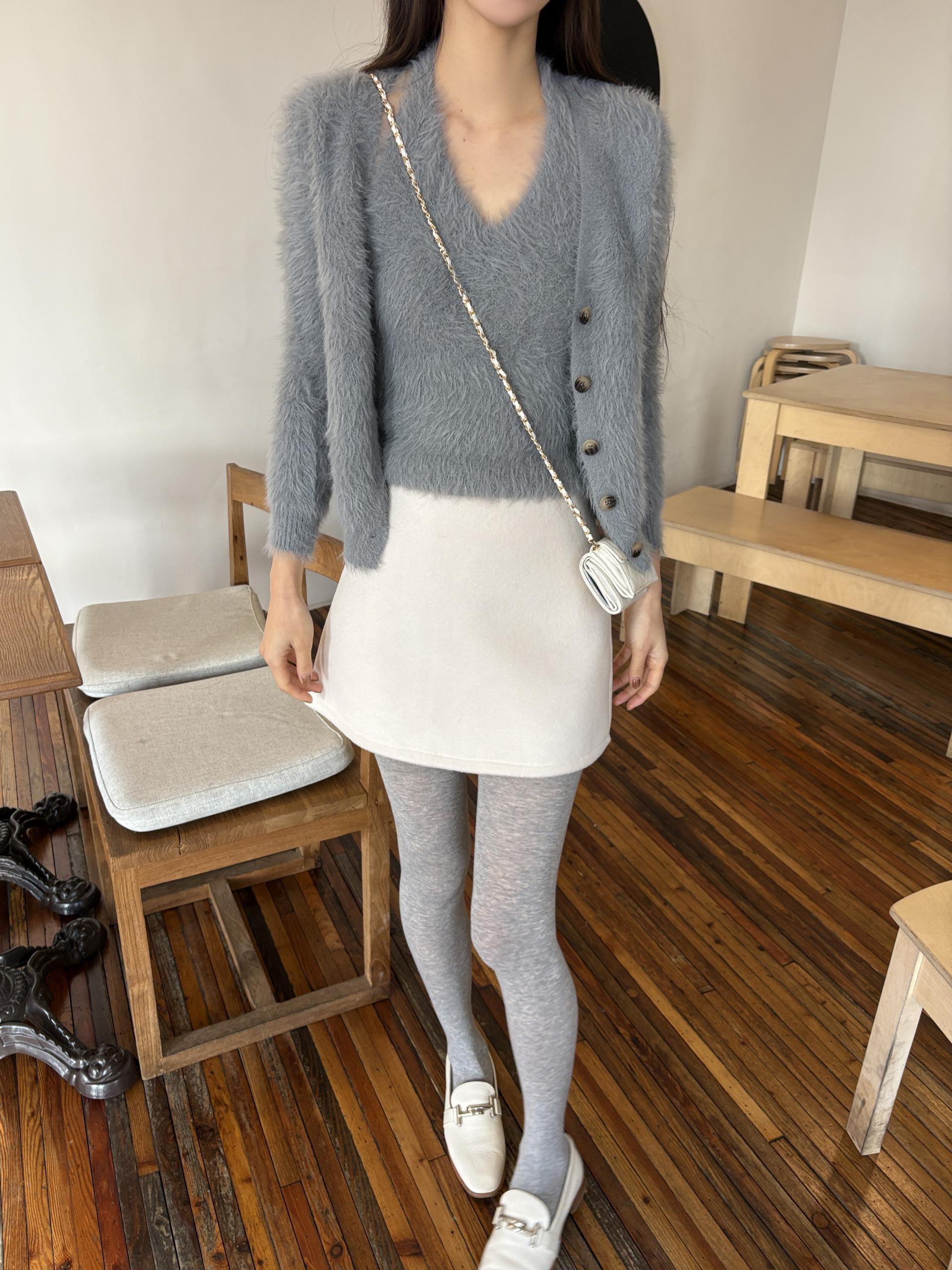 부드럽고 풍성한 퍼 소재감의 니트 투피스 세트입니다.