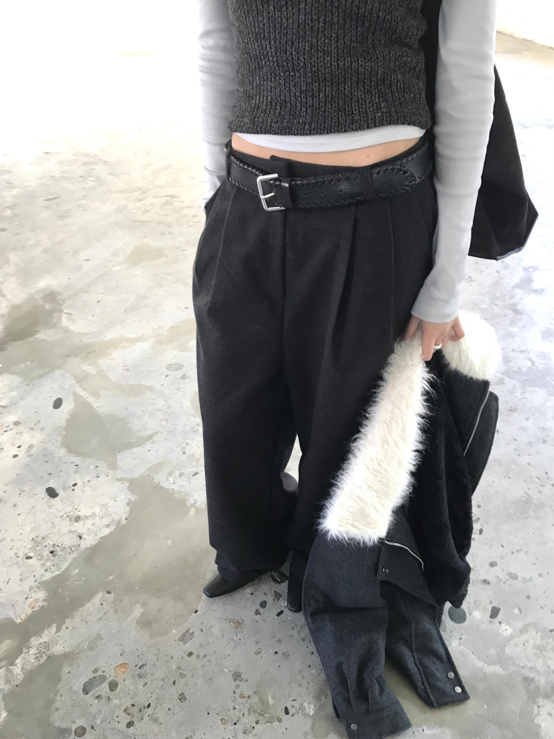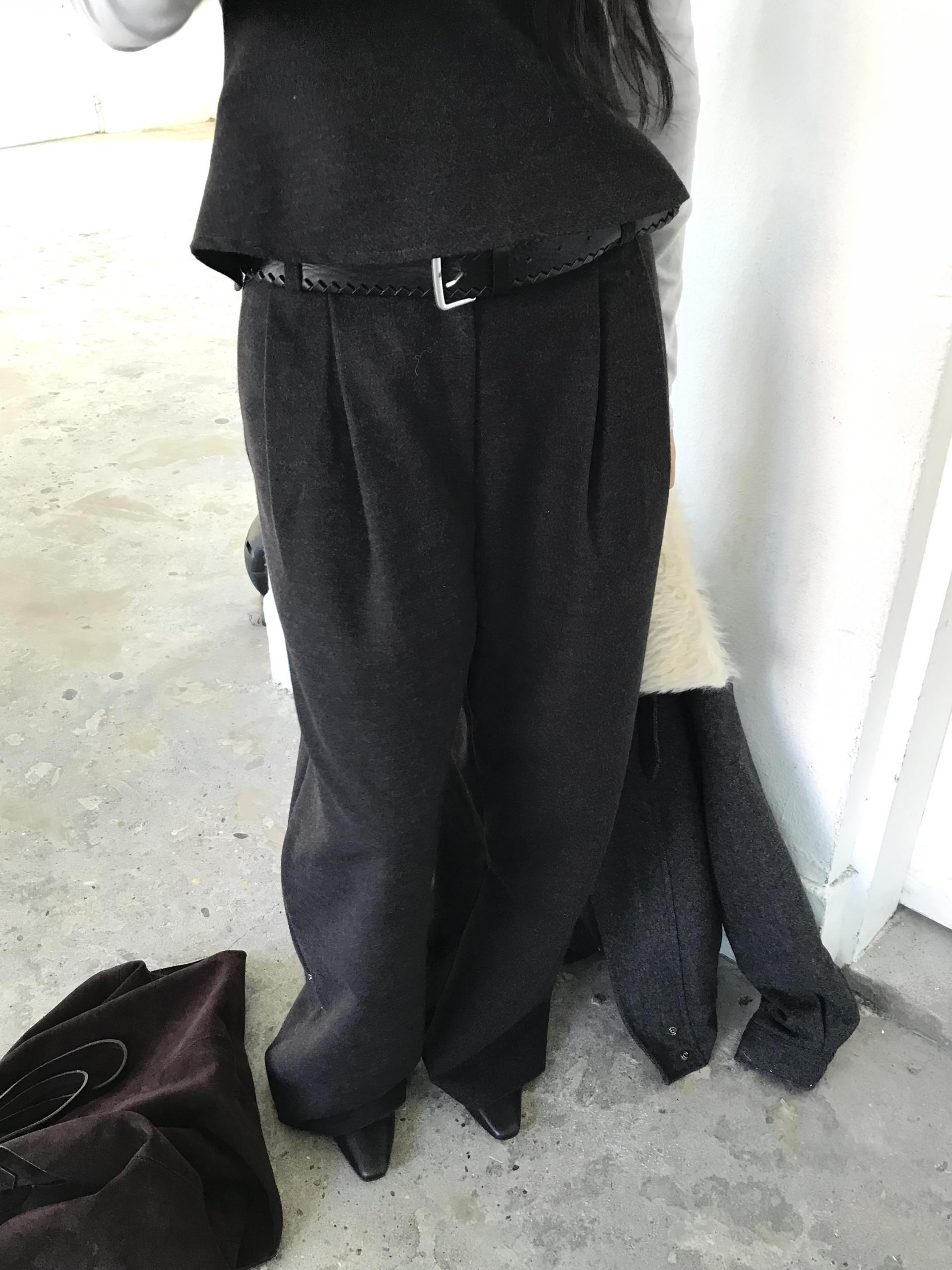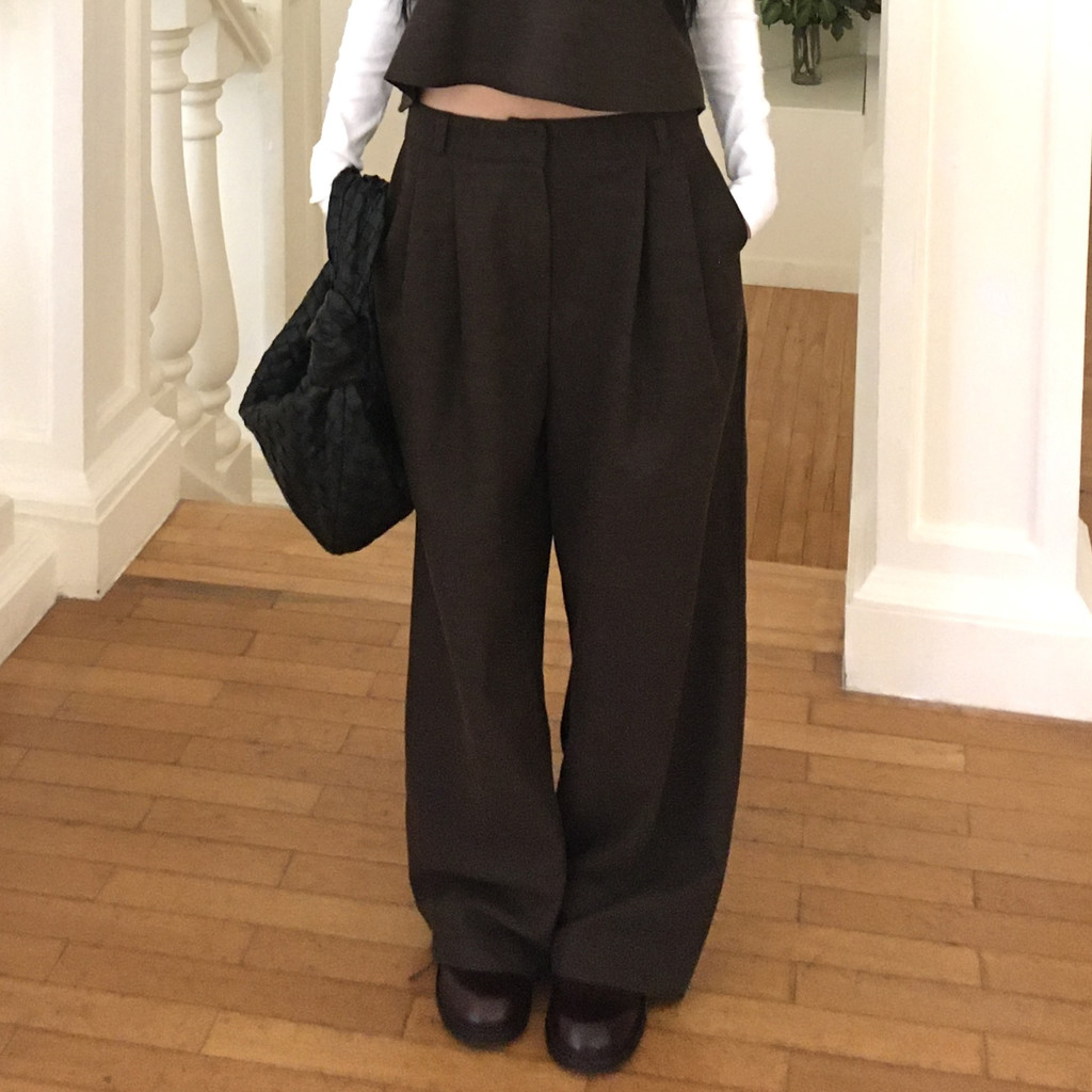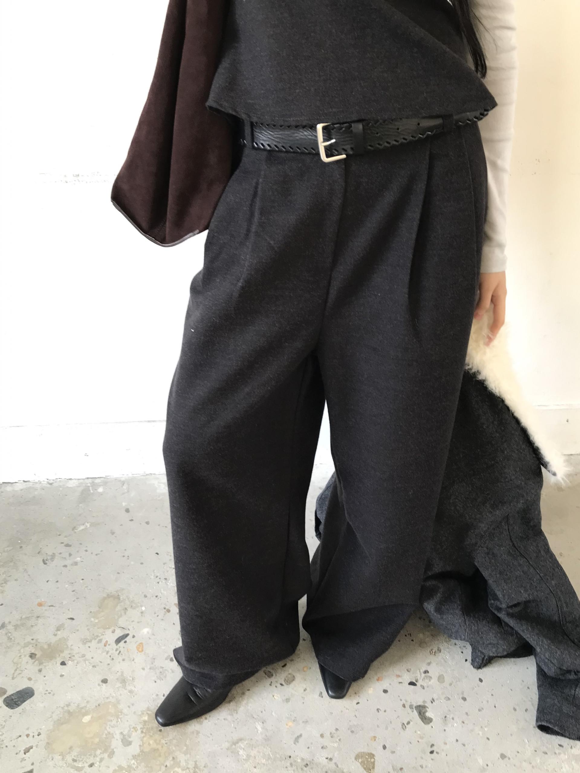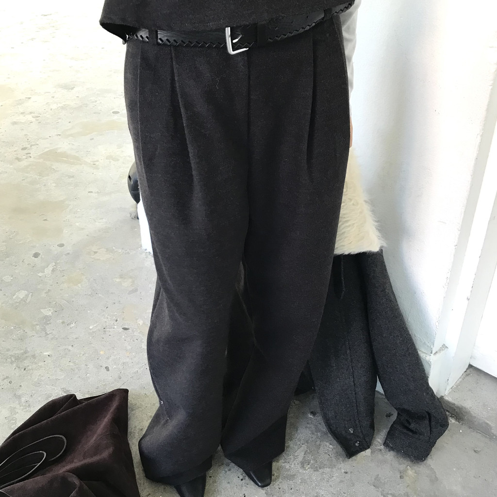 도톰한 울 블렌드 소재로 제작된 클래식 무드의 로우라이즈 와이드 슬랙스입니다.