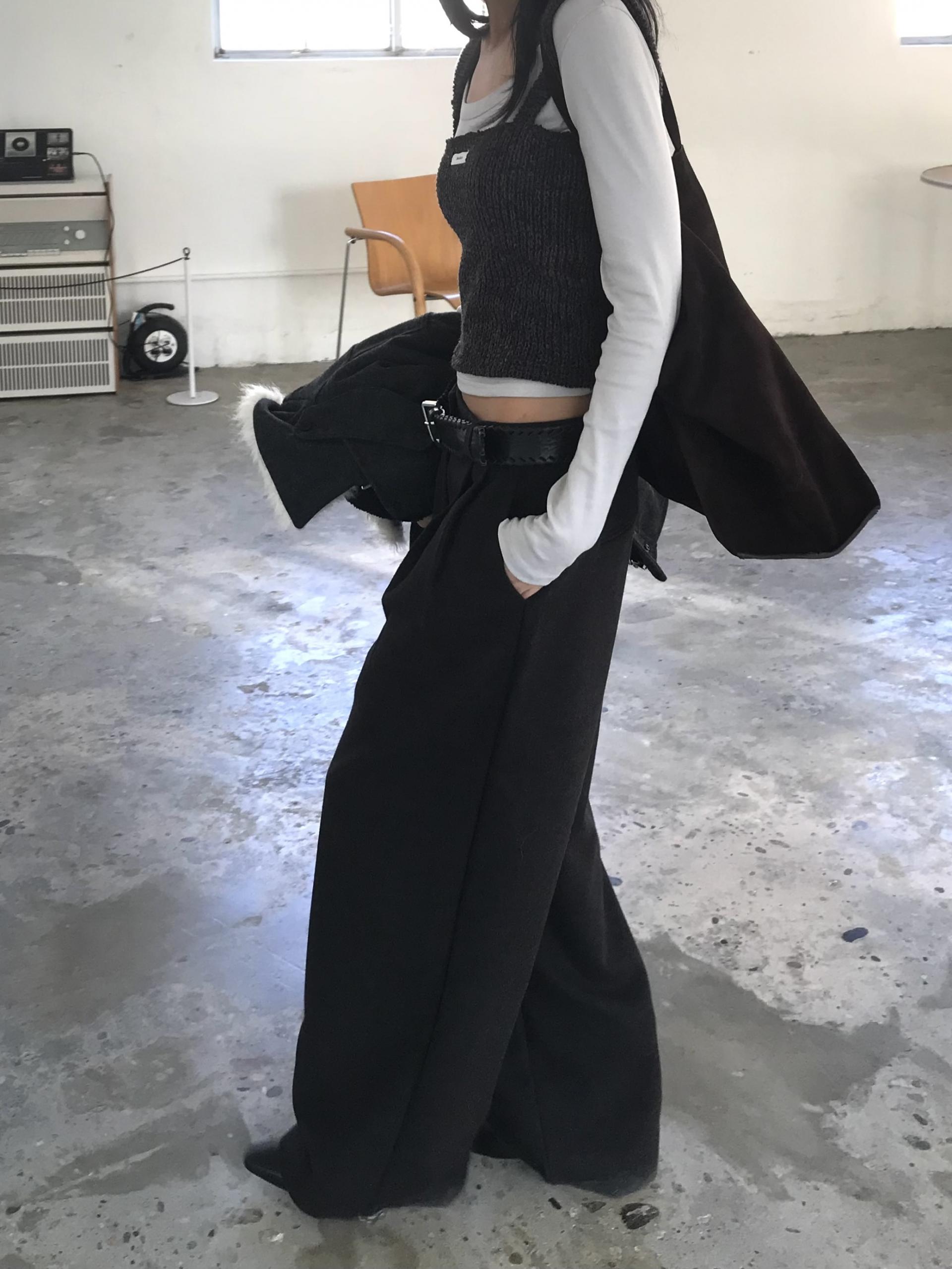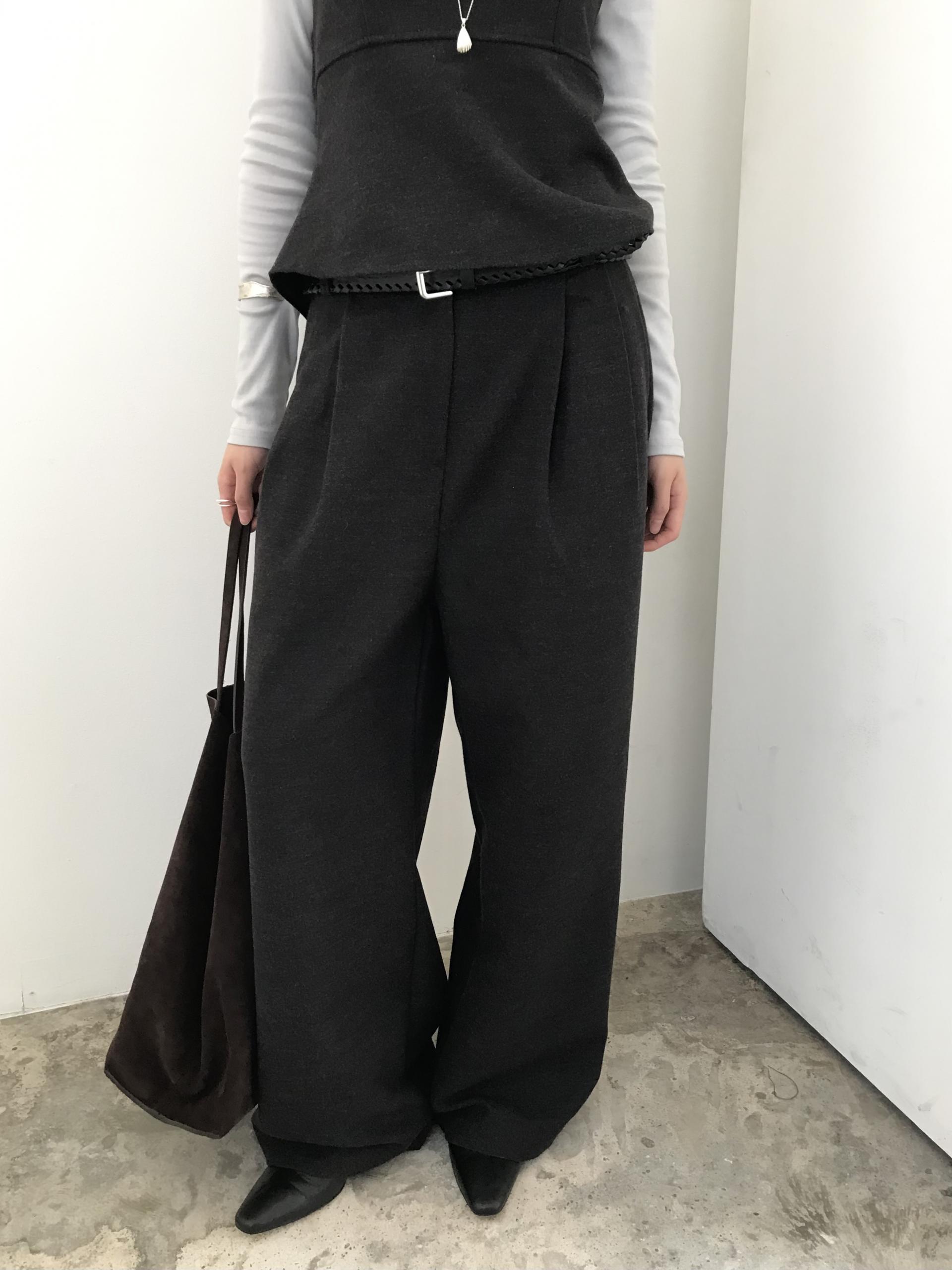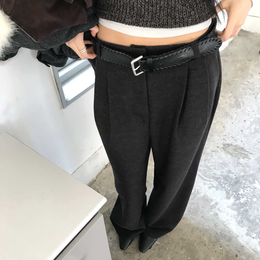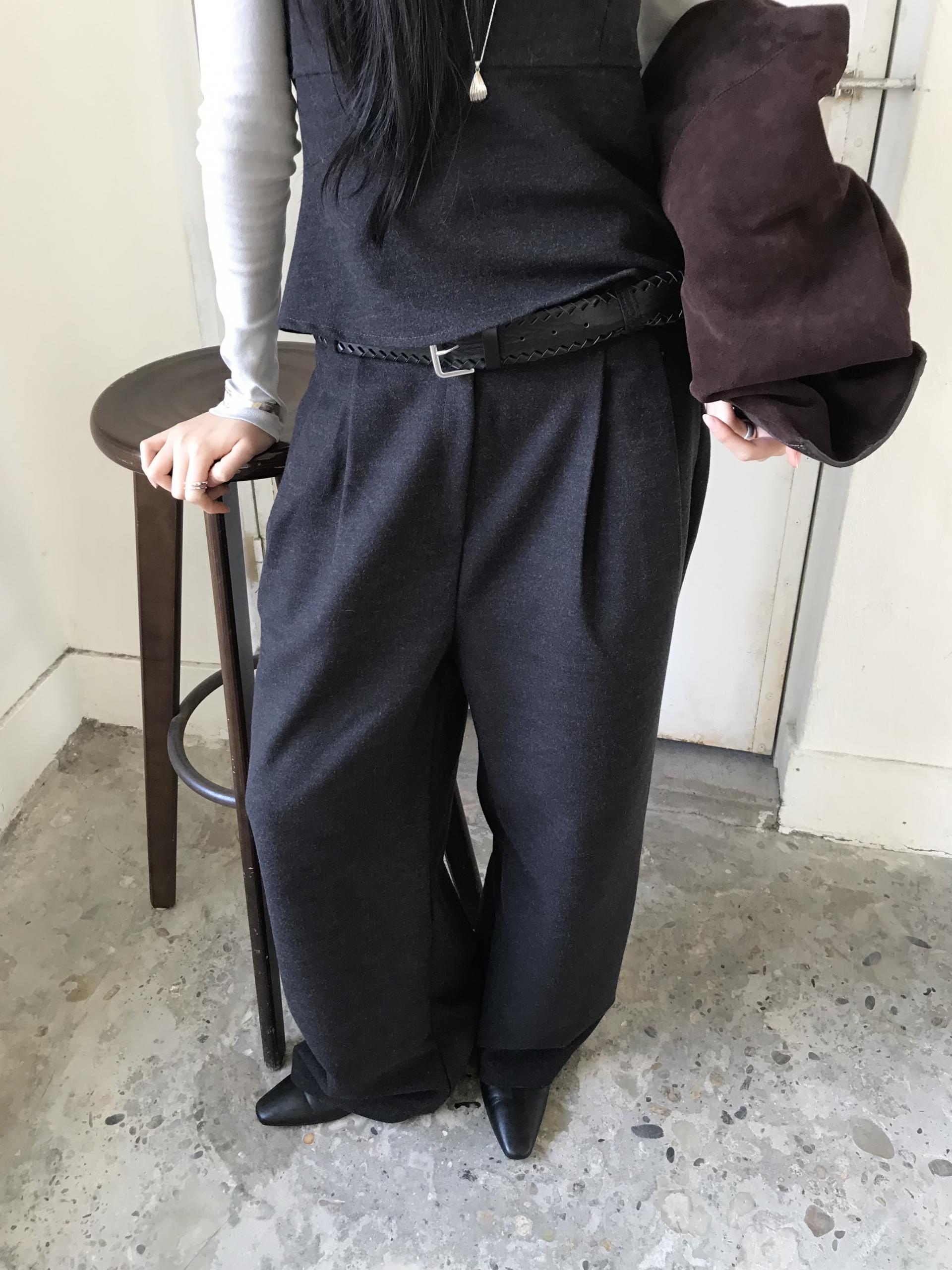 도톰한 울 블렌드 소재로 제작된 클래식 무드의 로우라이즈 와이드 슬랙스입니다.