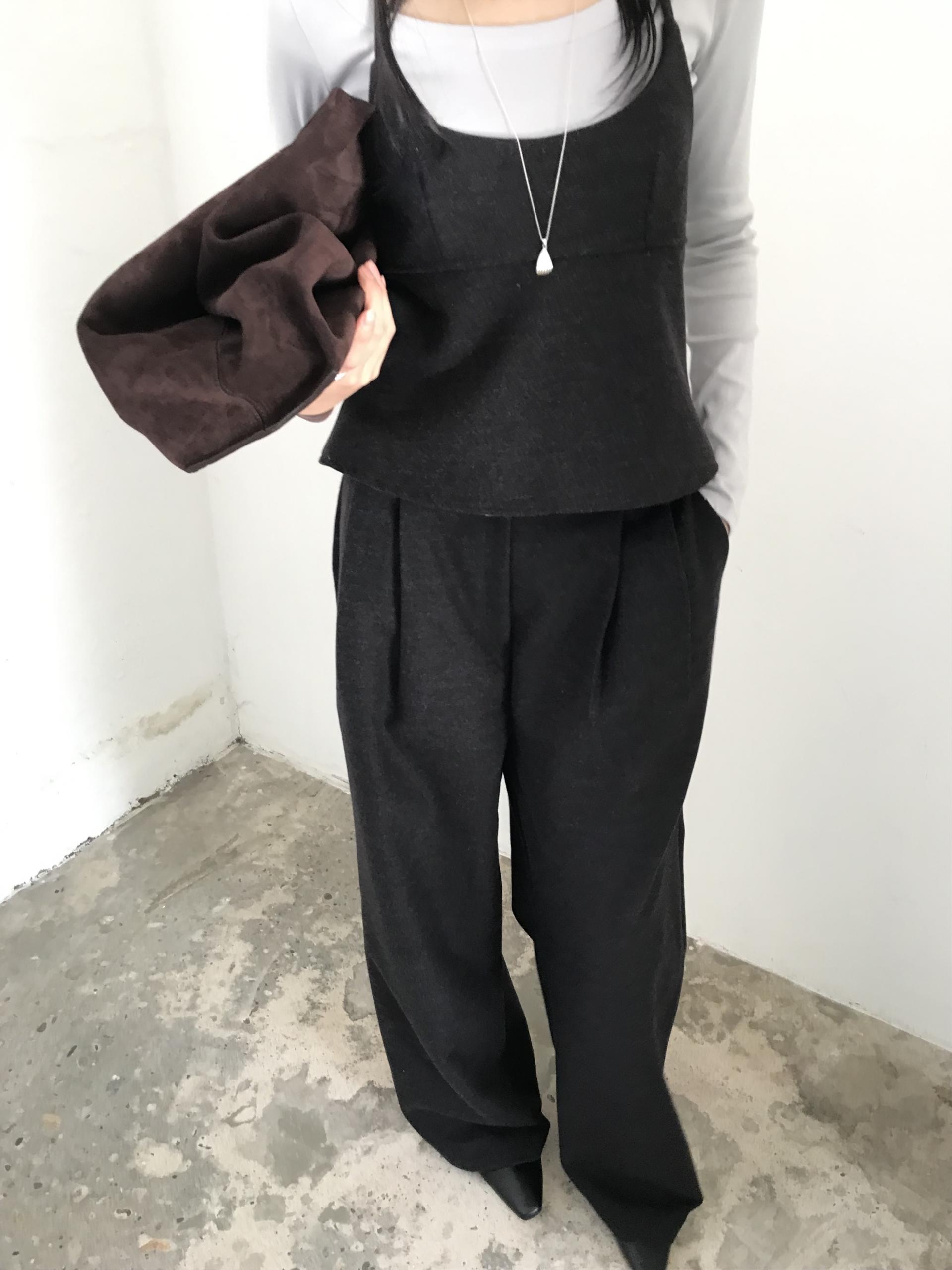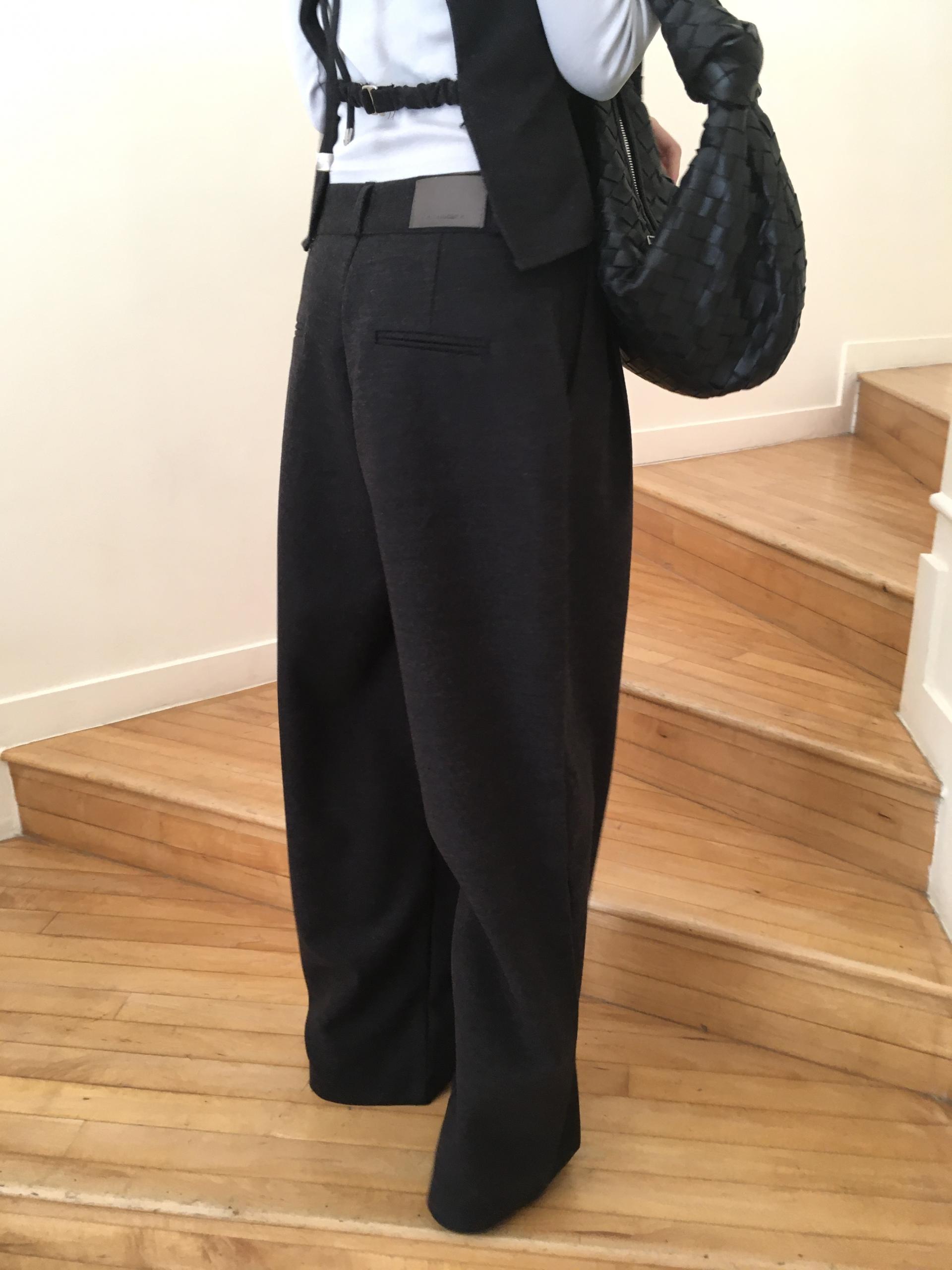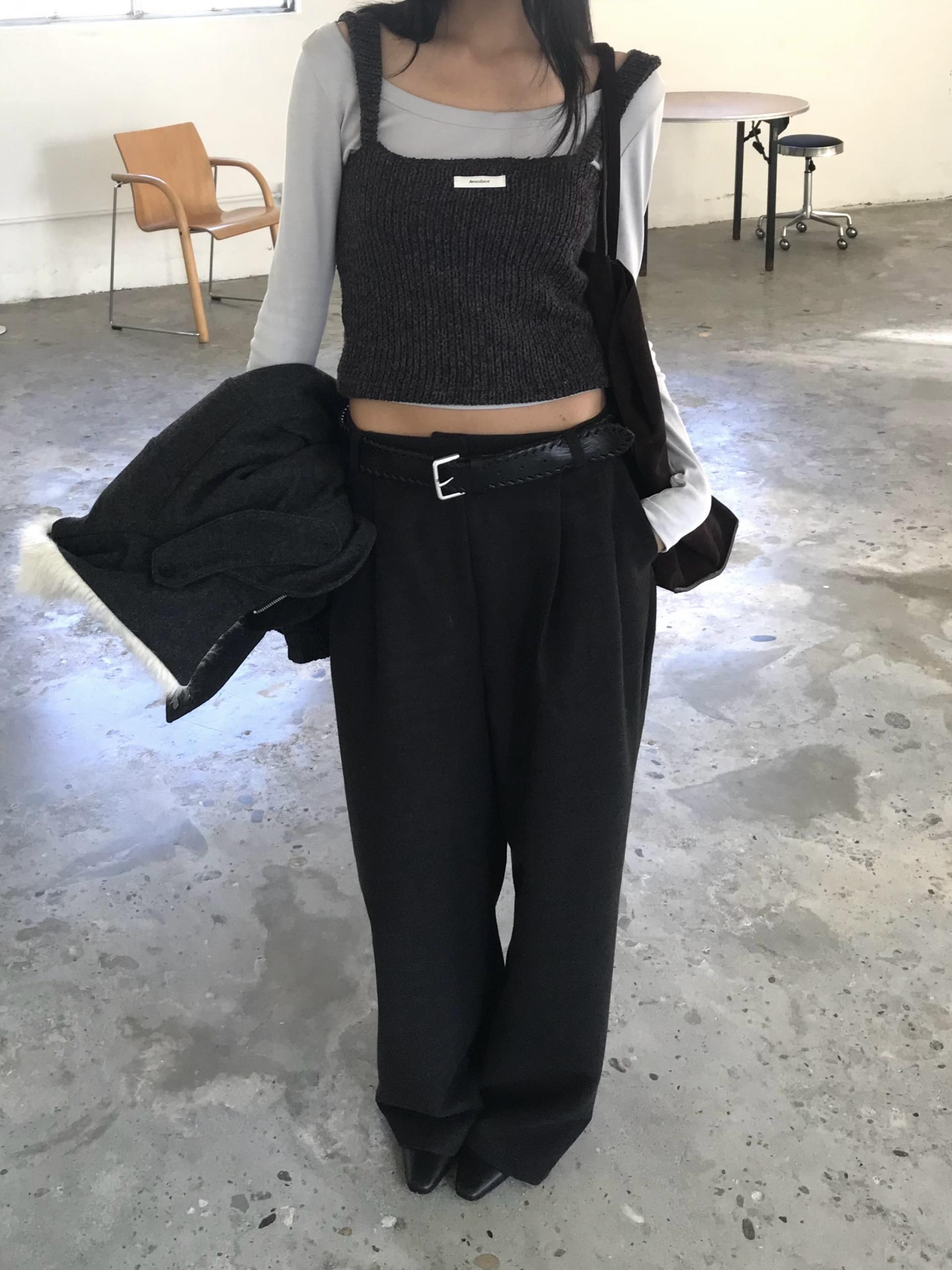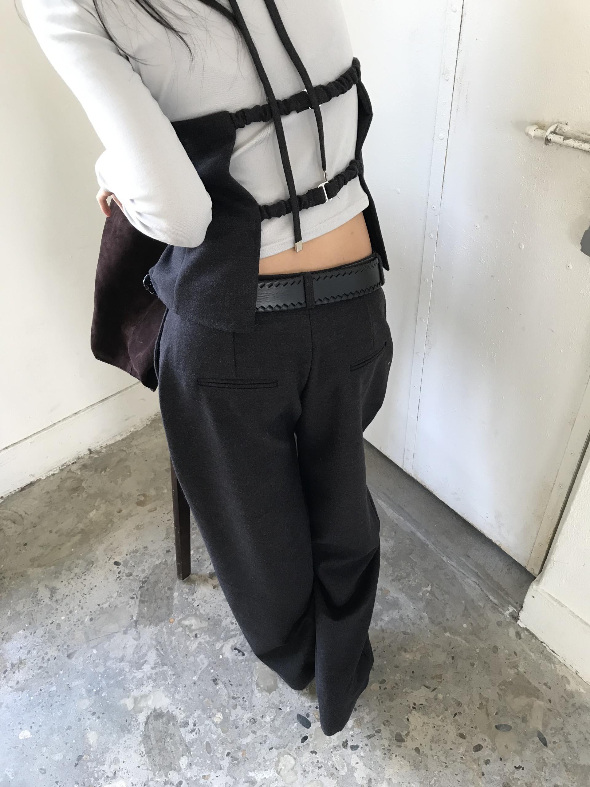 도톰한 울 블렌드 소재로 제작된 클래식 무드의 로우라이즈 와이드 슬랙스입니다.