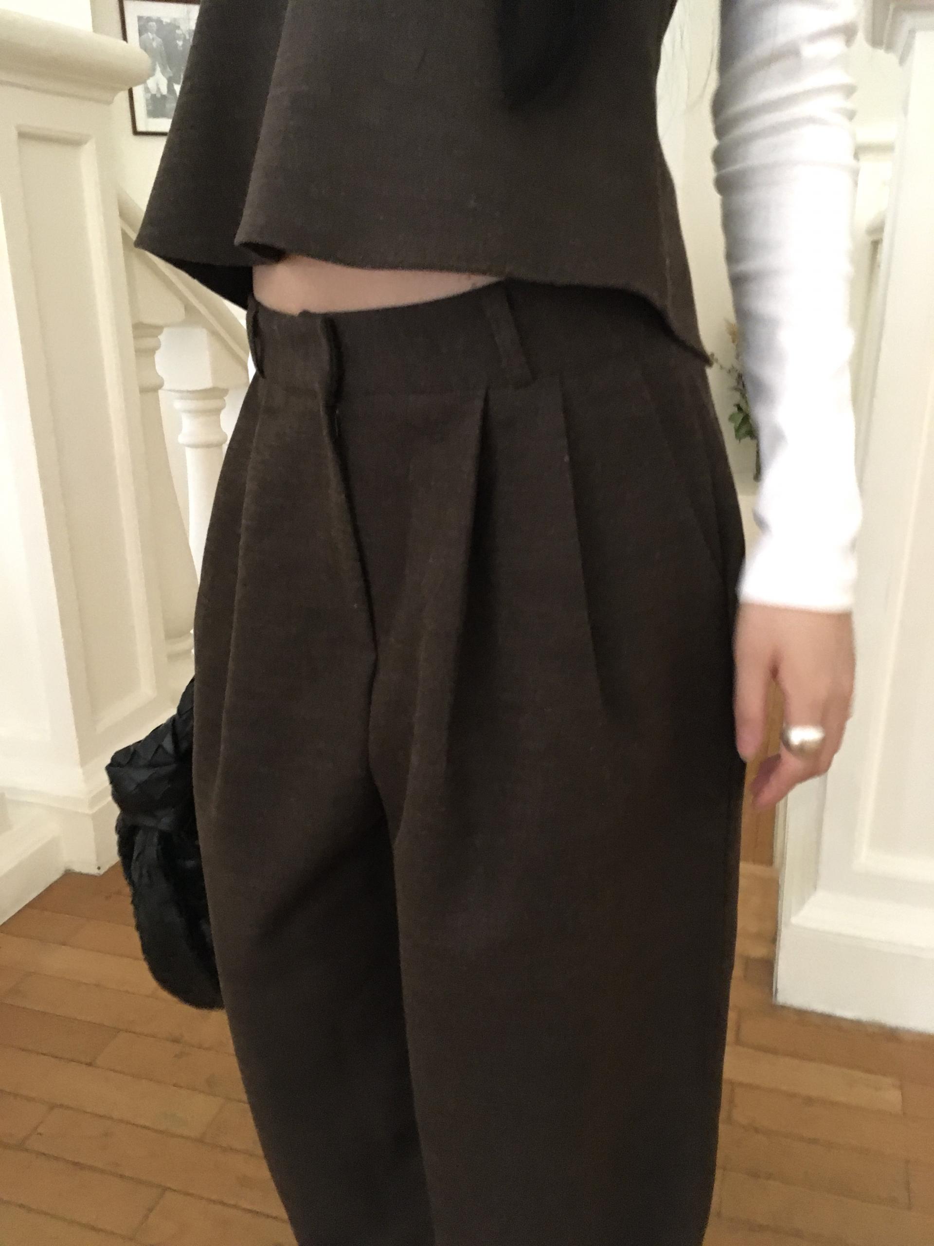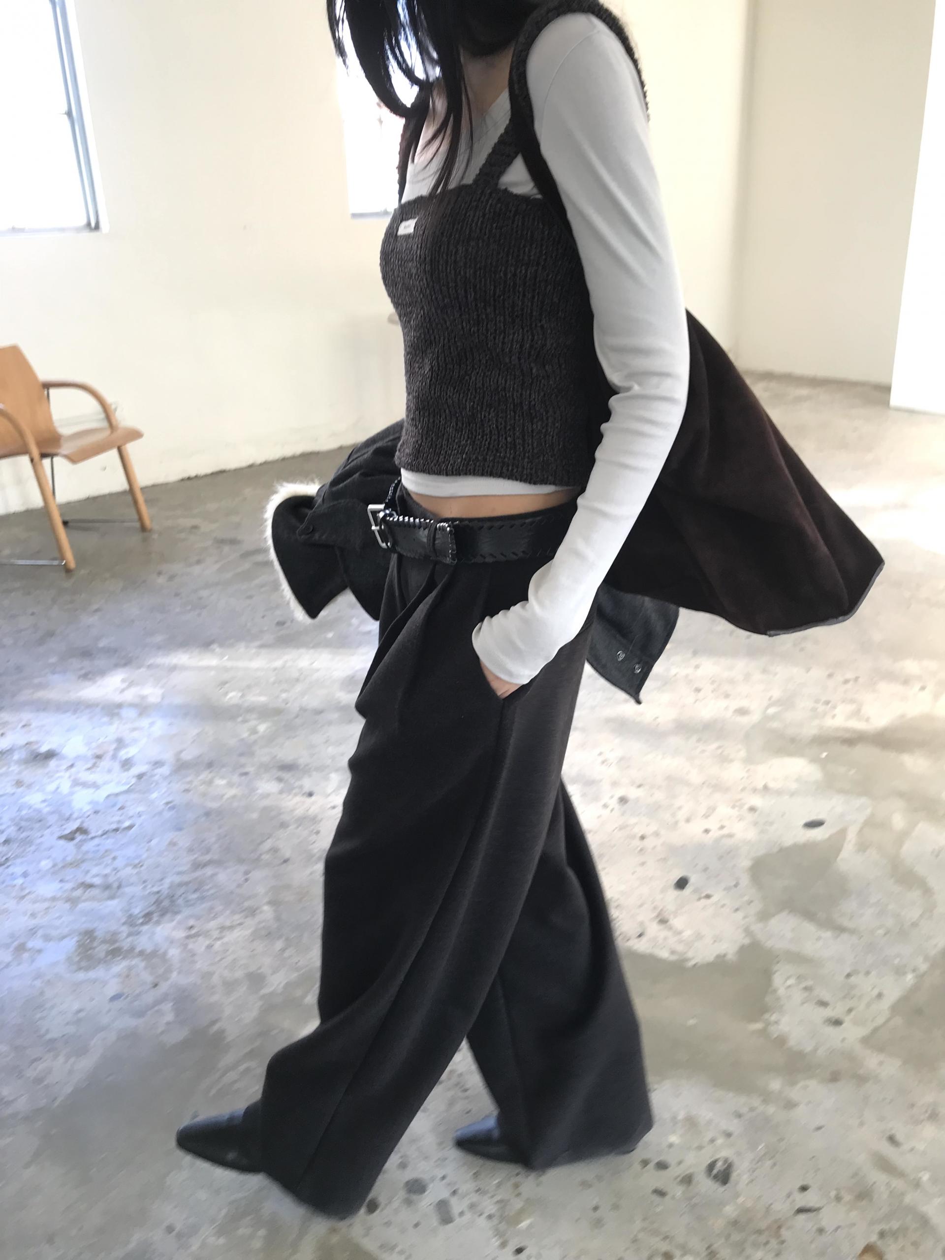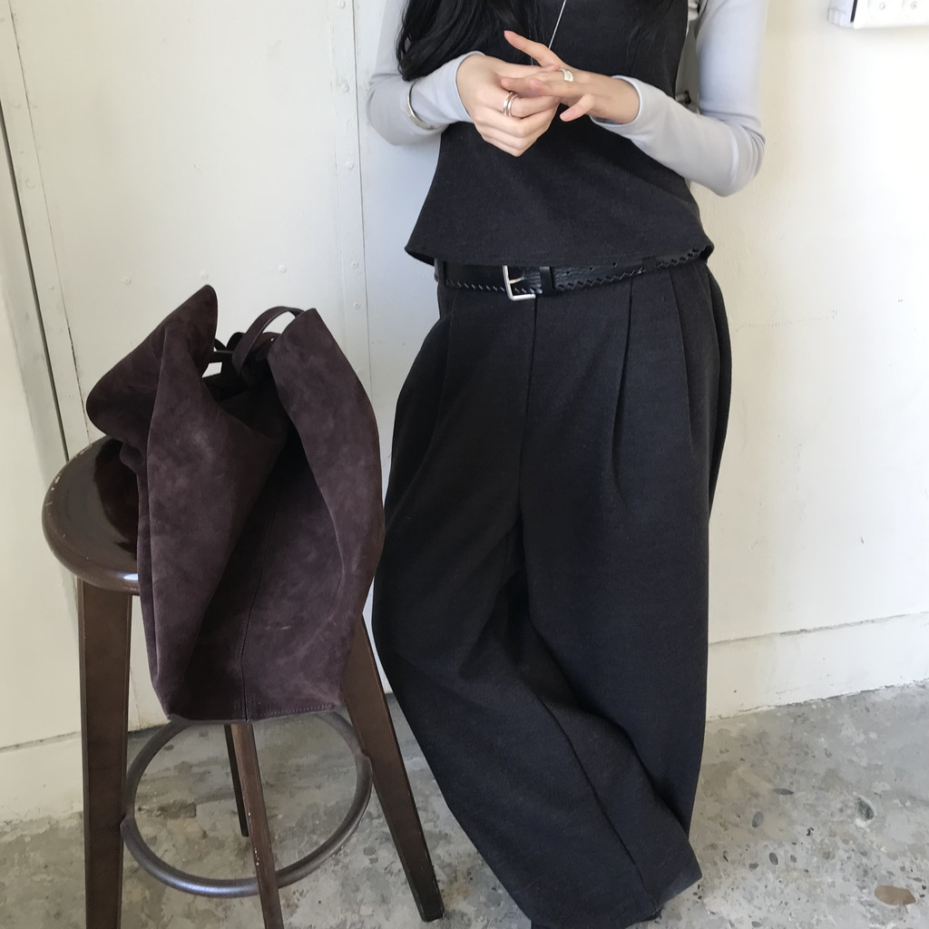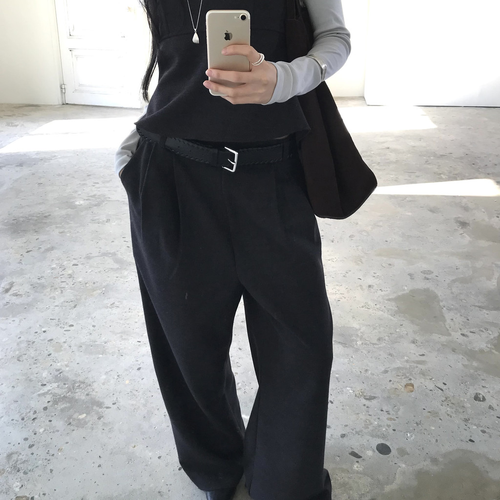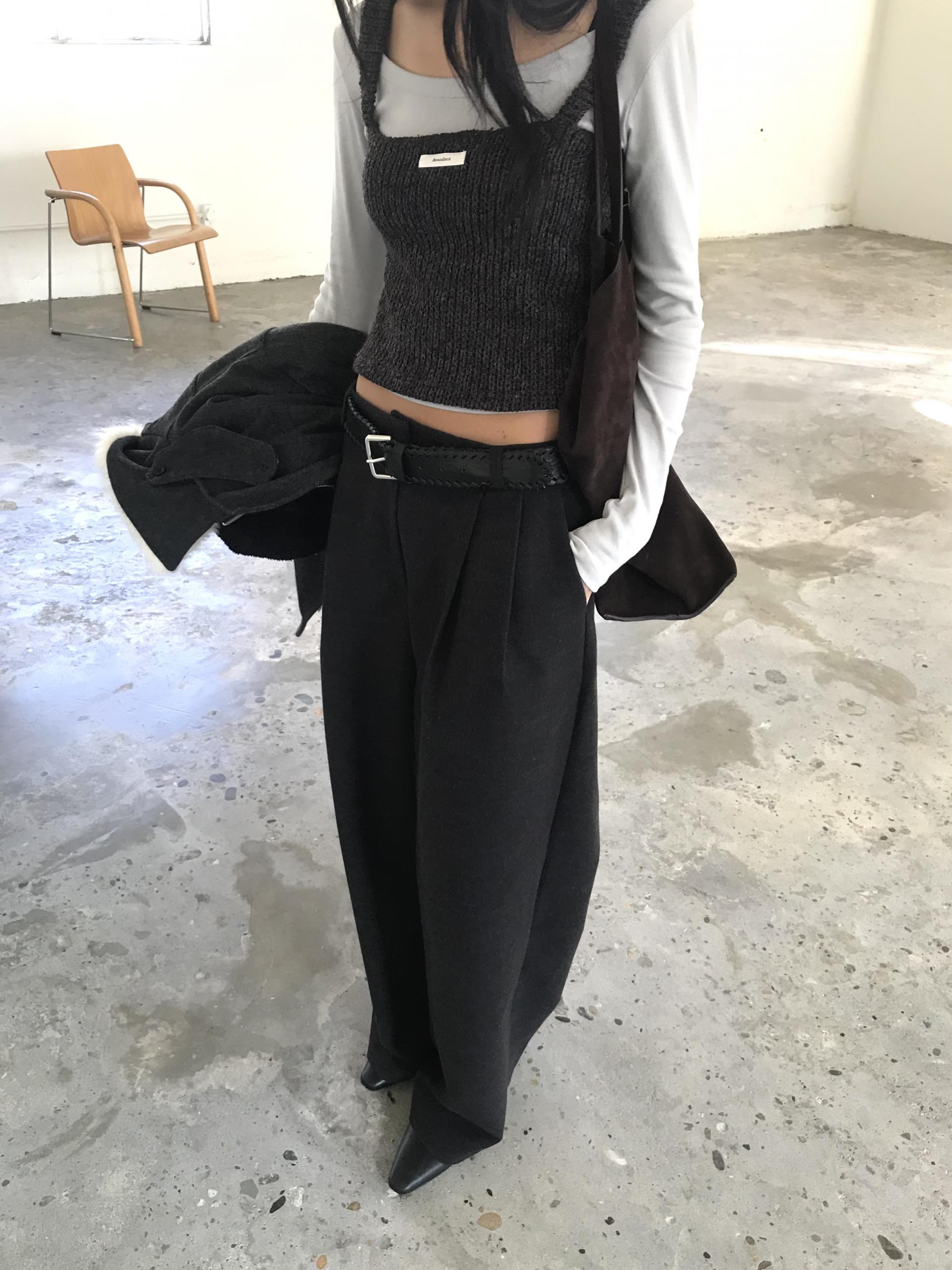 도톰한 울 블렌드 소재로 제작된 클래식 무드의 로우라이즈 와이드 슬랙스입니다.