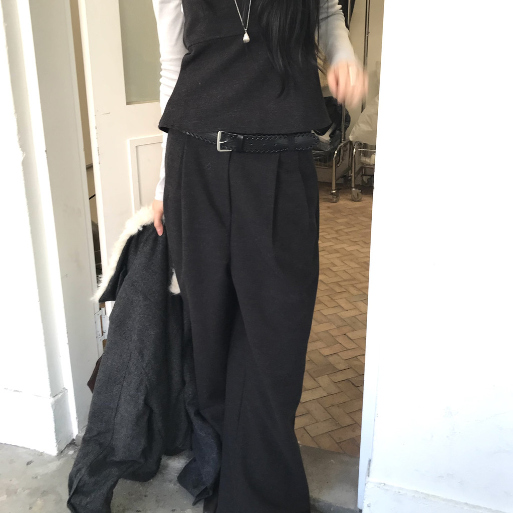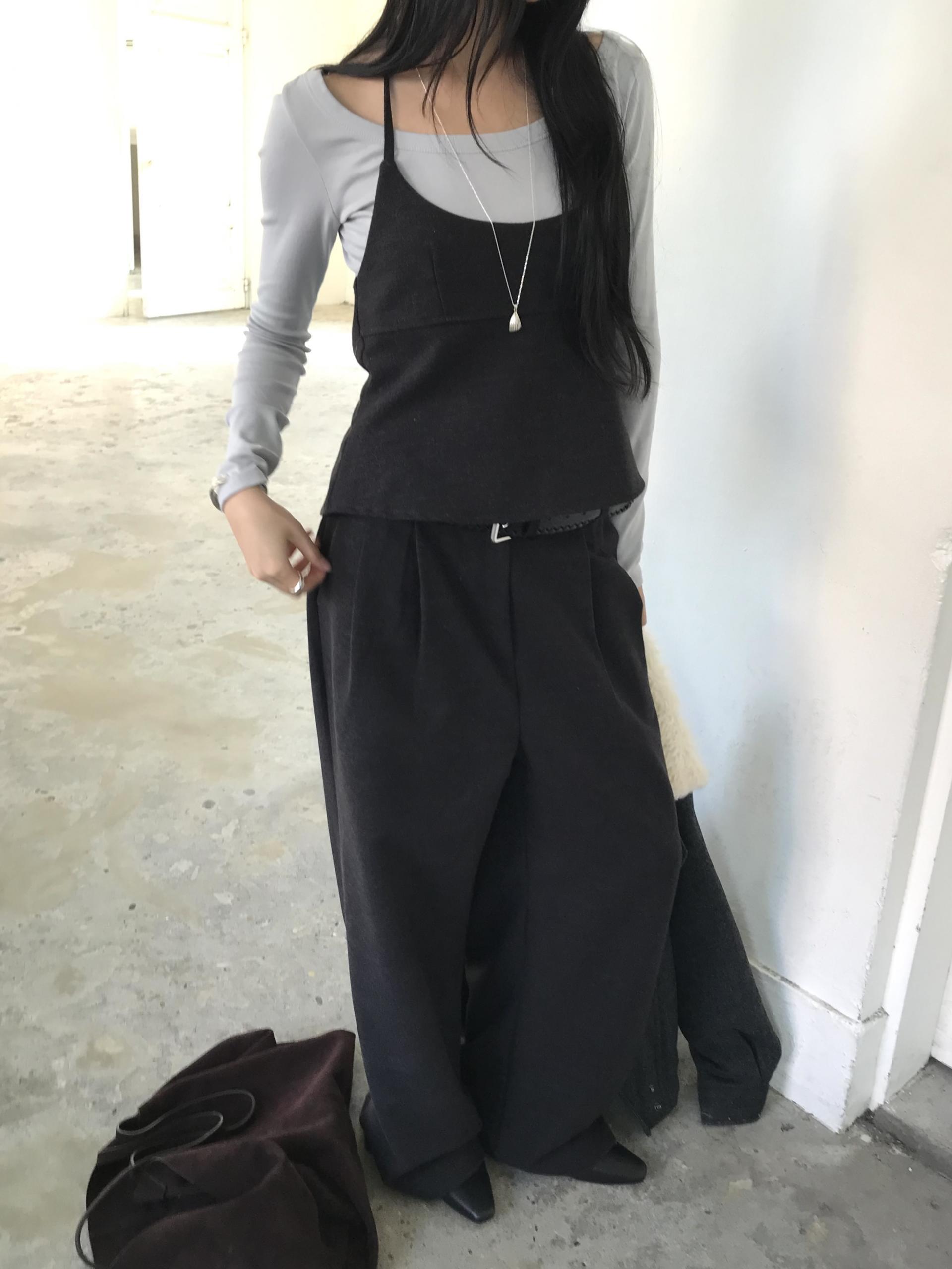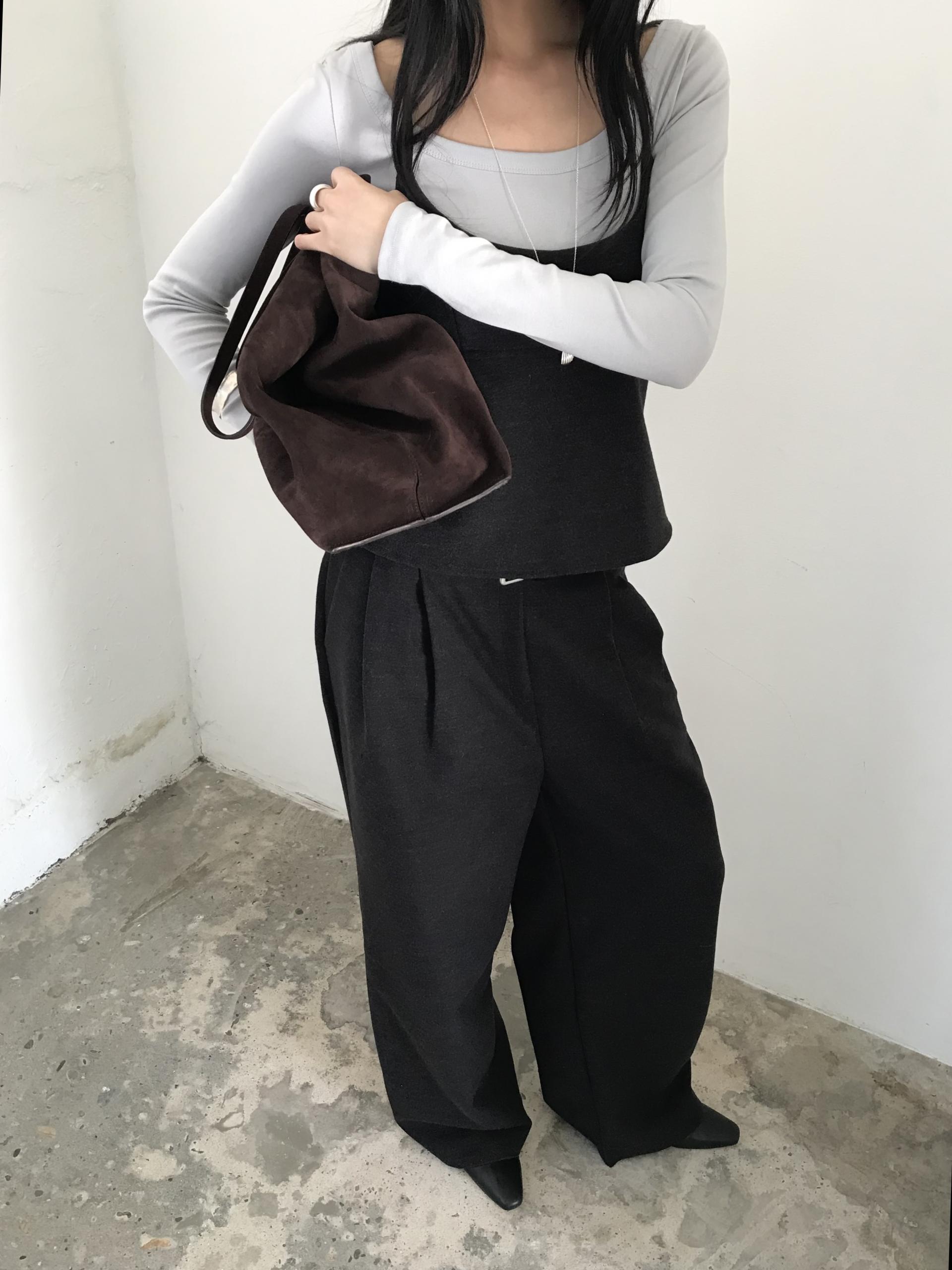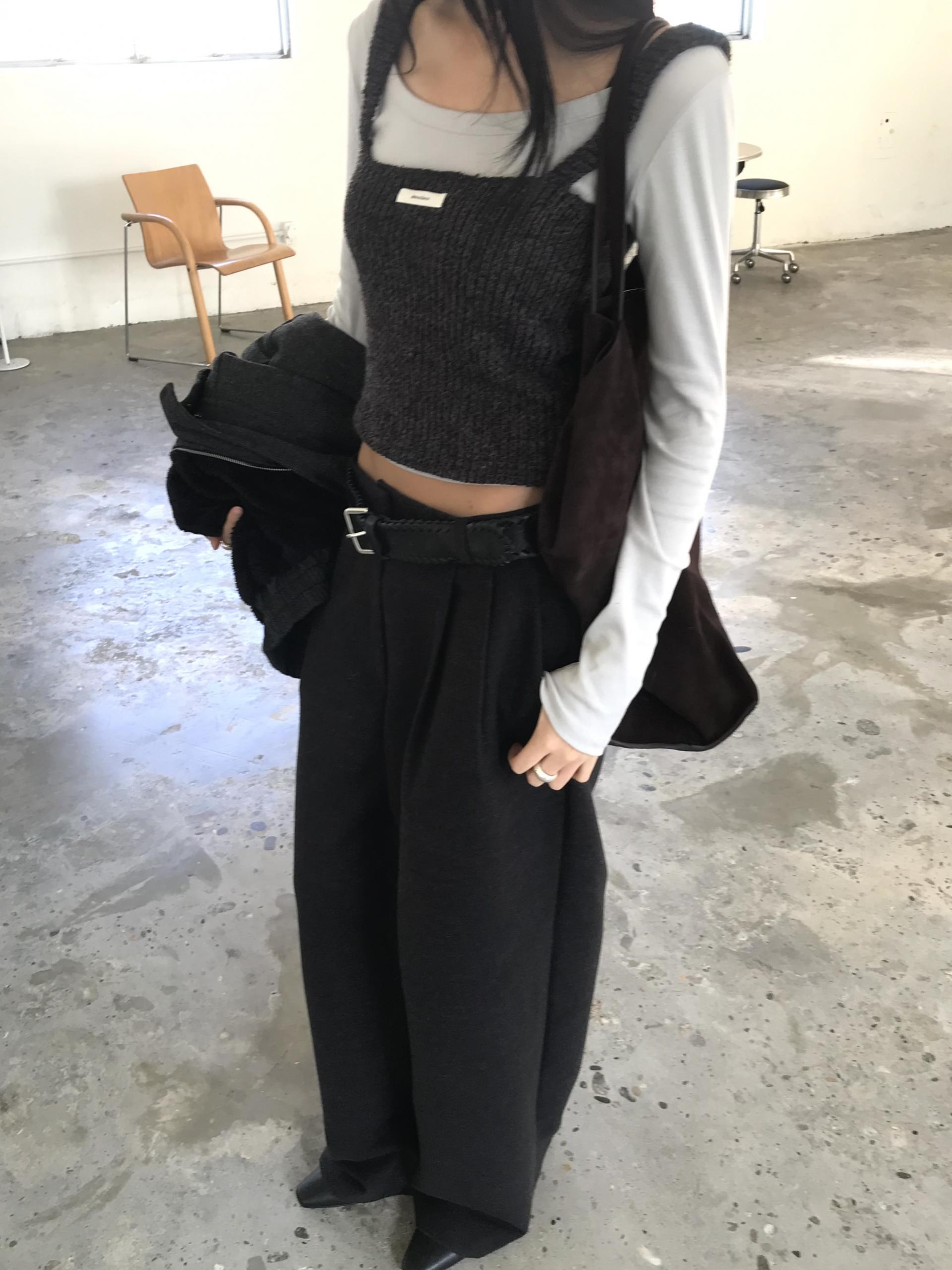 도톰한 울 블렌드 소재로 제작된 클래식 무드의 로우라이즈 와이드 슬랙스입니다.