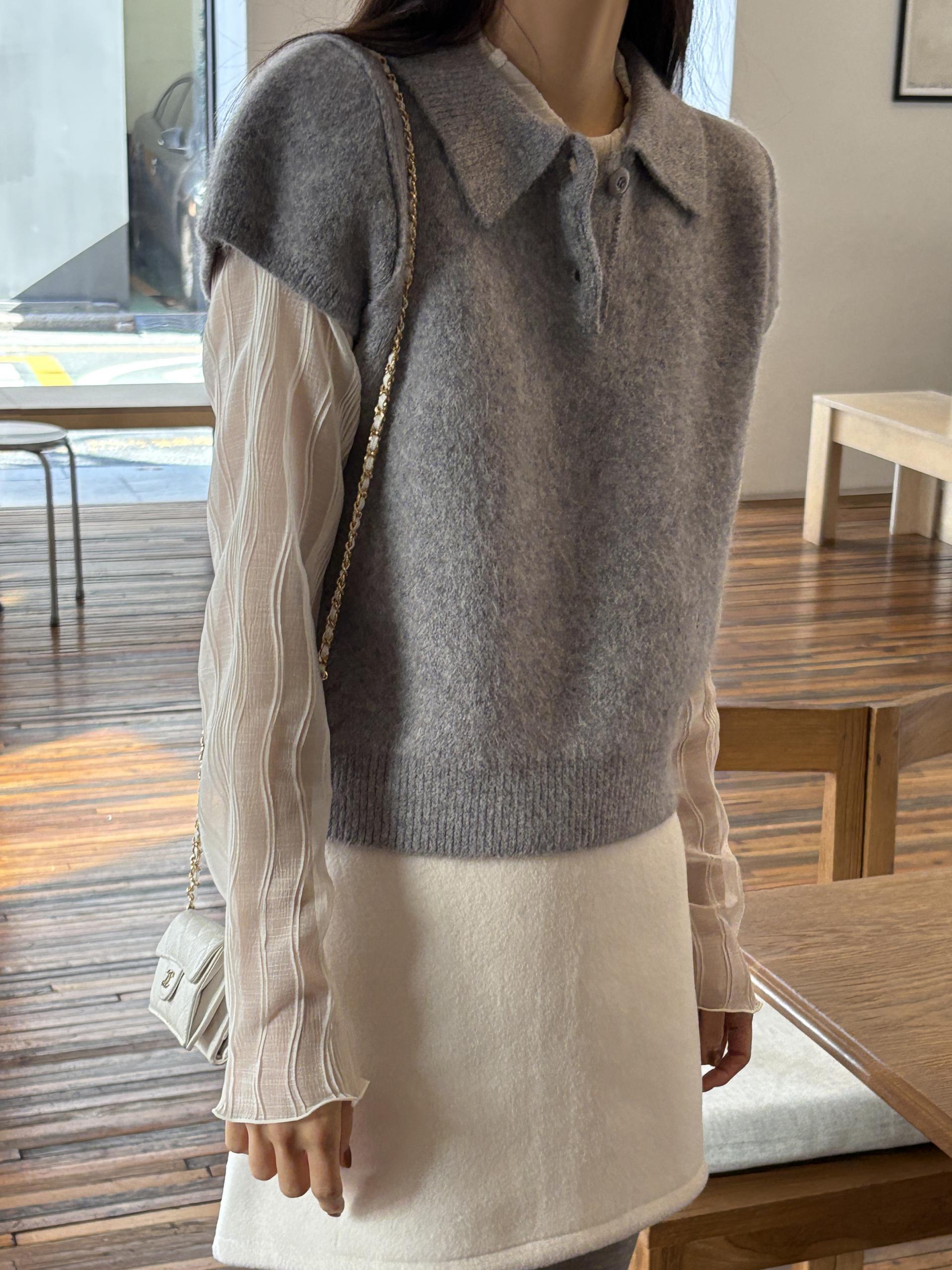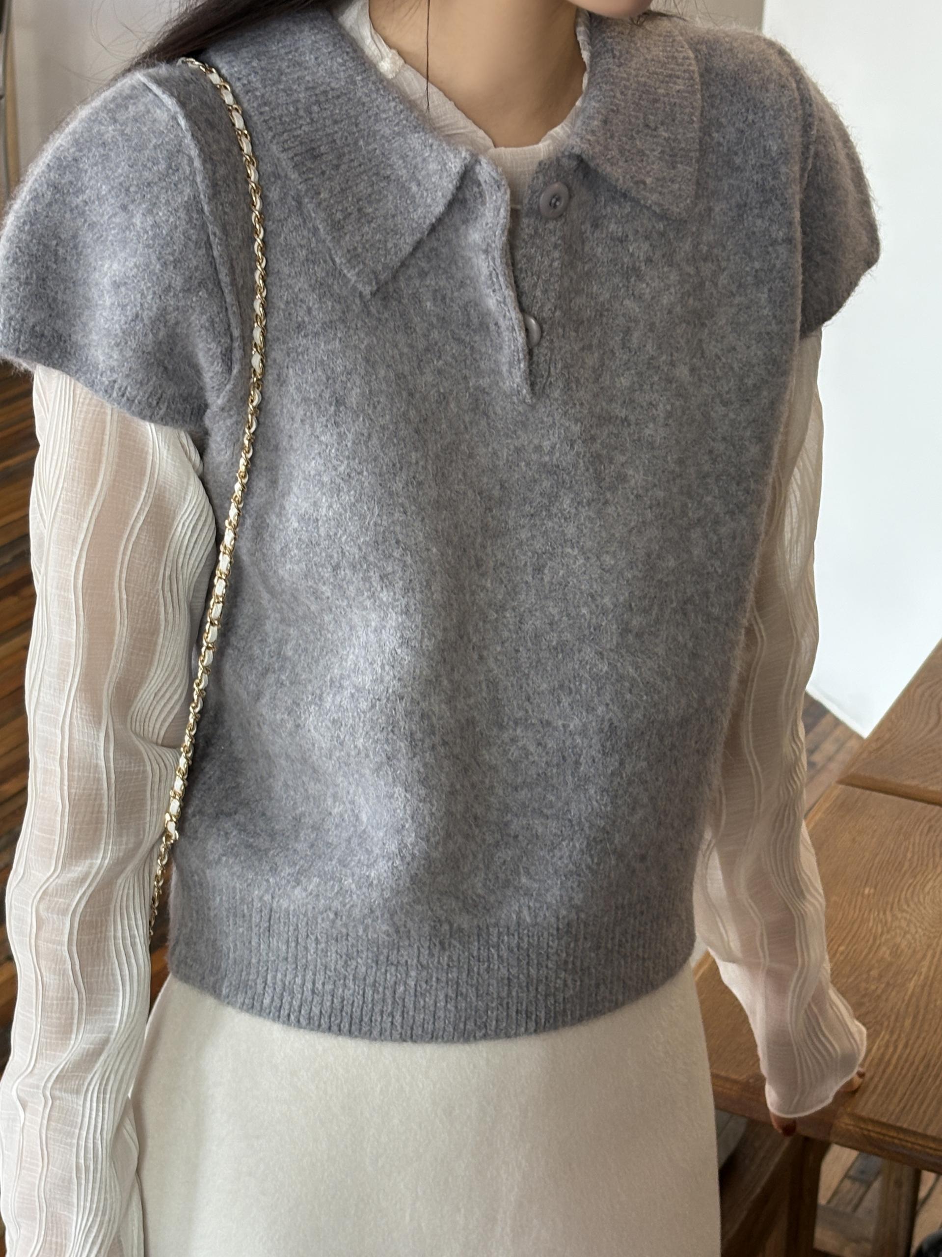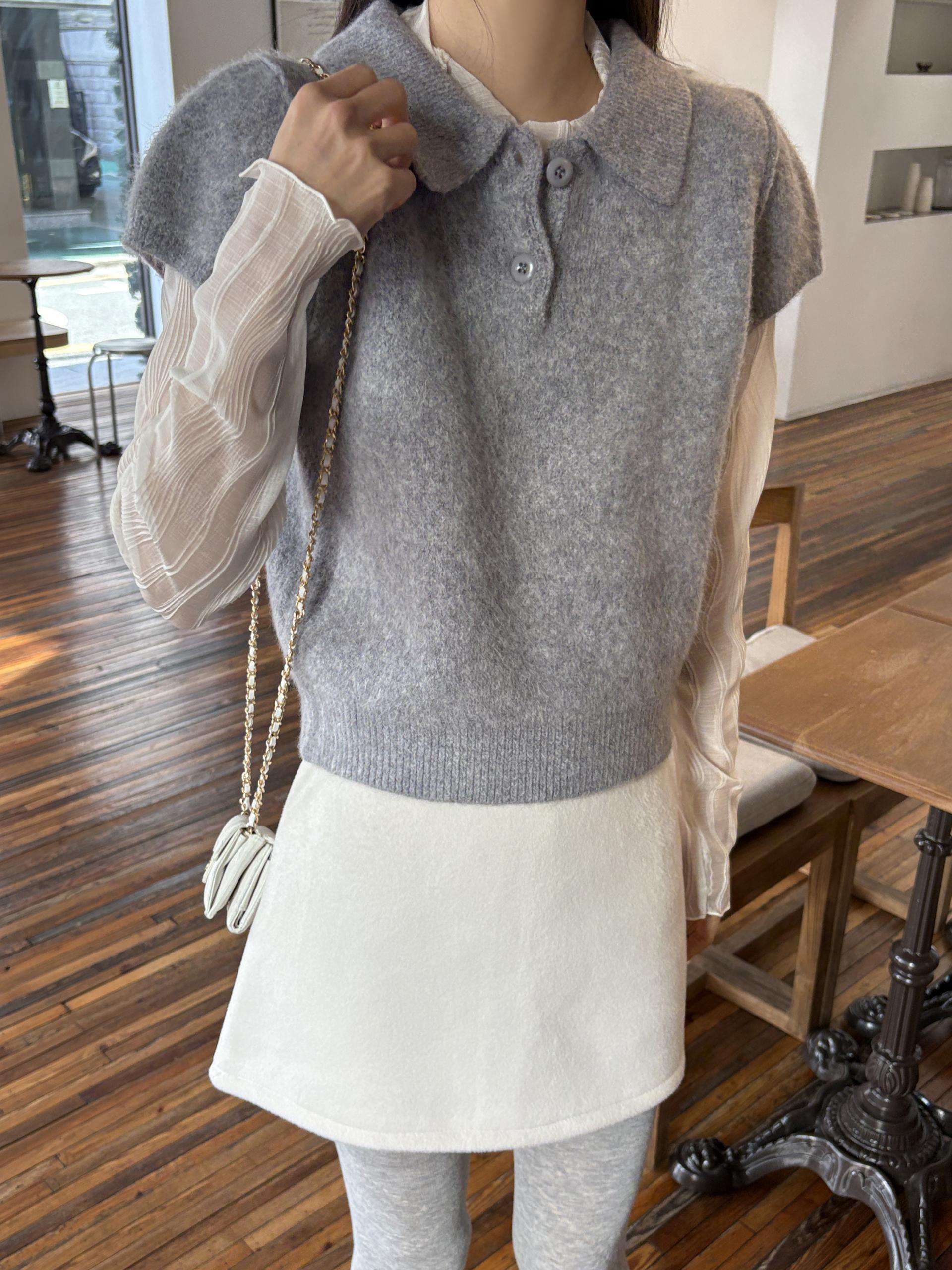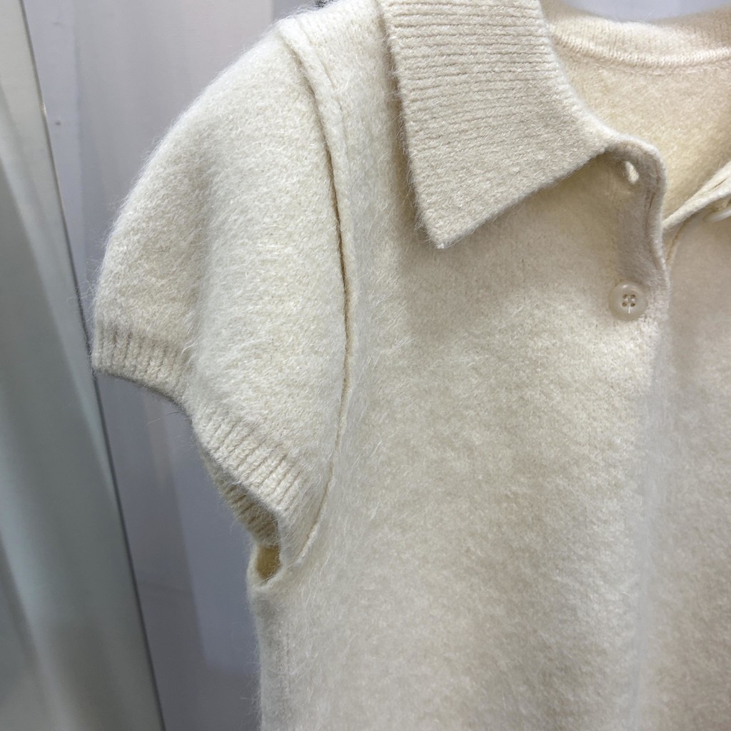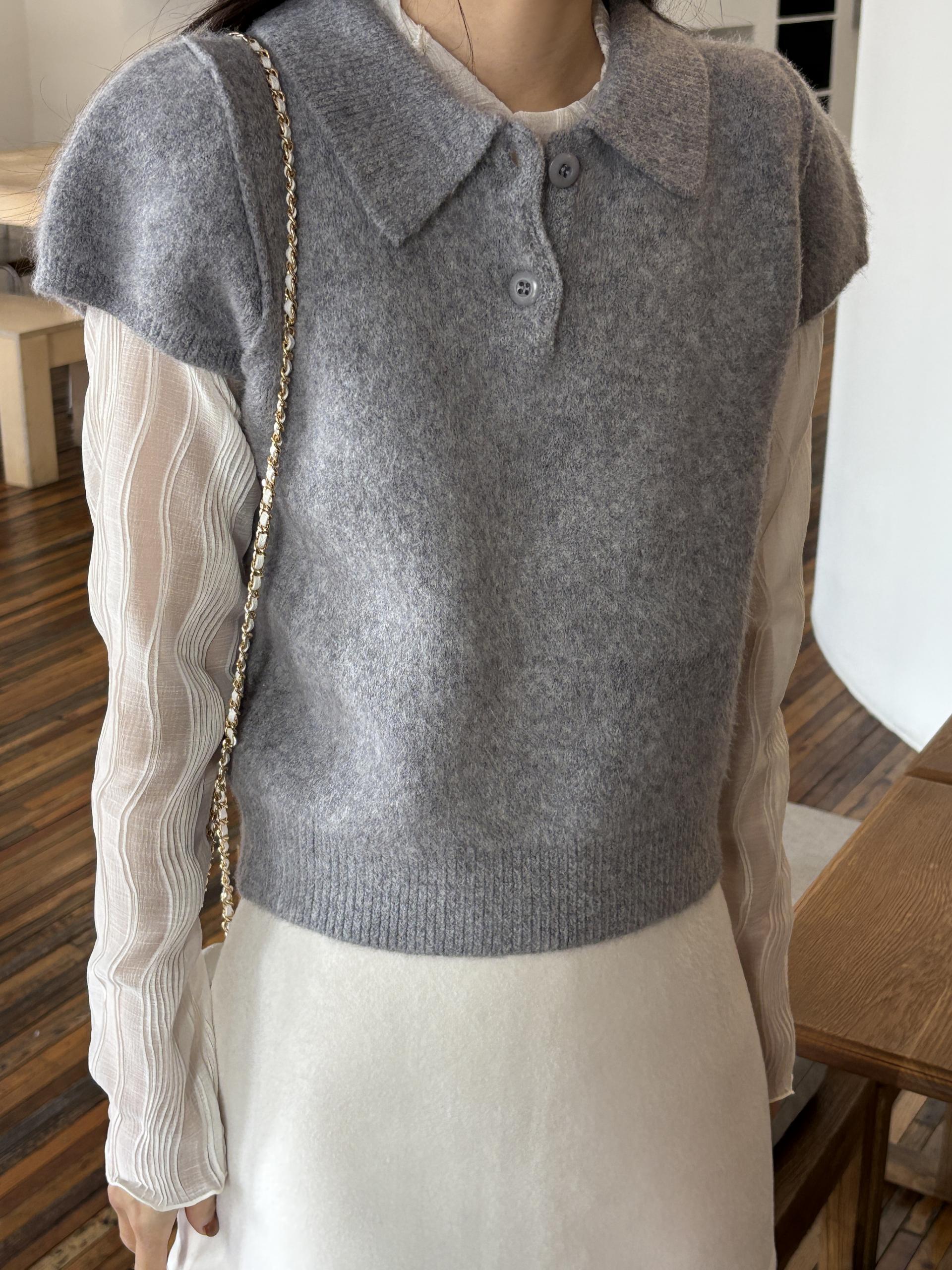 헤어리한 니트 원사로 제작되어 피부에 닿는 촉감이 부드럽고, 미니멀한 카라넥에 버튼 포인트를 더해 단정하면서도 여성스러운 무드를 연출합니다.