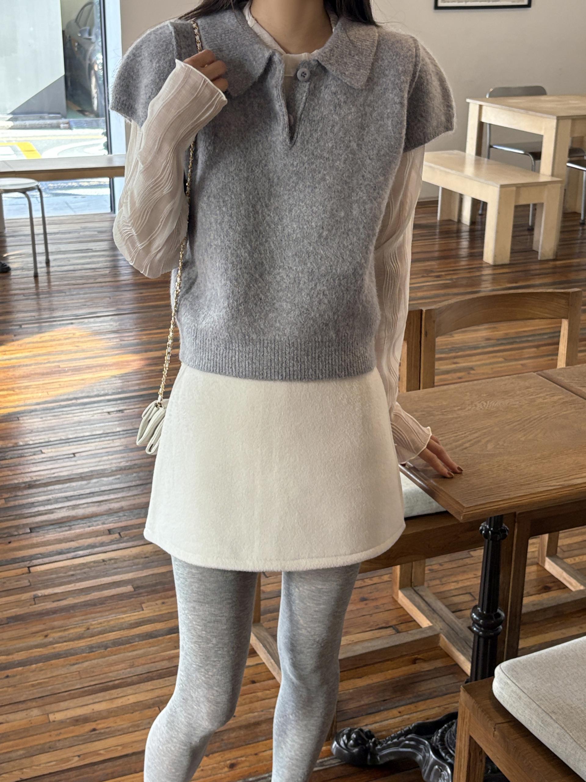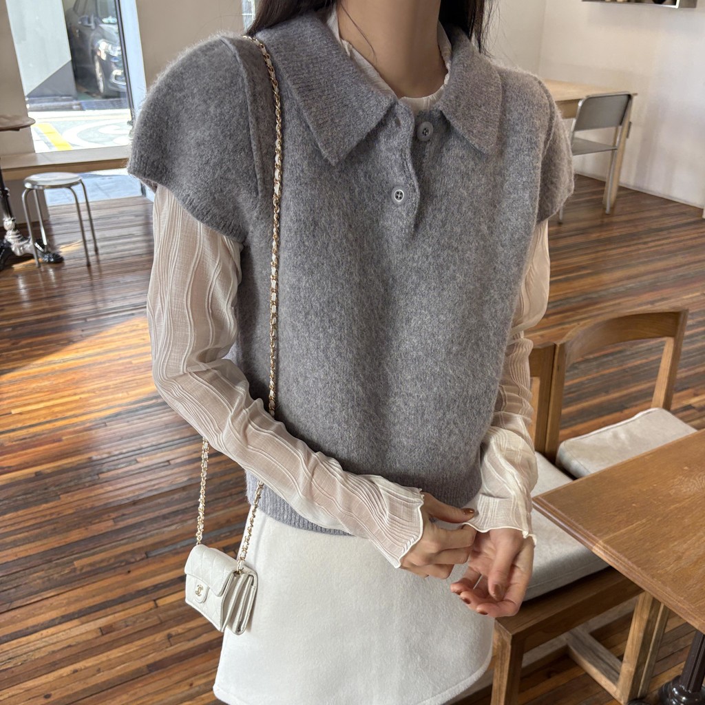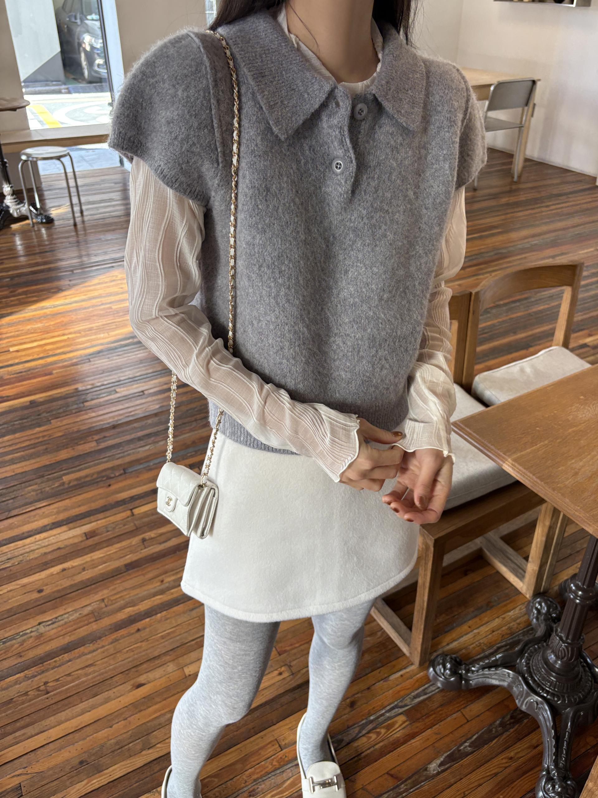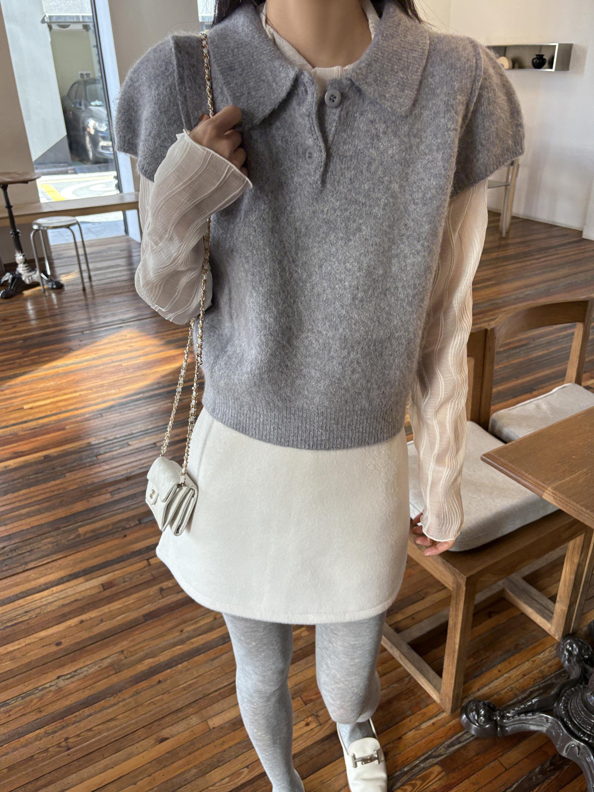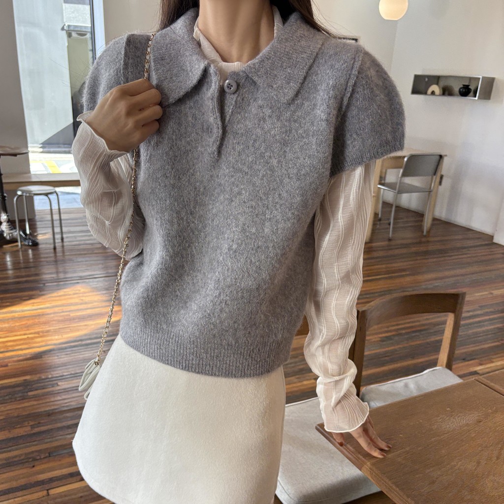 헤어리한 니트 원사로 제작되어 피부에 닿는 촉감이 부드럽고, 미니멀한 카라넥에 버튼 포인트를 더해 단정하면서도 여성스러운 무드를 연출합니다.