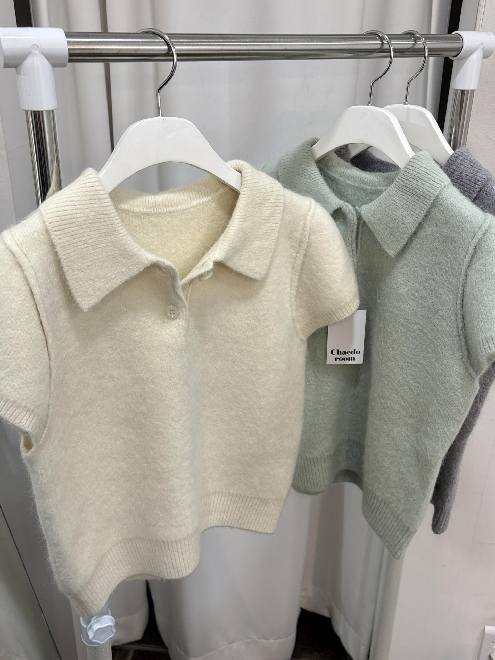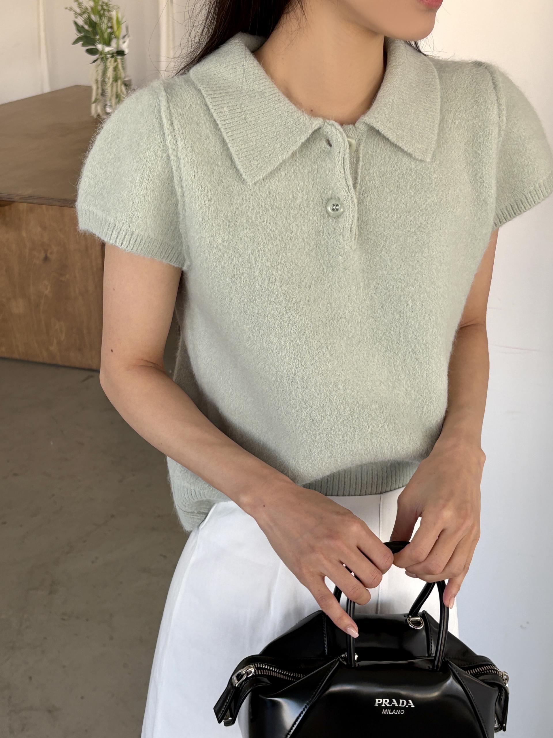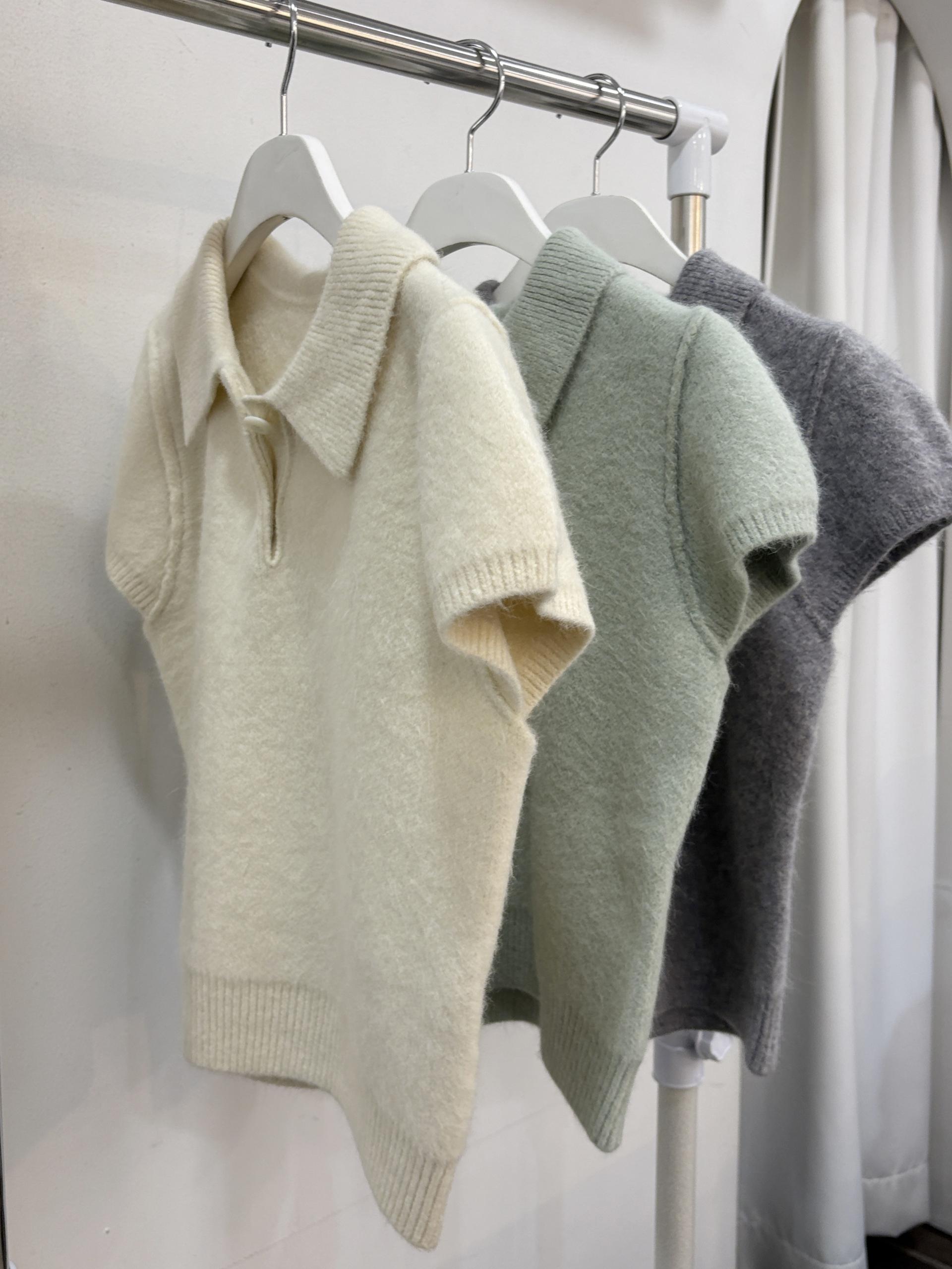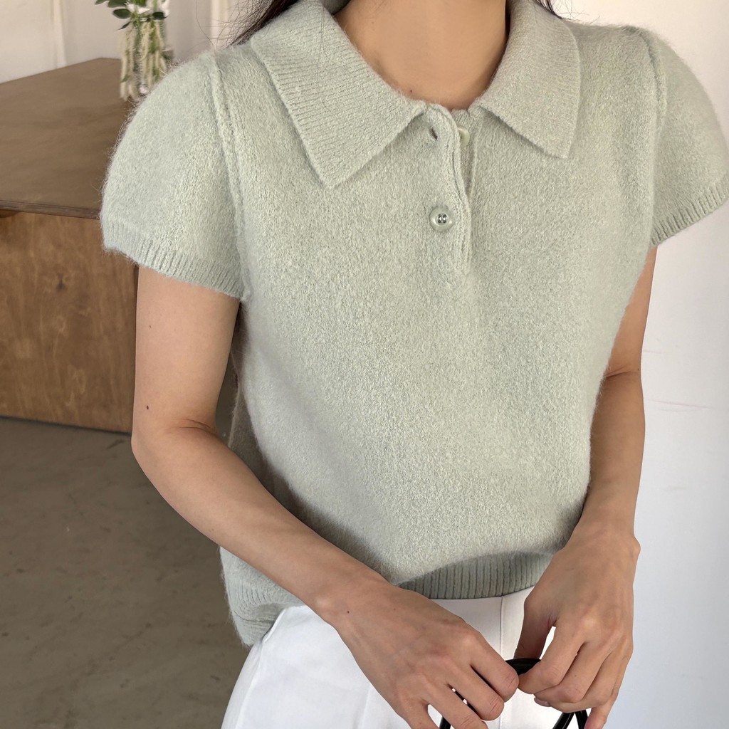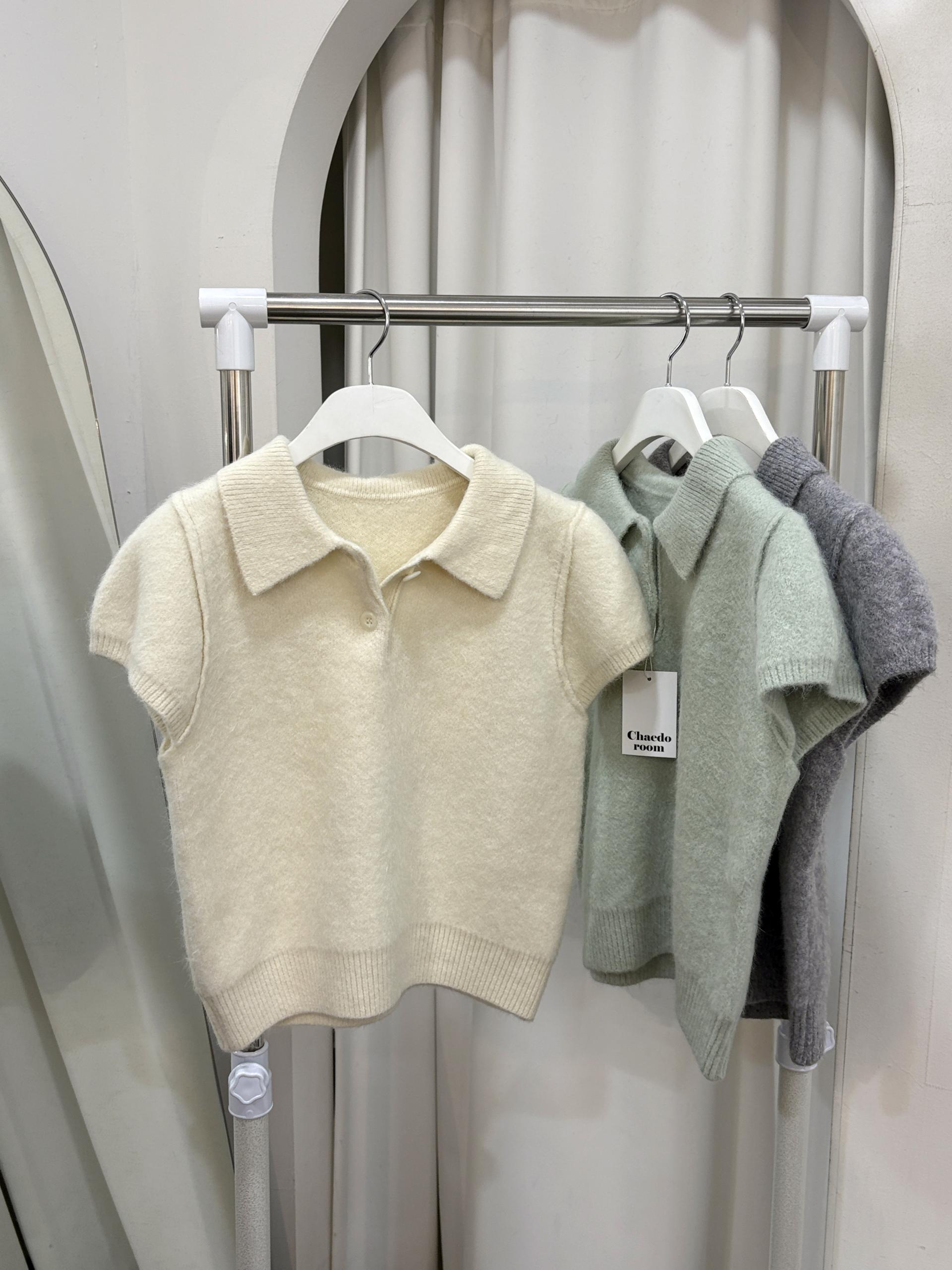 포근한 텍스처가 매력적인 카라넥 반팔 니트 티셔츠입니다.