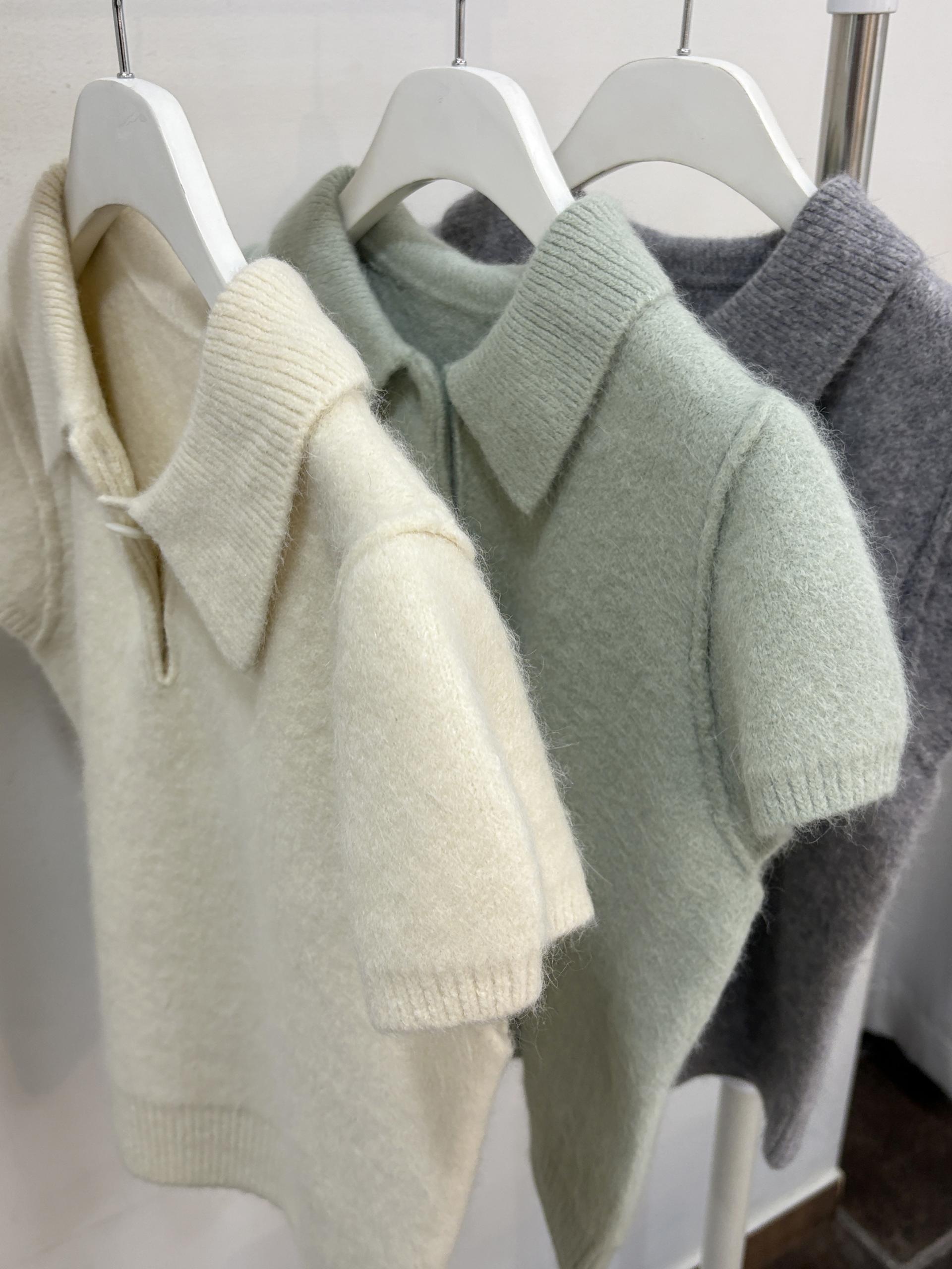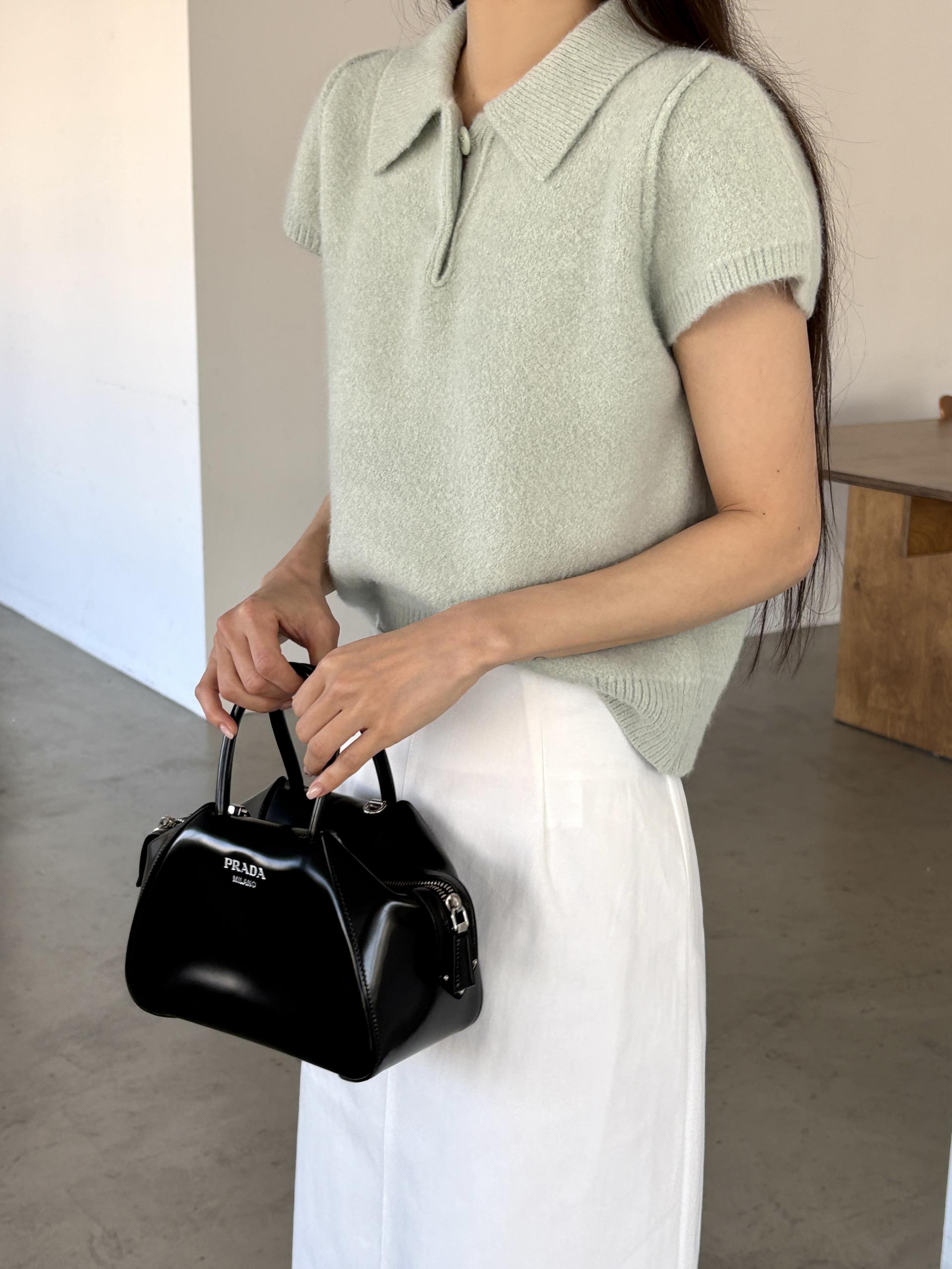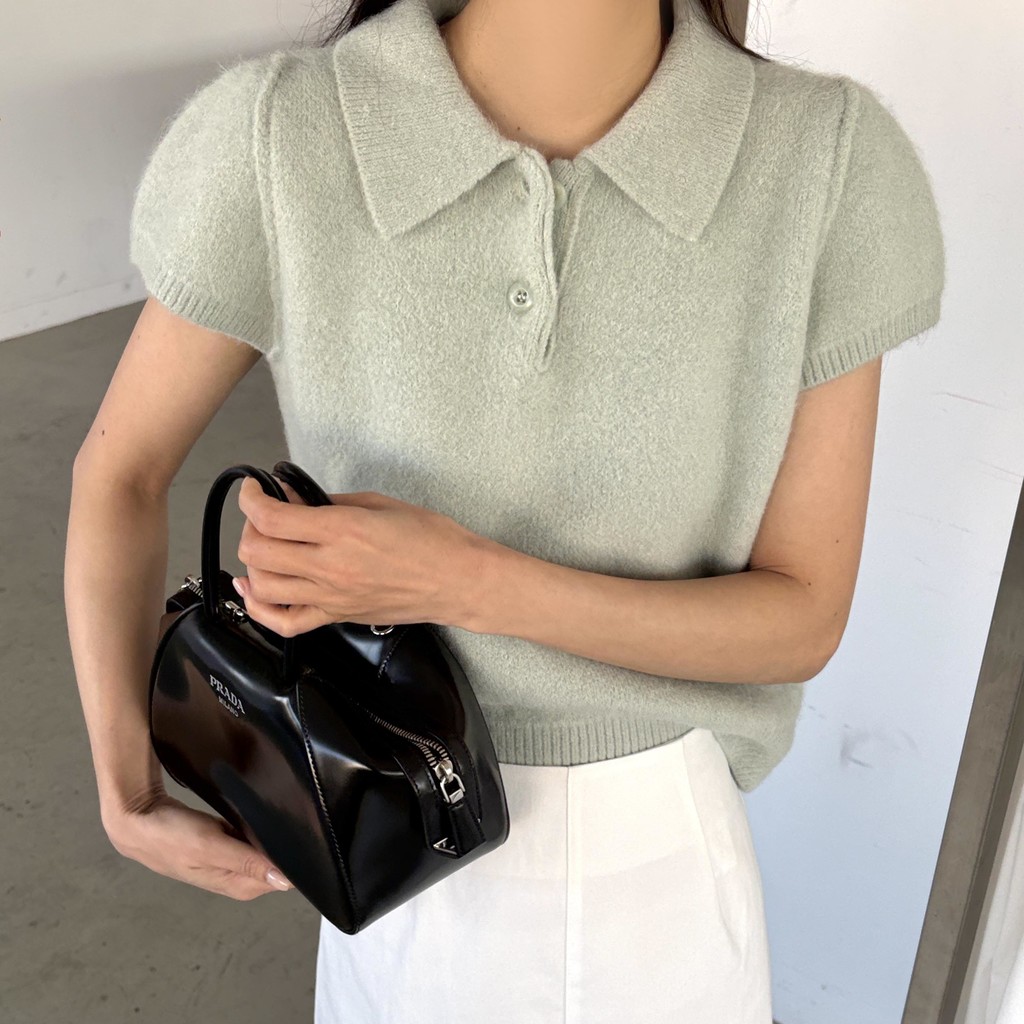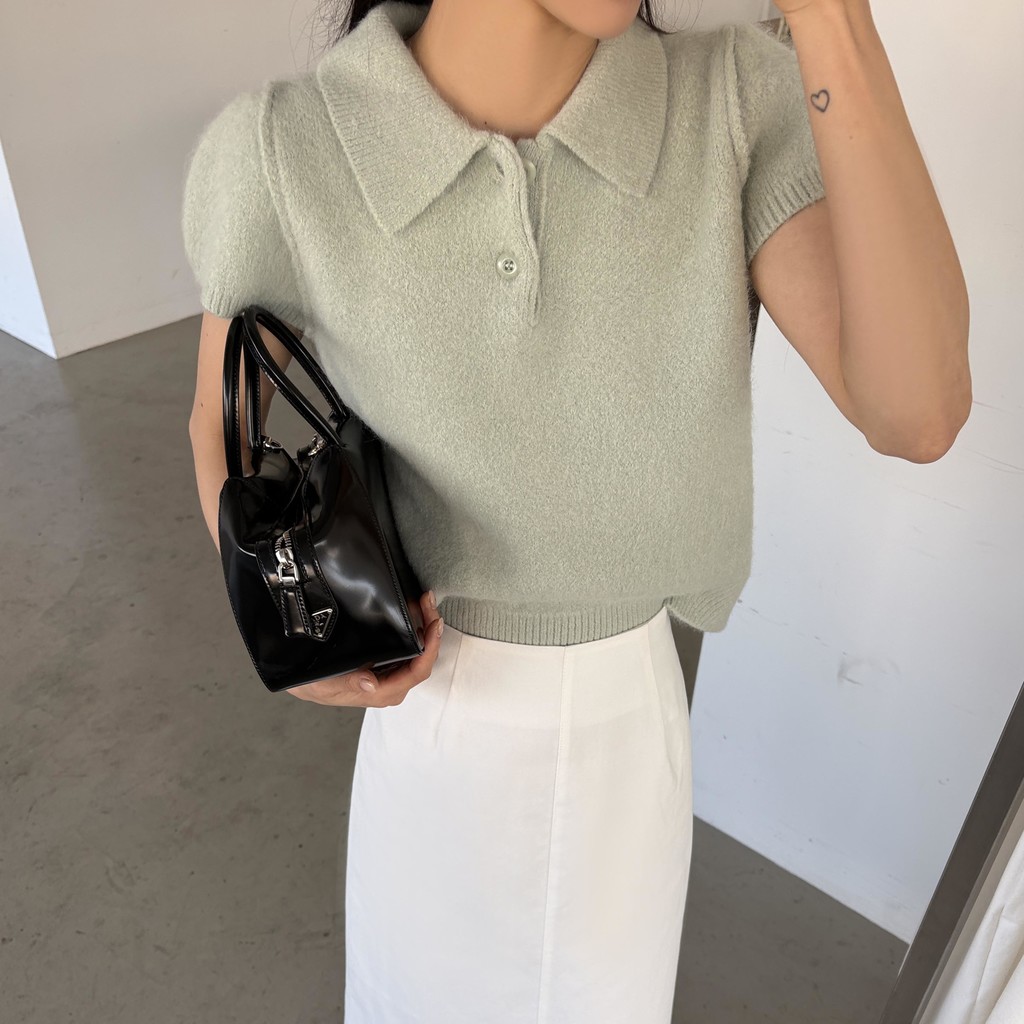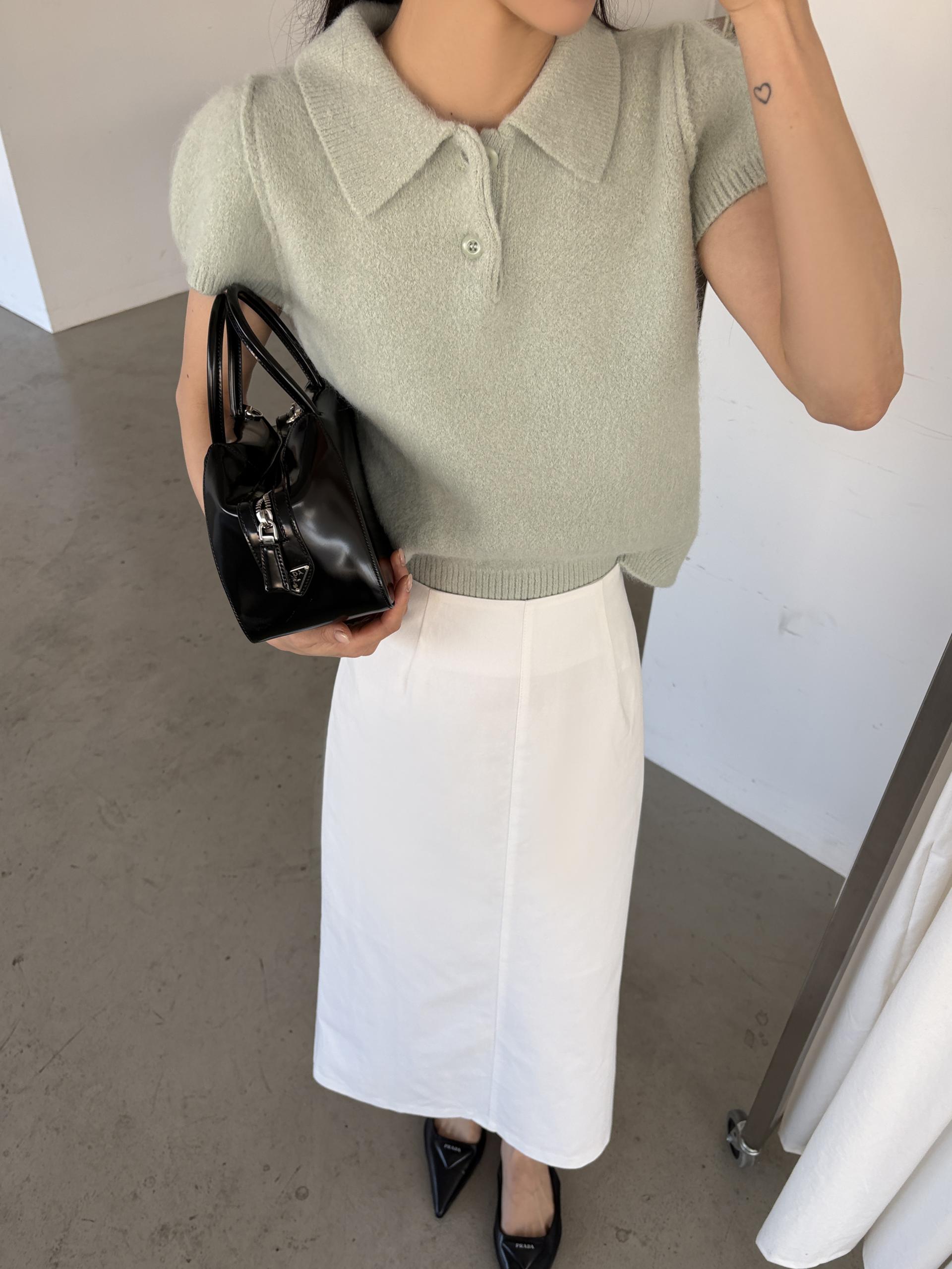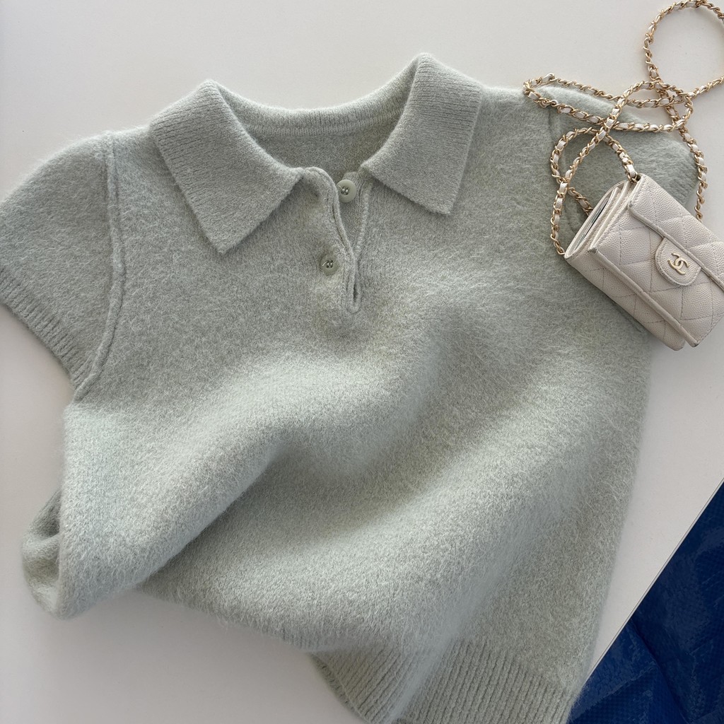 포근한 텍스처가 매력적인 카라넥 반팔 니트 티셔츠입니다.