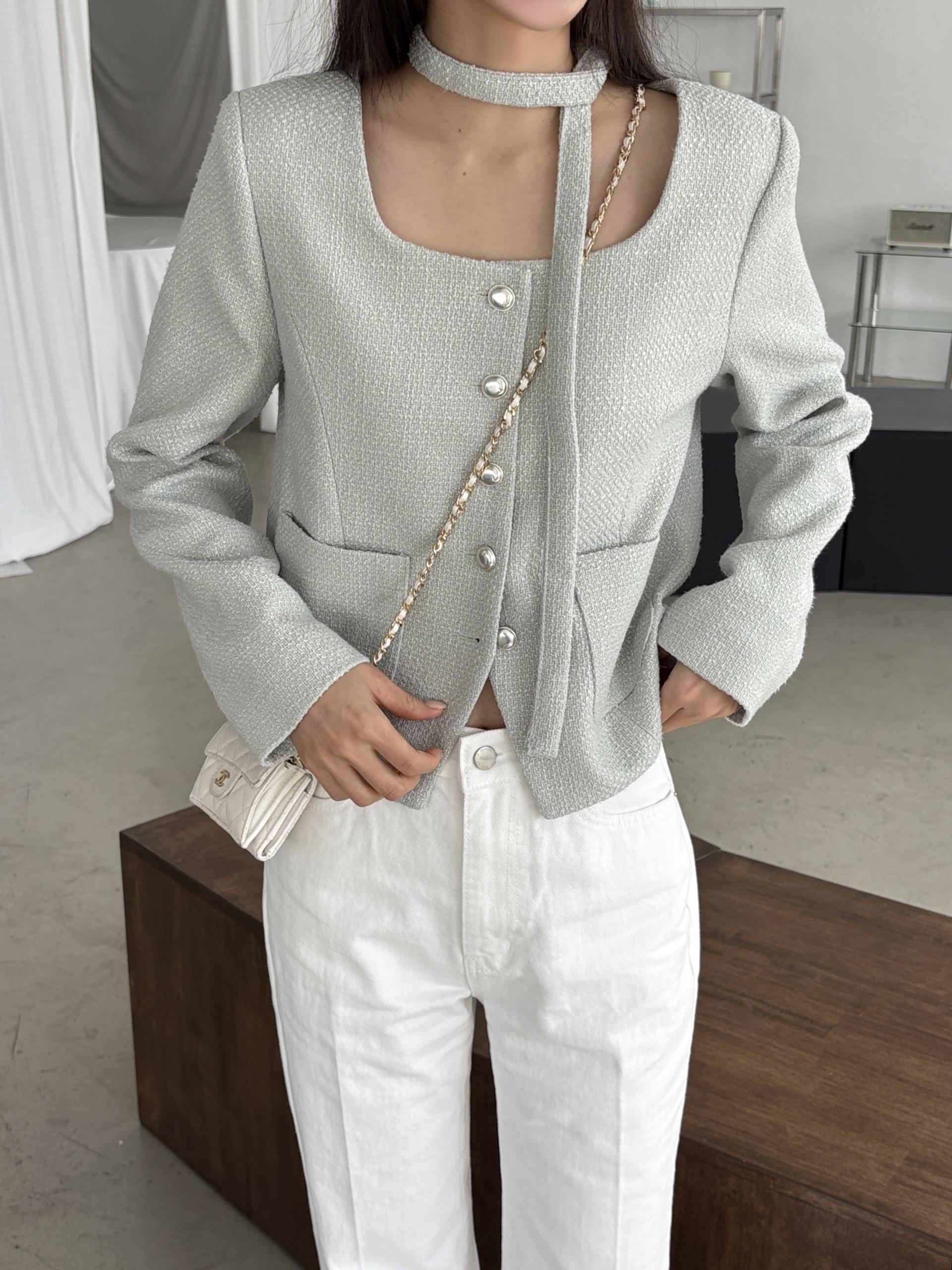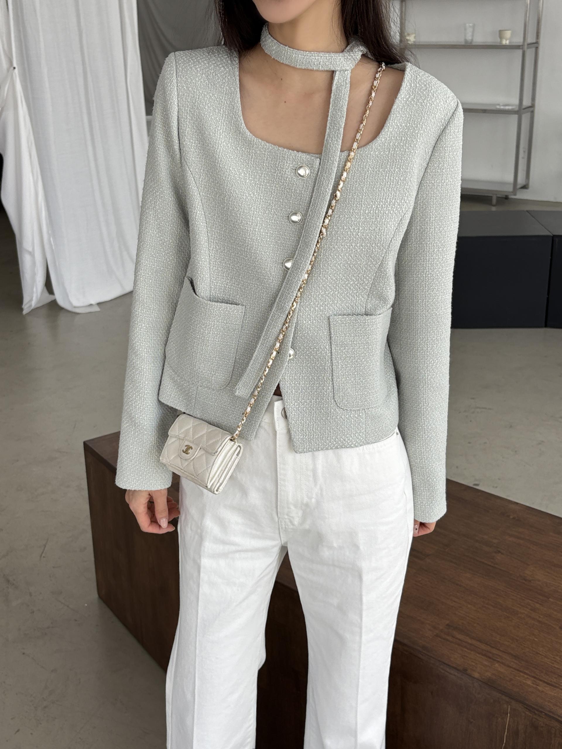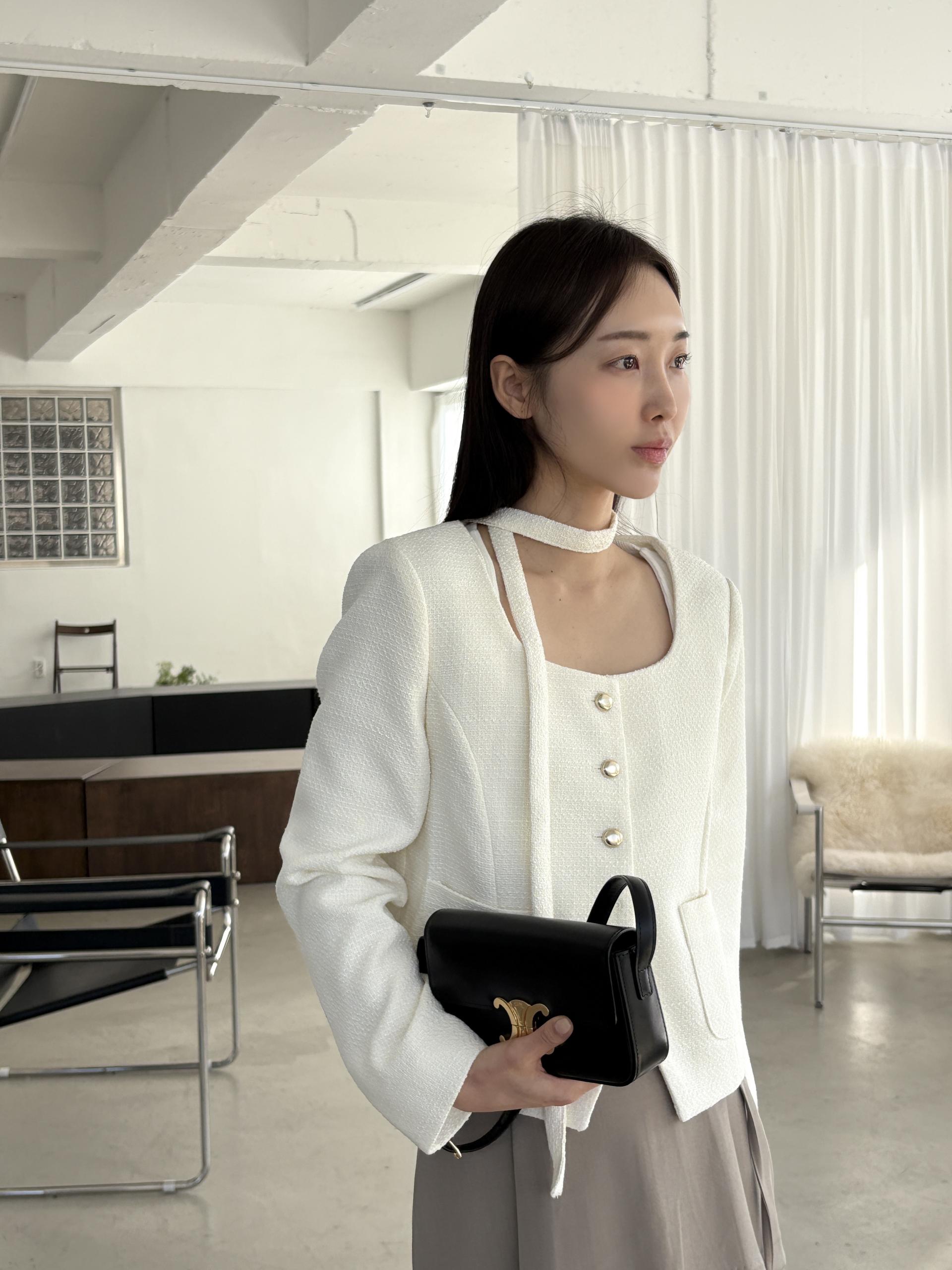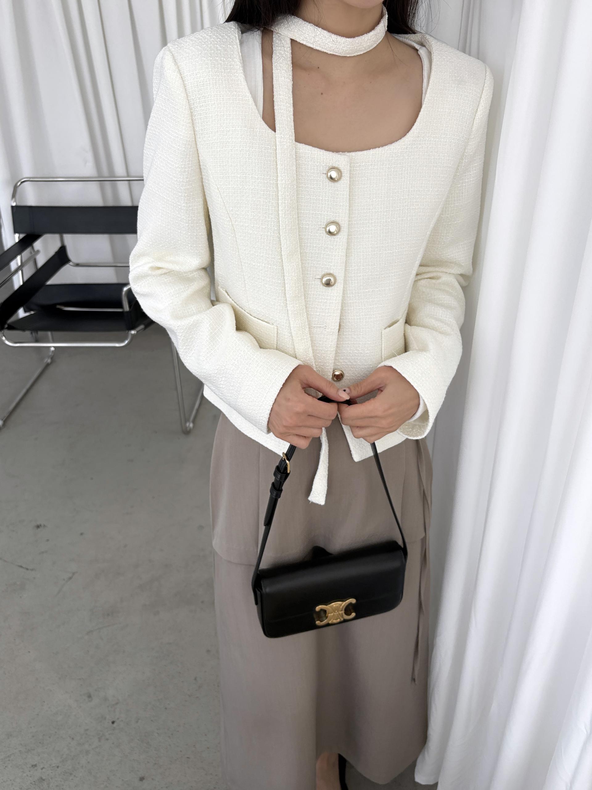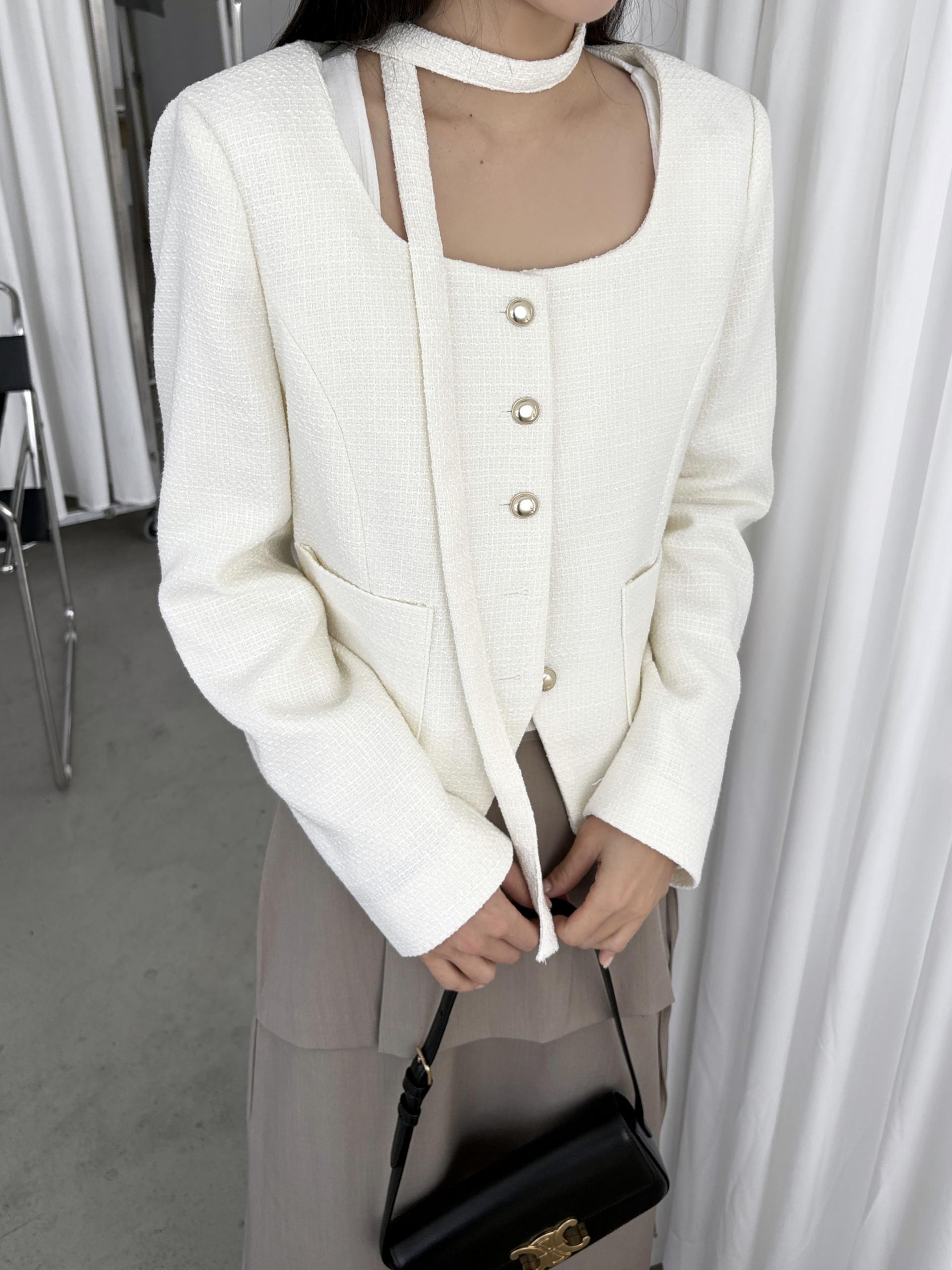 넥 라인의 타이 스트랩 디테일과 스퀘어넥이 고급스럽게 어우러지는 트위드 자켓입니다.