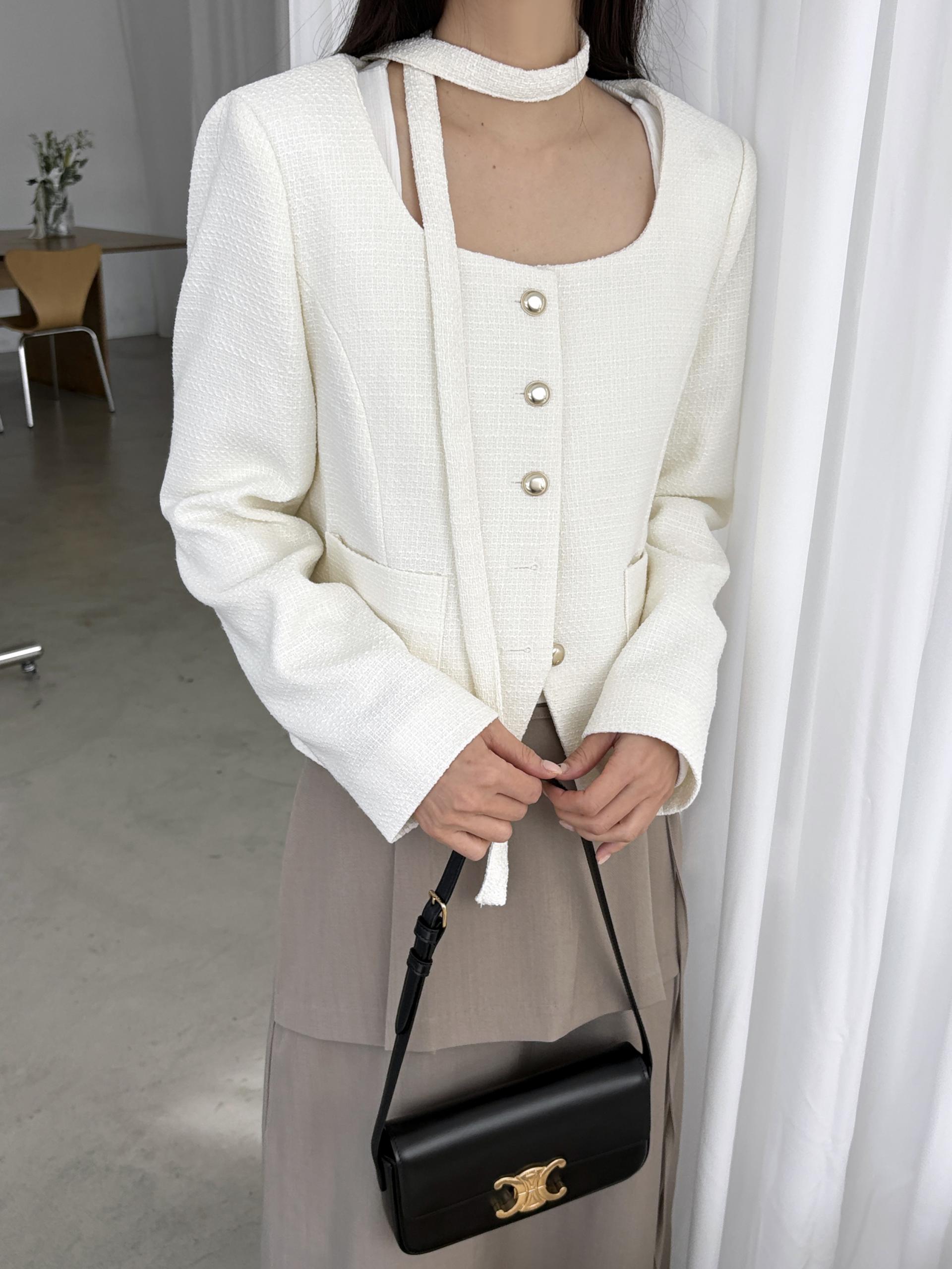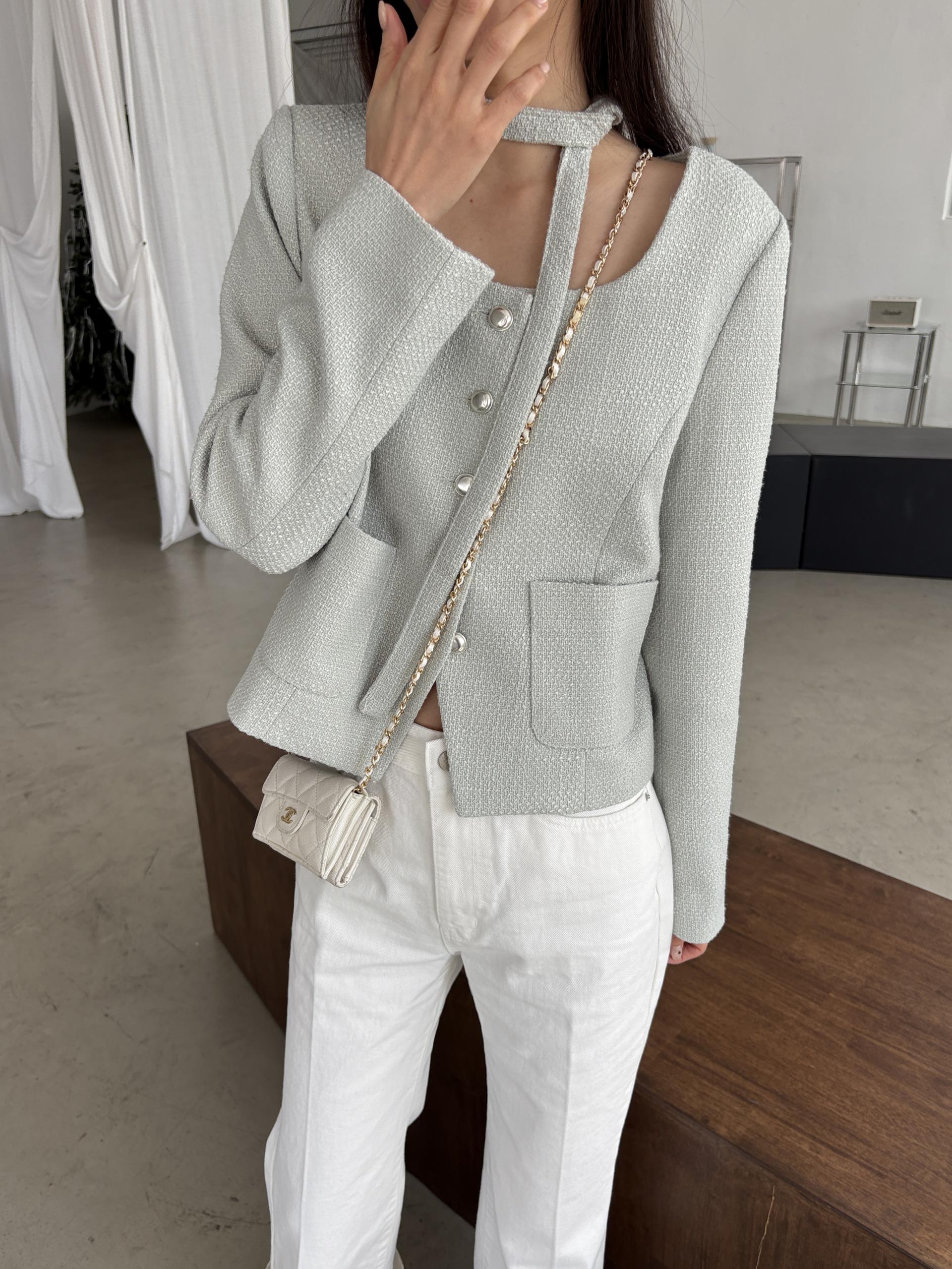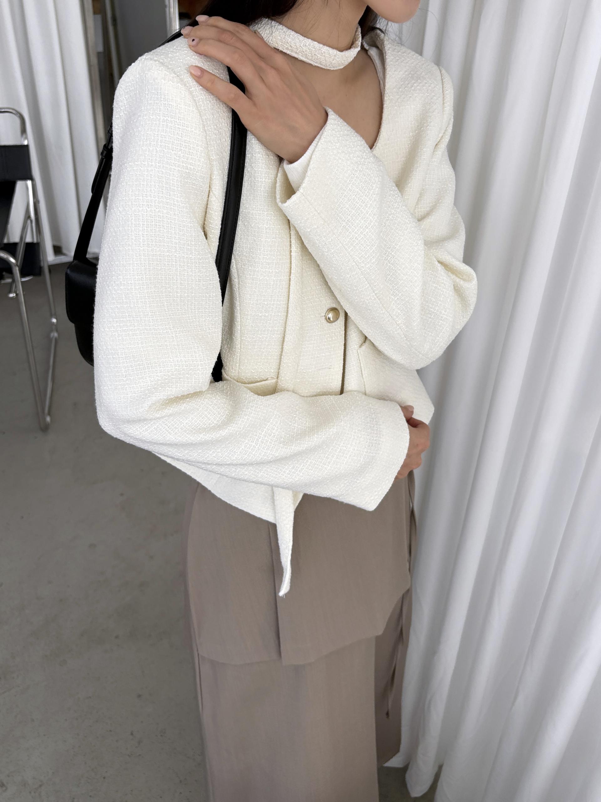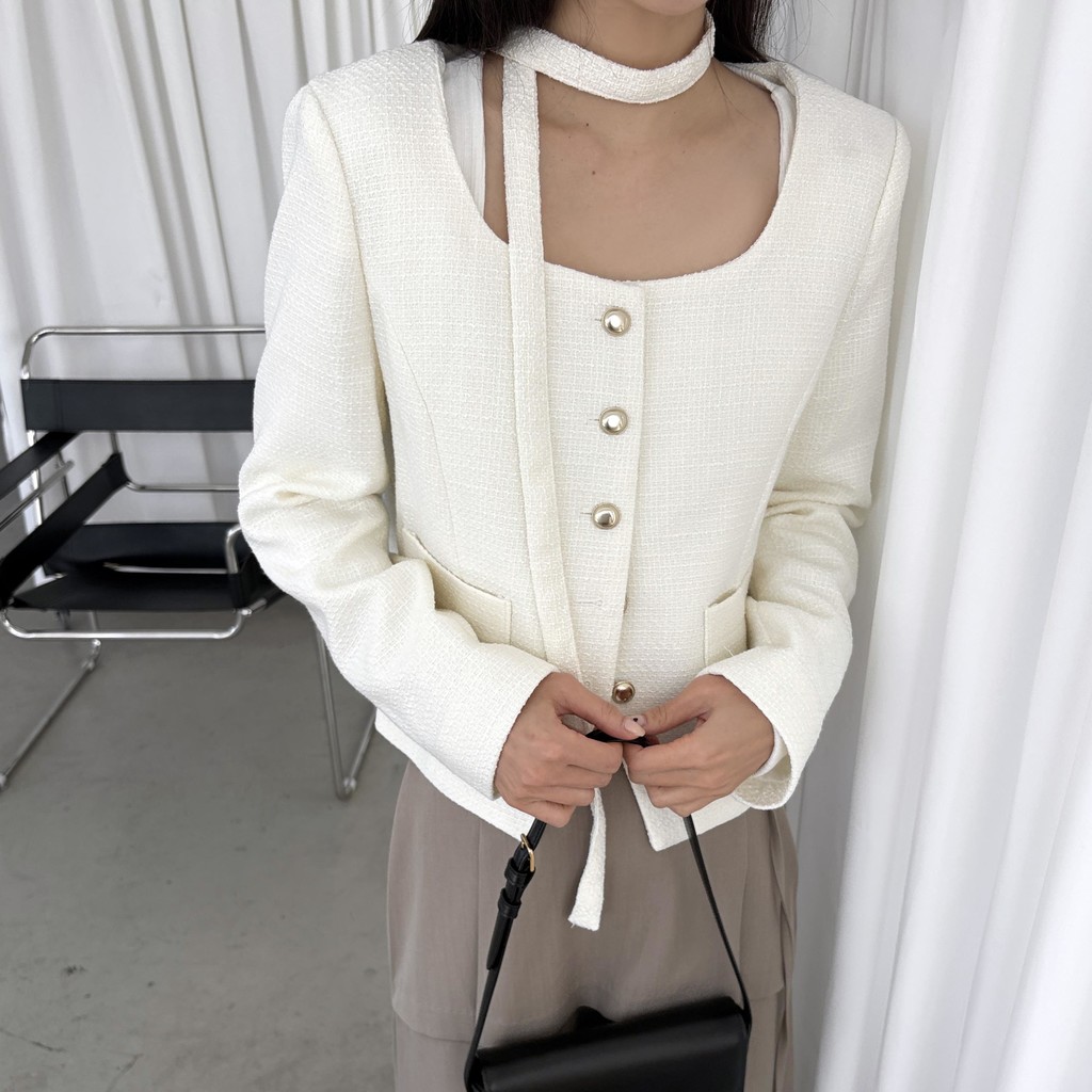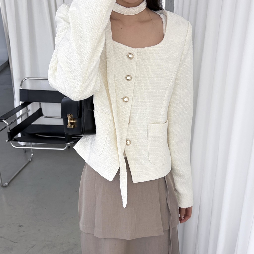 넥 라인의 타이 스트랩 디테일과 스퀘어넥이 고급스럽게 어우러지는 트위드 자켓입니다.