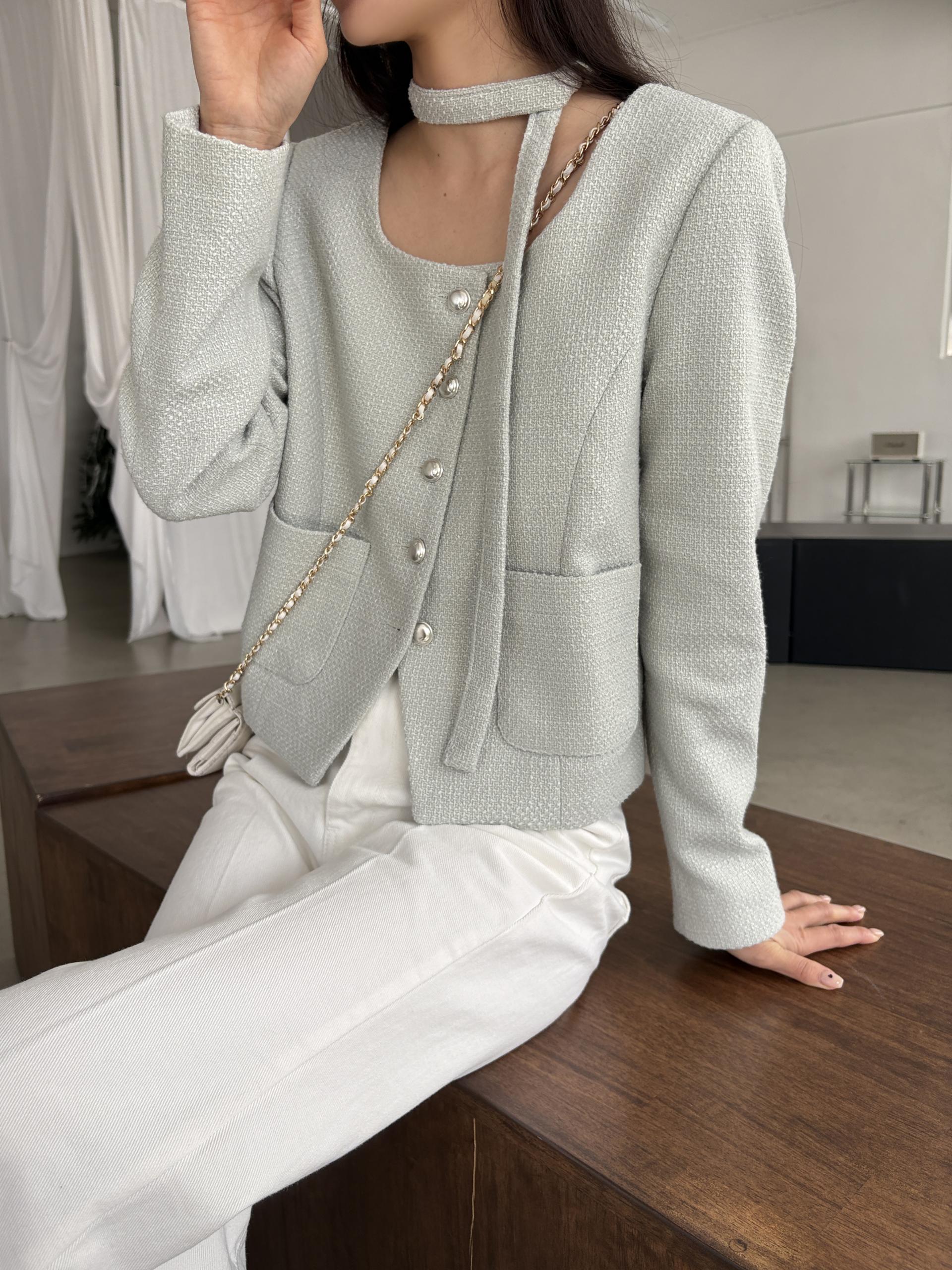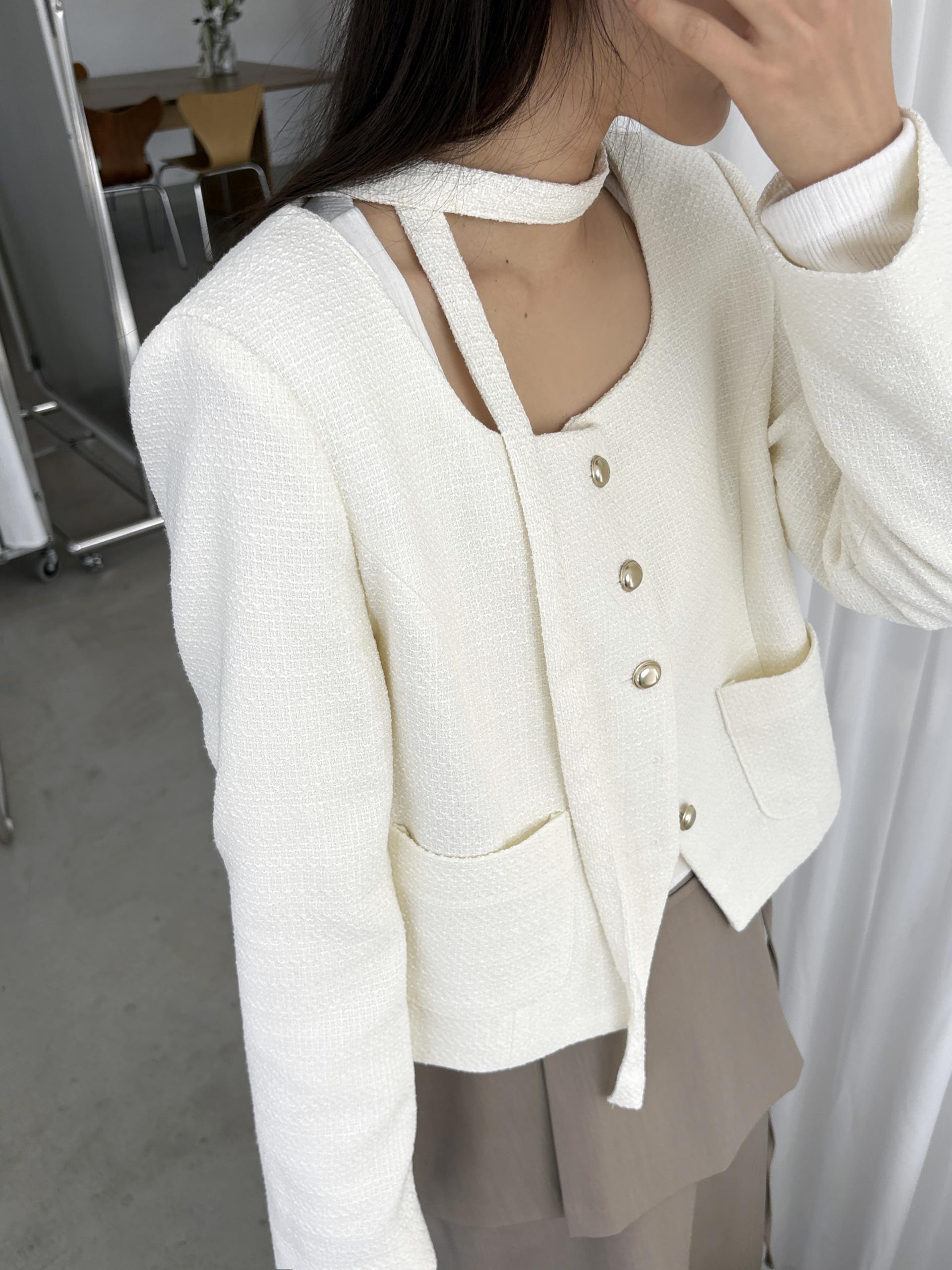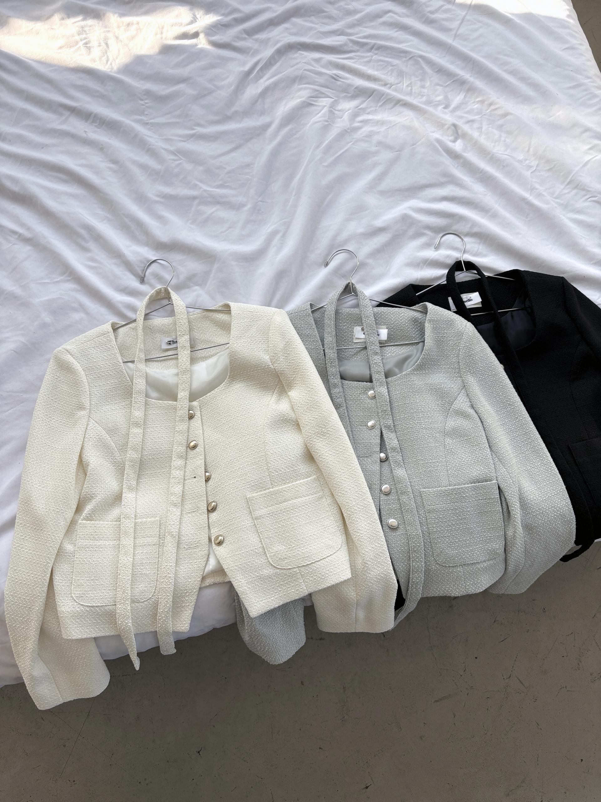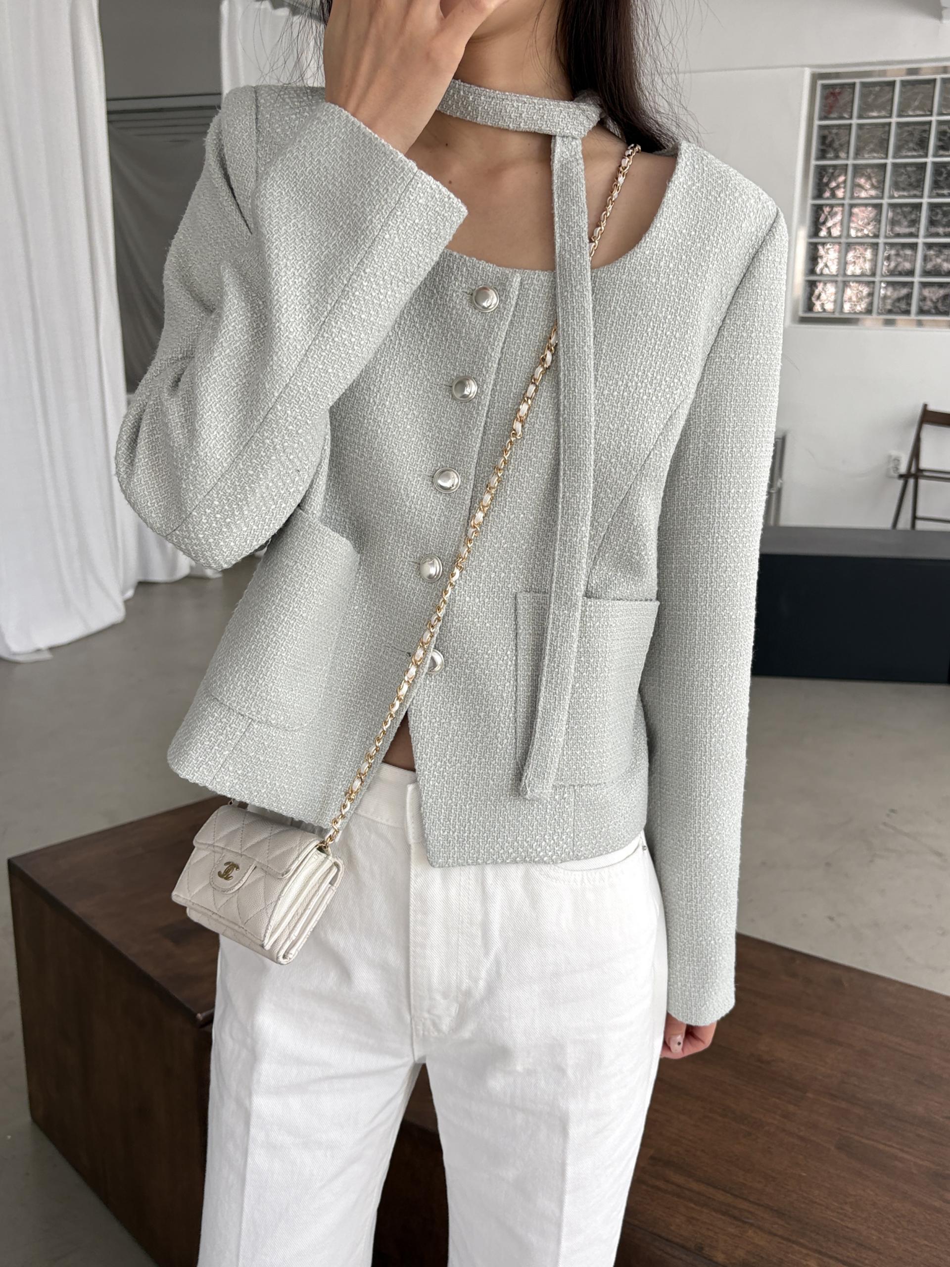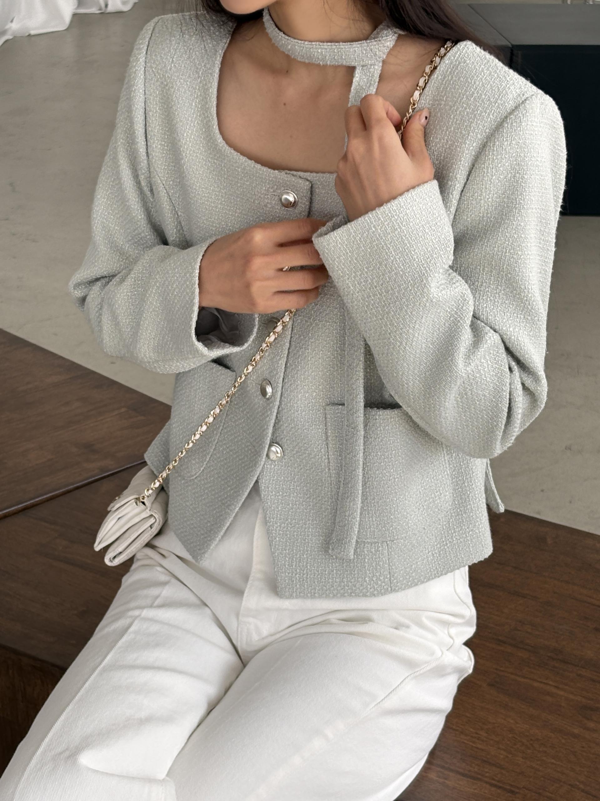 넥 라인의 타이 스트랩 디테일과 스퀘어넥이 고급스럽게 어우러지는 트위드 자켓입니다.