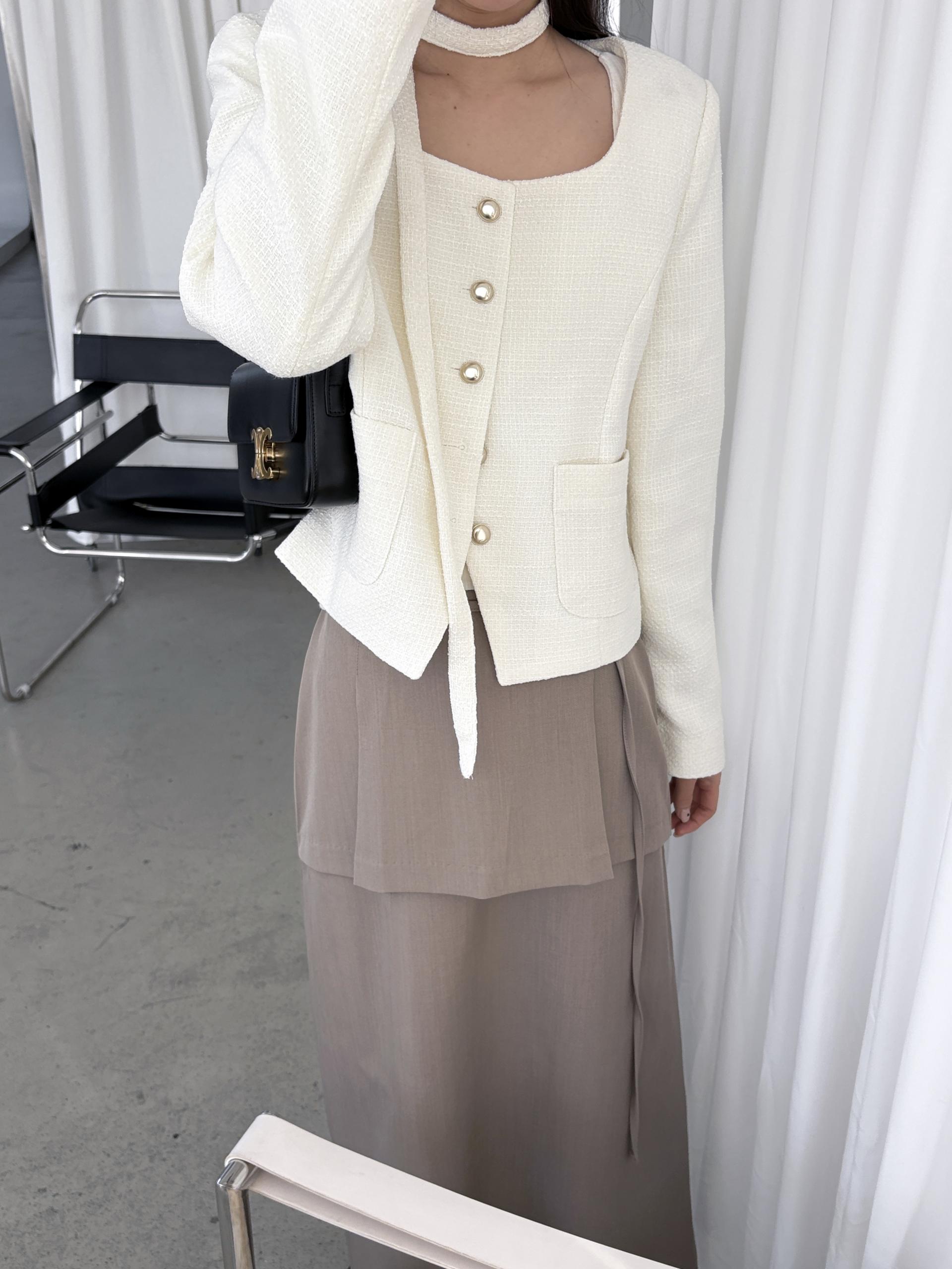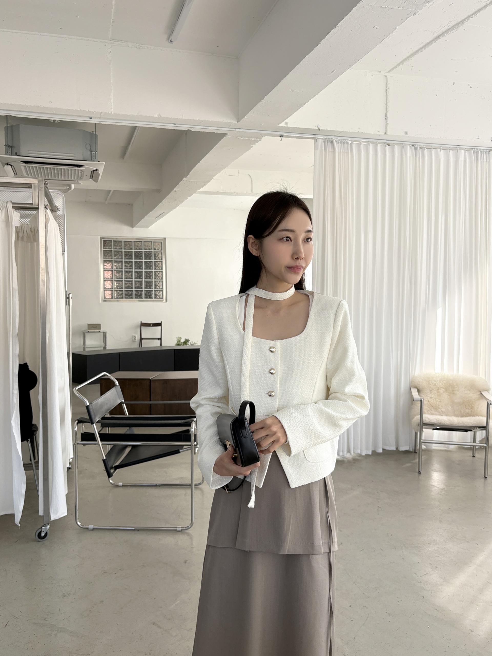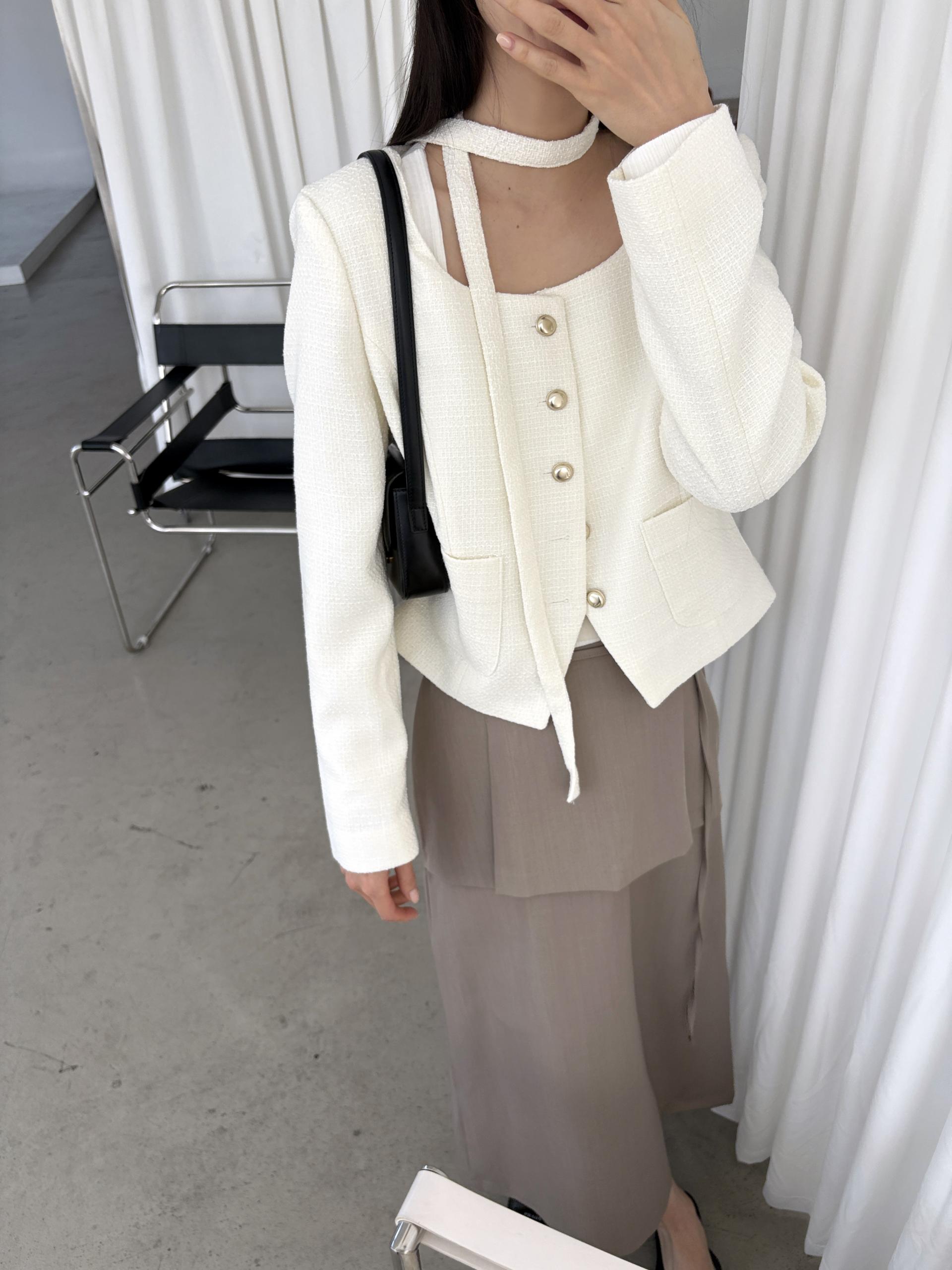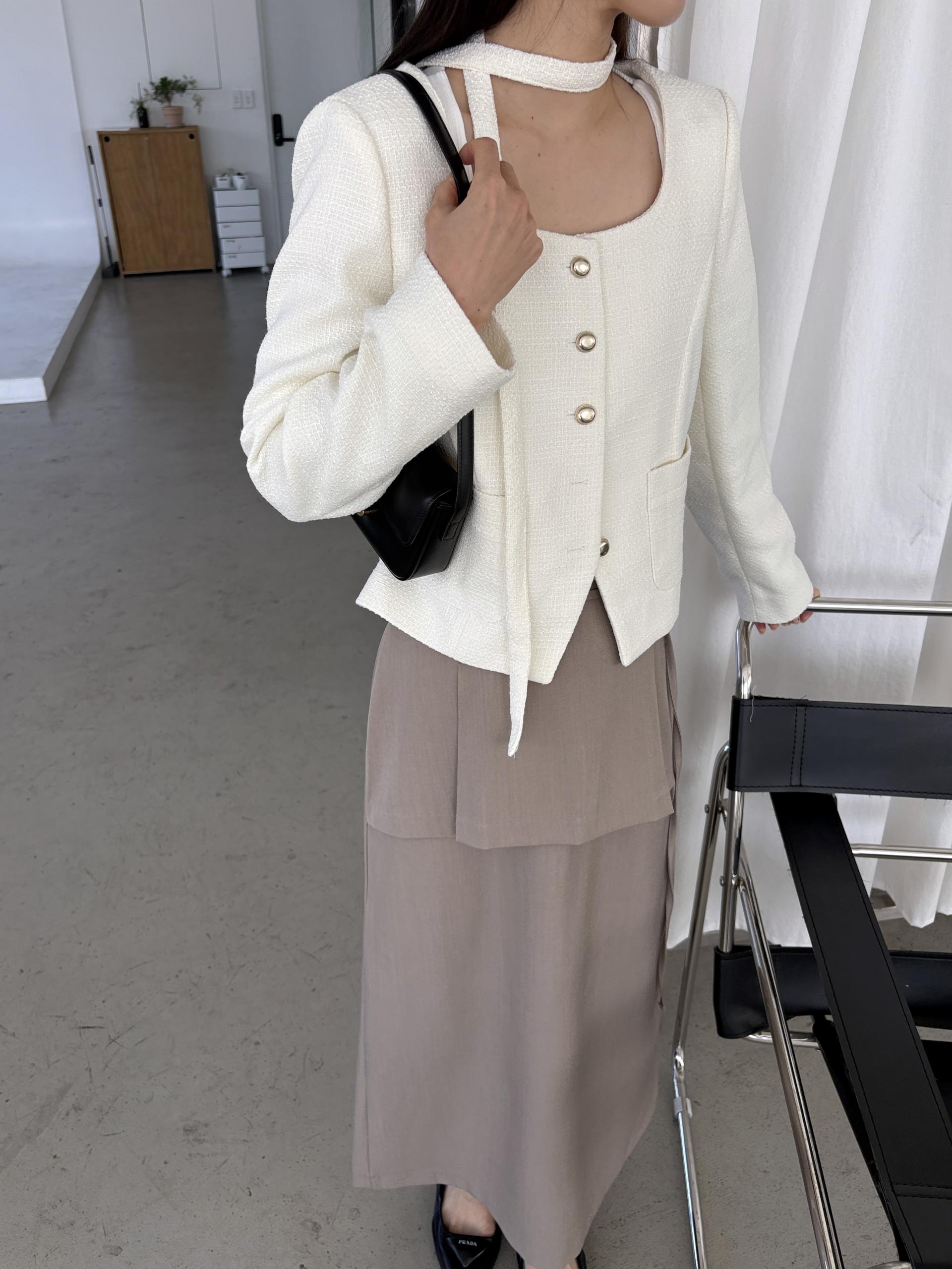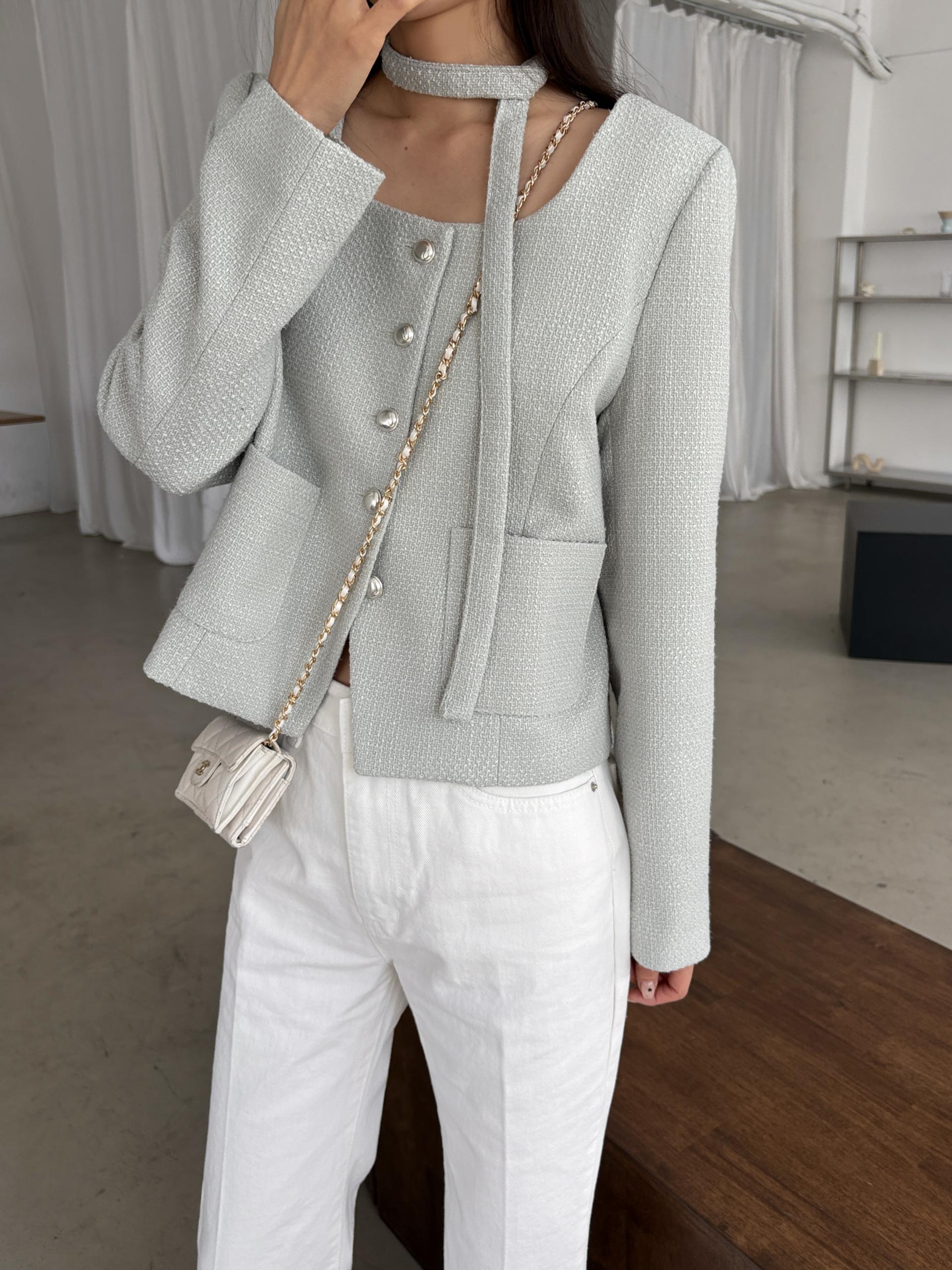 넥 라인의 타이 스트랩 디테일과 스퀘어넥이 고급스럽게 어우러지는 트위드 자켓입니다.
