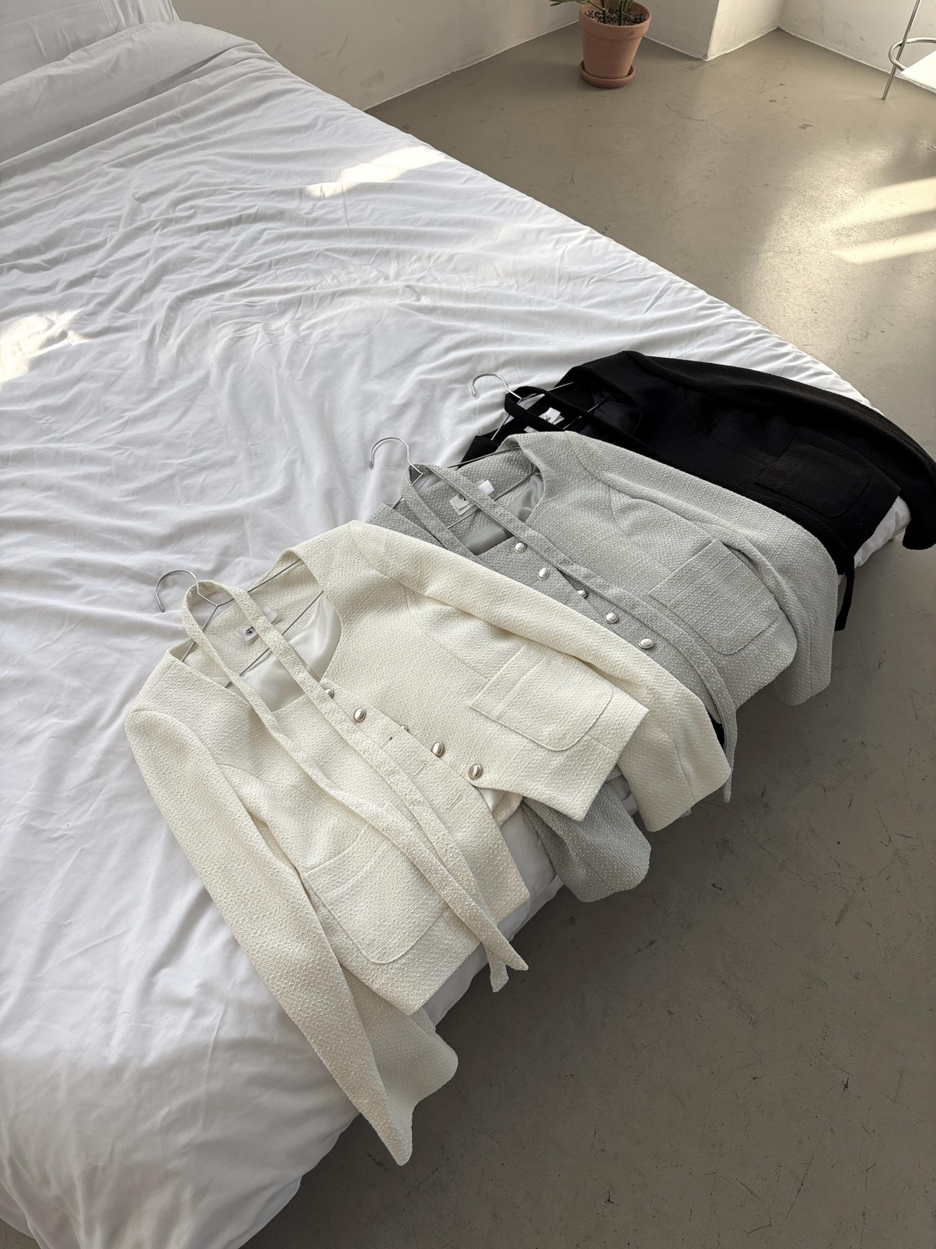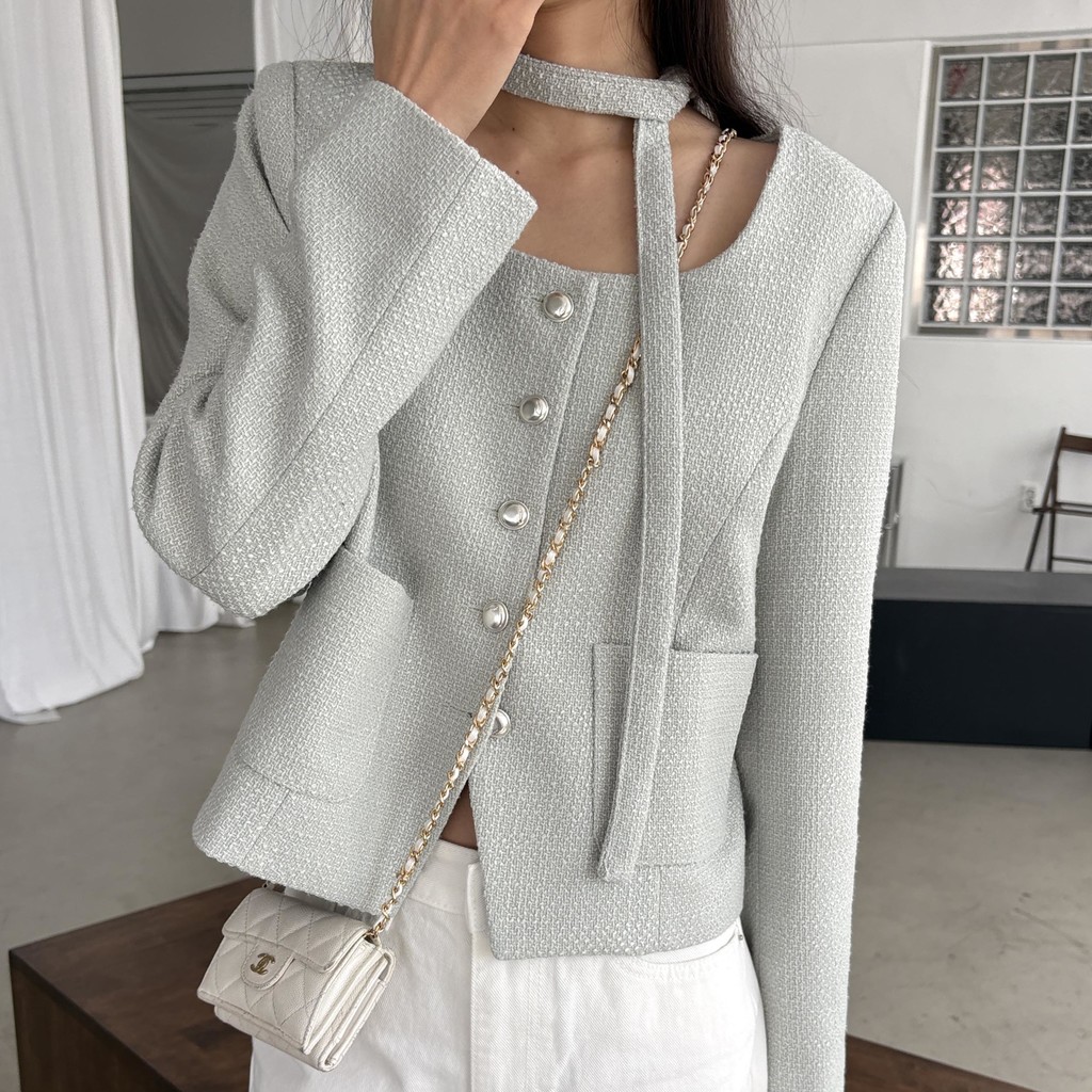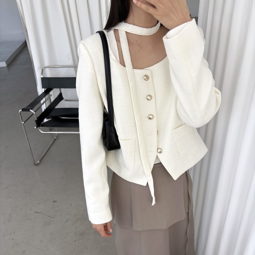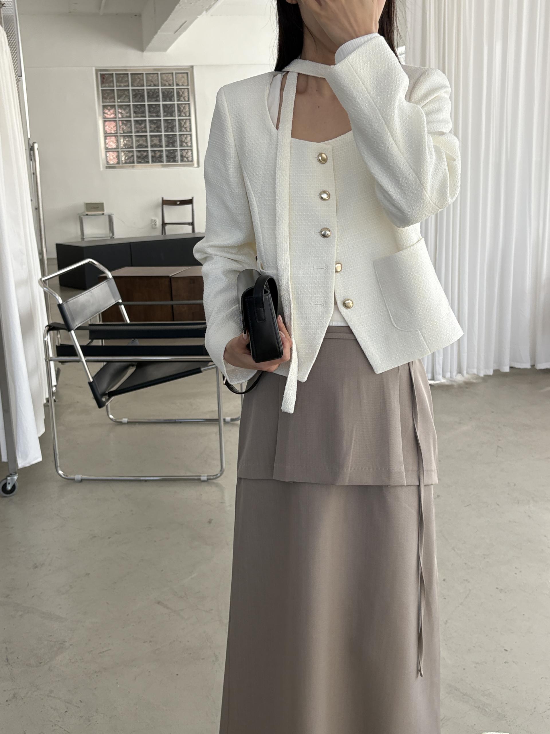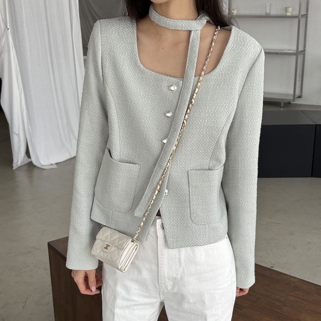 넥 라인의 타이 스트랩 디테일과 스퀘어넥이 고급스럽게 어우러지는 트위드 자켓입니다.