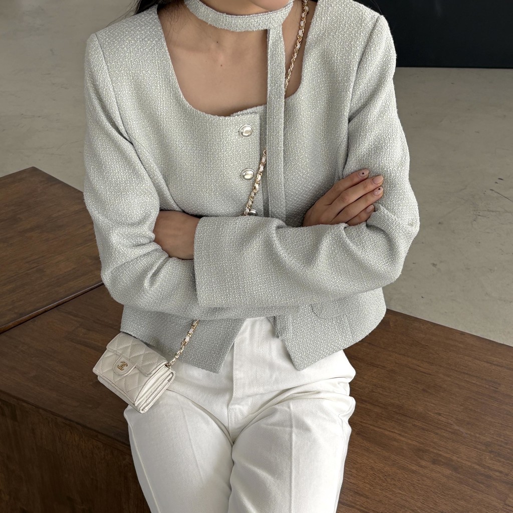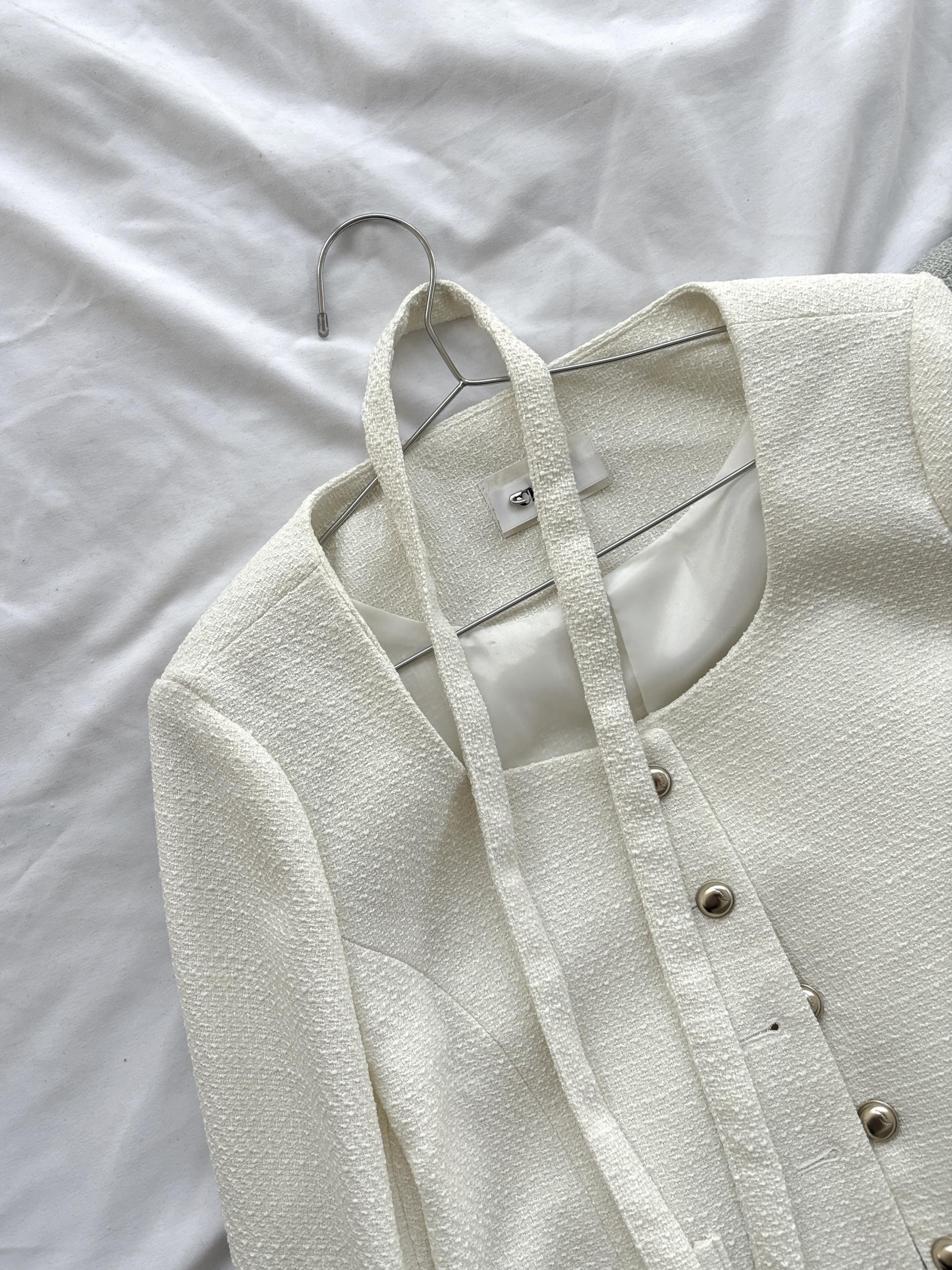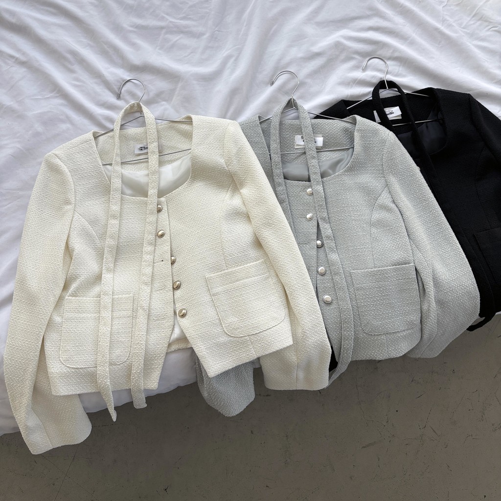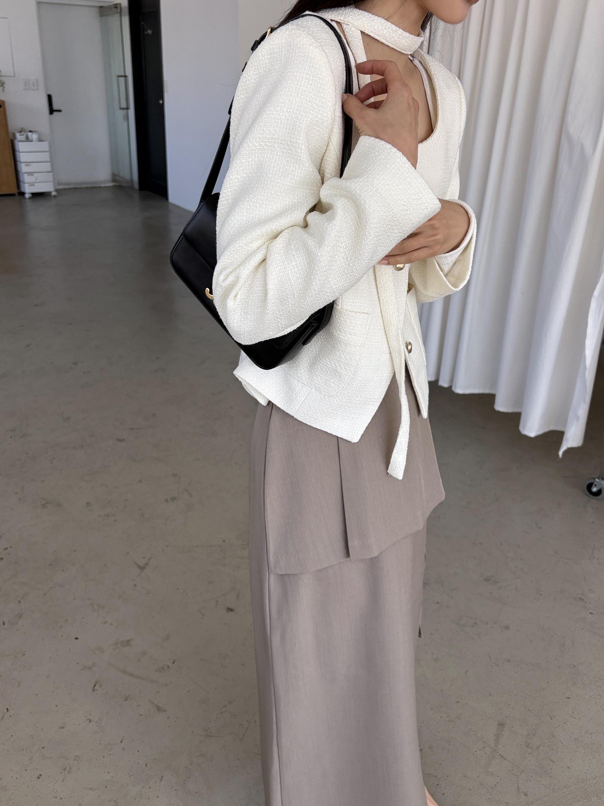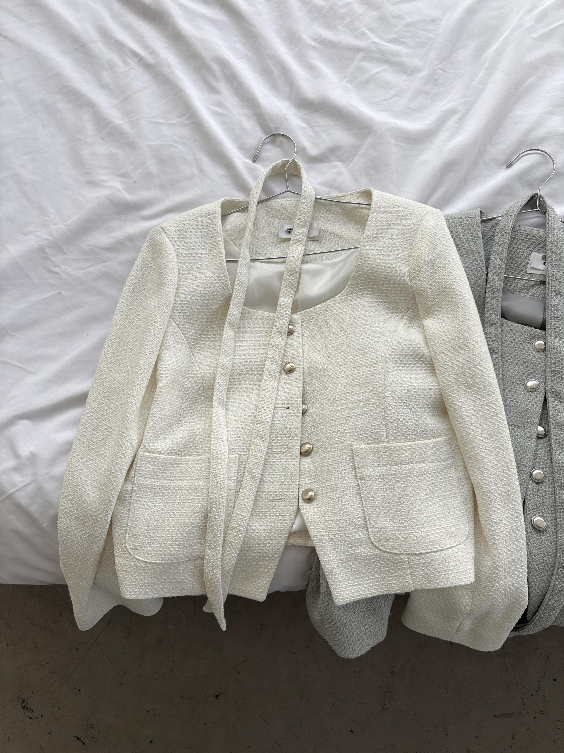 넥 라인의 타이 스트랩 디테일과 스퀘어넥이 고급스럽게 어우러지는 트위드 자켓입니다.