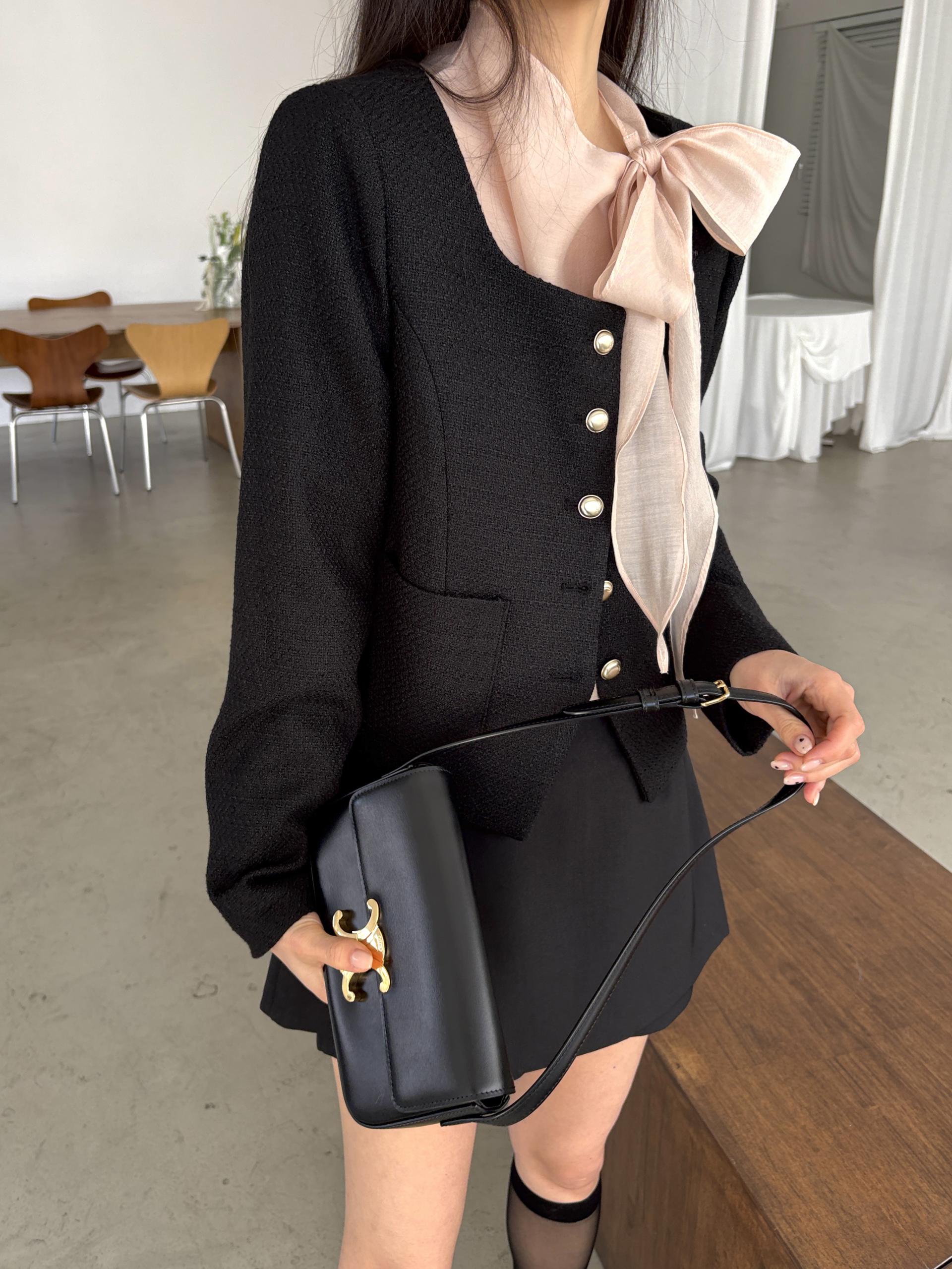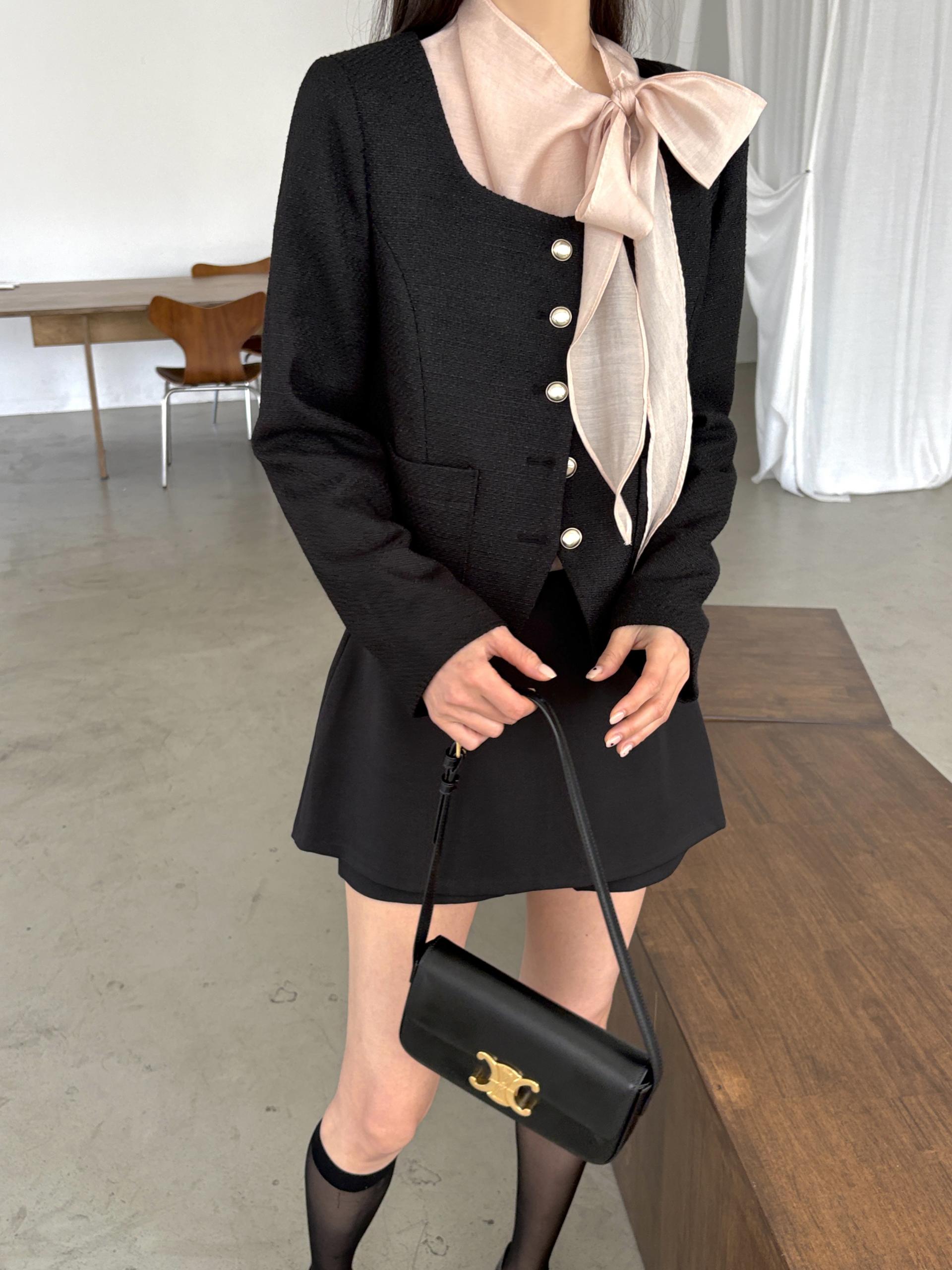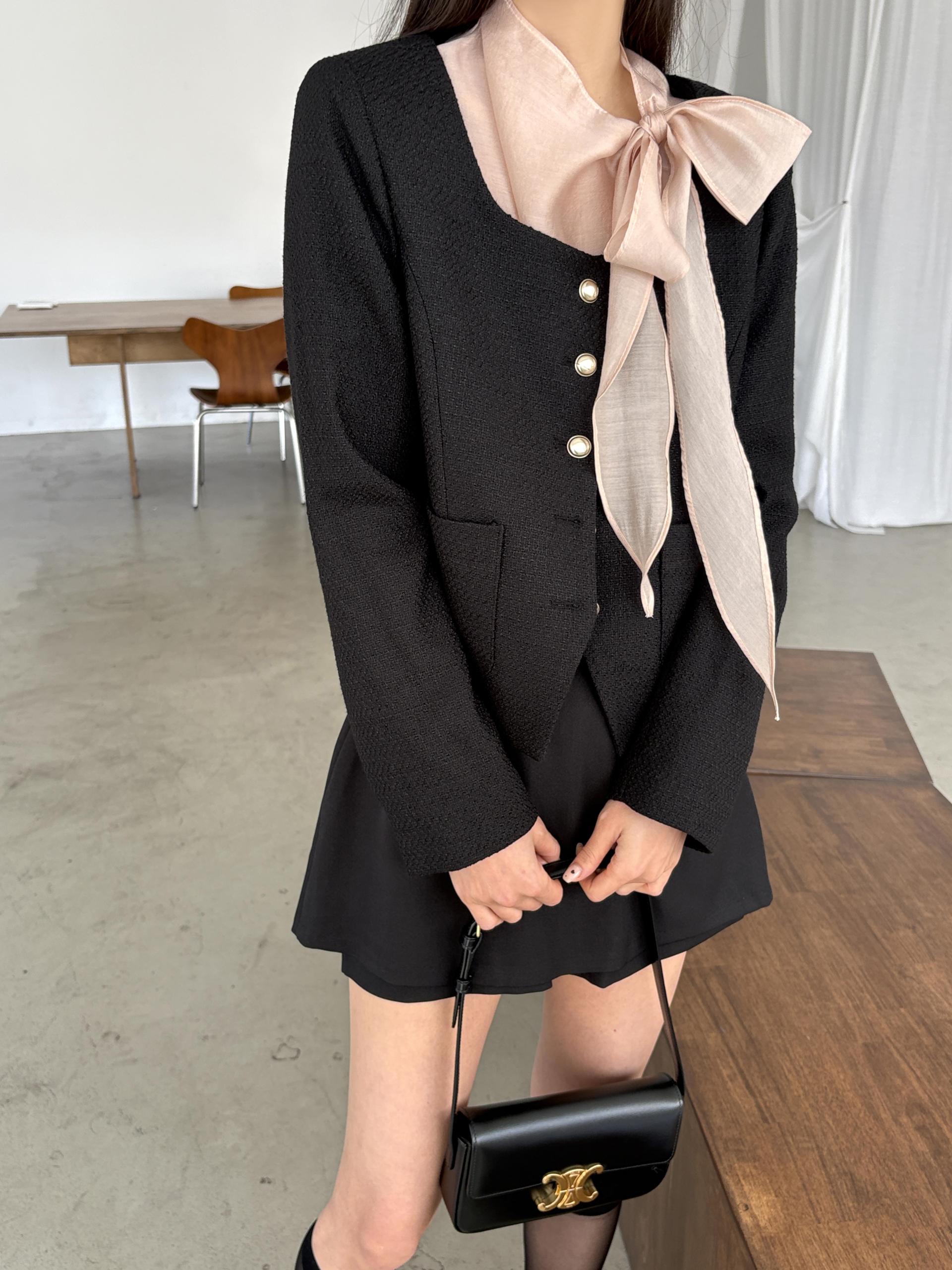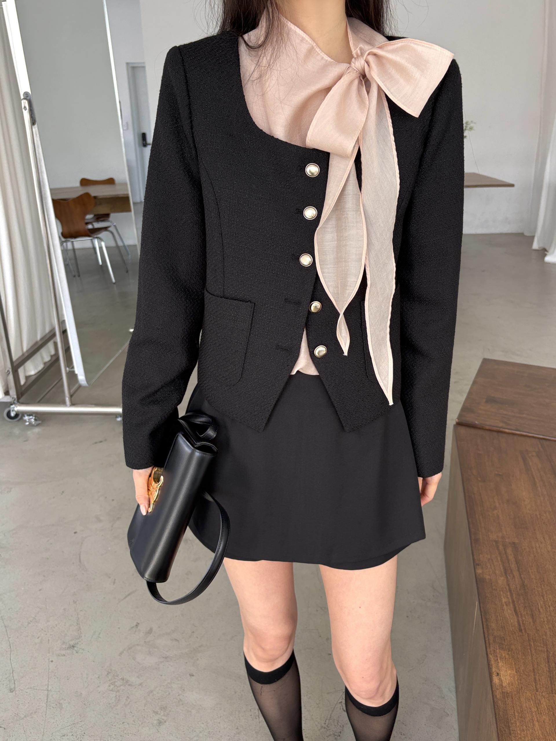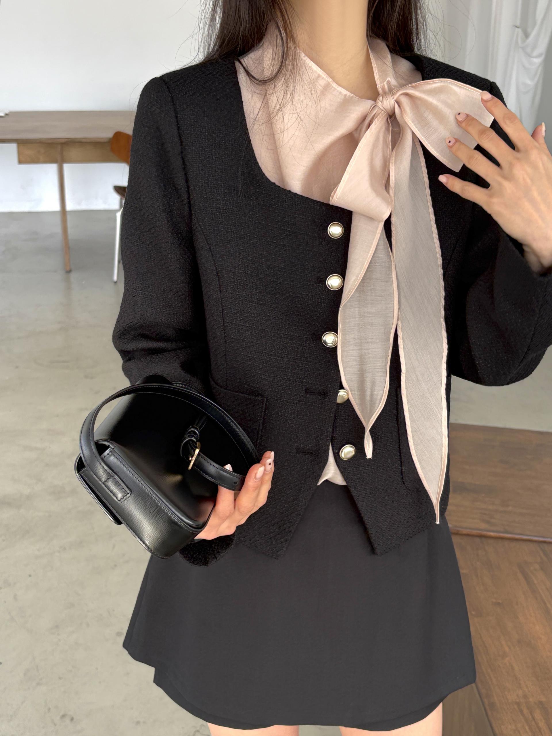 타이 없이 트위드 자켓만 단독으로 코디하셔도 좋고, 블랙 착용 컷과 같이 타이 블라우스와 레이어드해도 좋아요. 이너 없이 단추를 모두 잠가 자켓 블라우스 느낌으로 착용하는 것도 좋습니다.