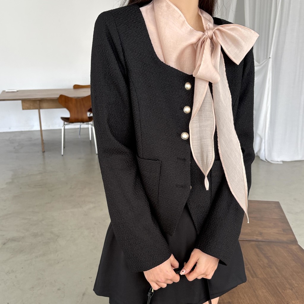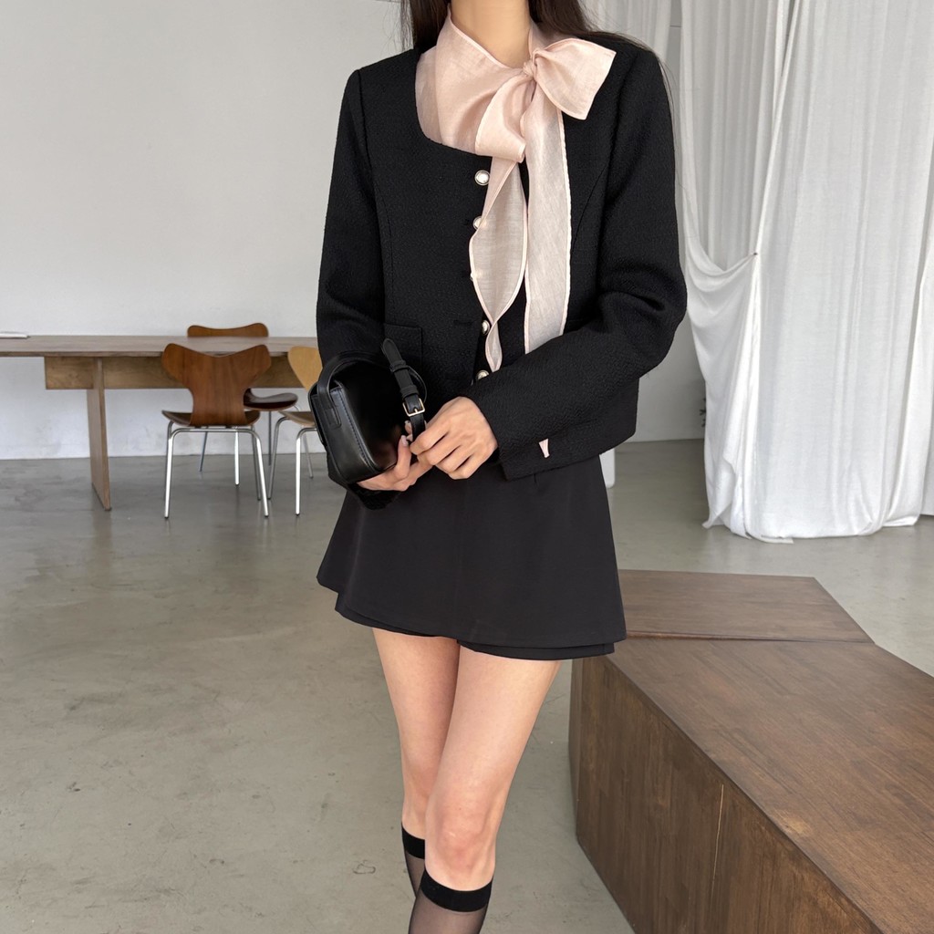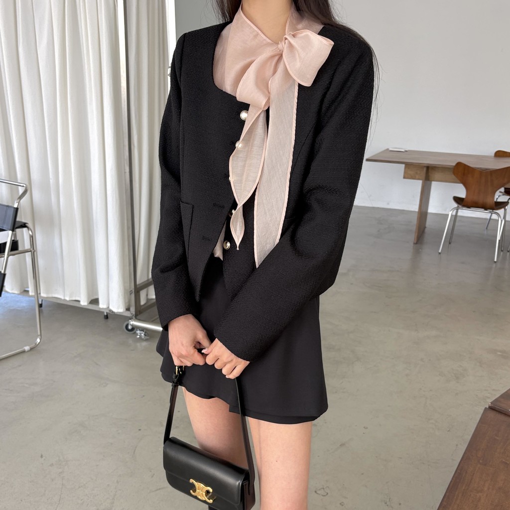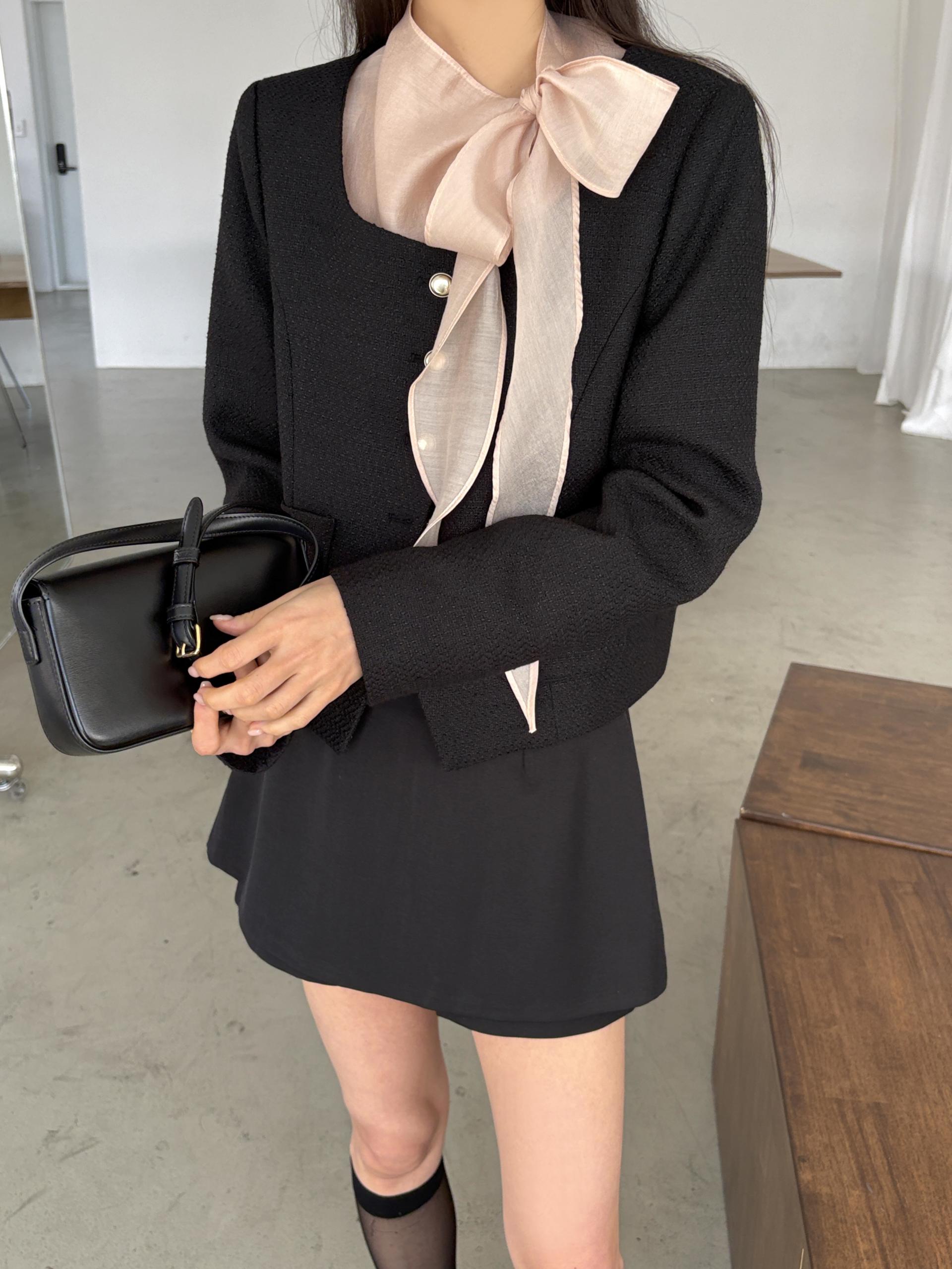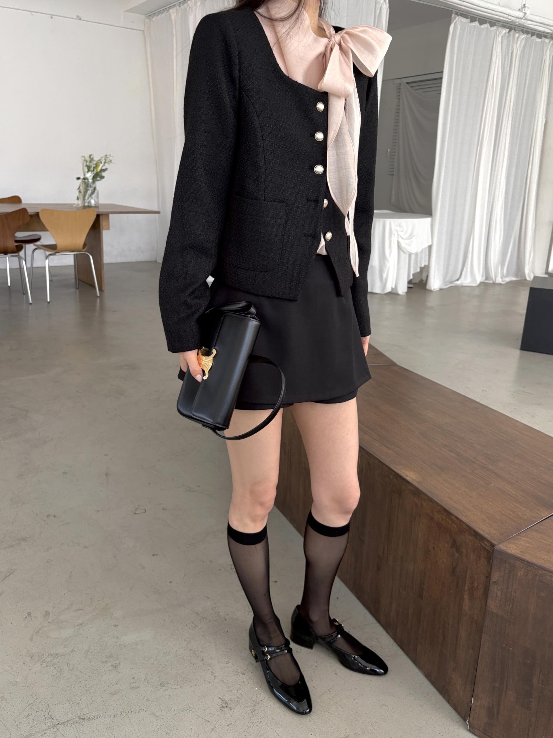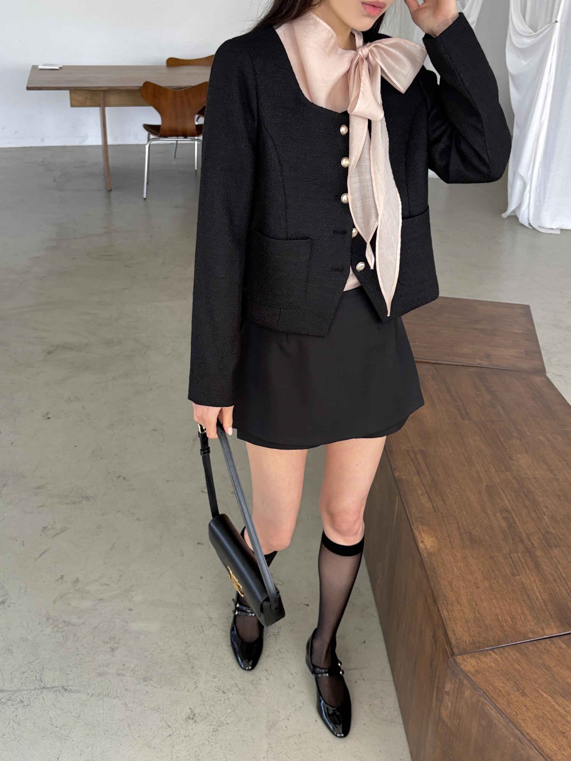 타이 없이 트위드 자켓만 단독으로 코디하셔도 좋고, 블랙 착용 컷과 같이 타이 블라우스와 레이어드해도 좋아요. 이너 없이 단추를 모두 잠가 자켓 블라우스 느낌으로 착용하는 것도 좋습니다.