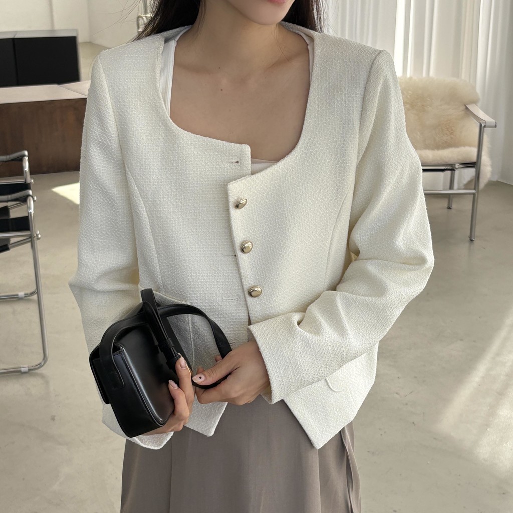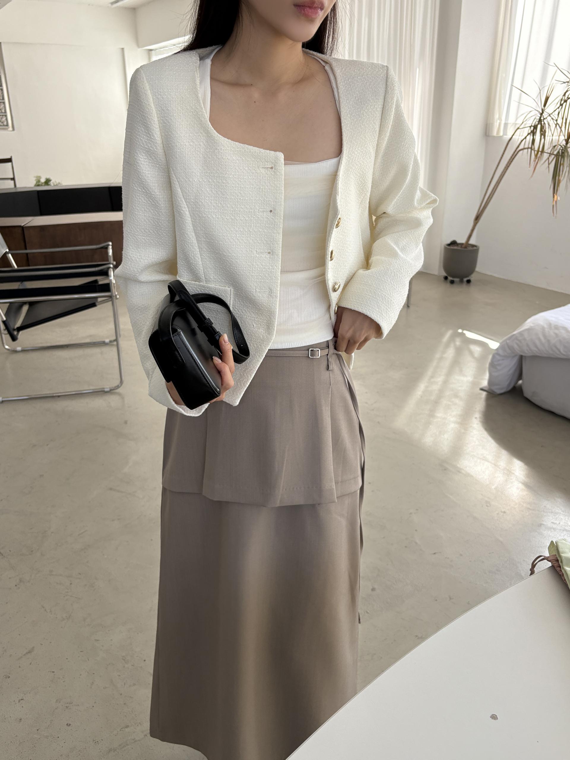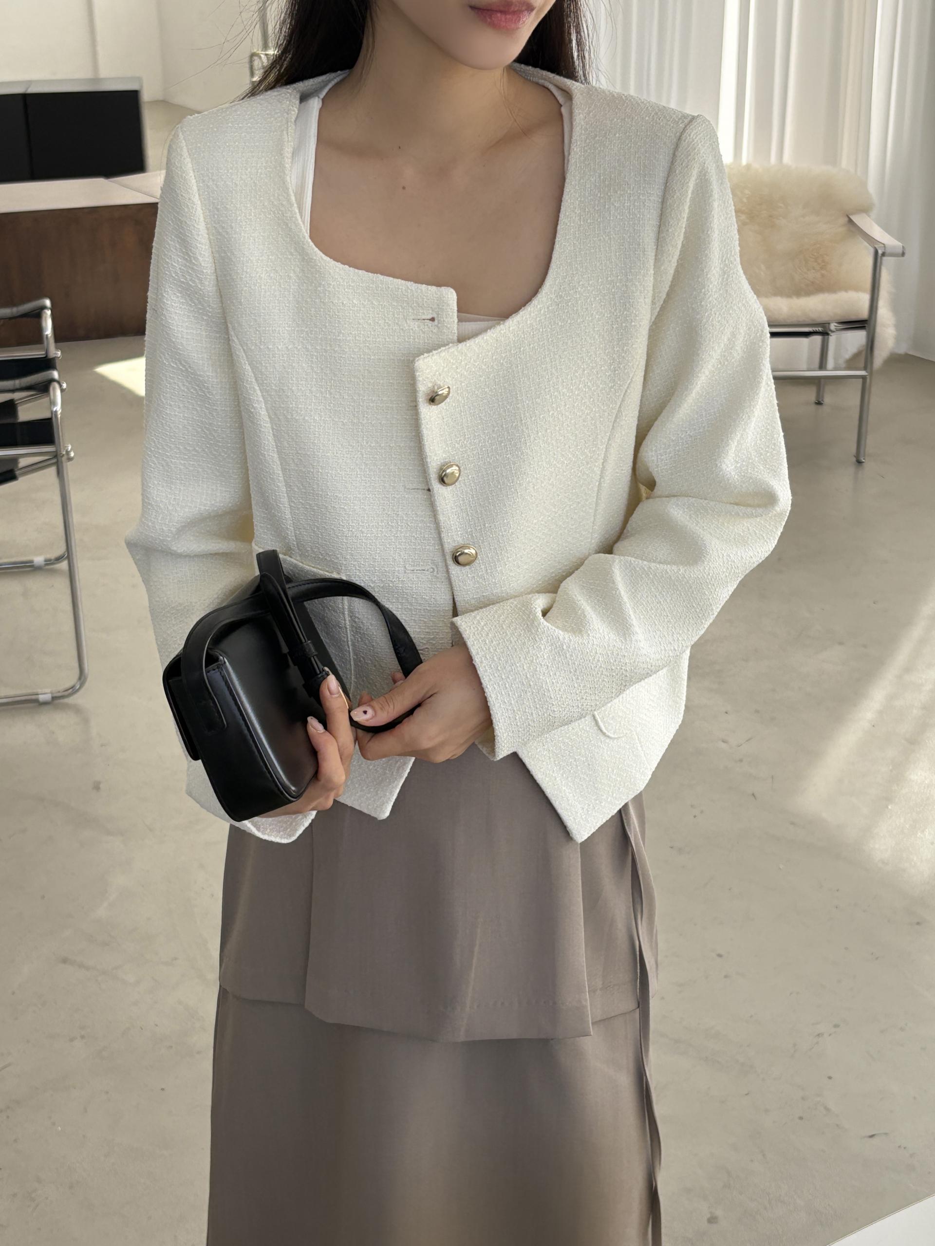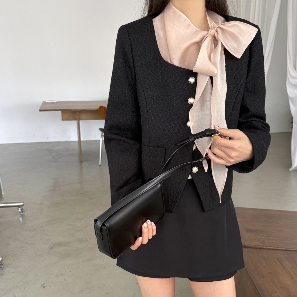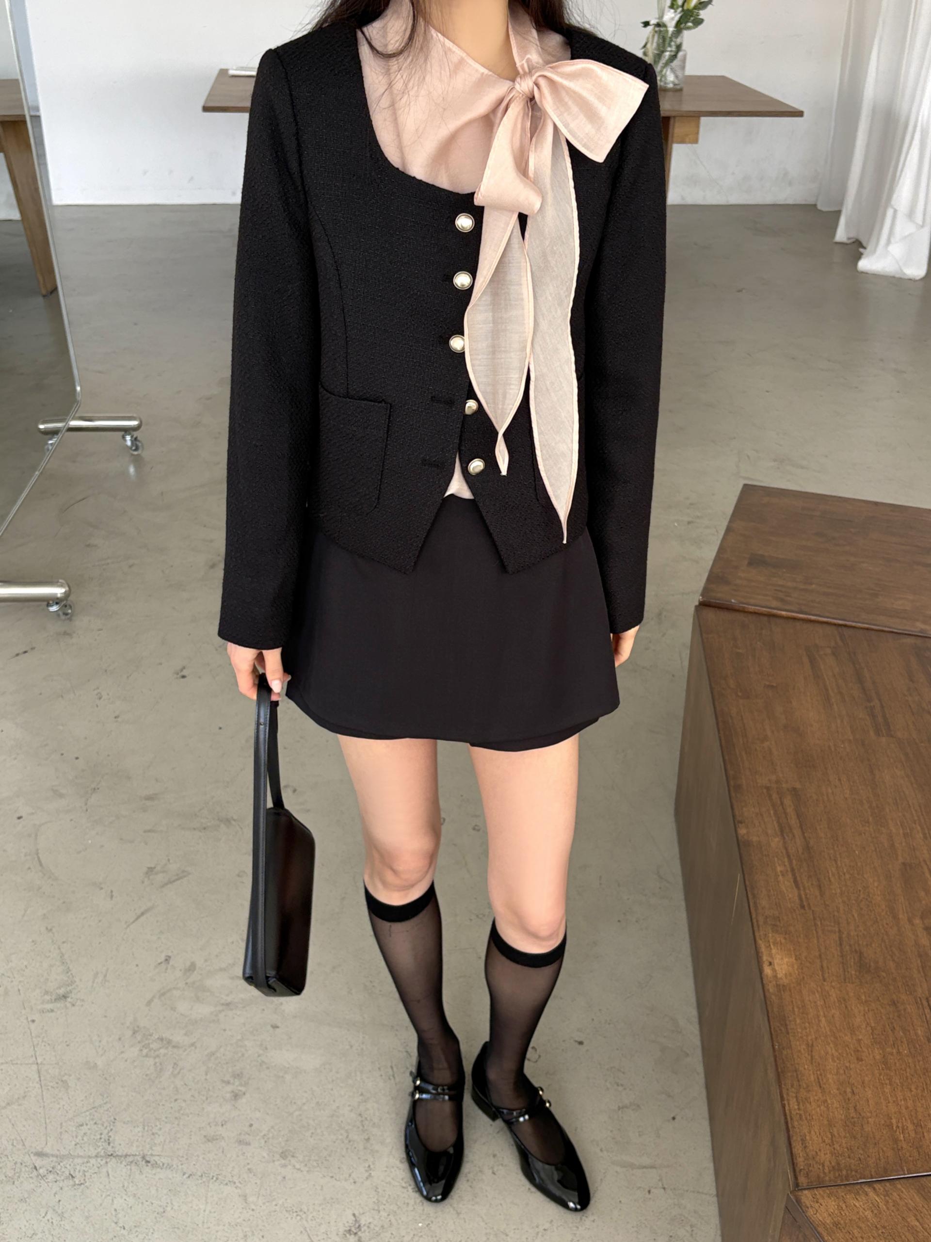 타이 없이 트위드 자켓만 단독으로 코디하셔도 좋고, 블랙 착용 컷과 같이 타이 블라우스와 레이어드해도 좋아요. 이너 없이 단추를 모두 잠가 자켓 블라우스 느낌으로 착용하는 것도 좋습니다.