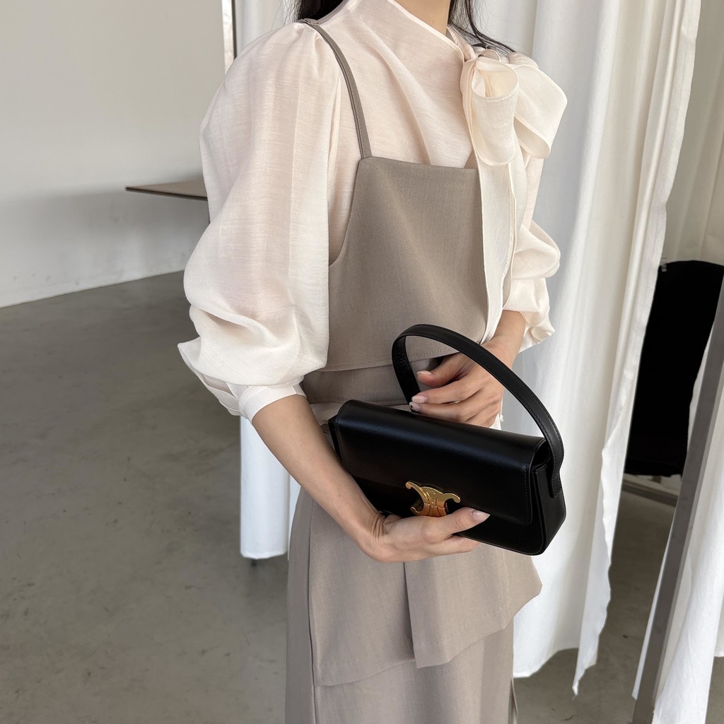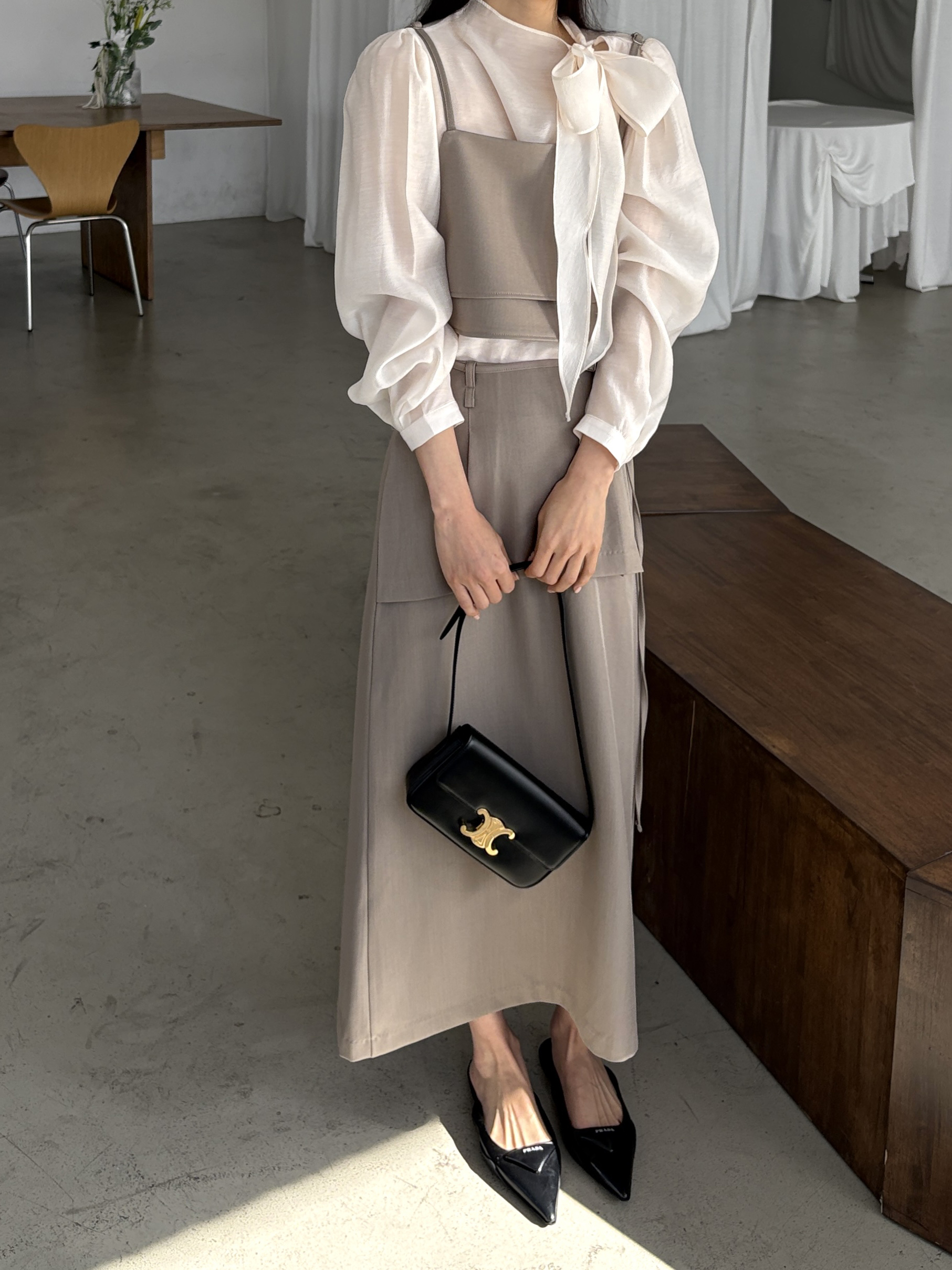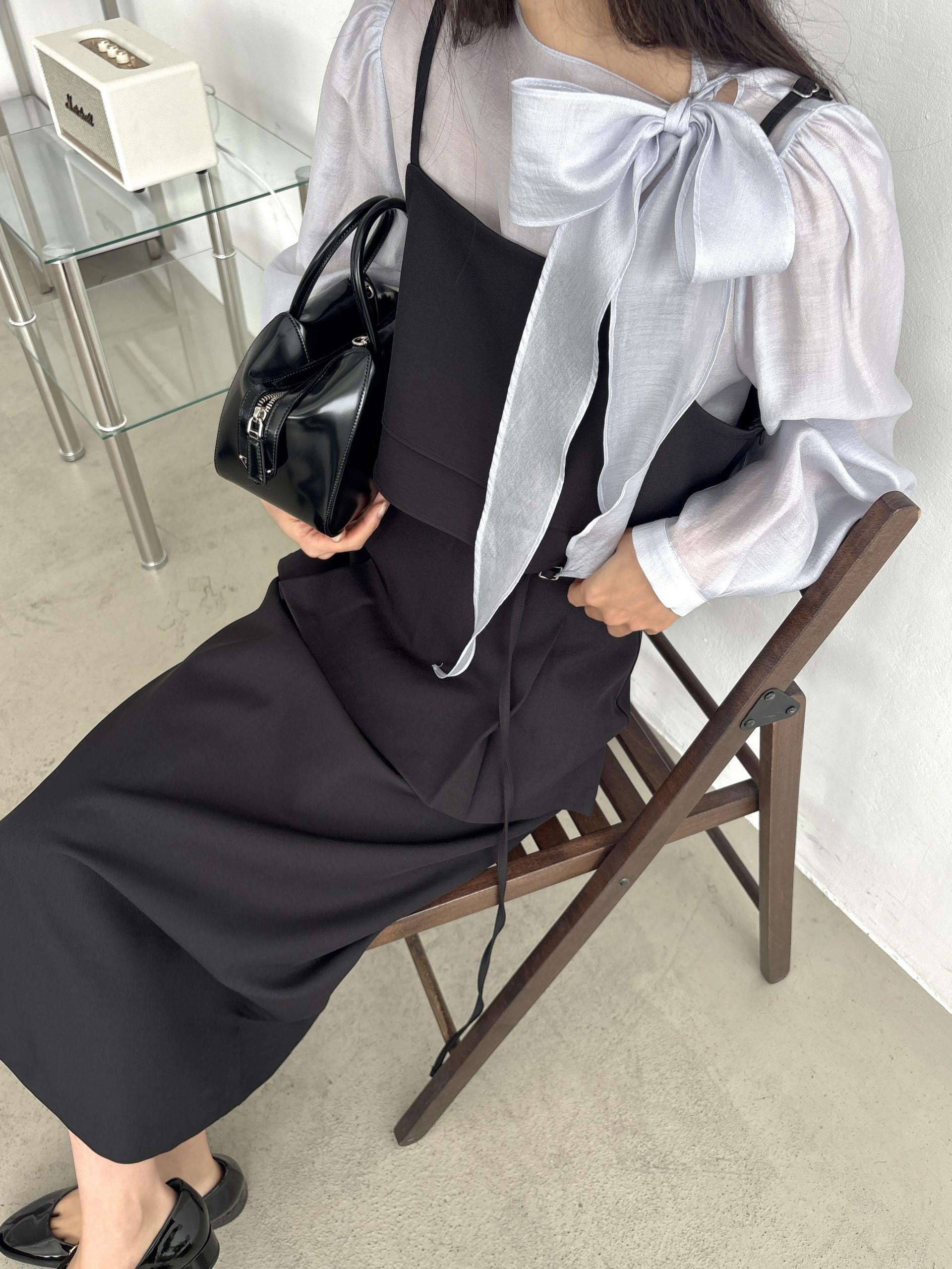 깔끔한 스퀘어넥으로 고급스러운 무드가 느껴지고, 옆 지퍼로 클로징 해 깔끔하게 착용되어 만족스러웠어요.