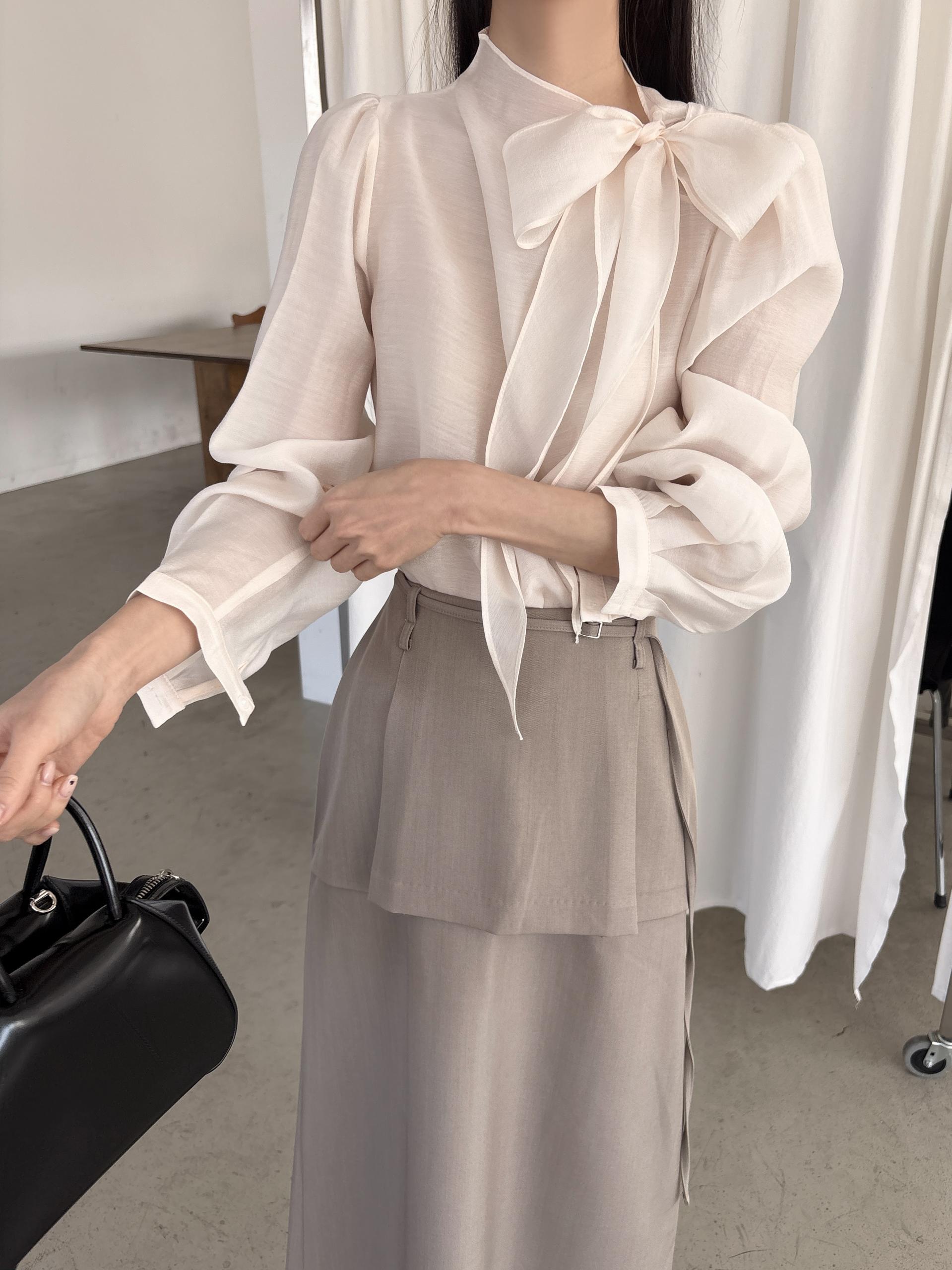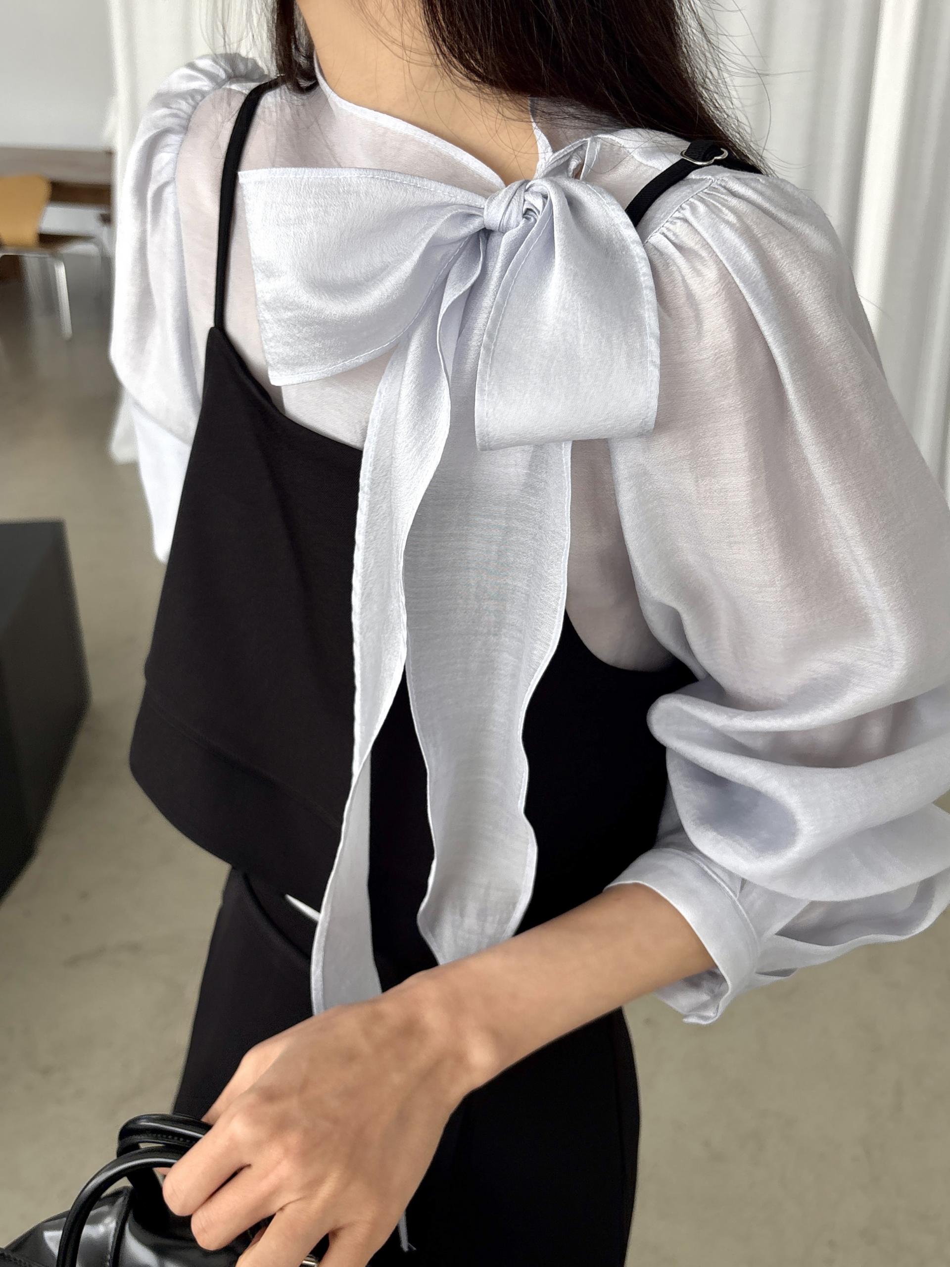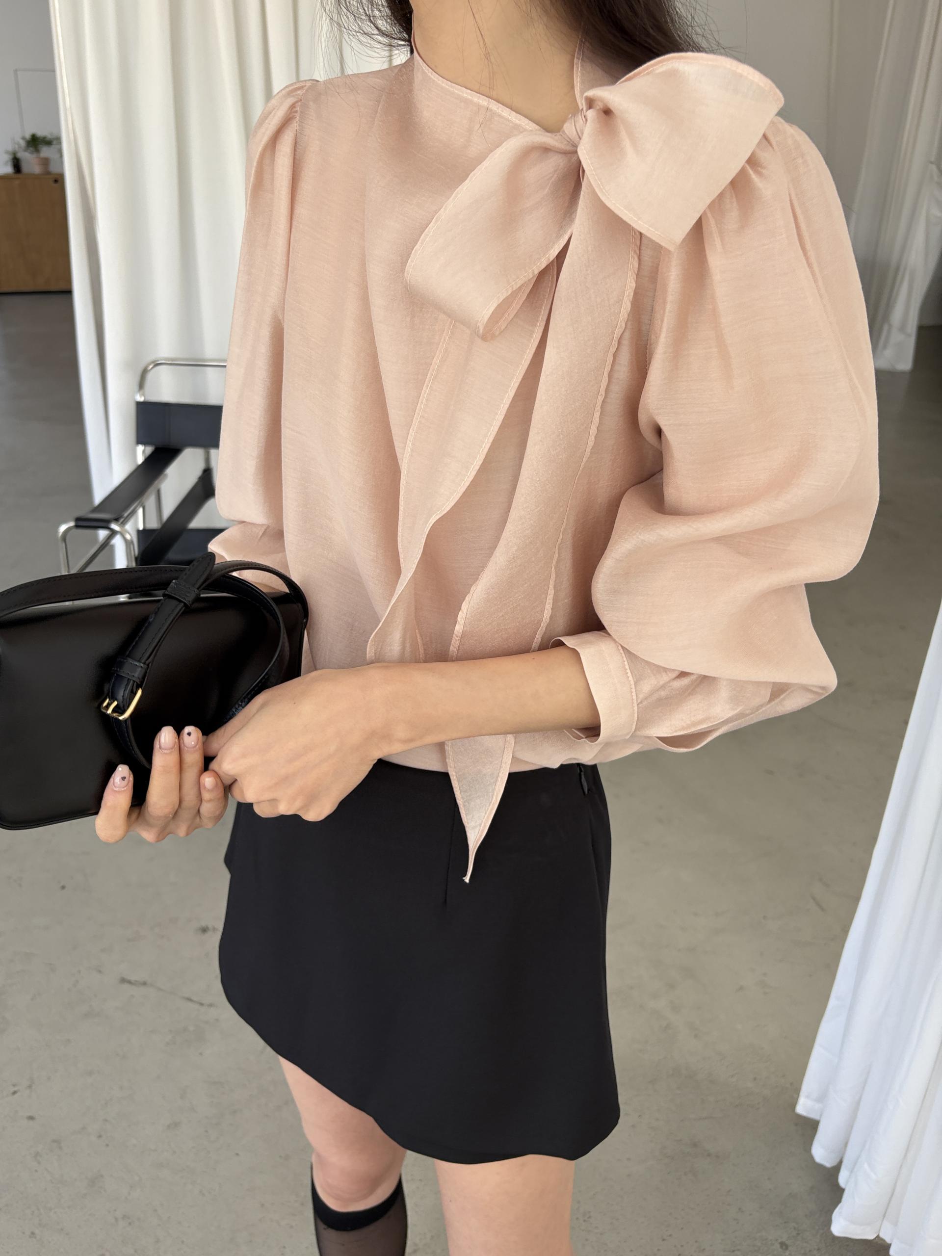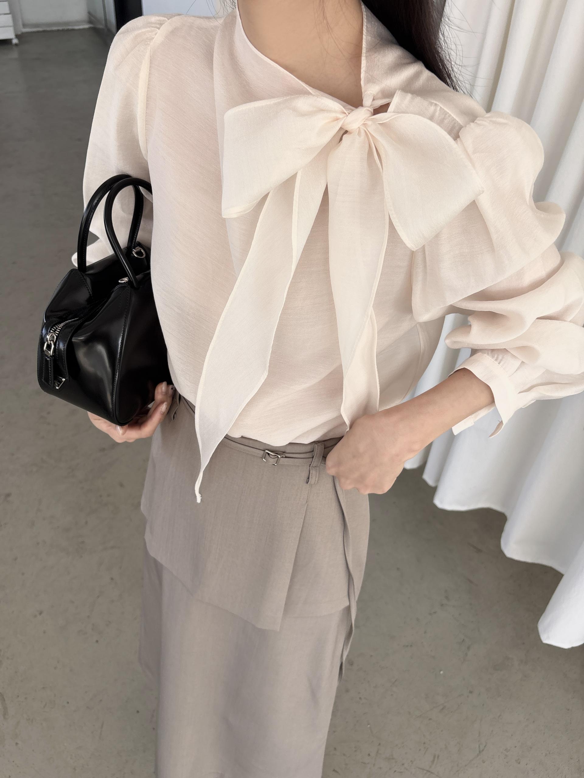 로맨틱한 리본 타이와 은은한 시스루 소재감이 매력적인 블라우스입니다.