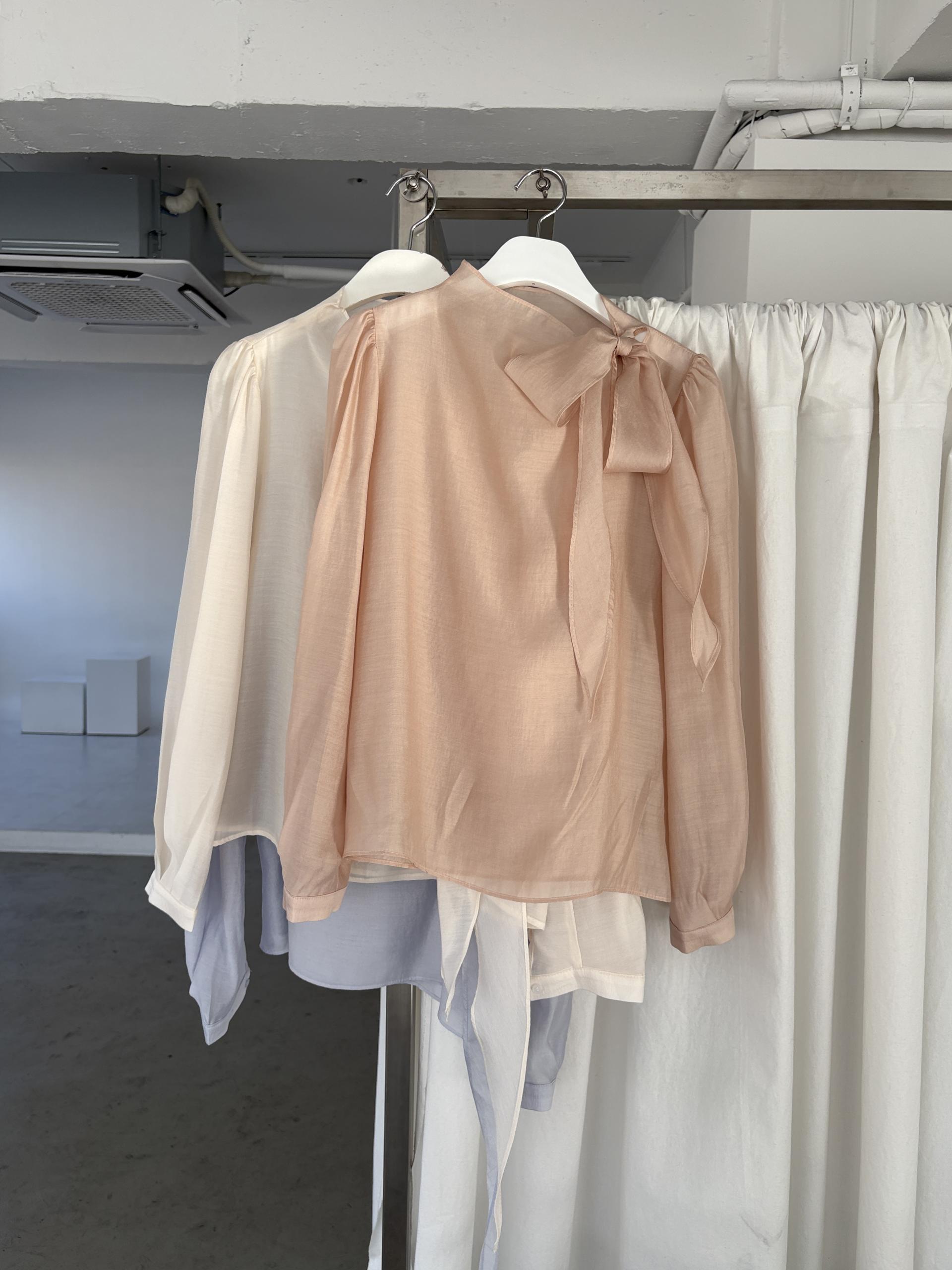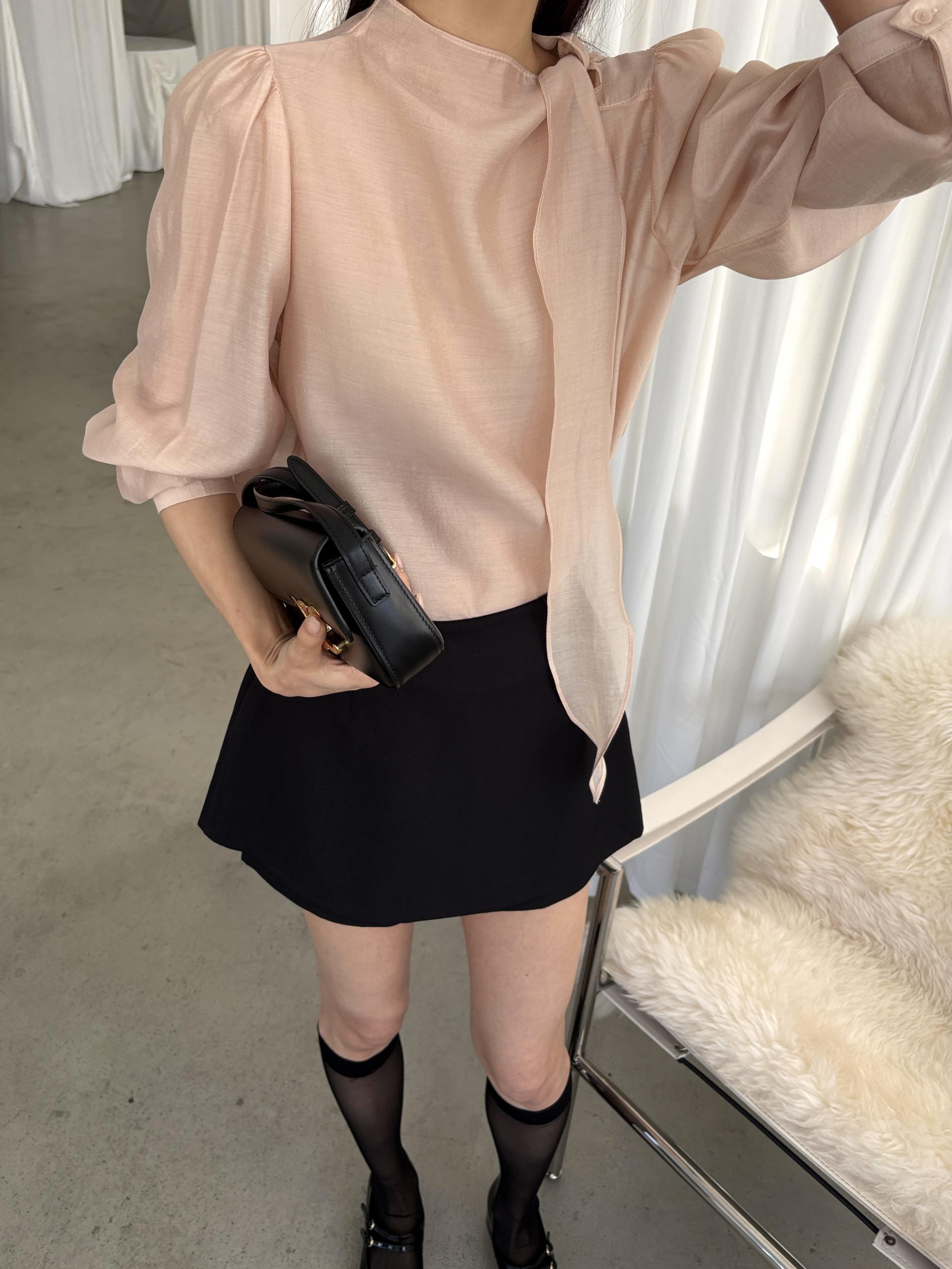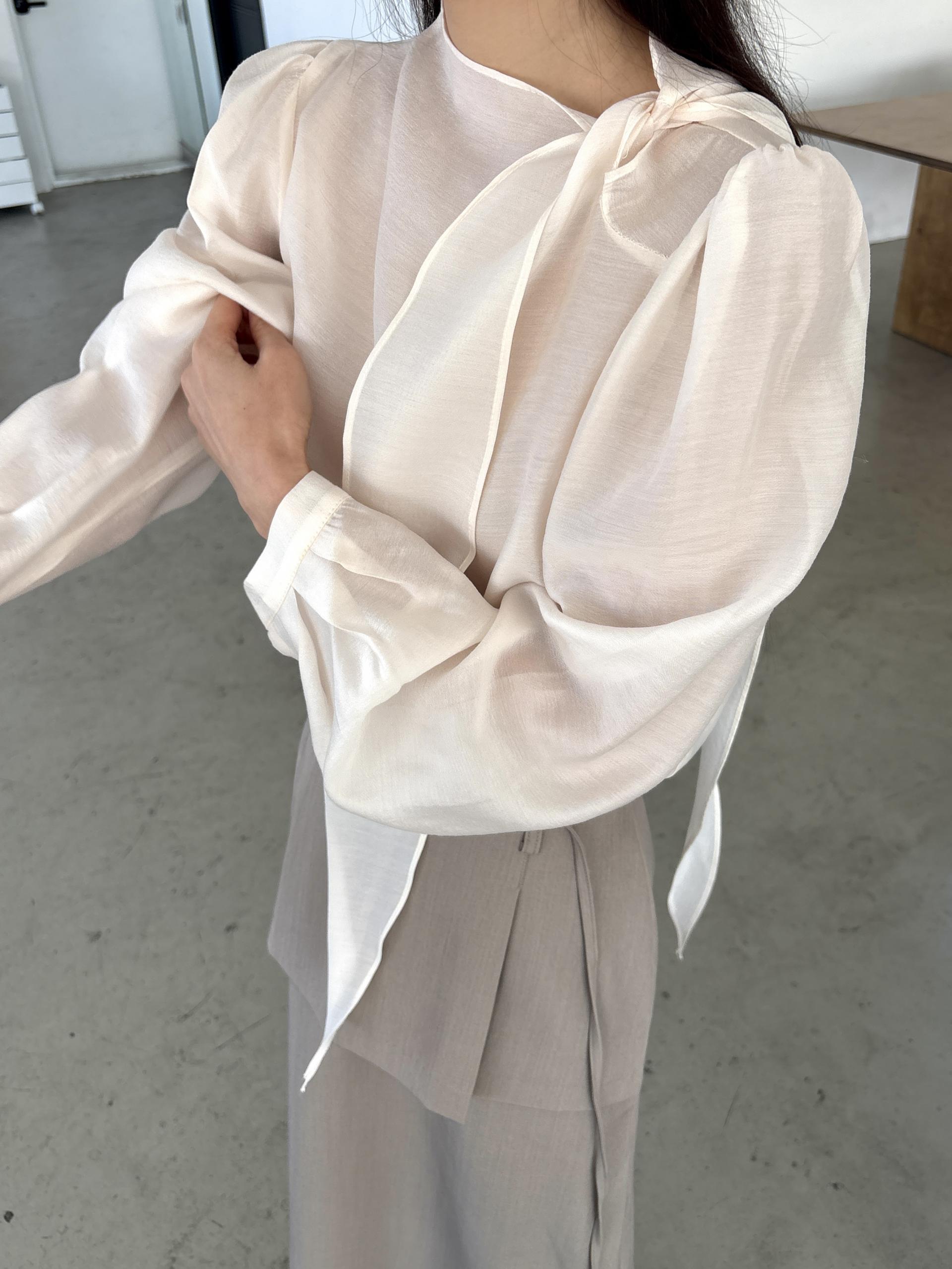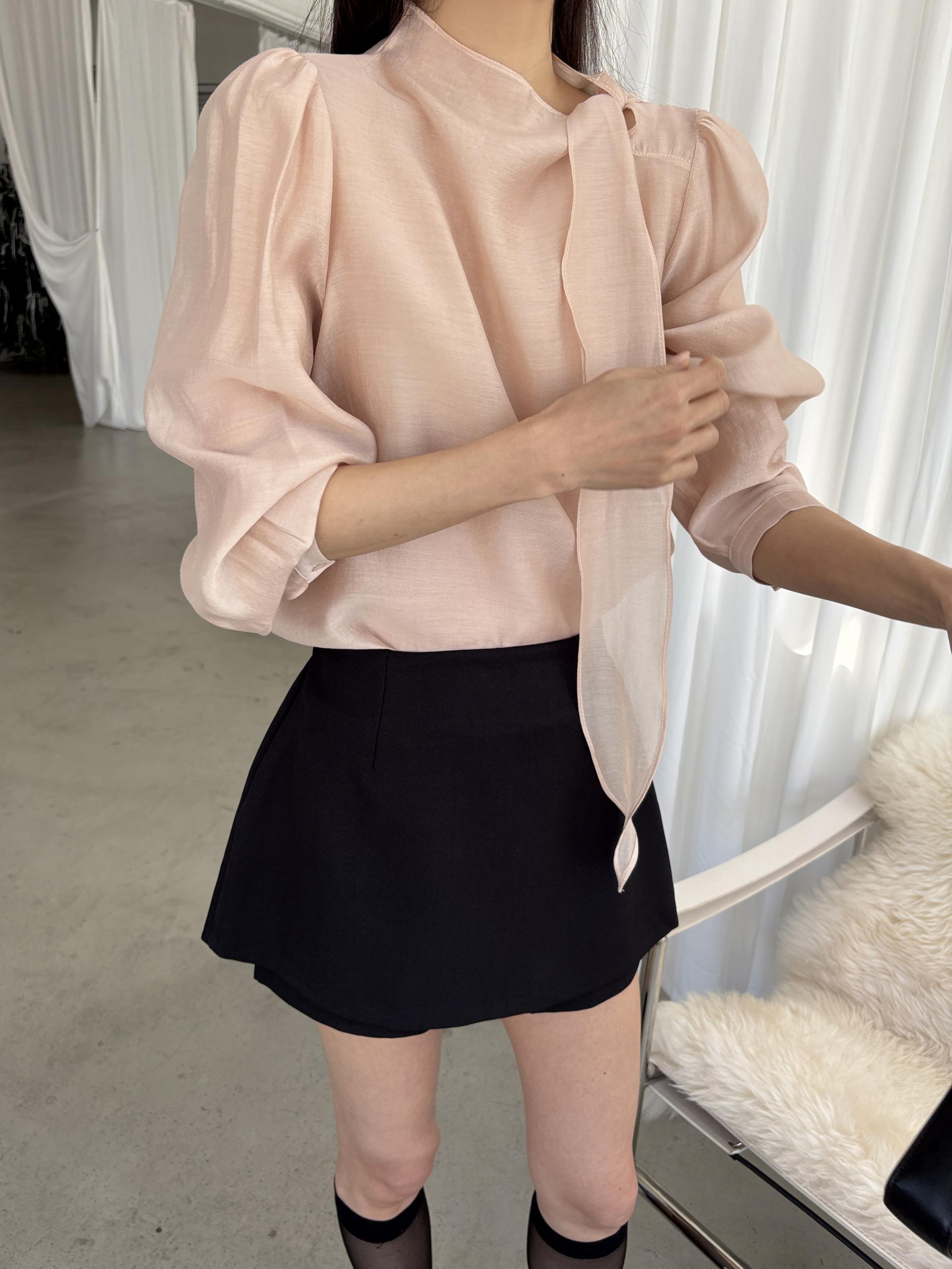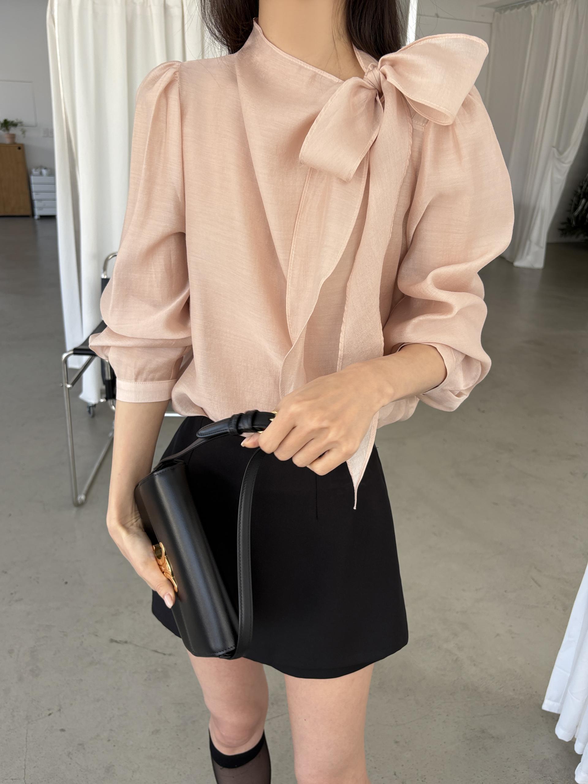 로맨틱한 리본 타이와 은은한 시스루 소재감이 매력적인 블라우스입니다.