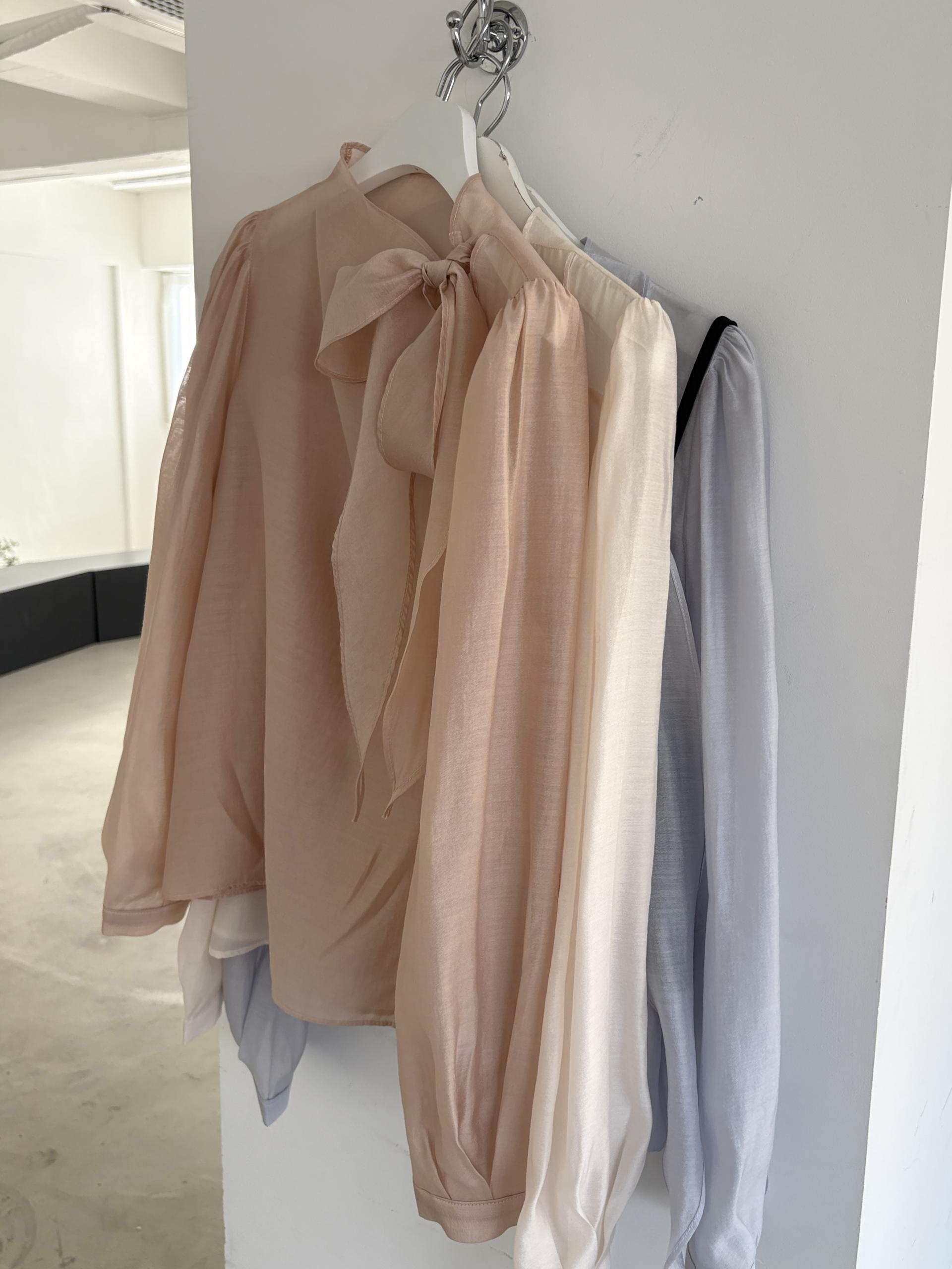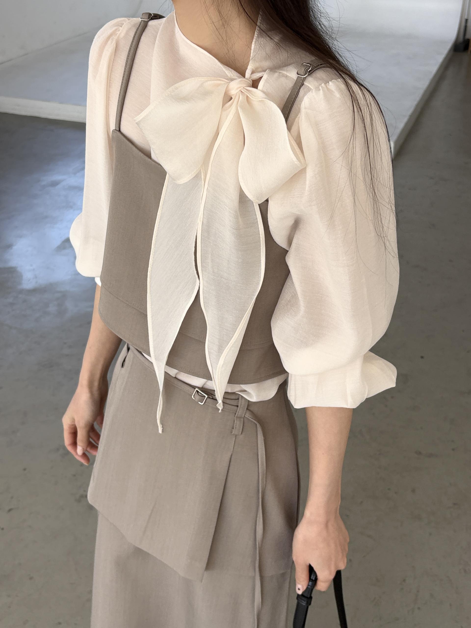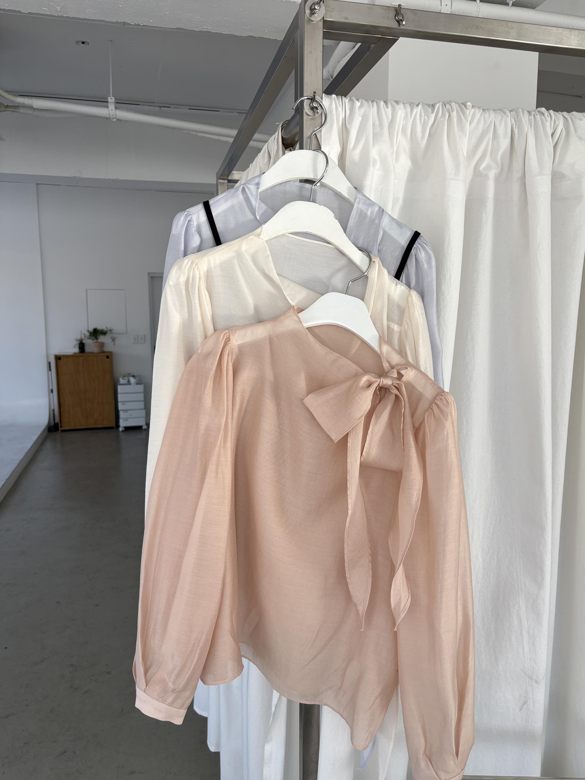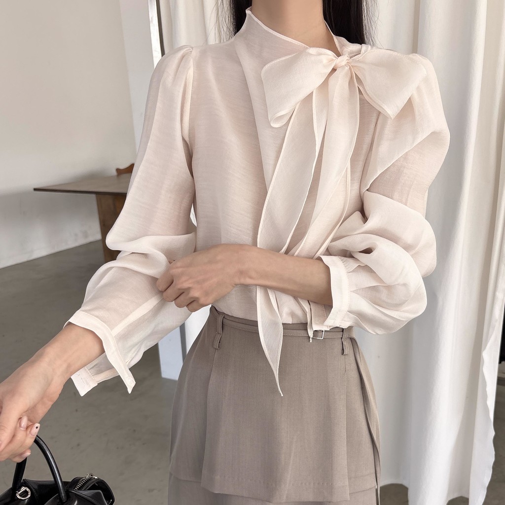 로맨틱한 리본 타이와 은은한 시스루 소재감이 매력적인 블라우스입니다.