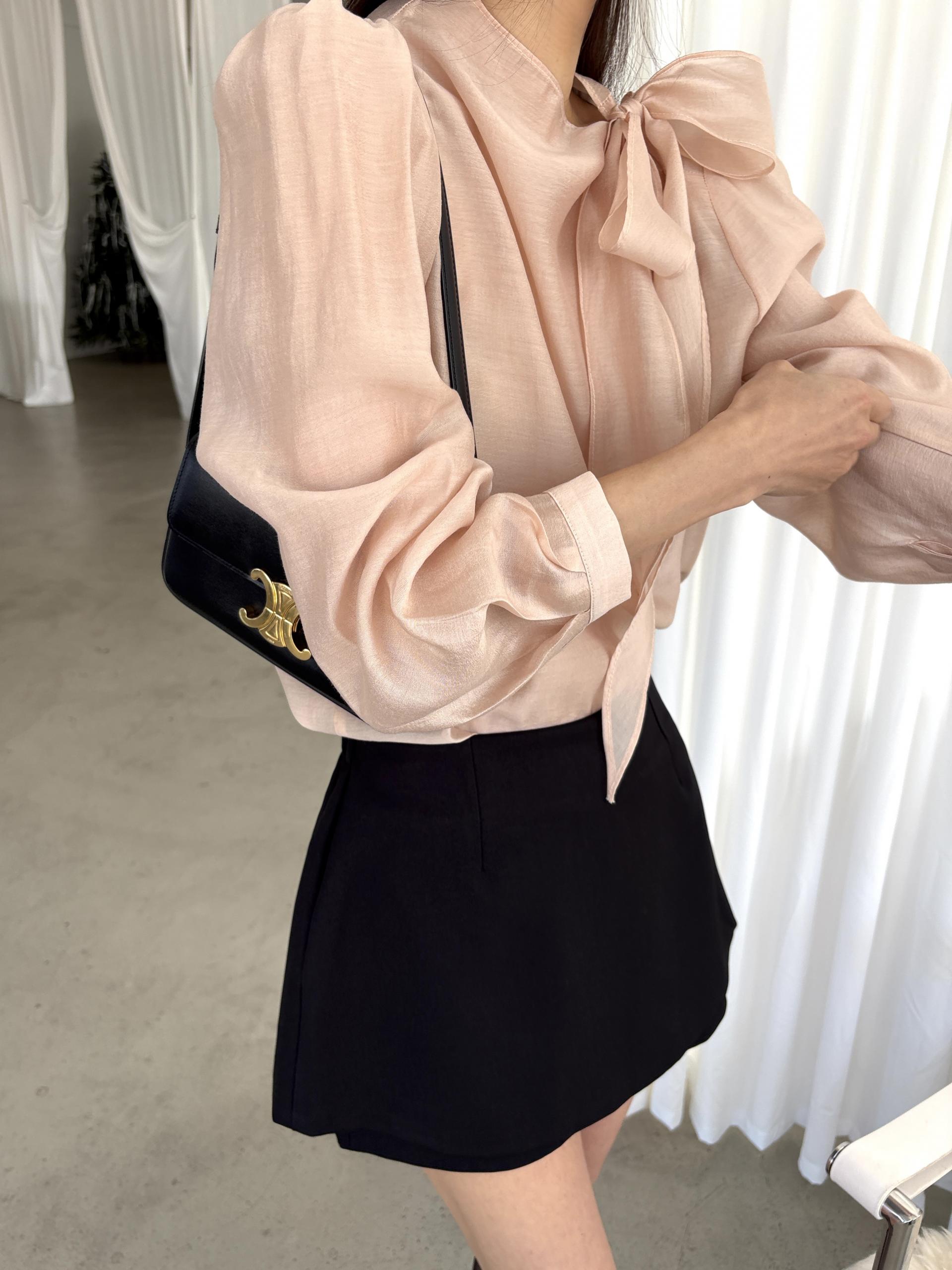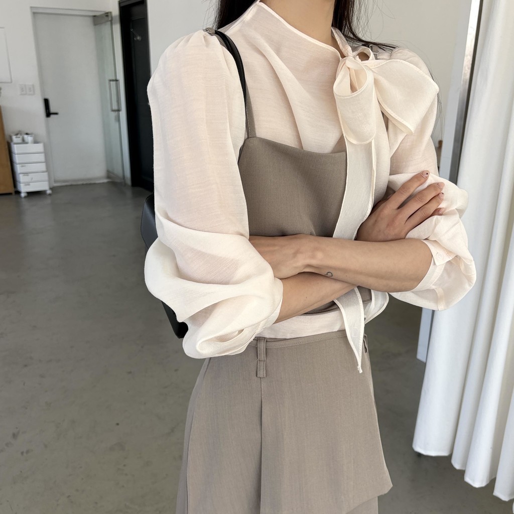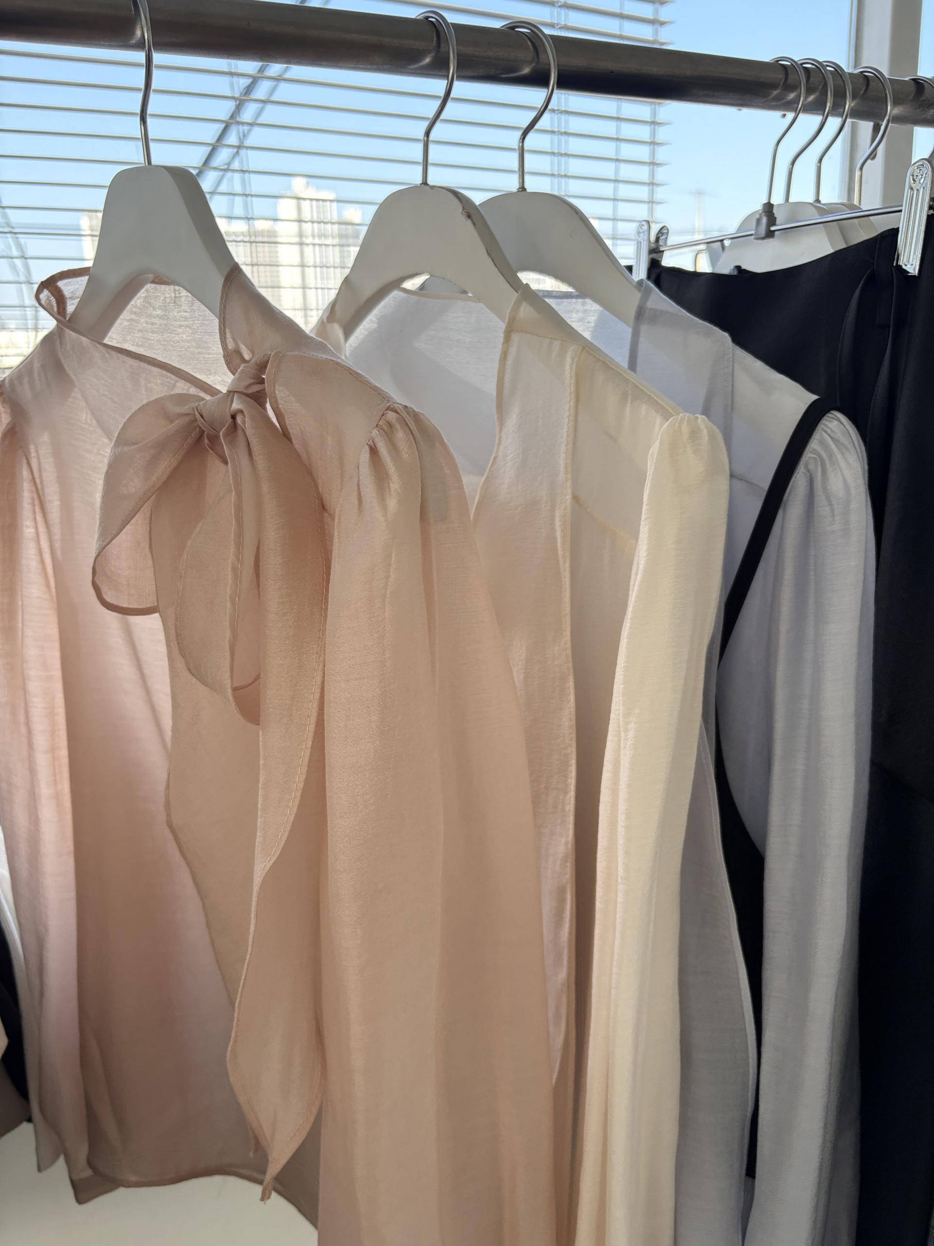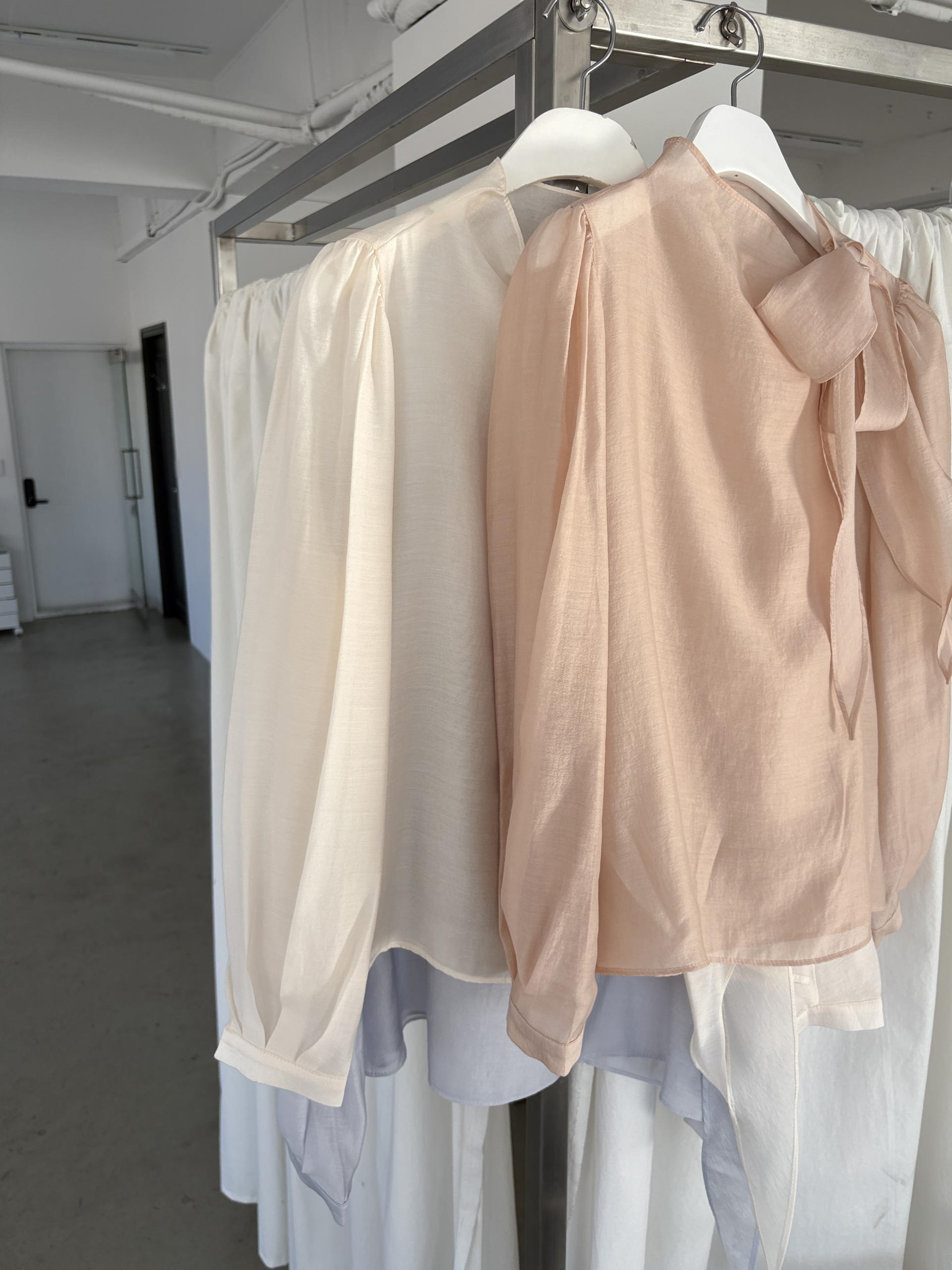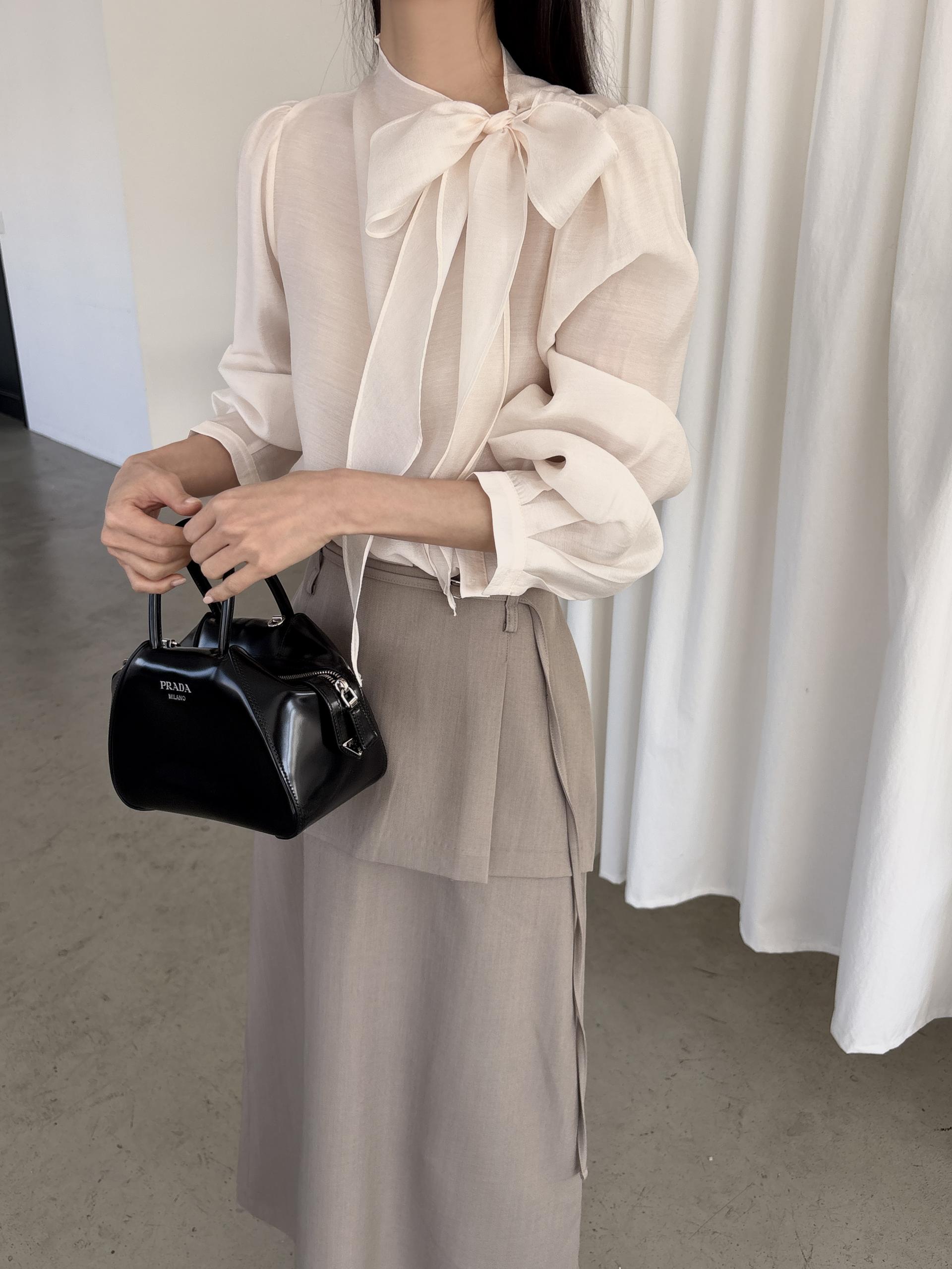 로맨틱한 리본 타이와 은은한 시스루 소재감이 매력적인 블라우스입니다.