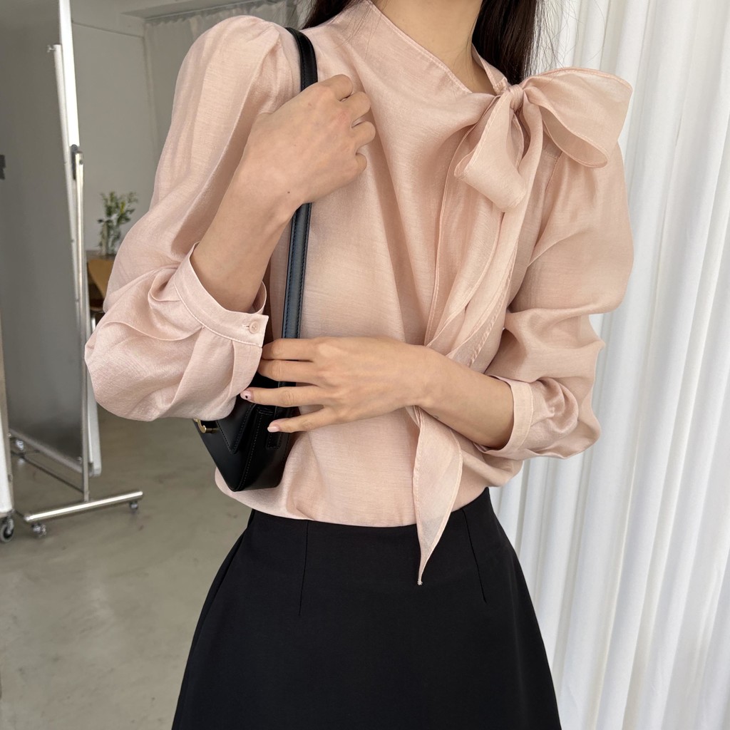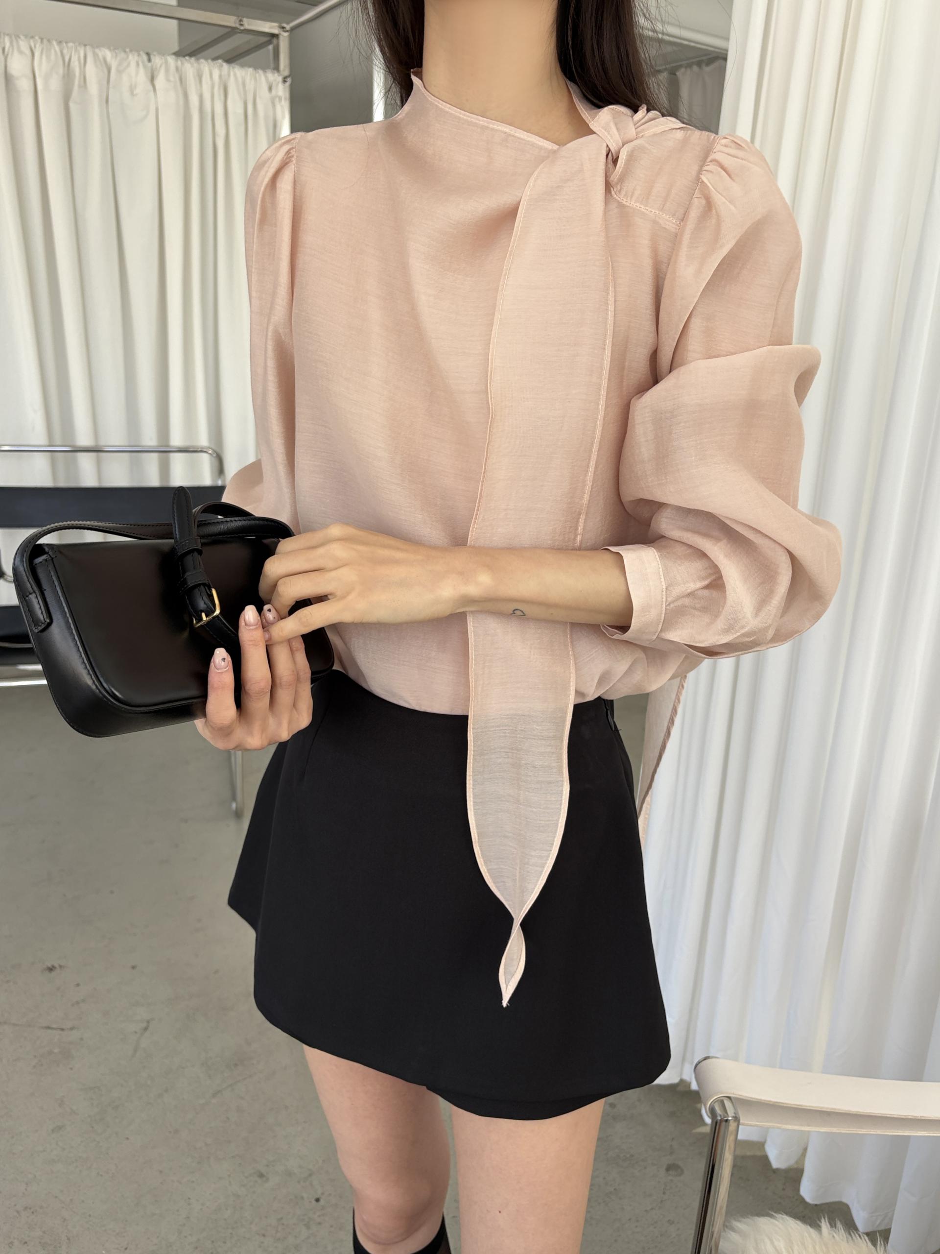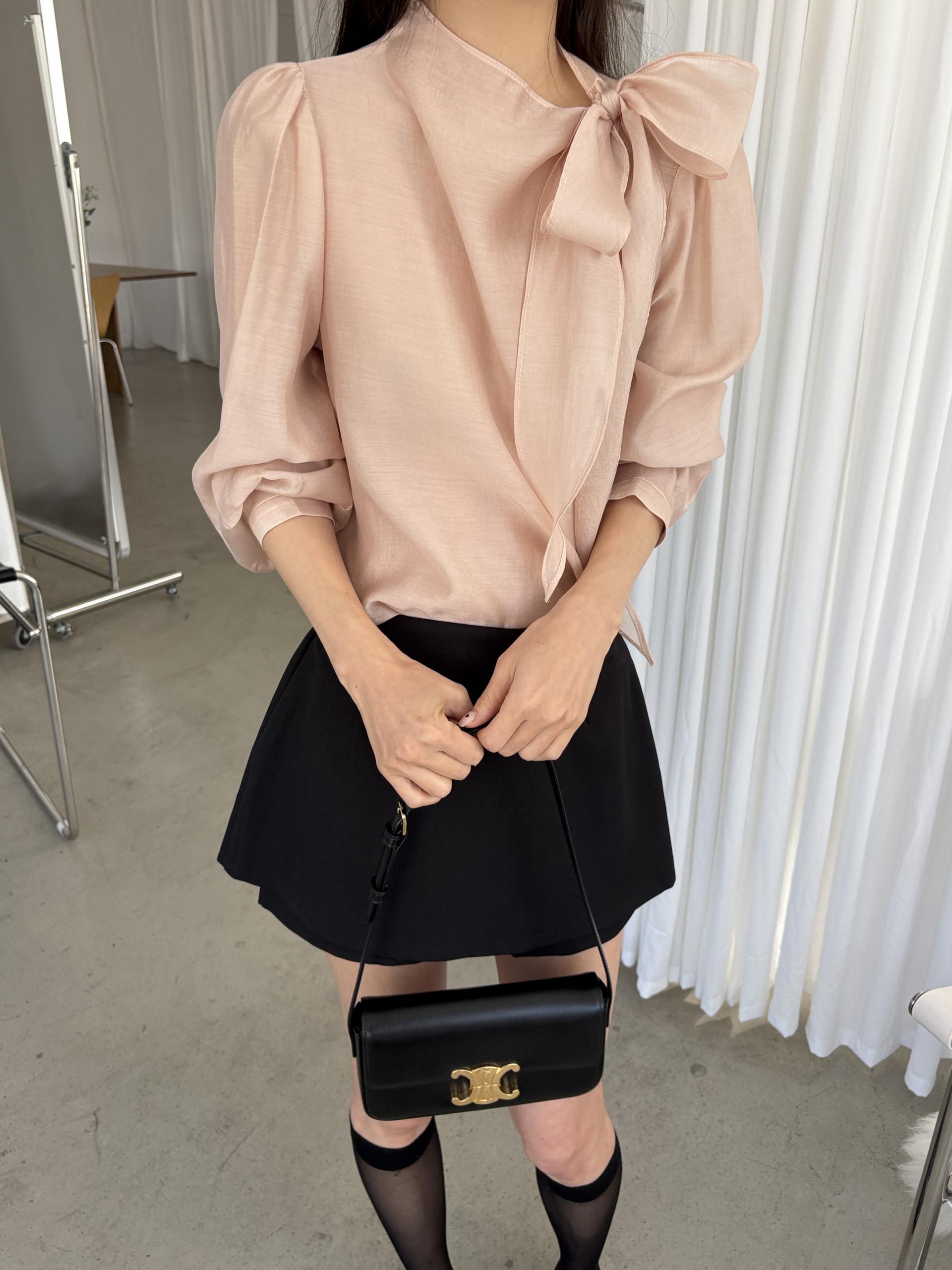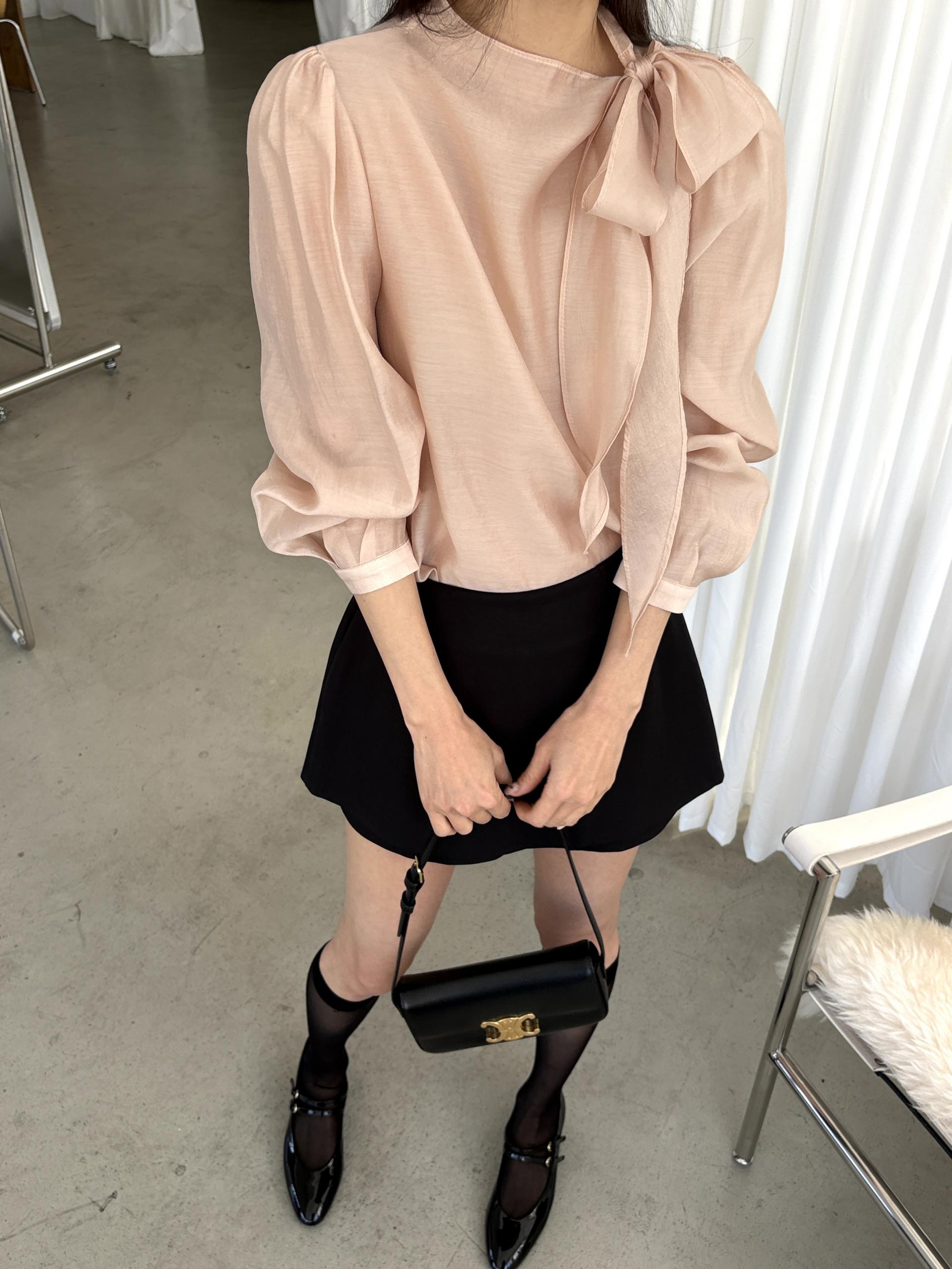 넥 라인을 따라 자연스럽게 연출되는 리본 타이 디테일이 너무 사랑스러운 블라우스에요. 좀 더 차분하게 스타일링하고 싶을 땐 리본을 풀고 그냥 롱 타이 형태로 늘어뜨려도 좋습니다.