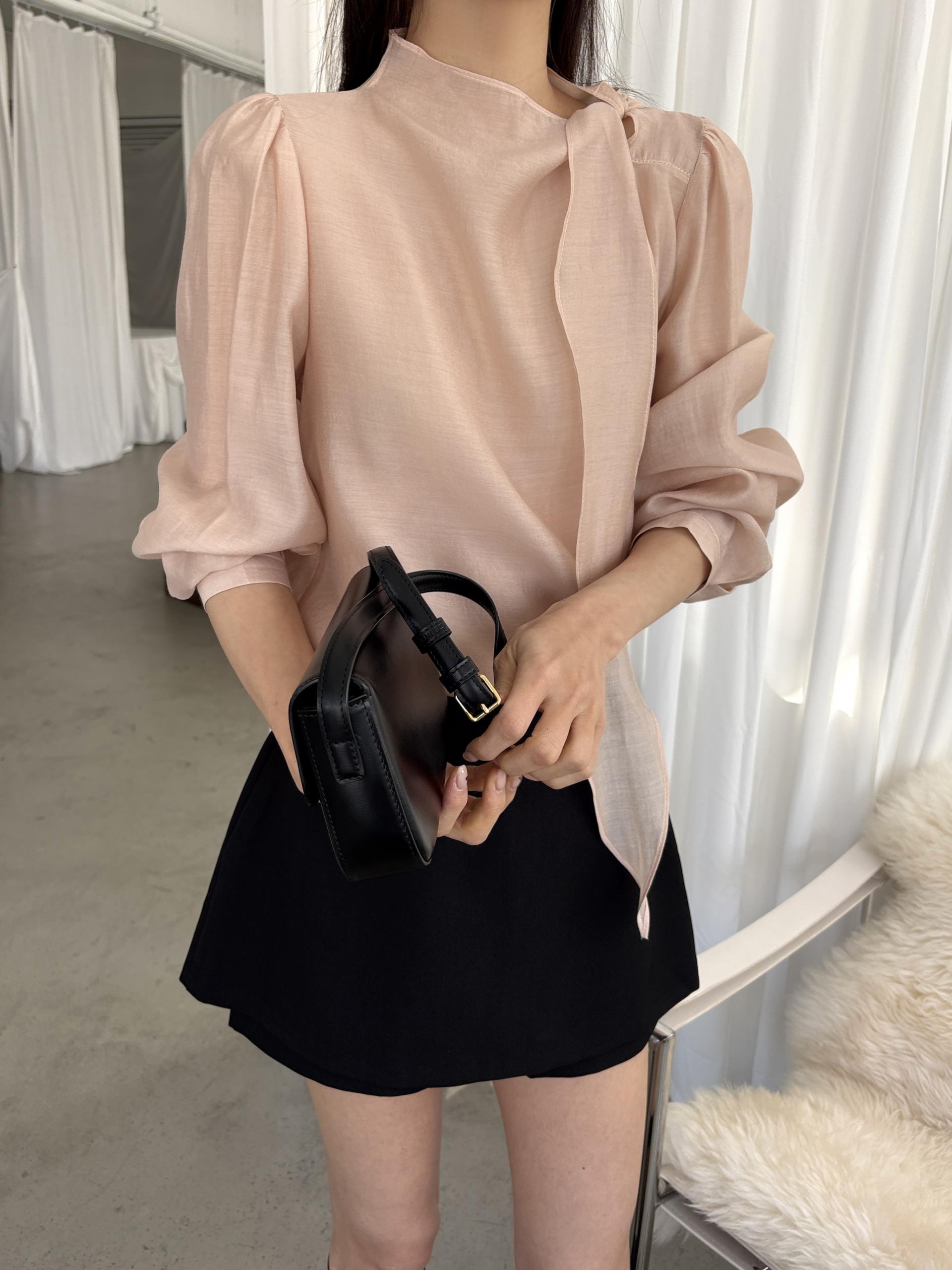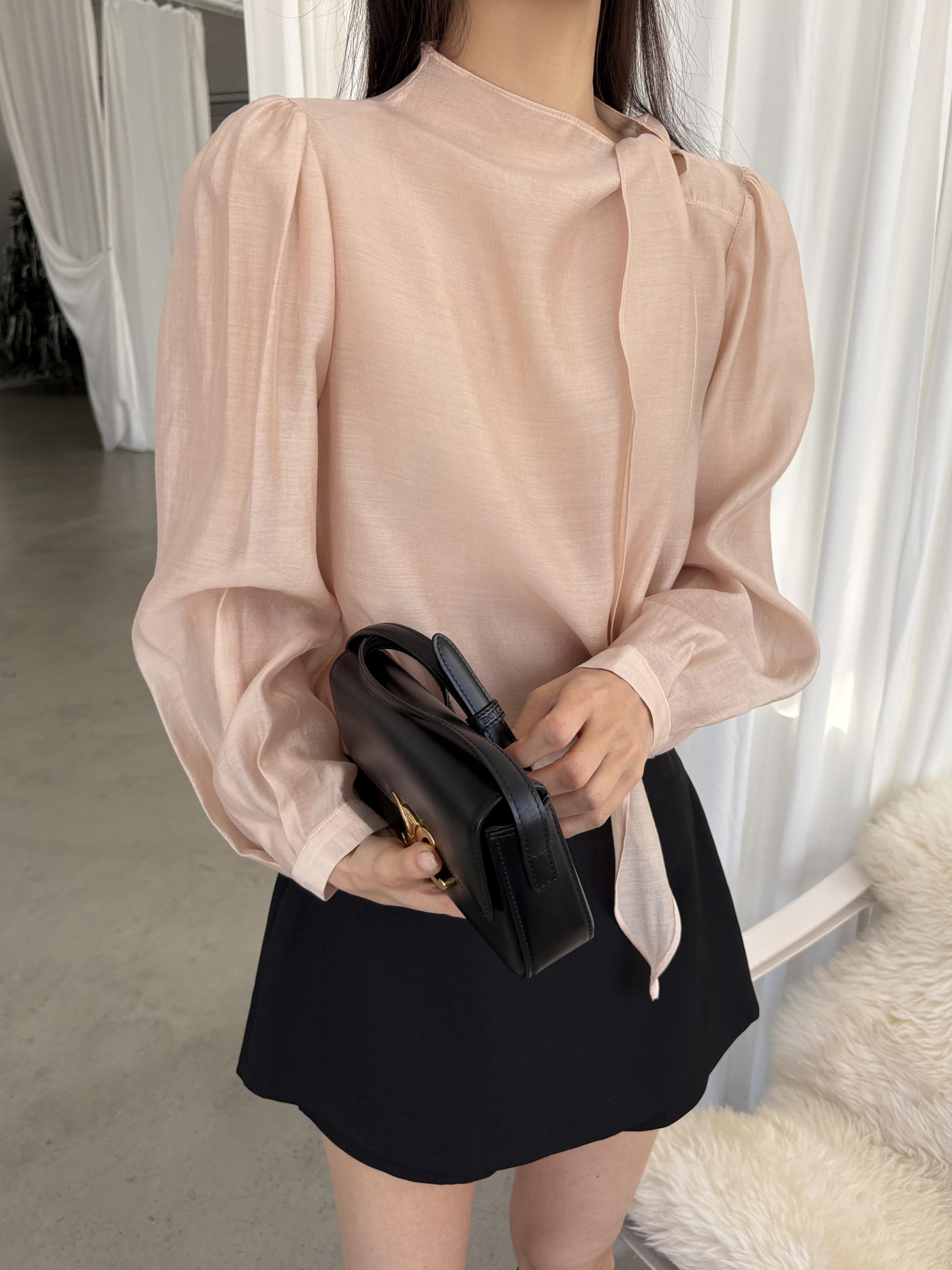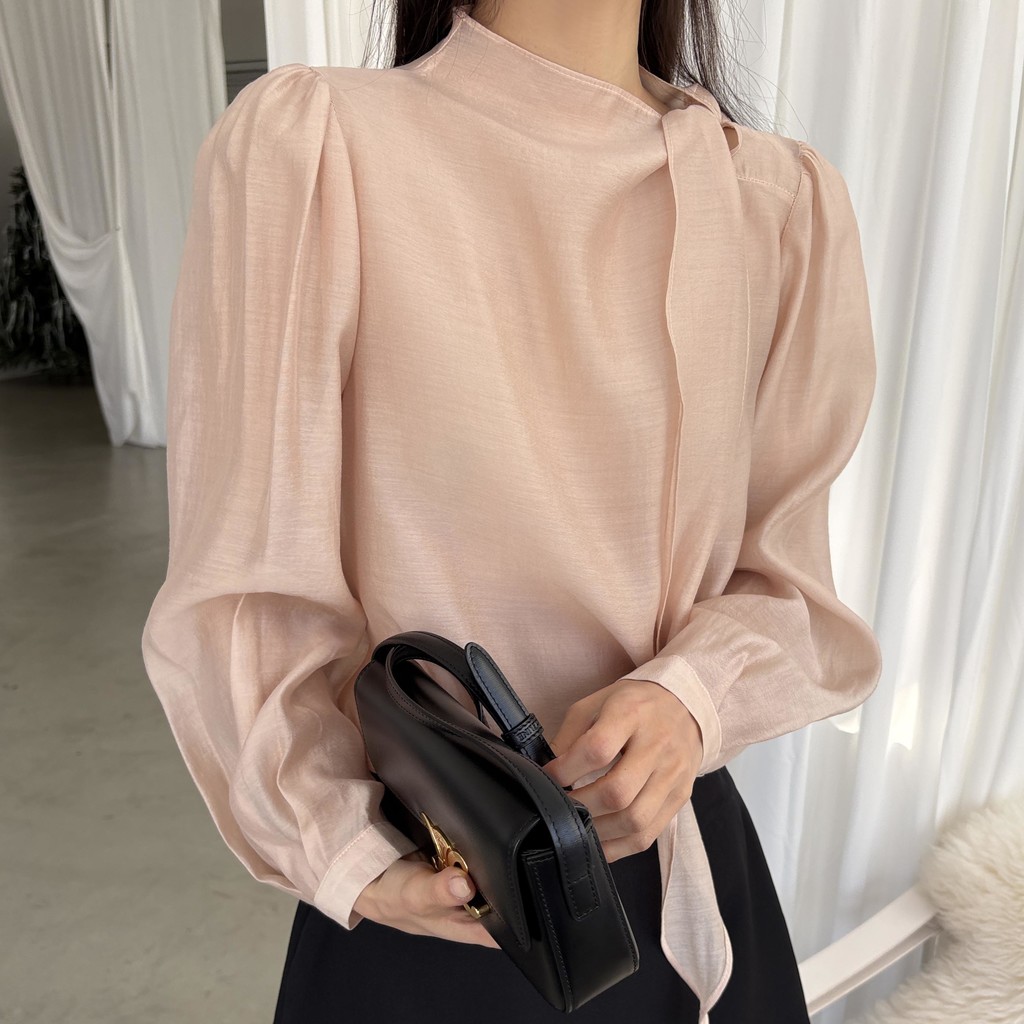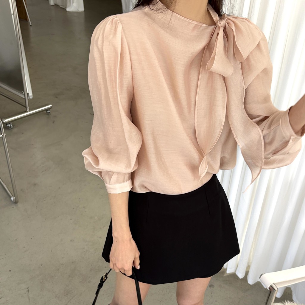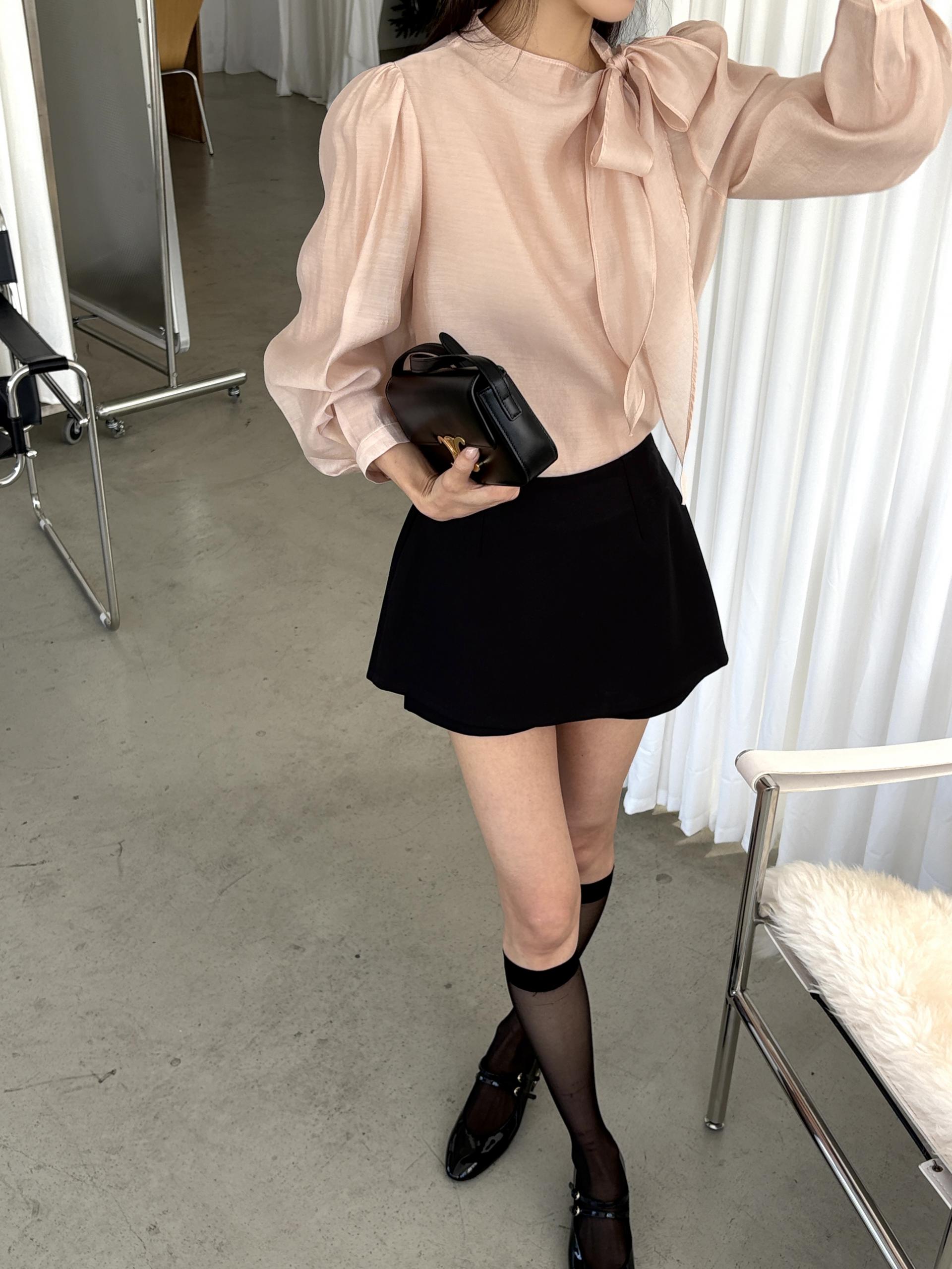 넥 라인을 따라 자연스럽게 연출되는 리본 타이 디테일이 너무 사랑스러운 블라우스에요. 좀 더 차분하게 스타일링하고 싶을 땐 리본을 풀고 그냥 롱 타이 형태로 늘어뜨려도 좋습니다.