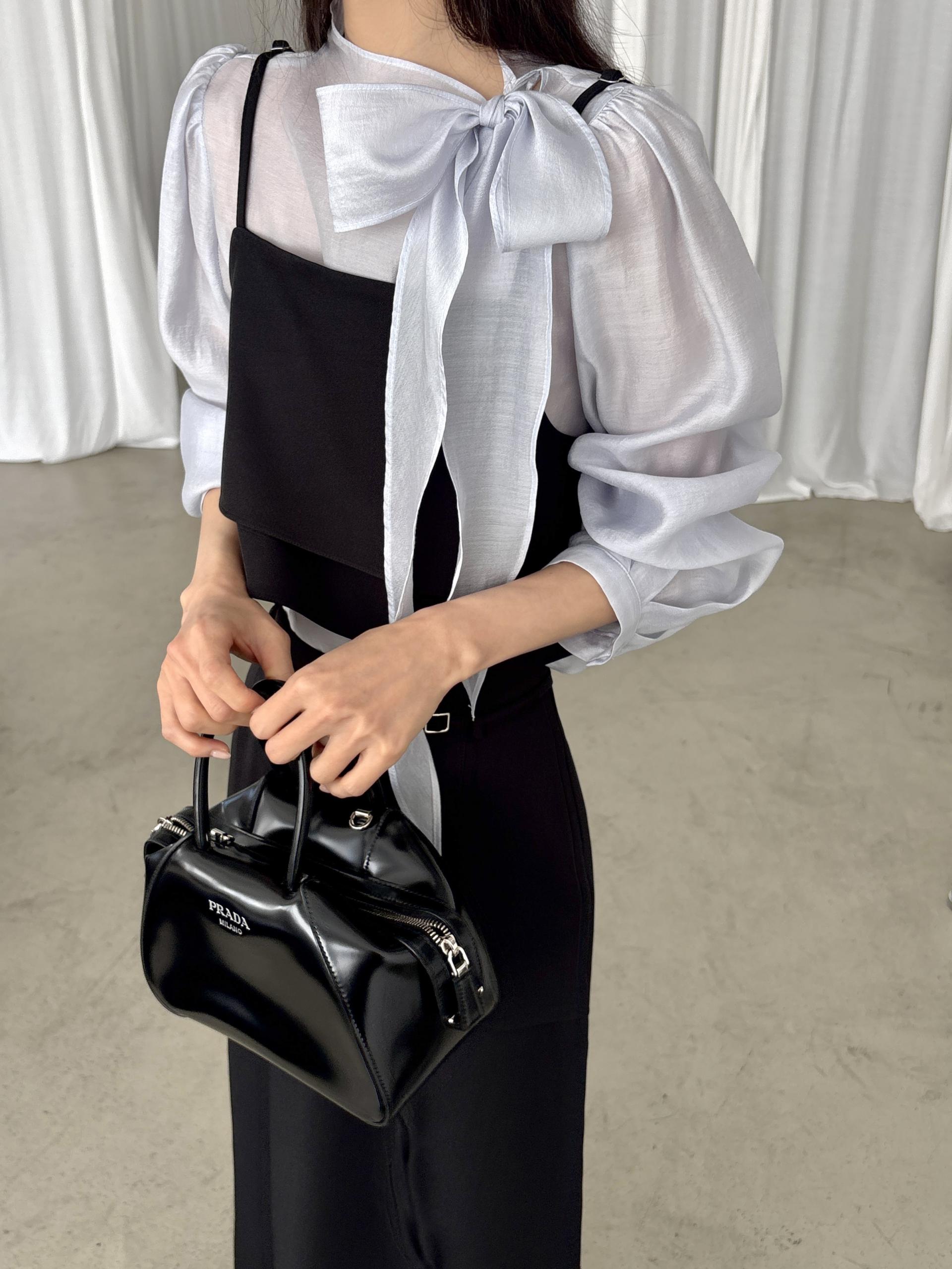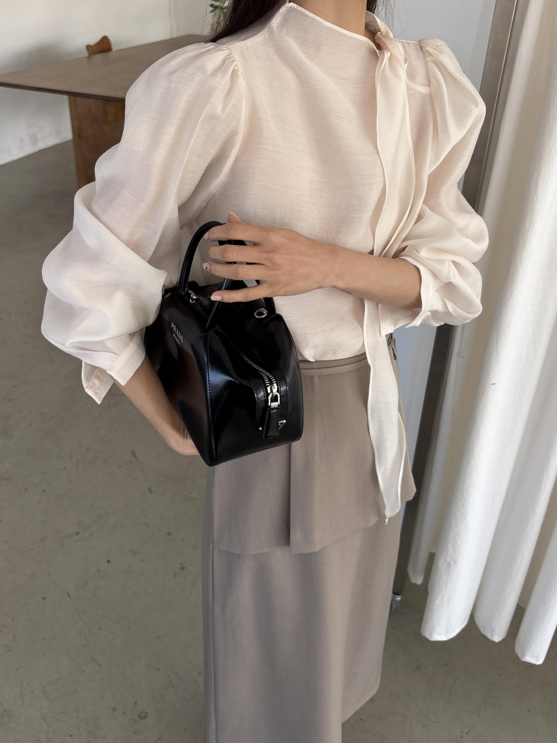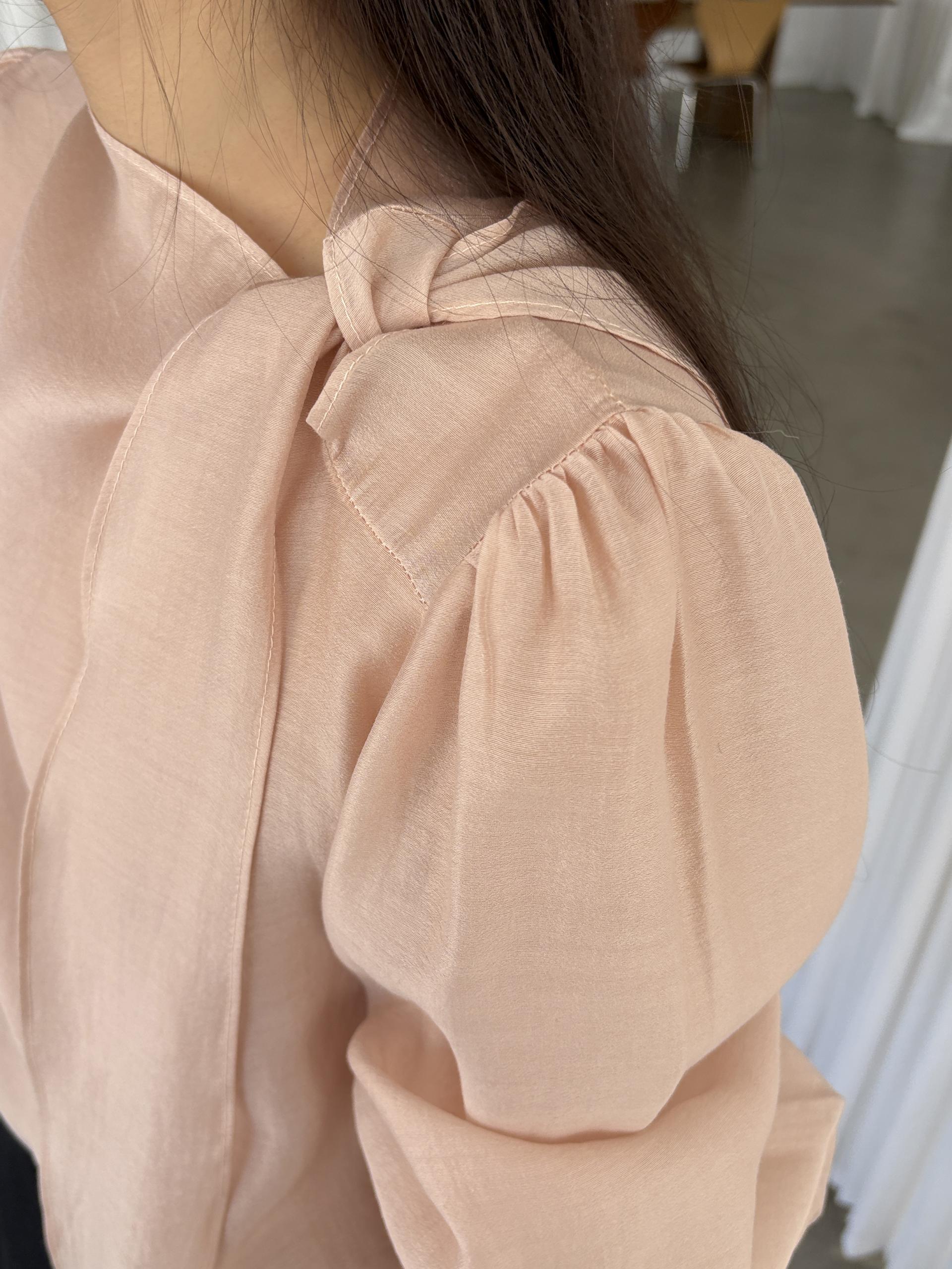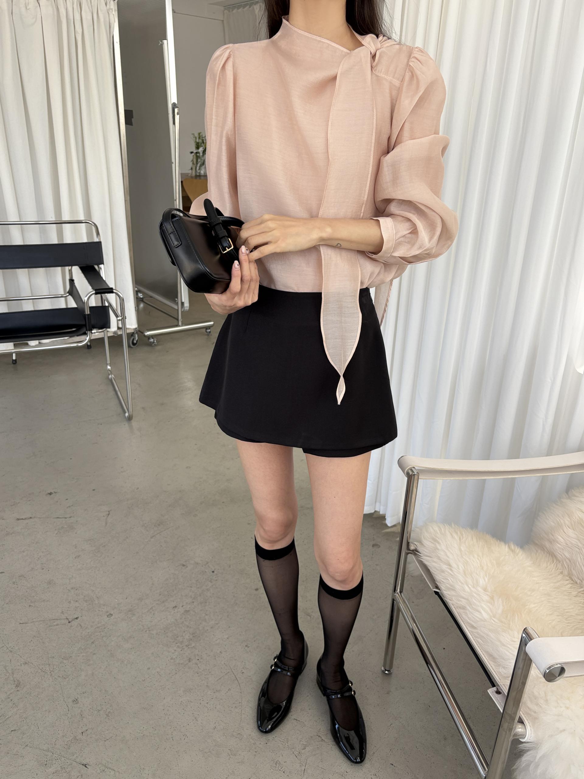 넥 라인을 따라 자연스럽게 연출되는 리본 타이 디테일이 너무 사랑스러운 블라우스에요. 좀 더 차분하게 스타일링하고 싶을 땐 리본을 풀고 그냥 롱 타이 형태로 늘어뜨려도 좋습니다.