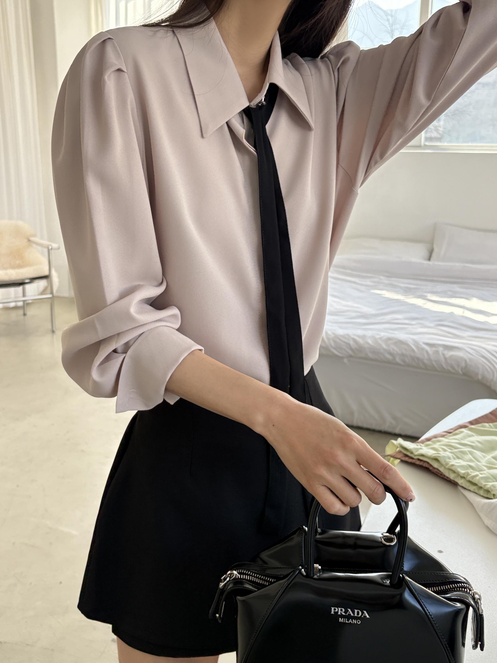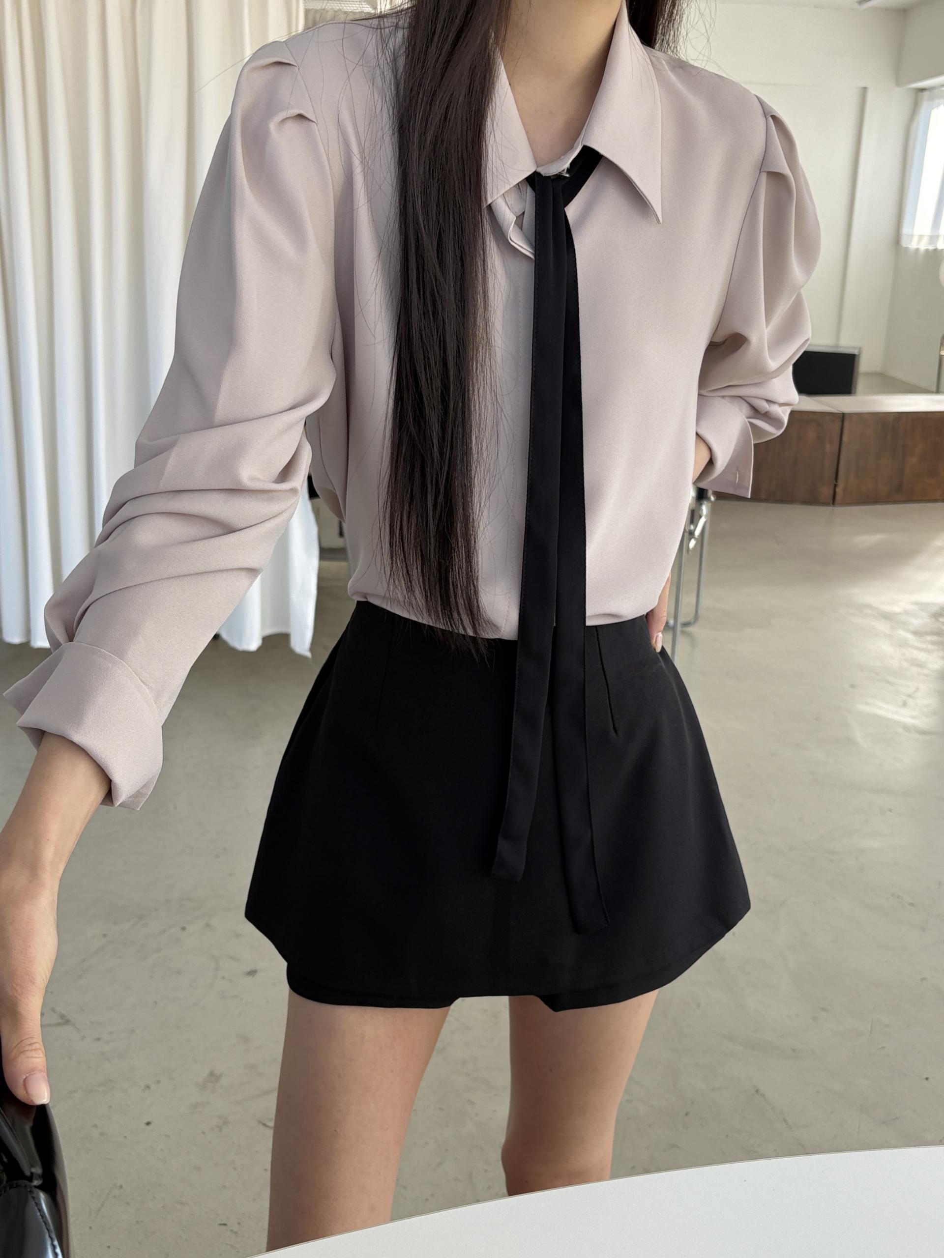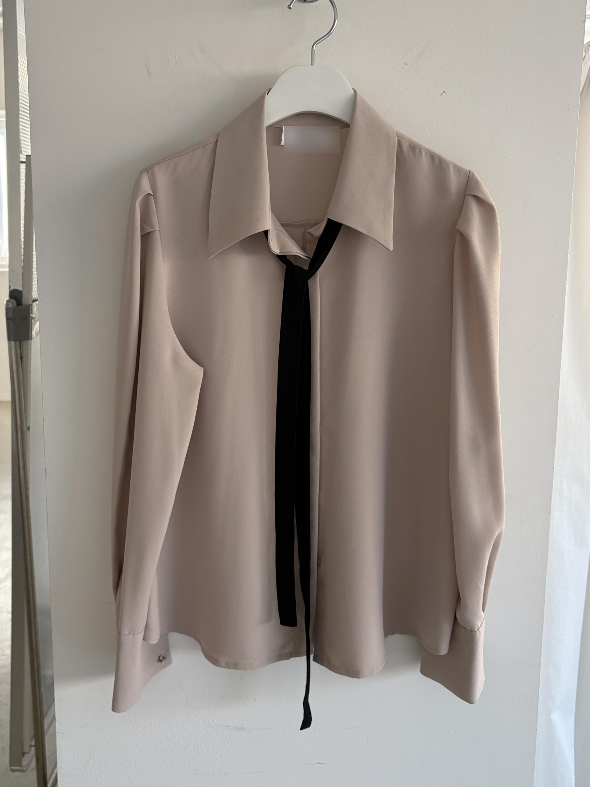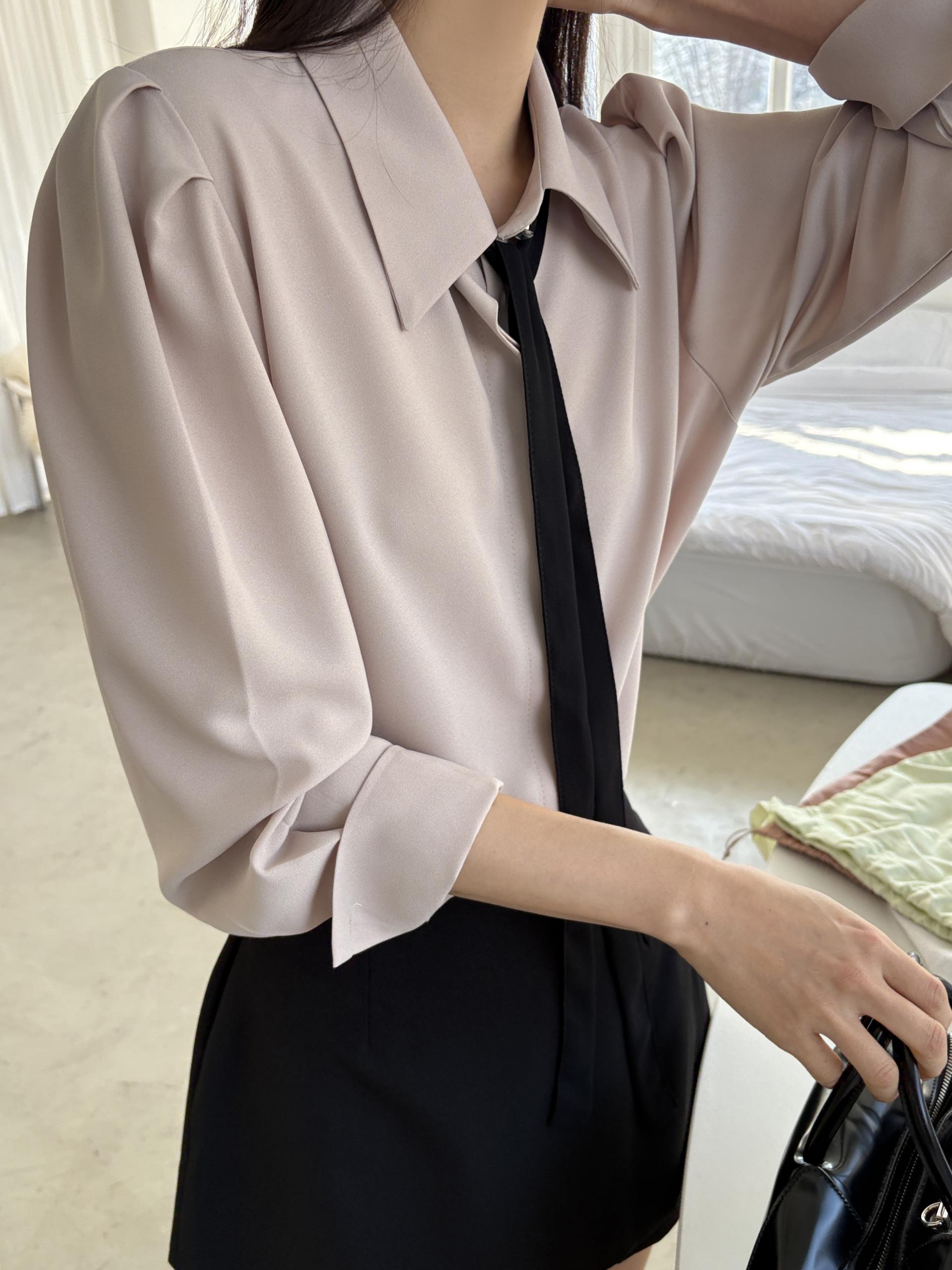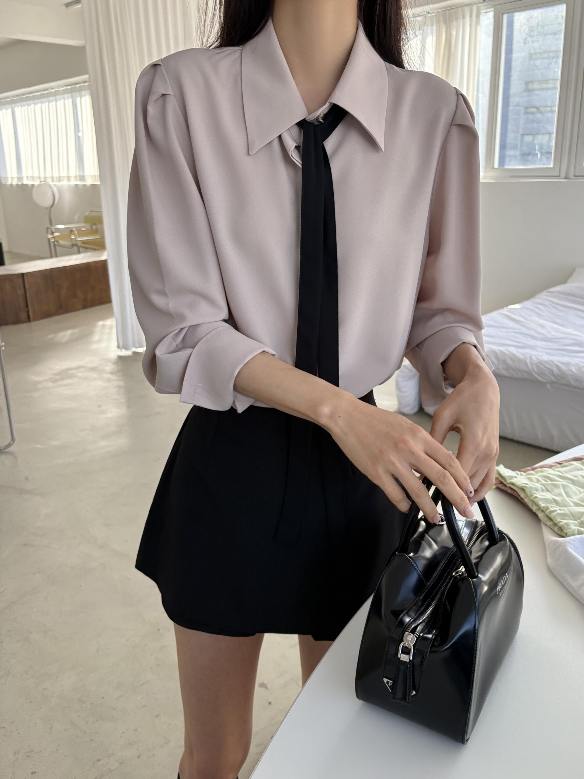클래식한 셔츠 카라에 슬림한 타이 디테일을 더해 단정하면서 세련된 무드의 셔츠 블라우스입니다.