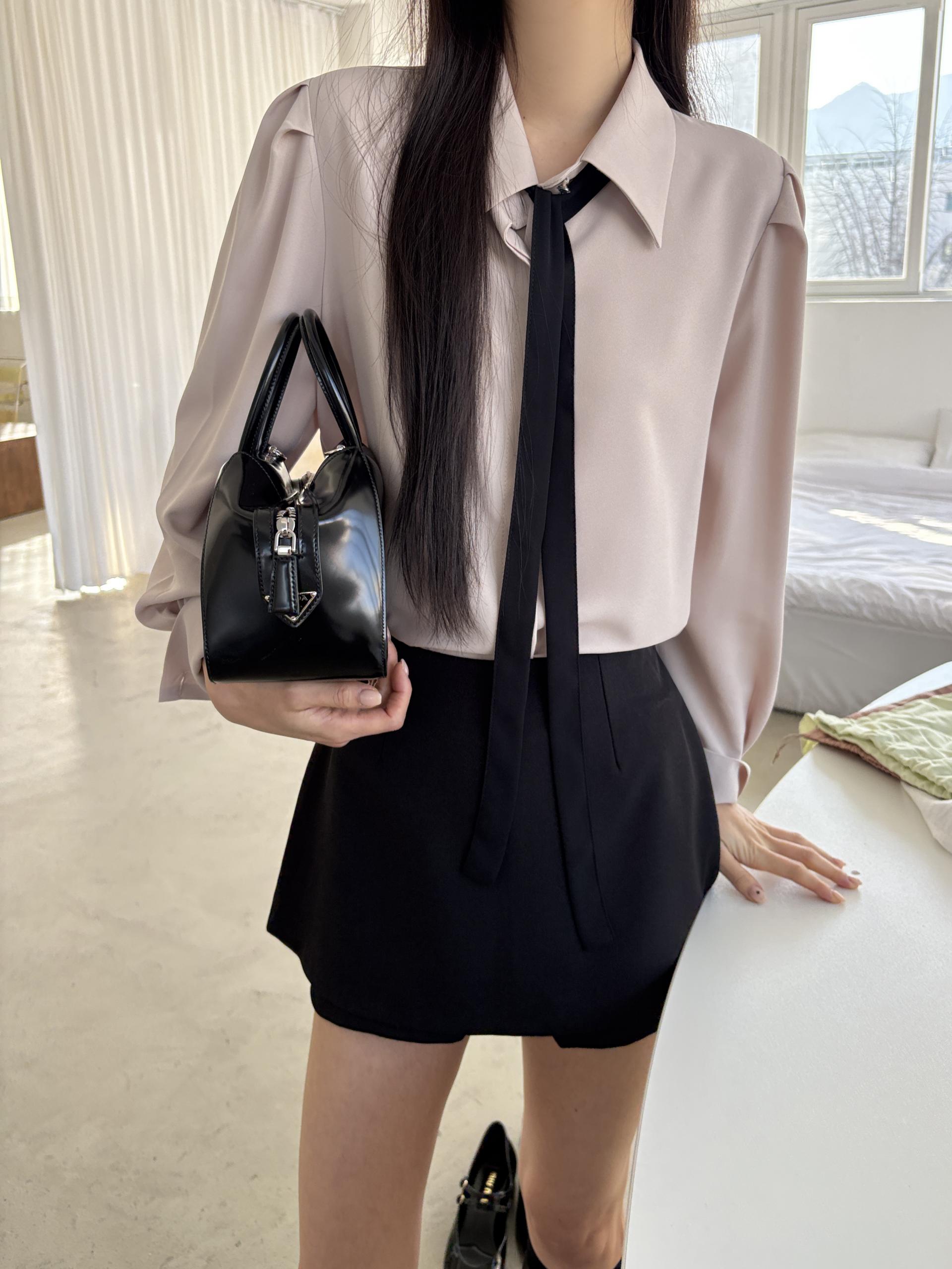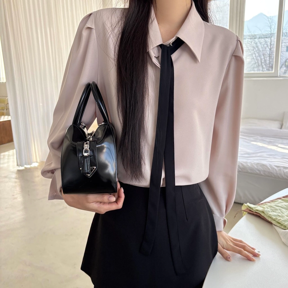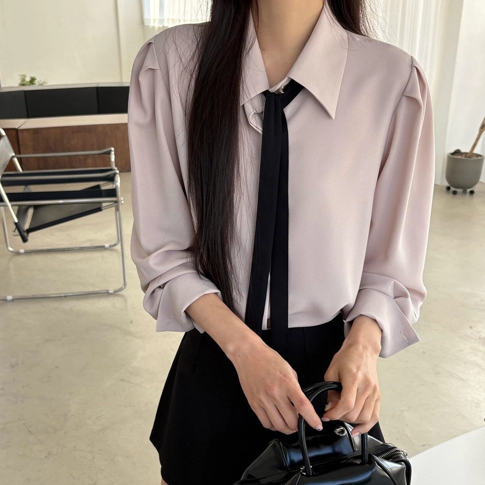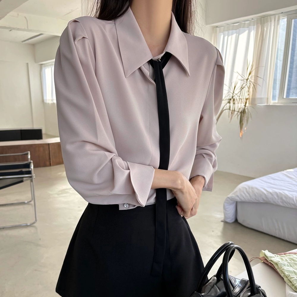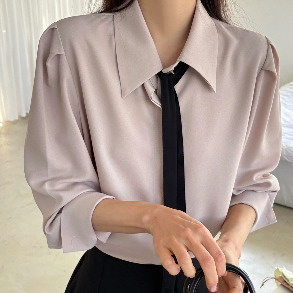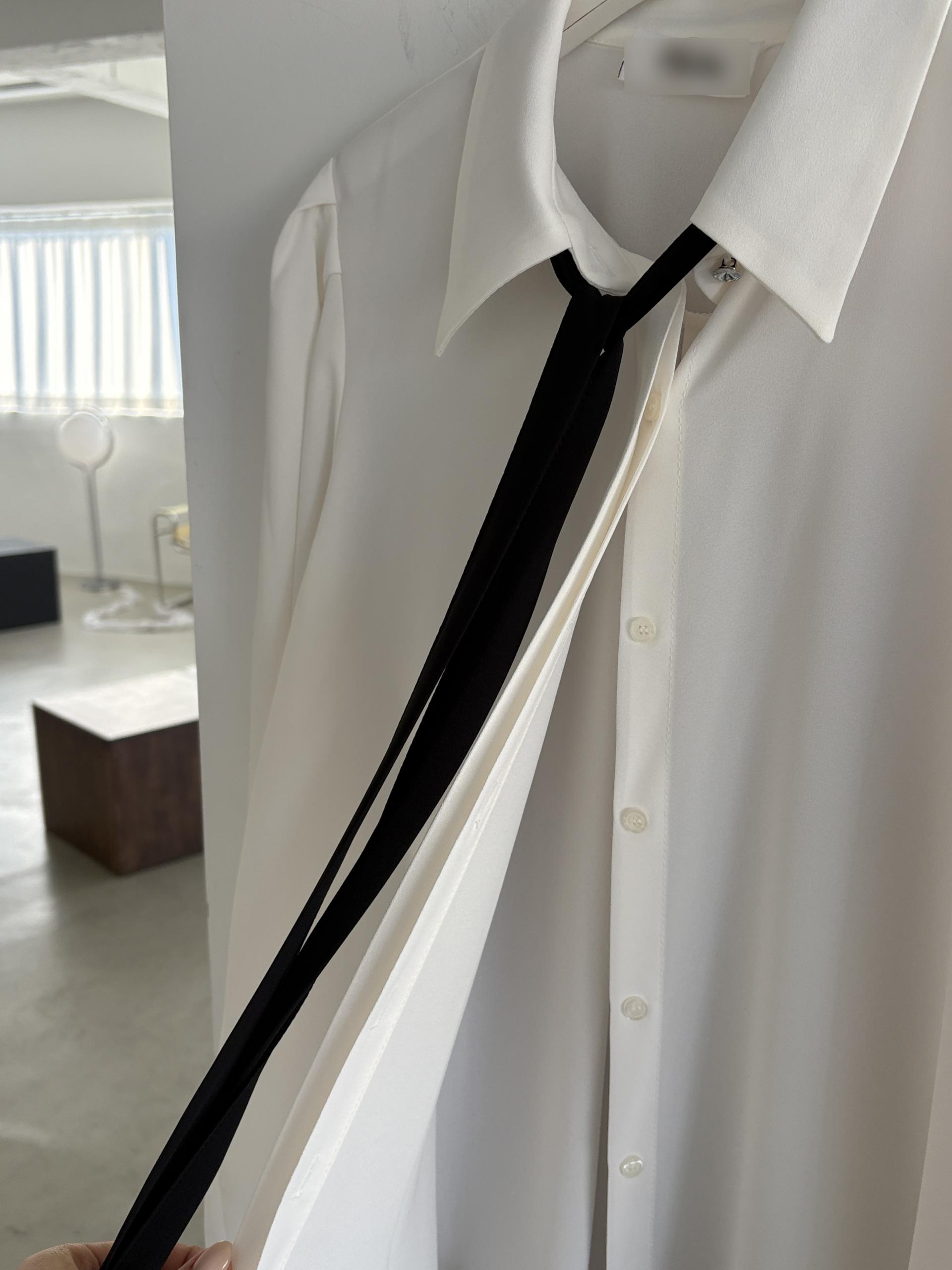 클래식한 셔츠 카라에 슬림한 타이 디테일을 더해 단정하면서 세련된 무드의 셔츠 블라우스입니다.