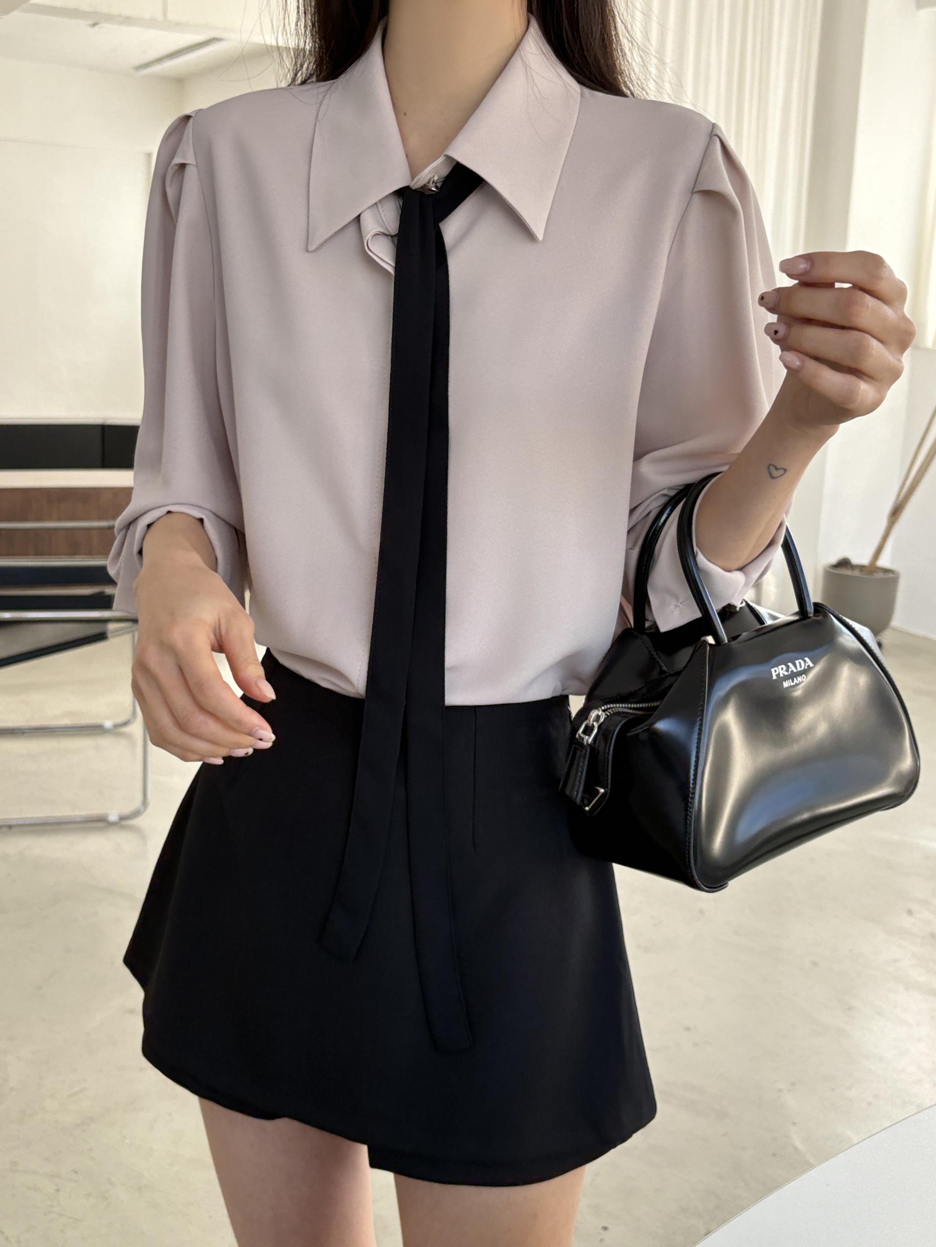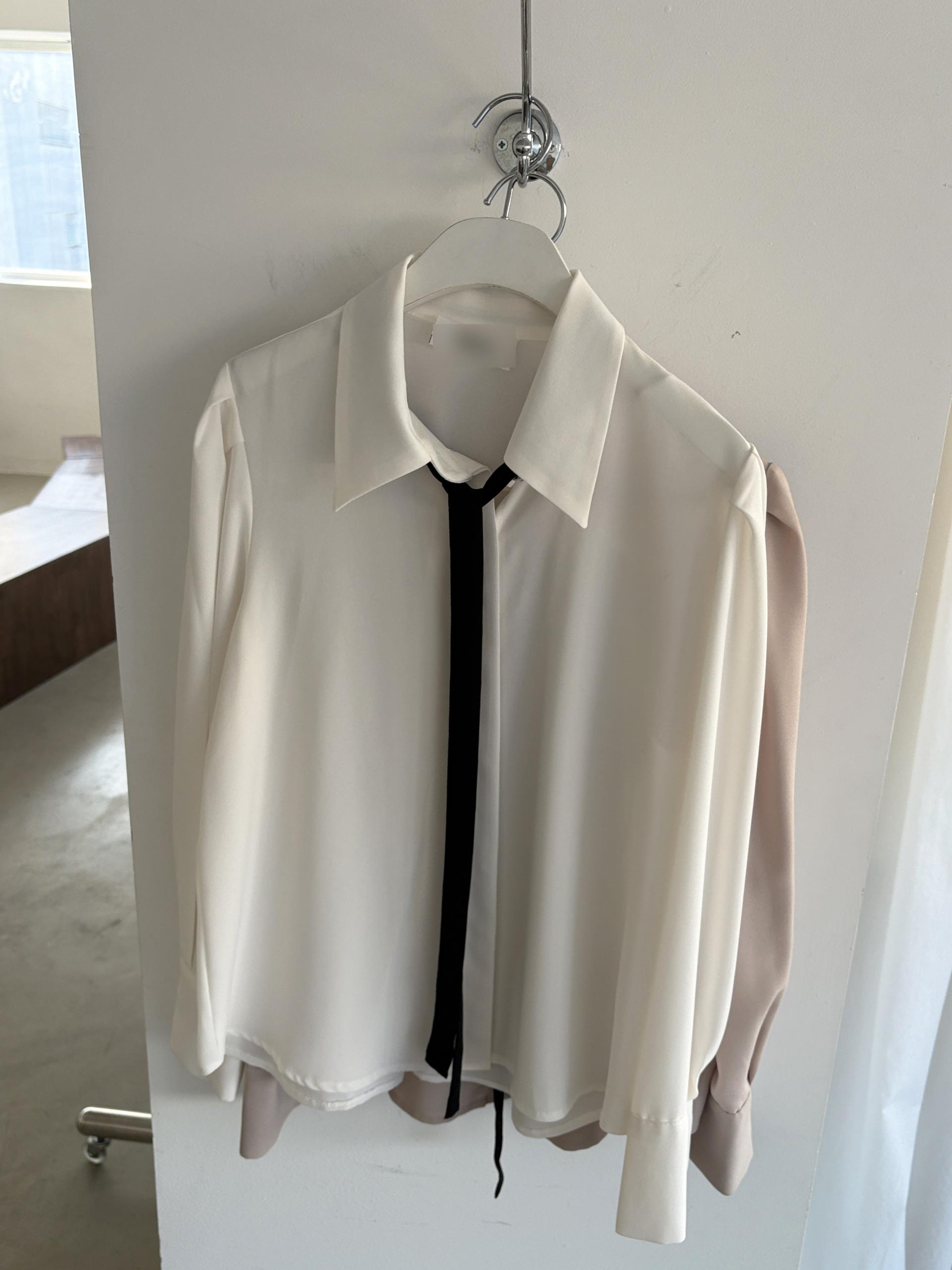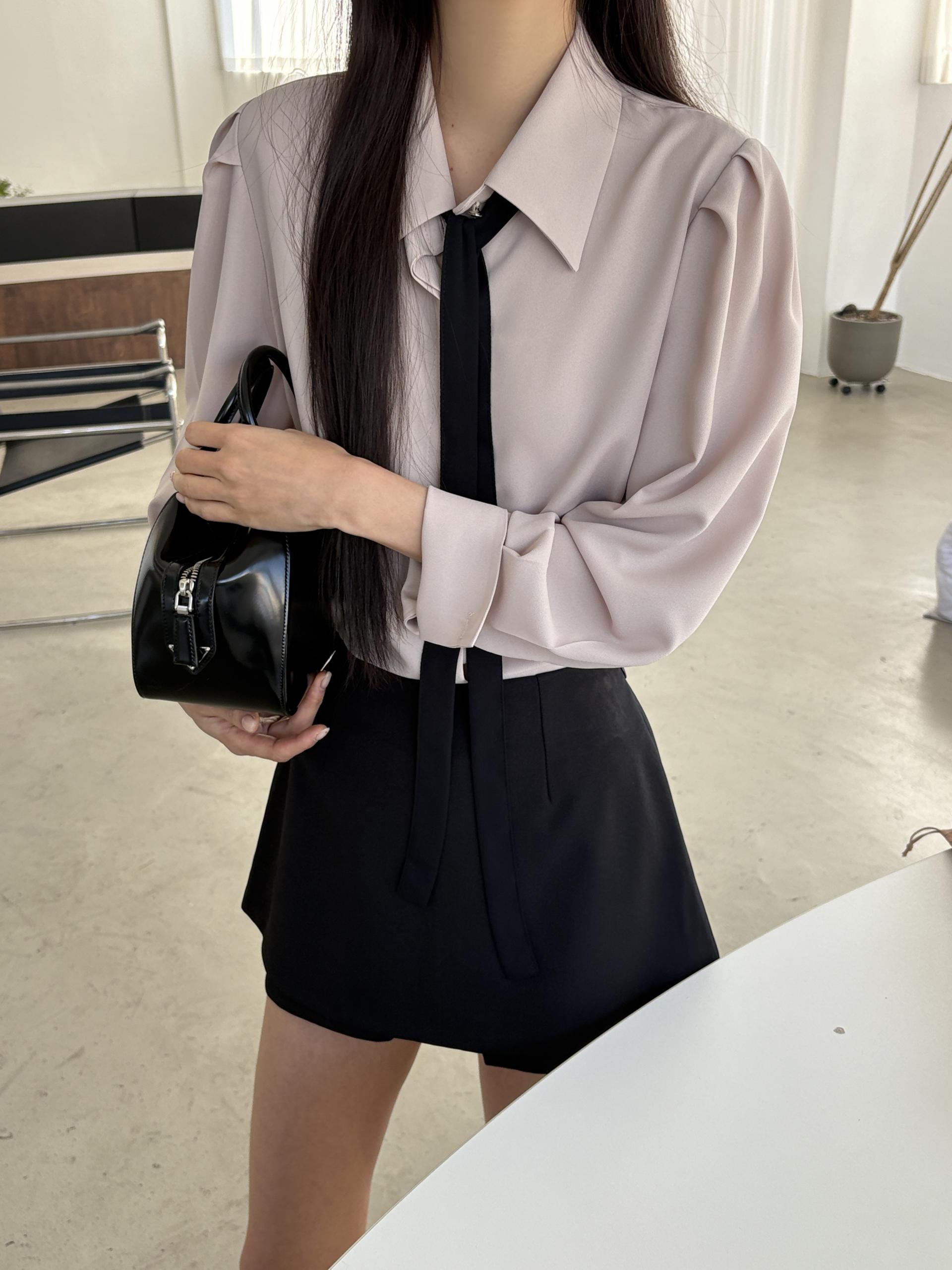 배색이 돋보이는 블랙 타이는 탈부착이 가능해 무지 블라우스로도 착용할 수 있어 좋았어요.
