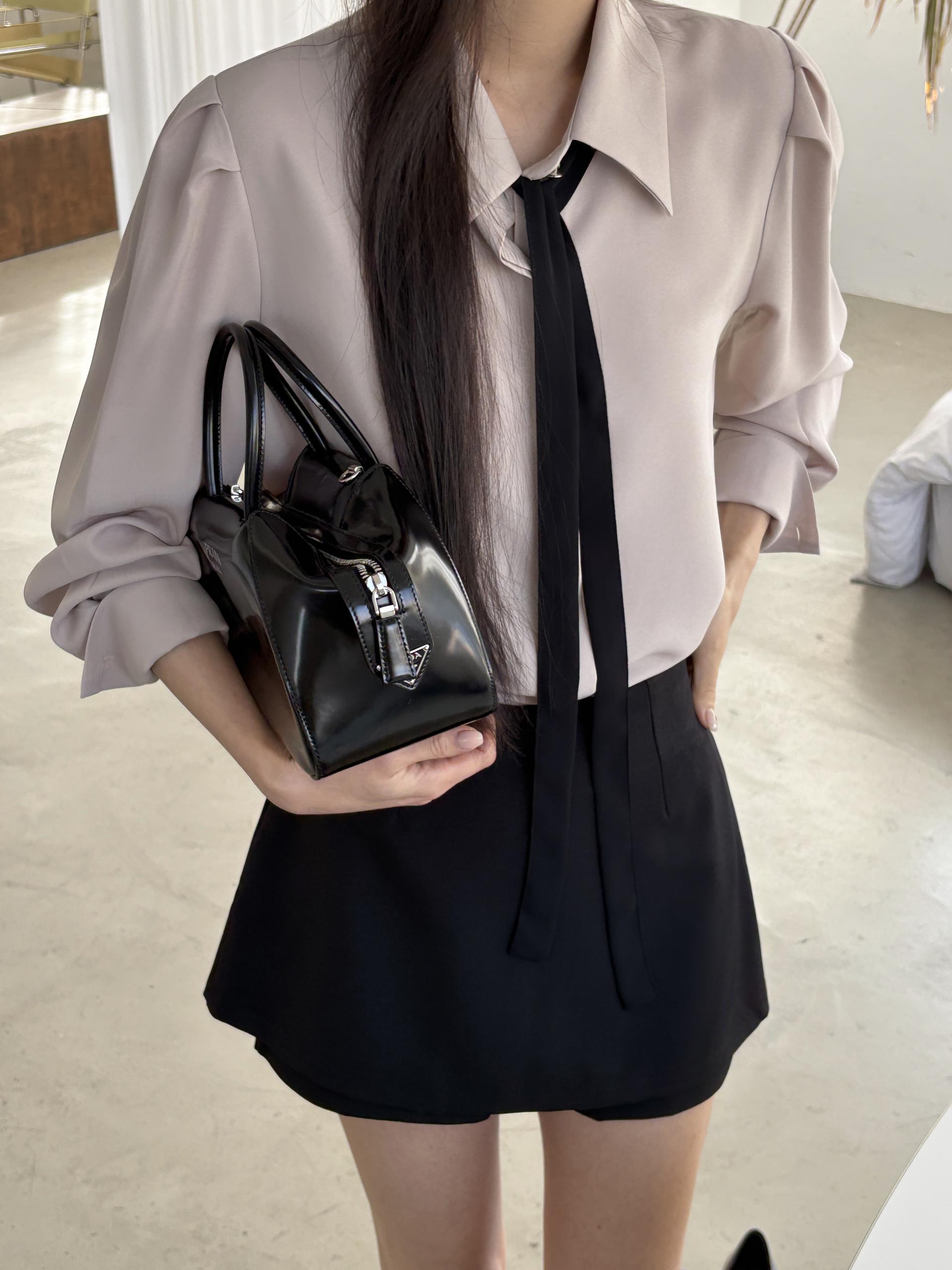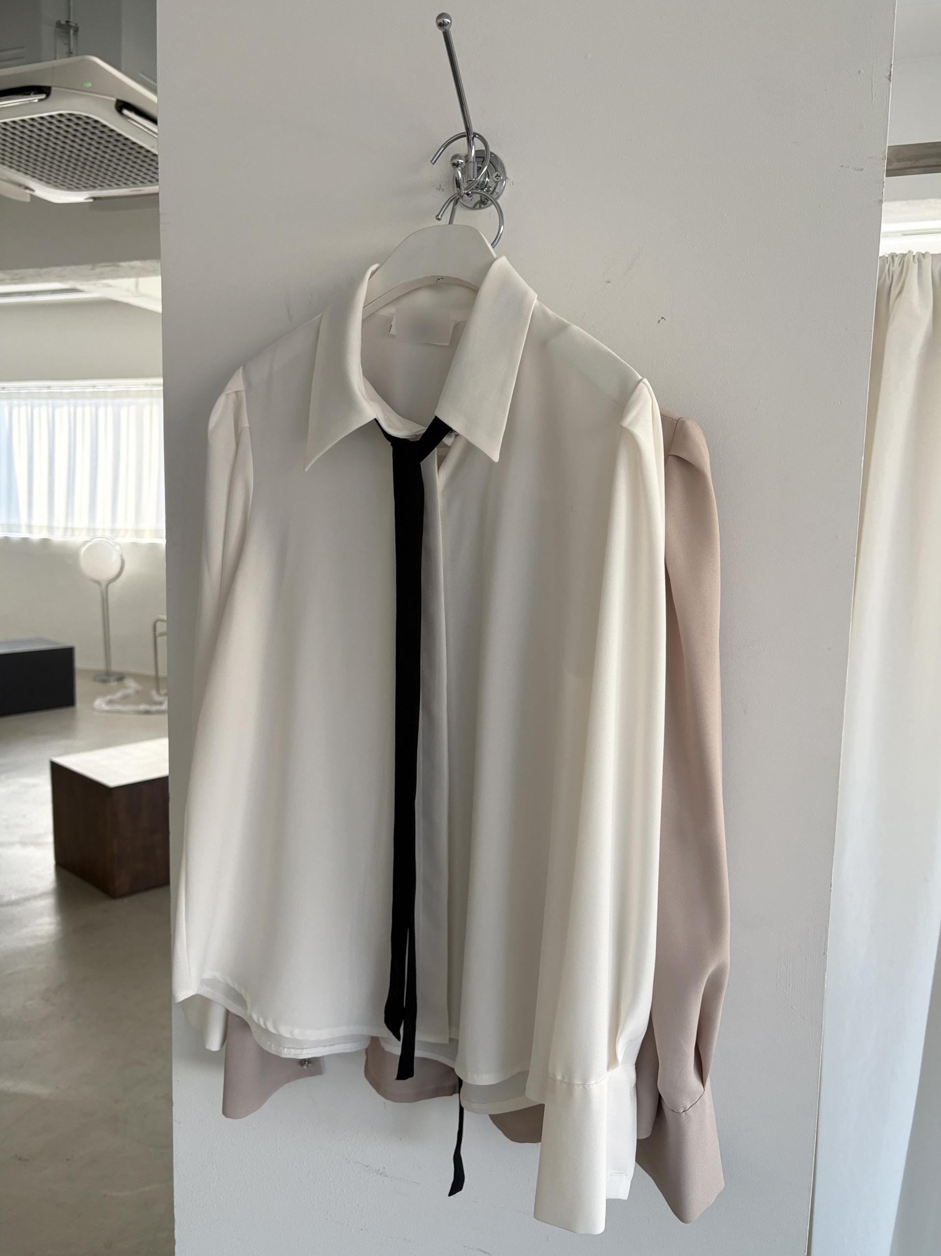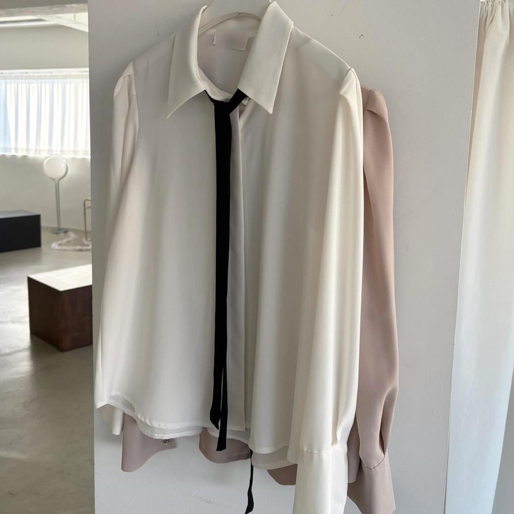 배색이 돋보이는 블랙 타이는 탈부착이 가능해 무지 블라우스로도 착용할 수 있어 좋았어요.