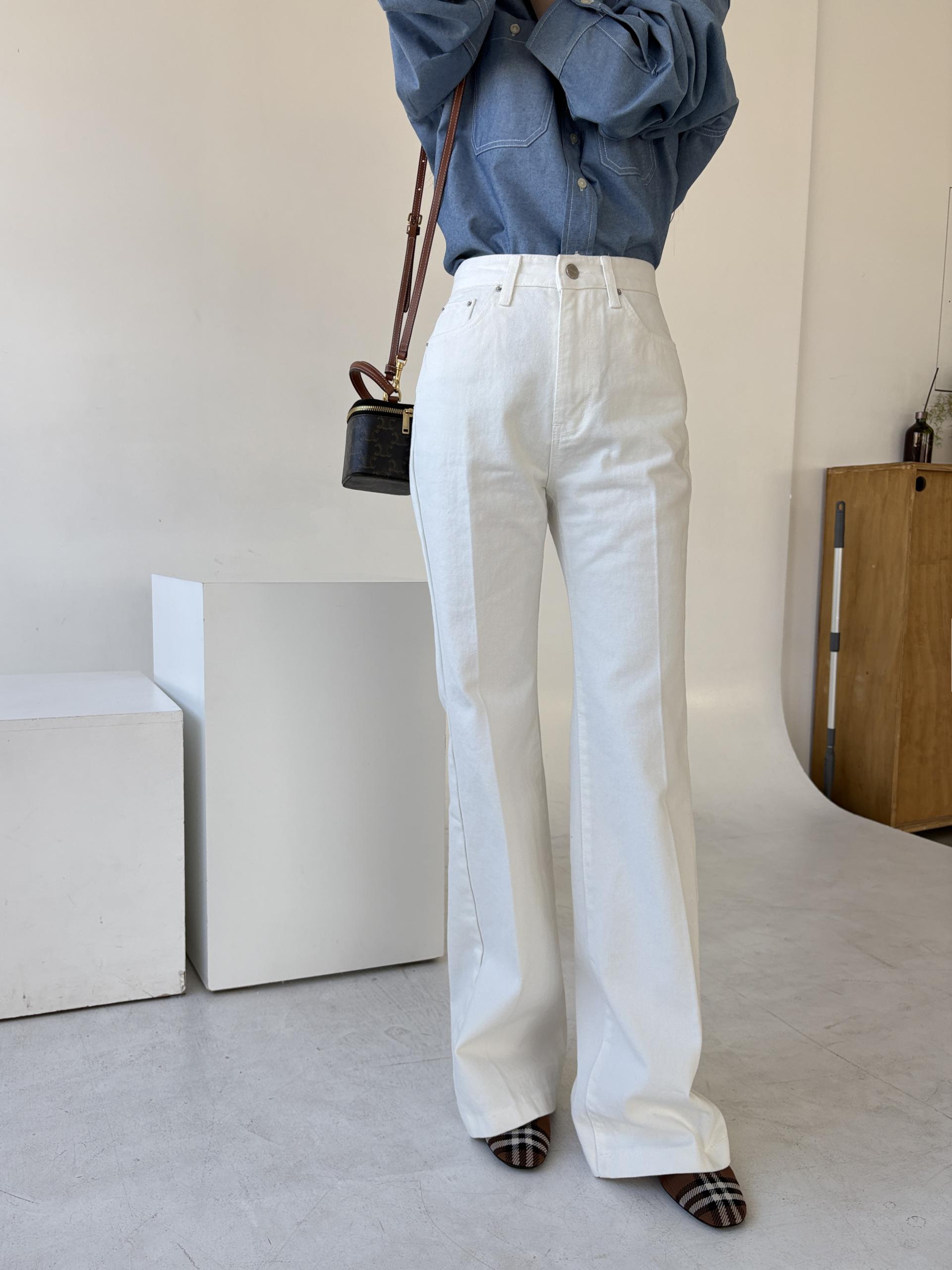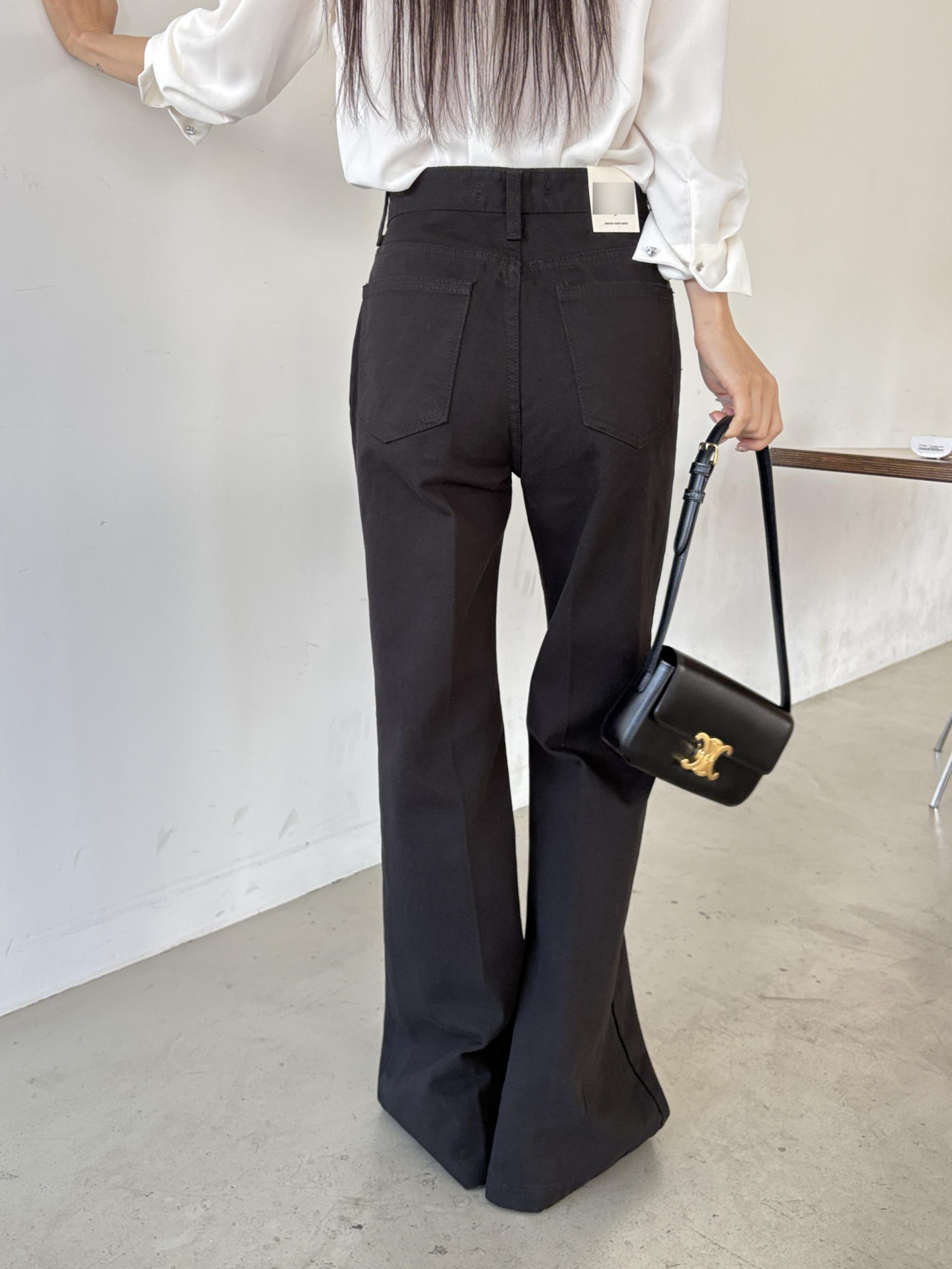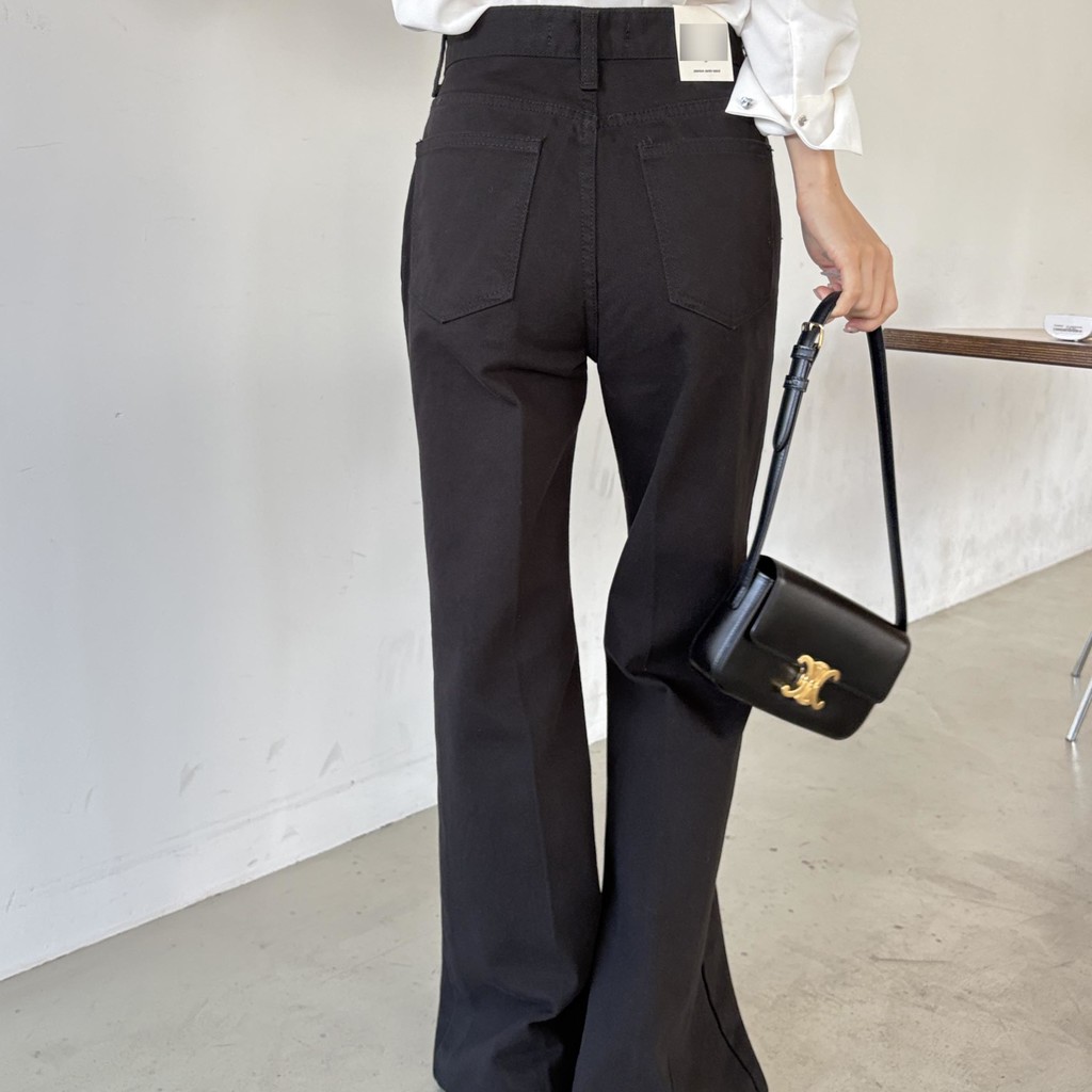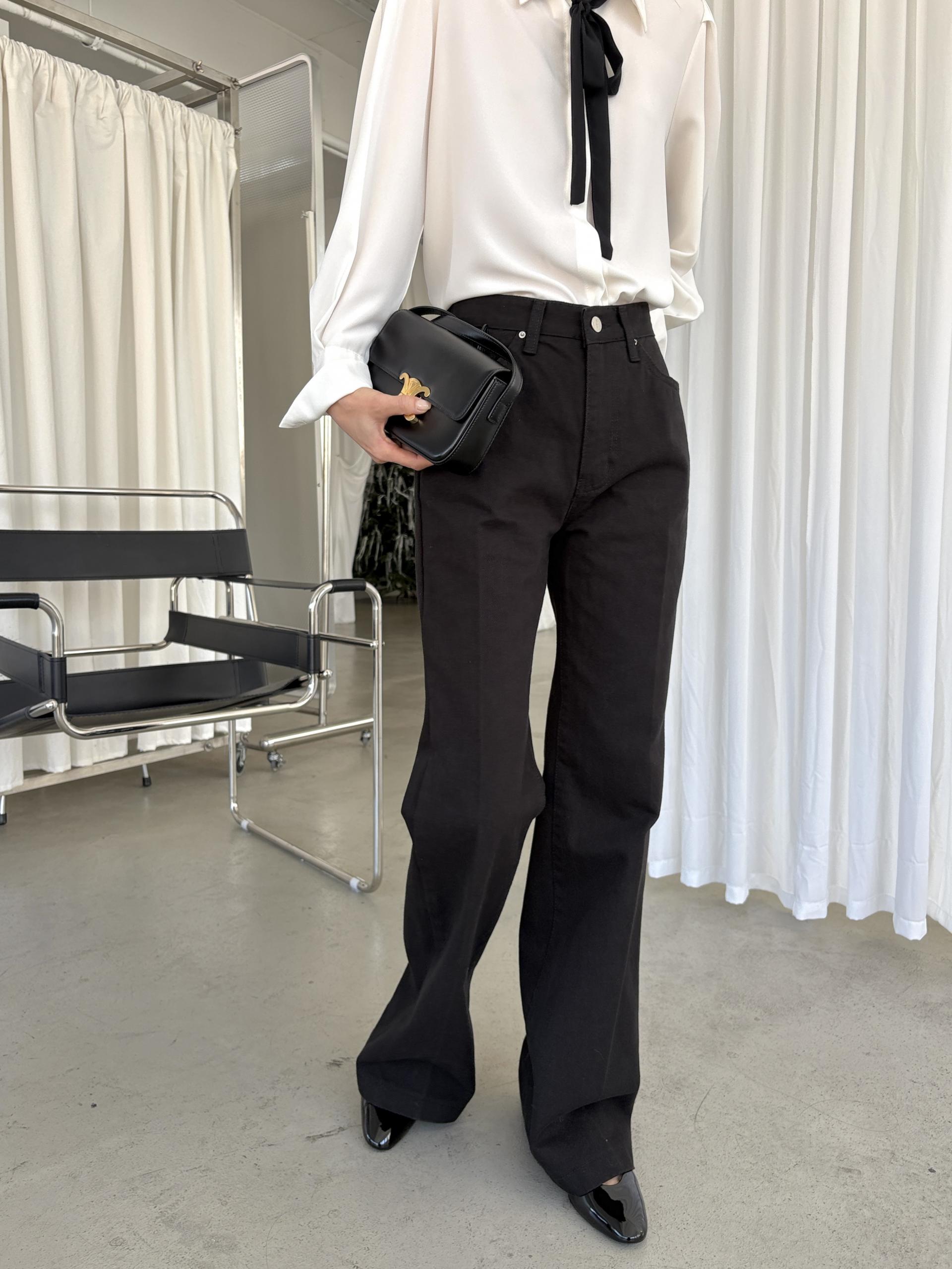 하이웨스트 밑위로 허리를 안정감 있게 잡아주고, 스트레이트와 부츠컷의 중간 정도로 자연스럽게 떨어지는 세미 부츠컷 실루엣이라 손이 더 많이 가는 팬츠입니다.