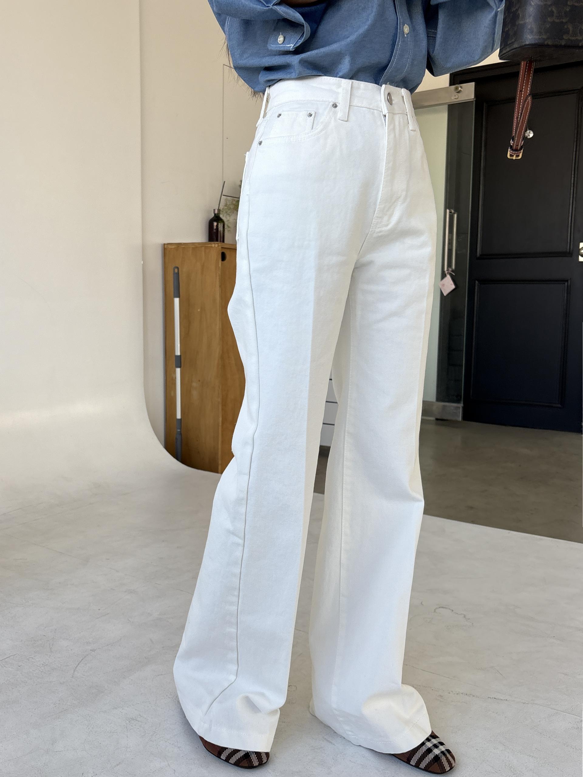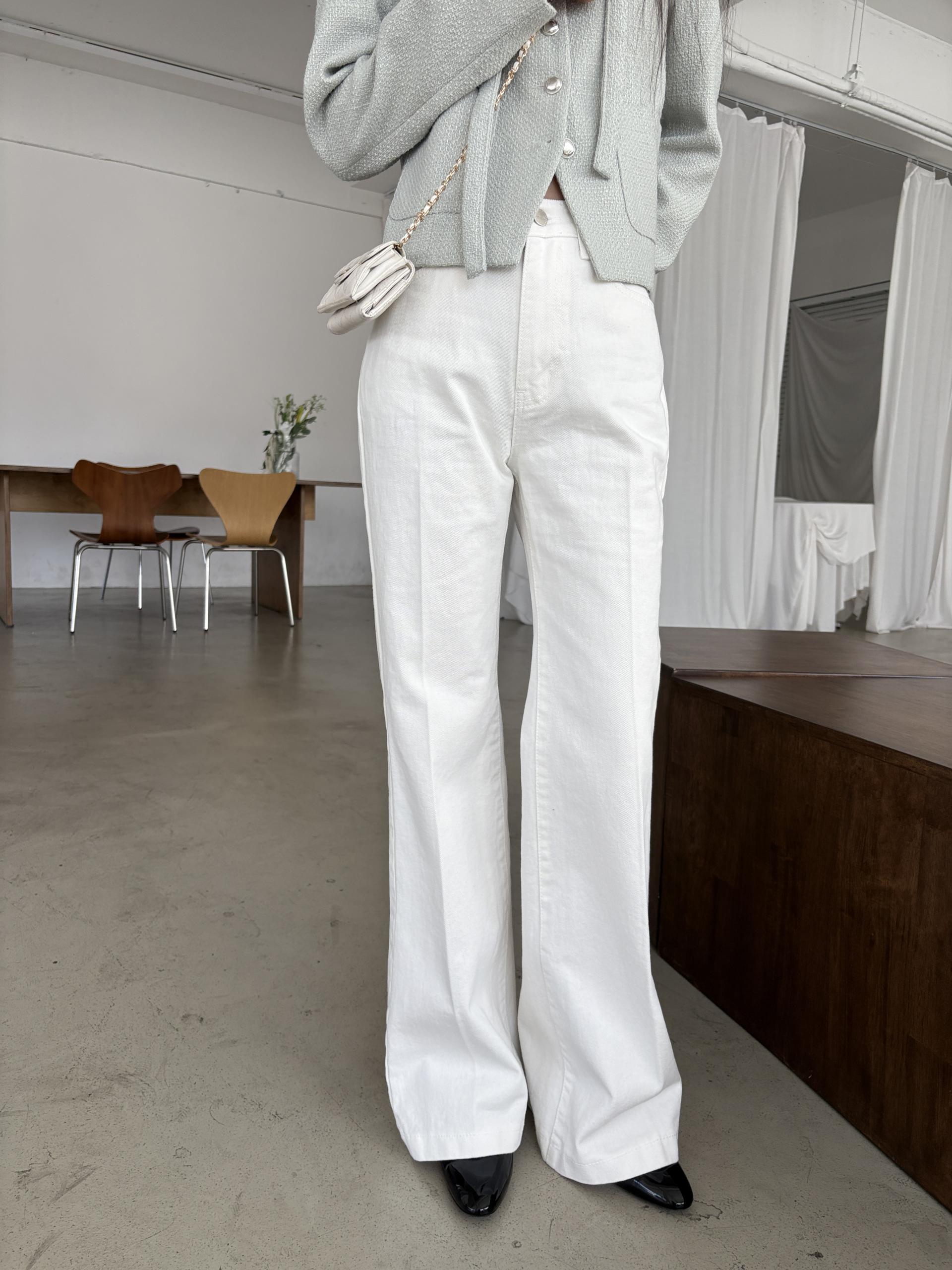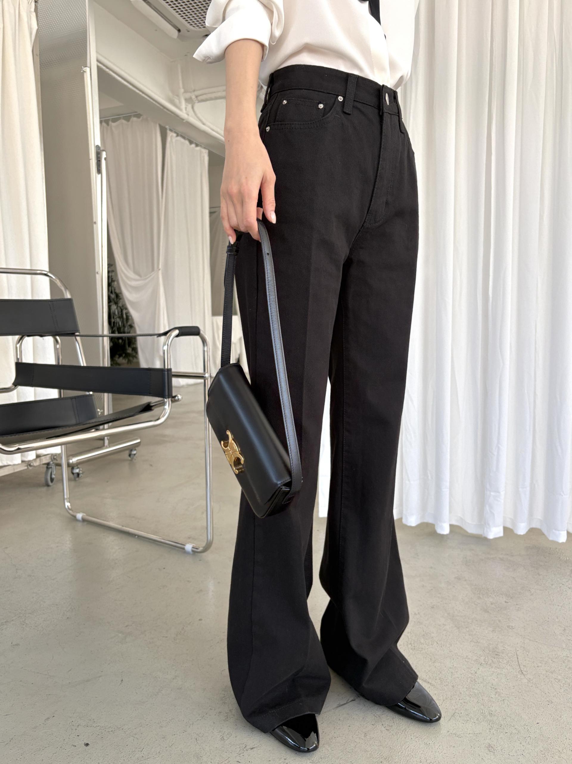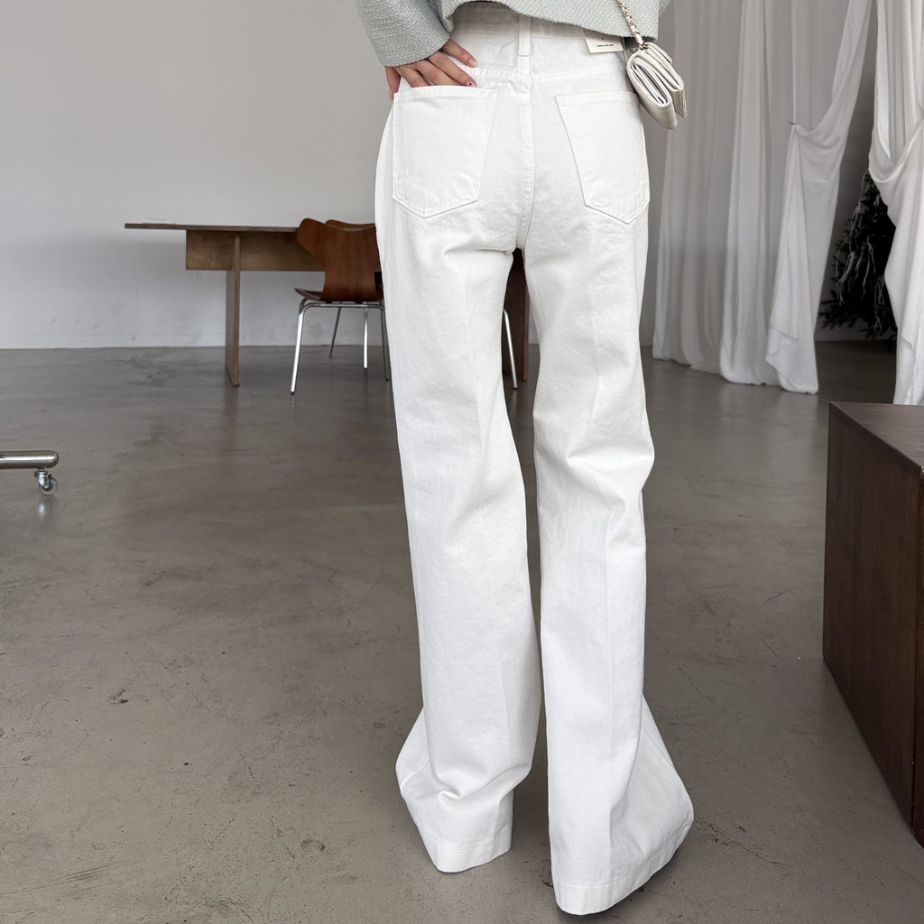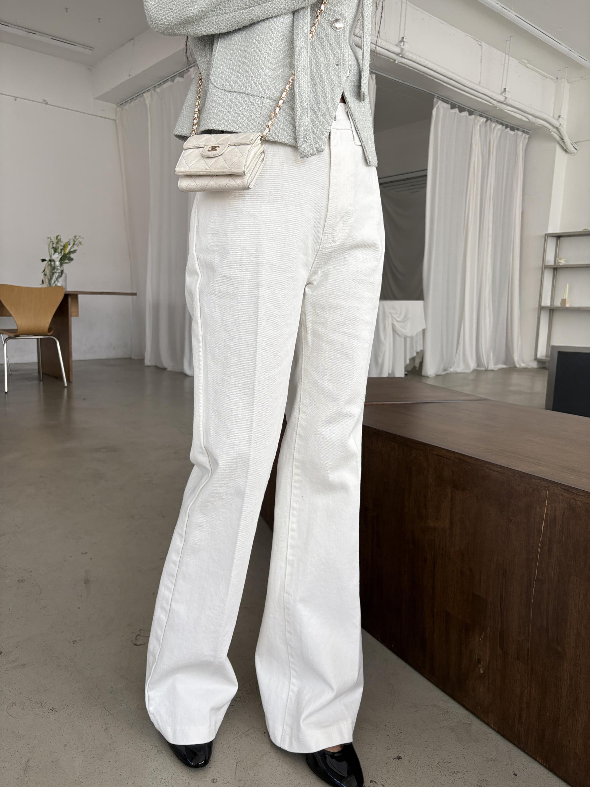 하이웨스트 밑위로 허리를 안정감 있게 잡아주고, 스트레이트와 부츠컷의 중간 정도로 자연스럽게 떨어지는 세미 부츠컷 실루엣이라 손이 더 많이 가는 팬츠입니다.