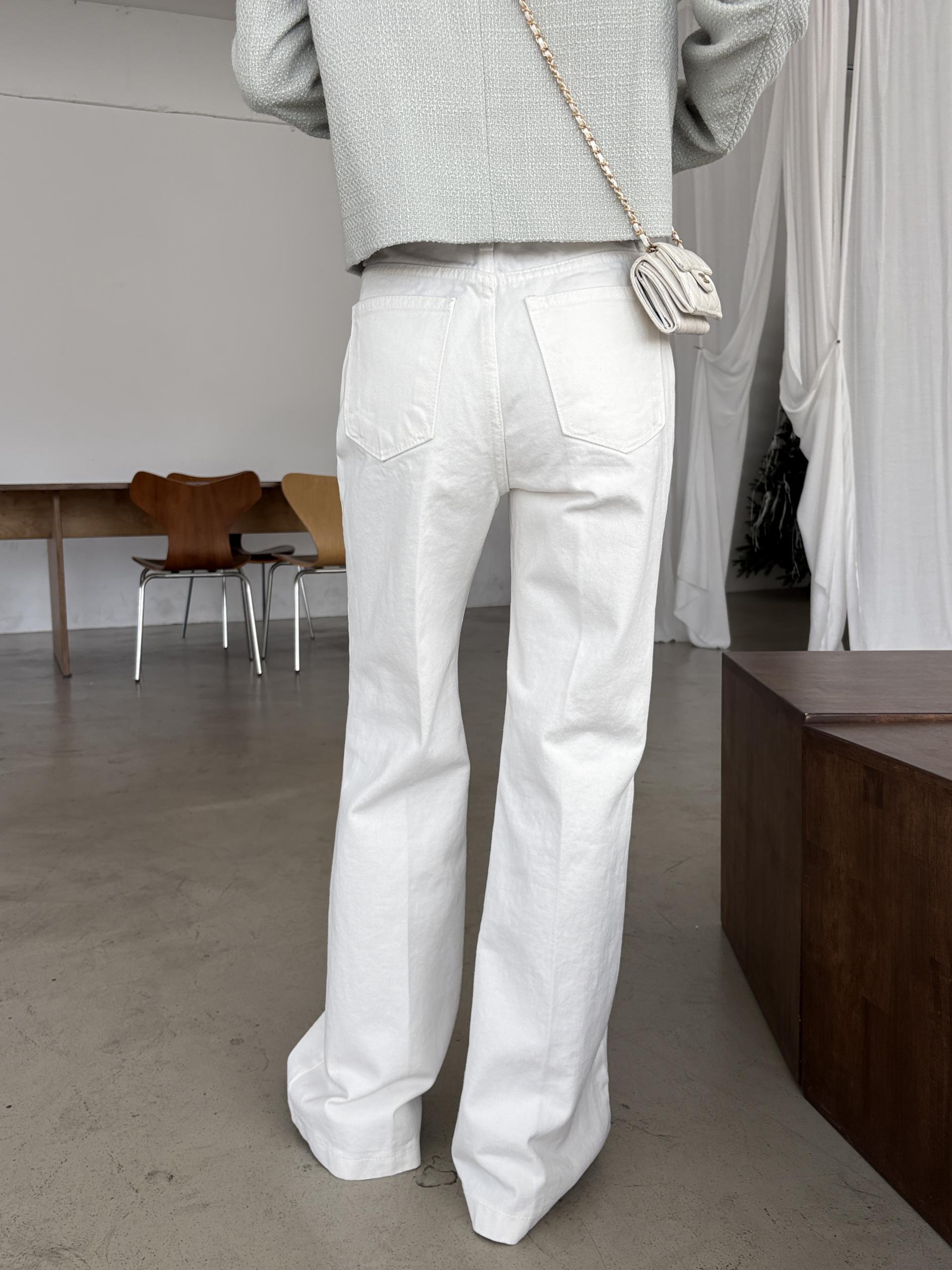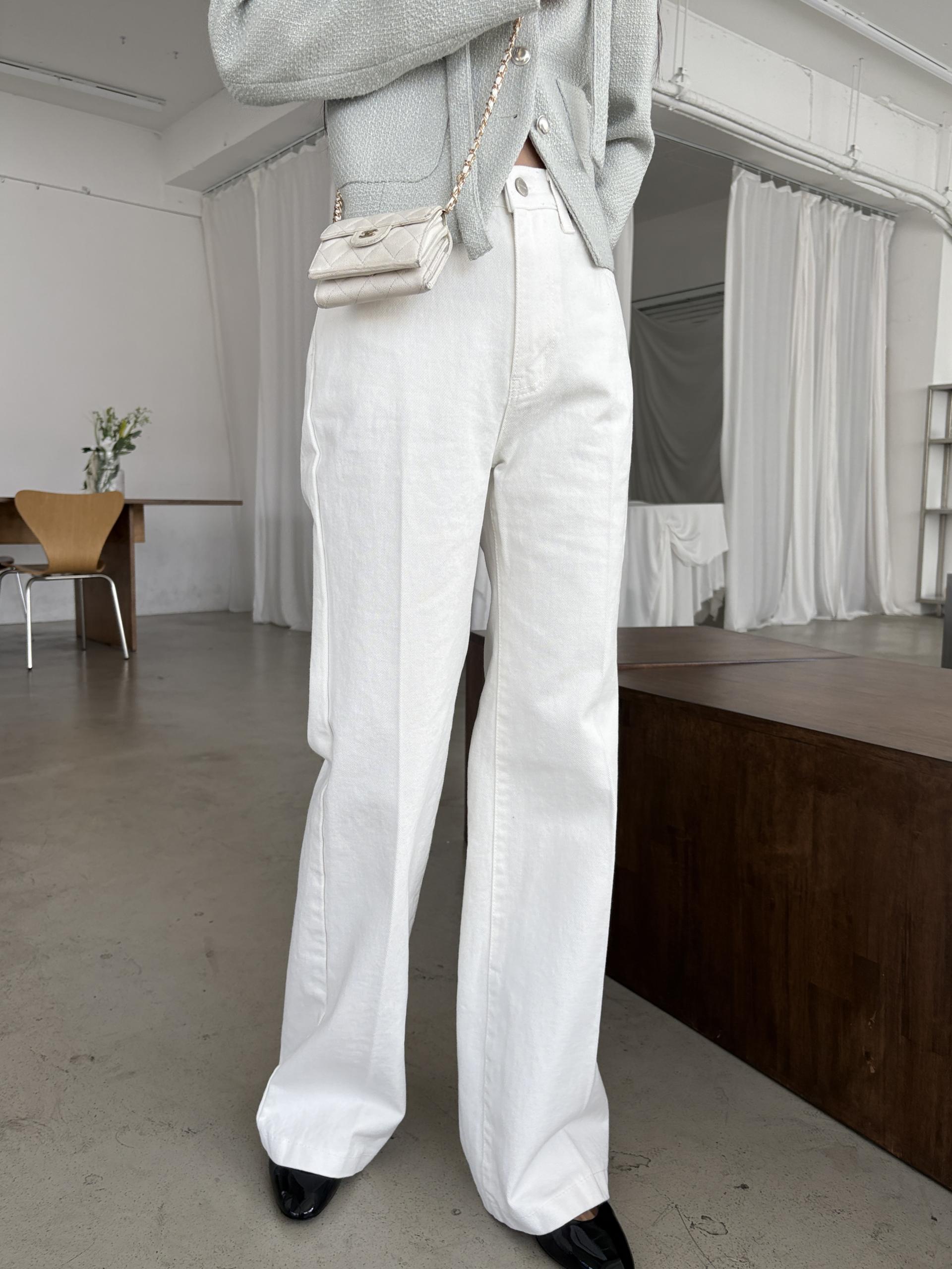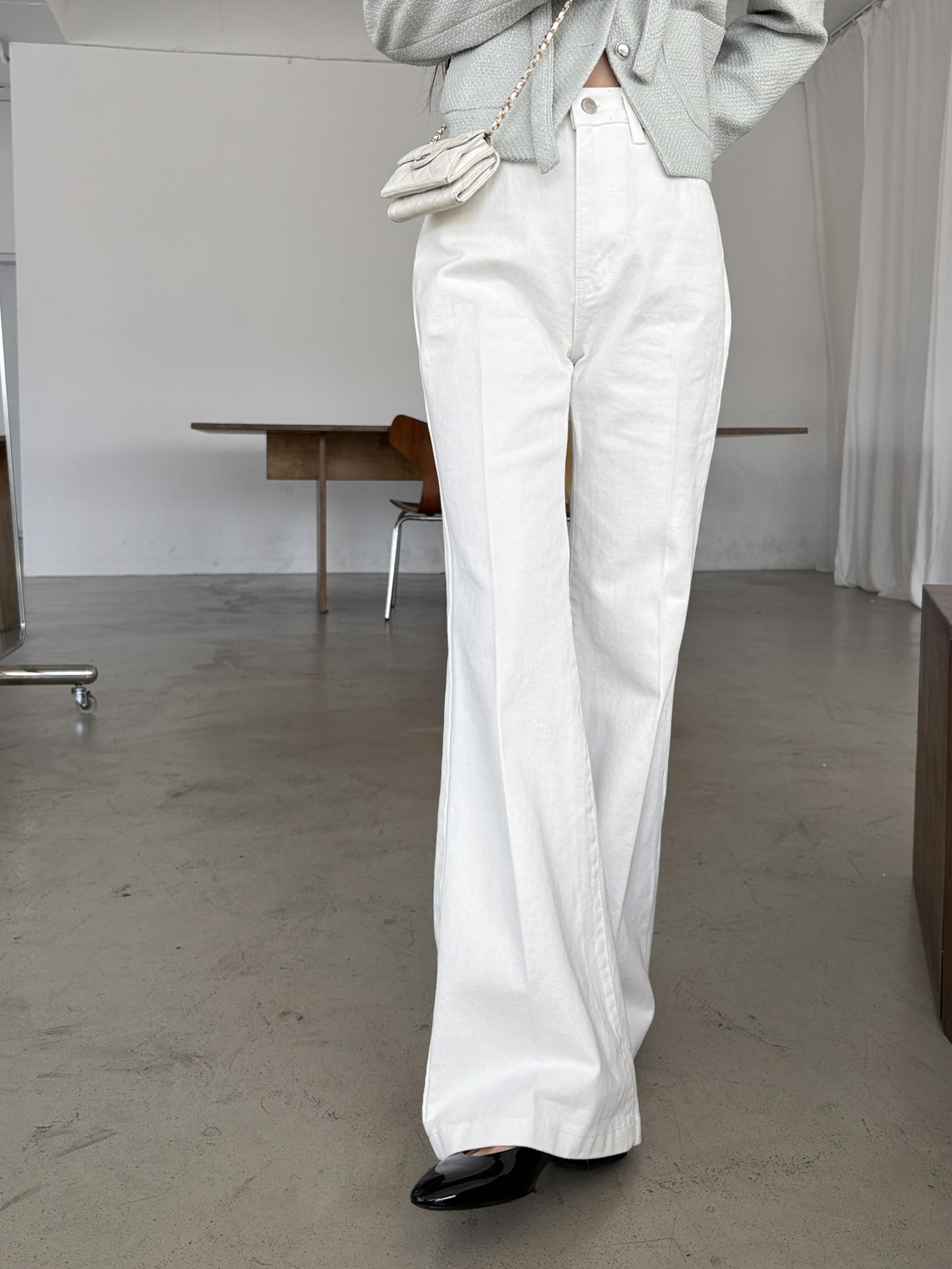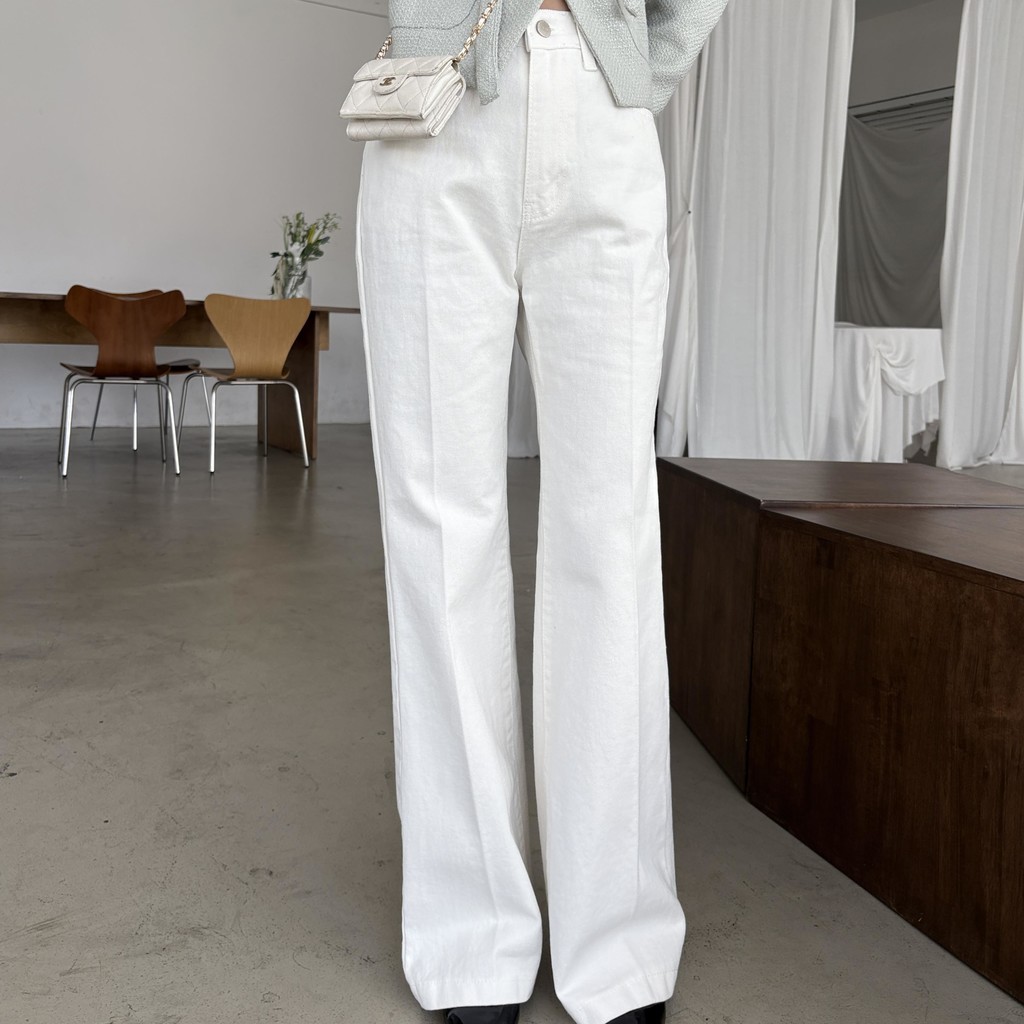 하이웨스트 밑위로 허리를 안정감 있게 잡아주고, 스트레이트와 부츠컷의 중간 정도로 자연스럽게 떨어지는 세미 부츠컷 실루엣이라 손이 더 많이 가는 팬츠입니다.