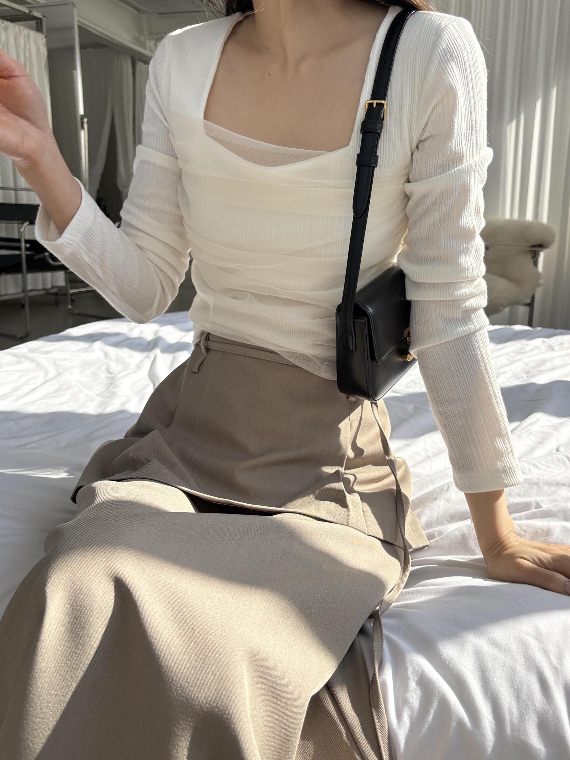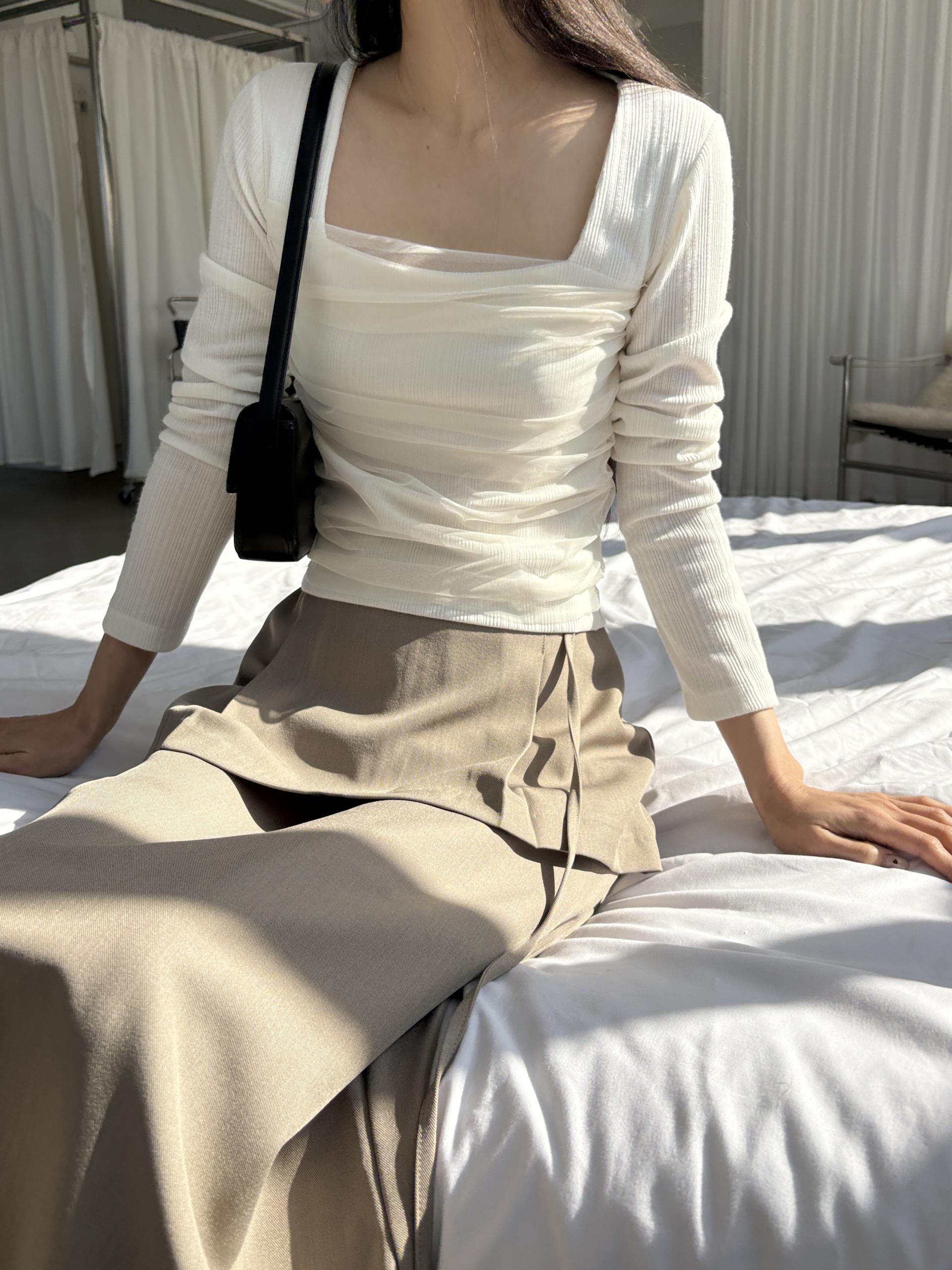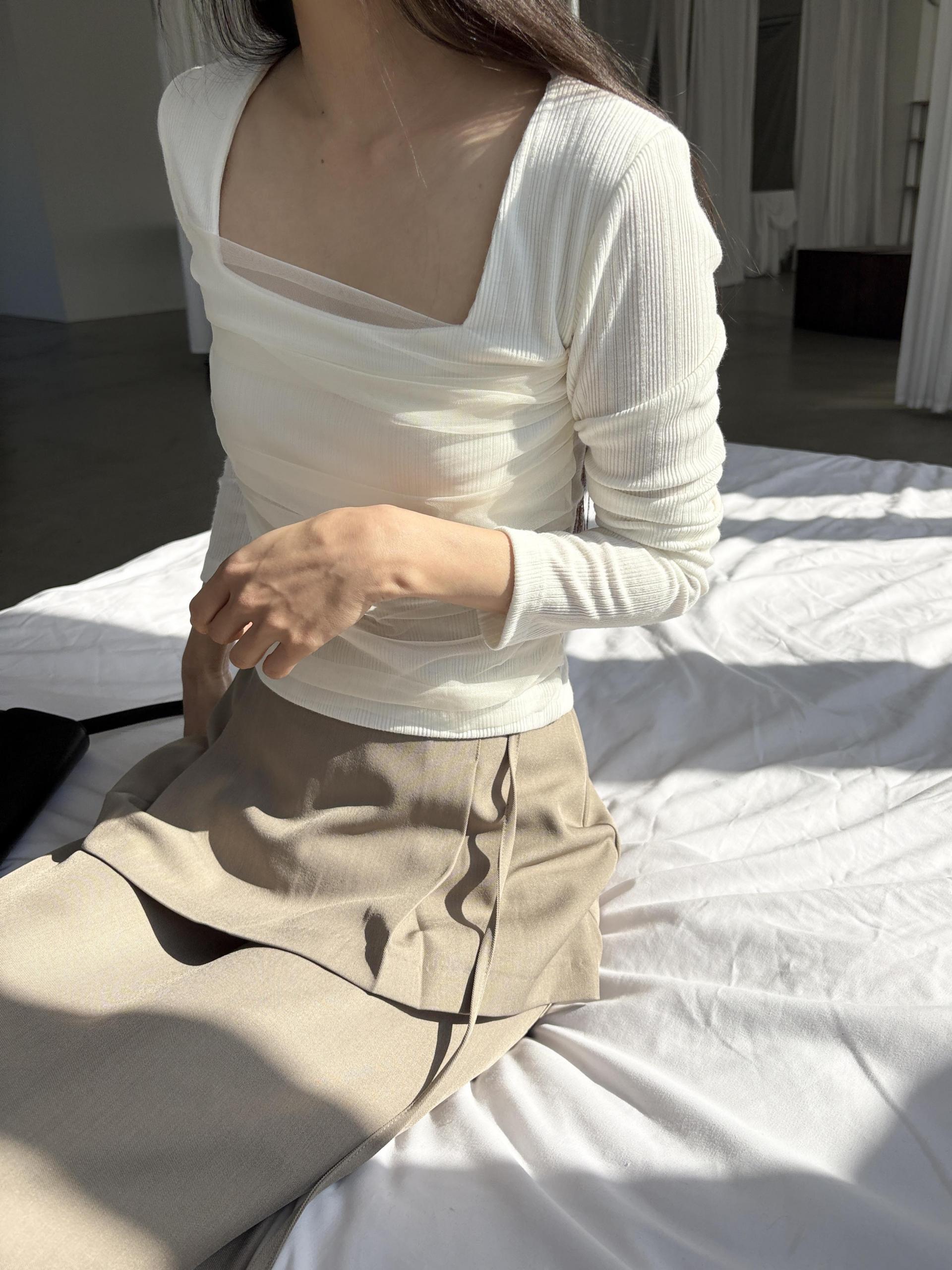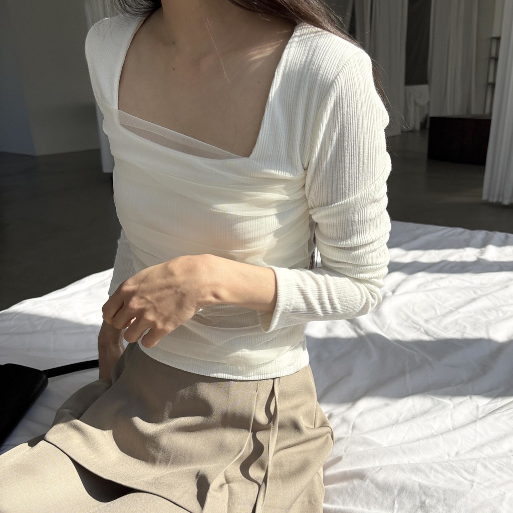 스퀘어넥 디자인으로 쇄골과 목선이 깔끔하게 드러나 단독으로도, 아우터 이너로도 활용도 높은 아이템이에요.