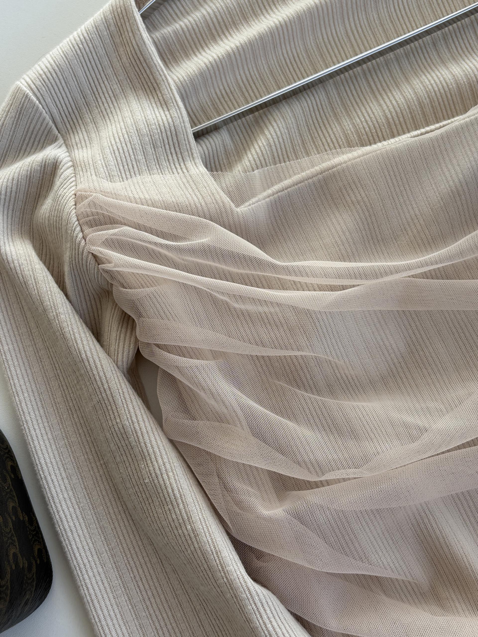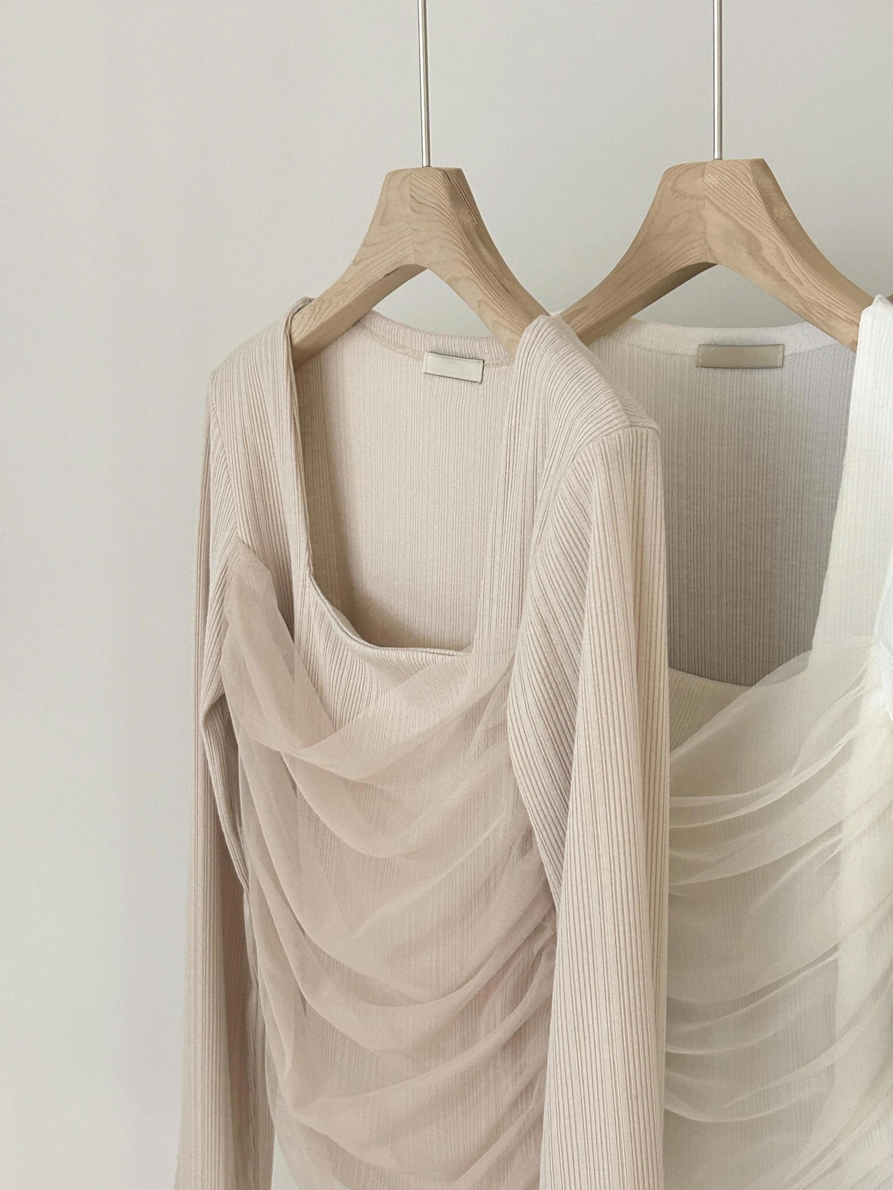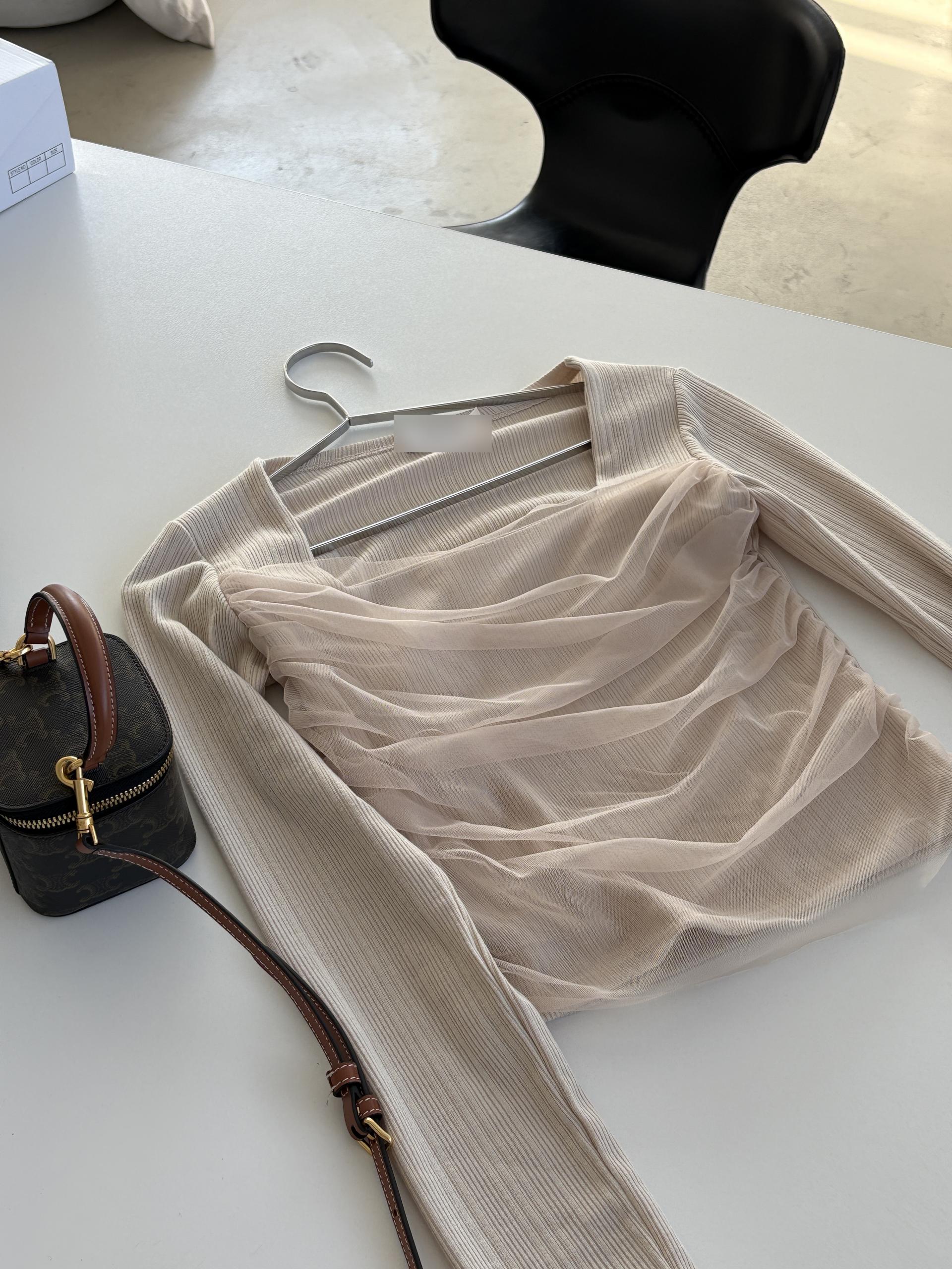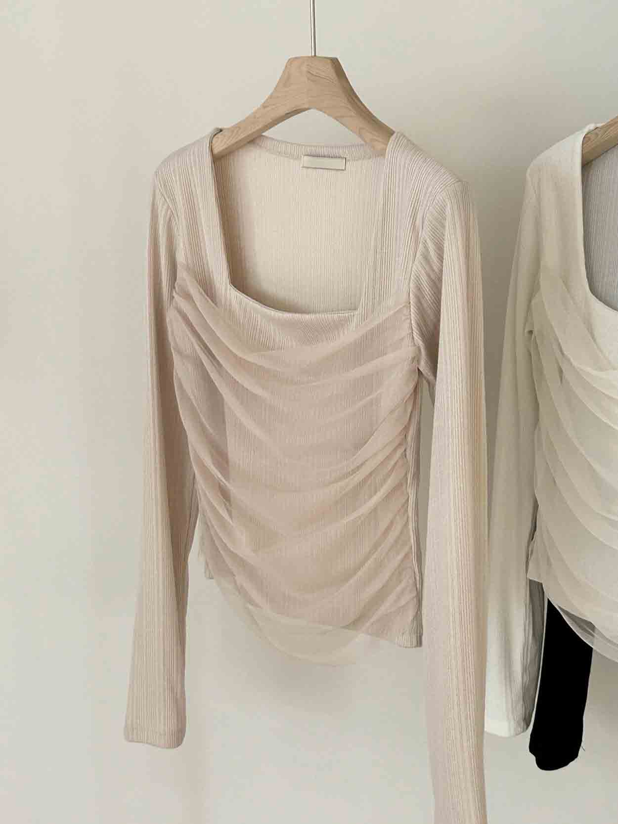 여리한 골지 원단 위에 쉬폰 레이어드를 더해 자연스럽게 잡힌 셔링이 바디라인을 은은하게 살려주는 페미닌 무드의 티셔츠입니다.